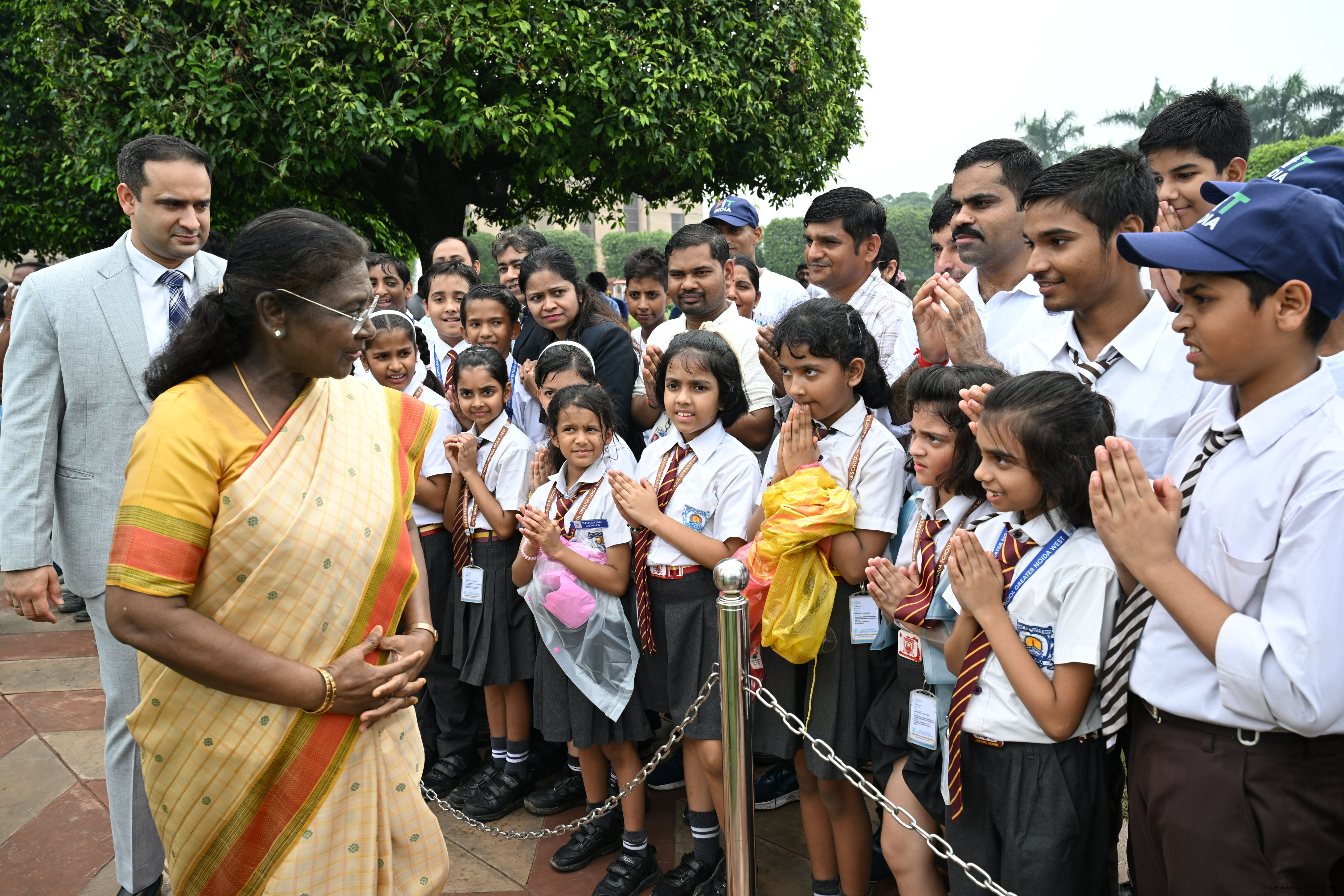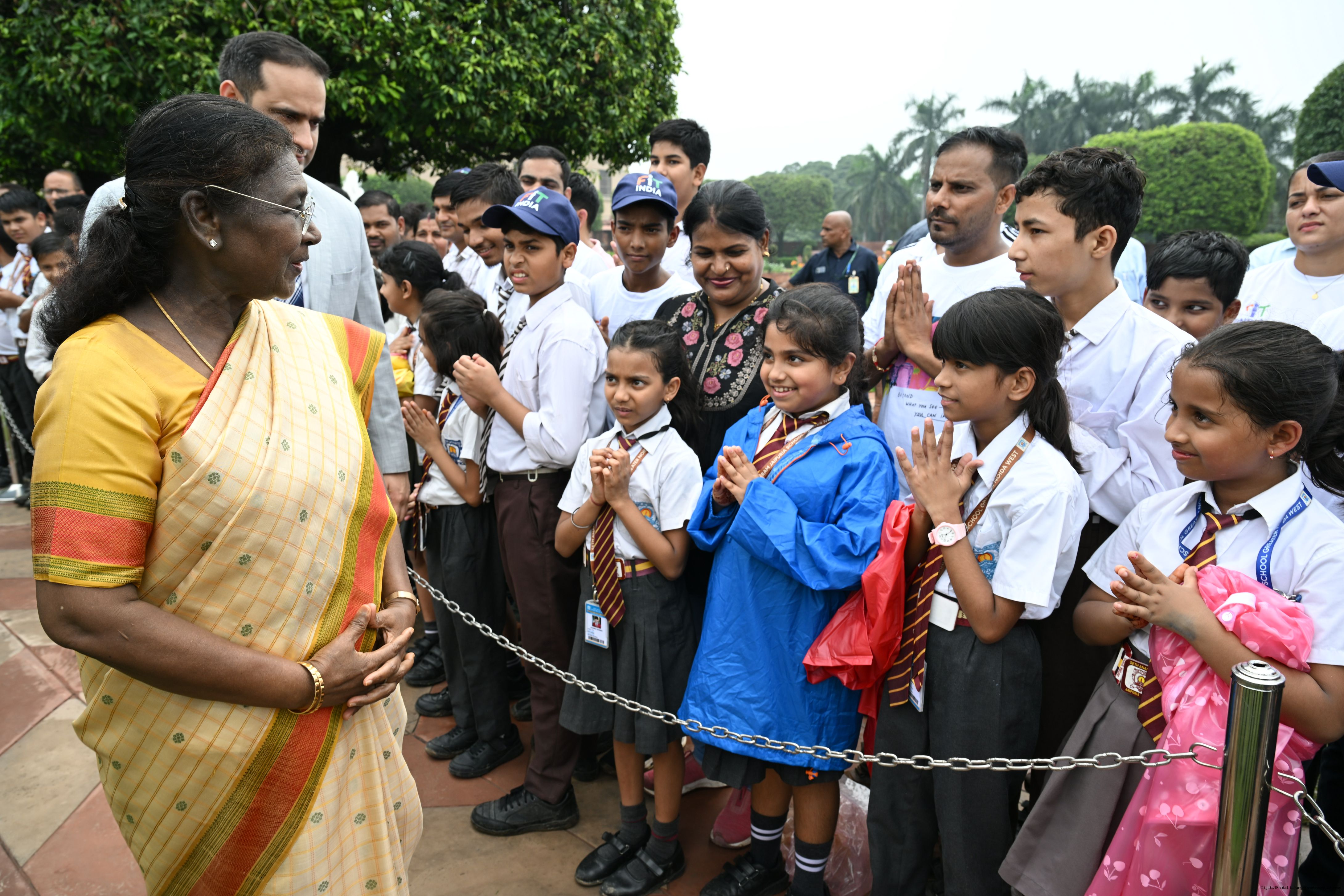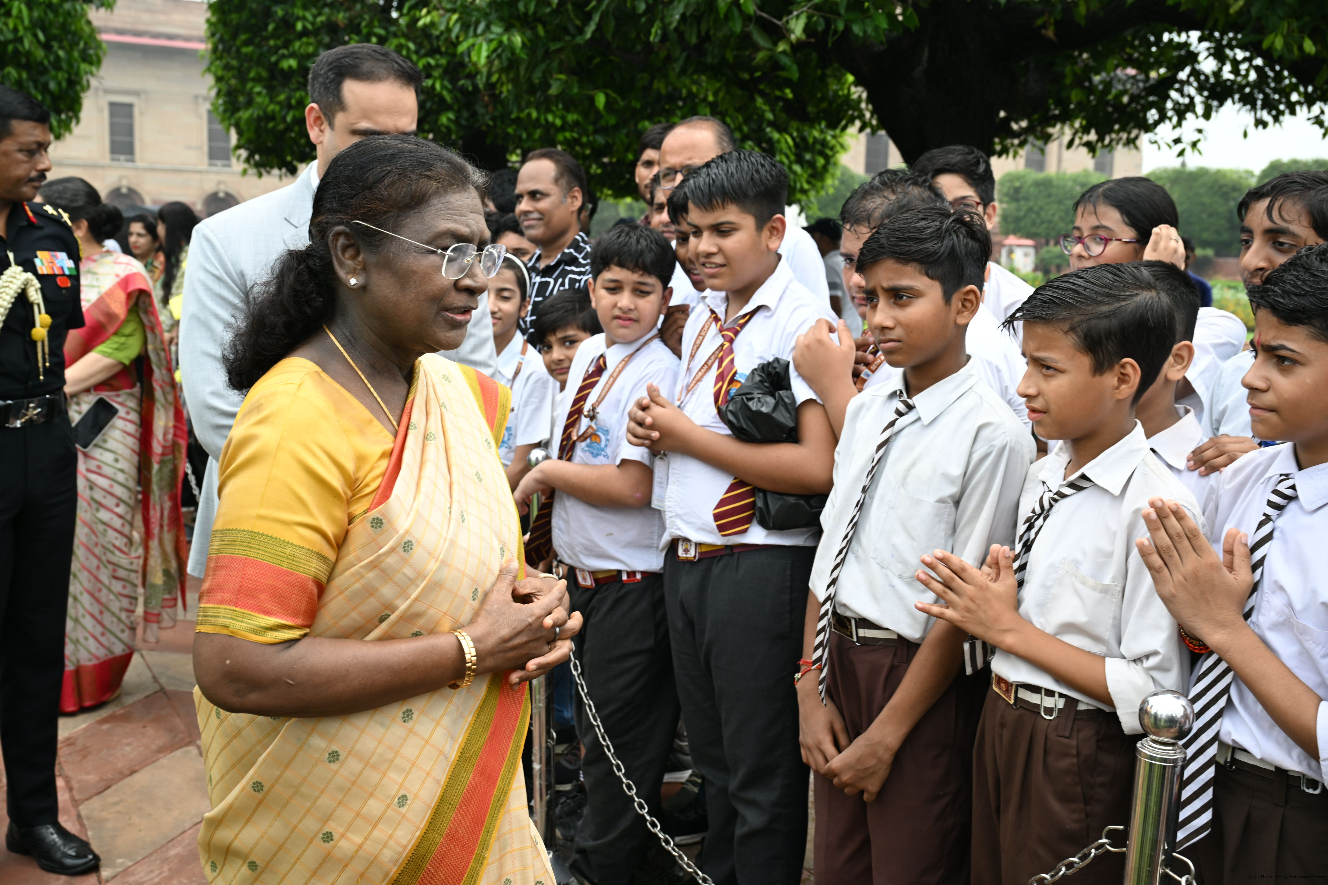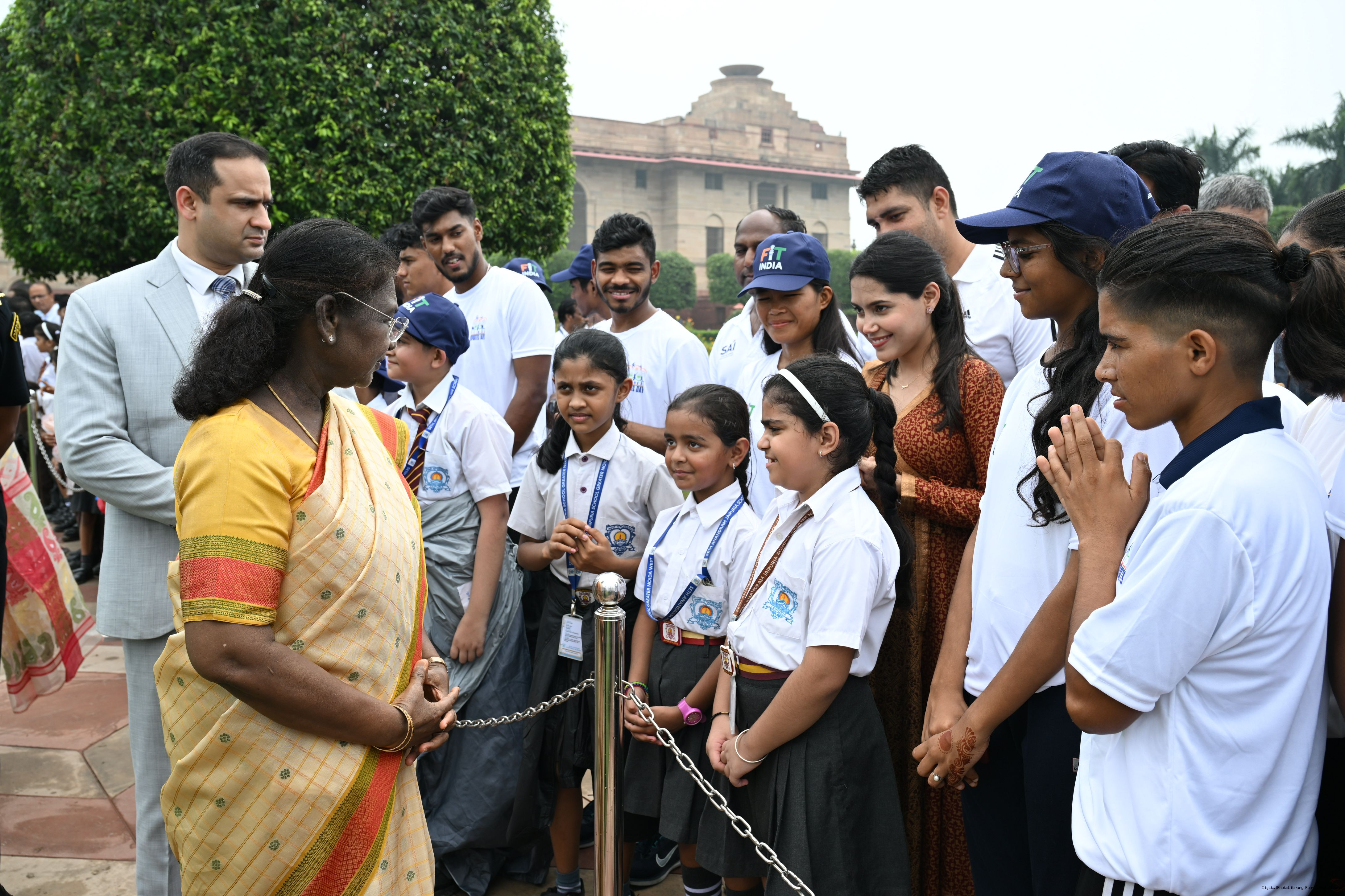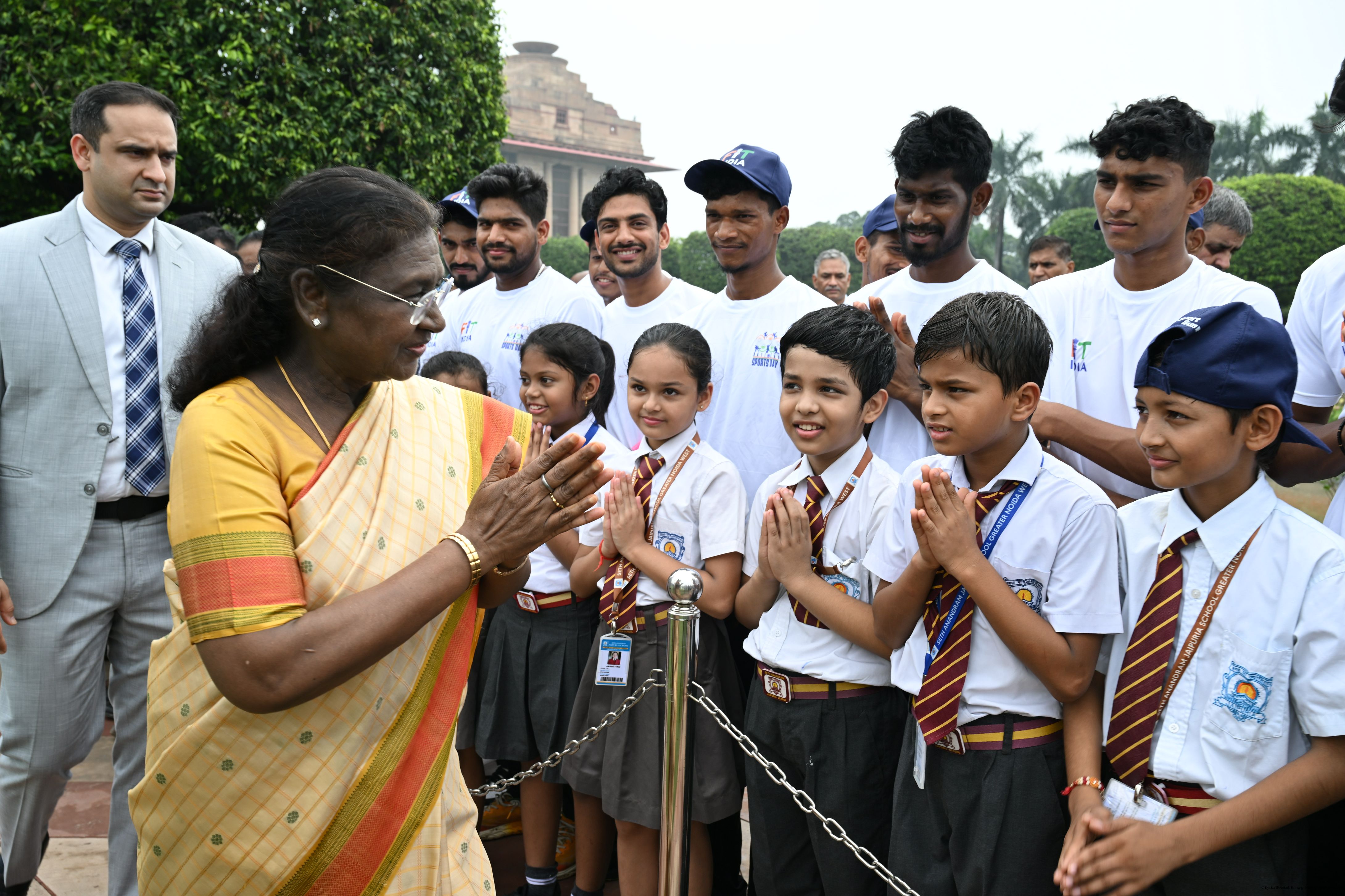 | Caption: | The President of India, Smt Droupadi Murmu interacted with sportspersons who visited Amrit Udyan on National Sports Day at Rashtrapati Bhavan on August 29, 2025. |