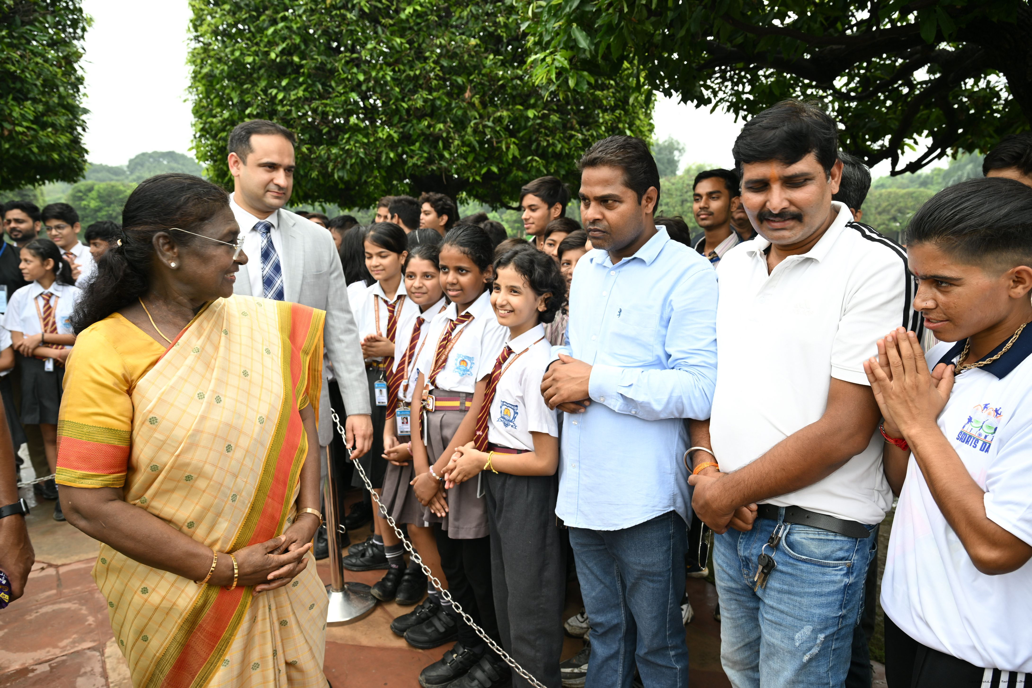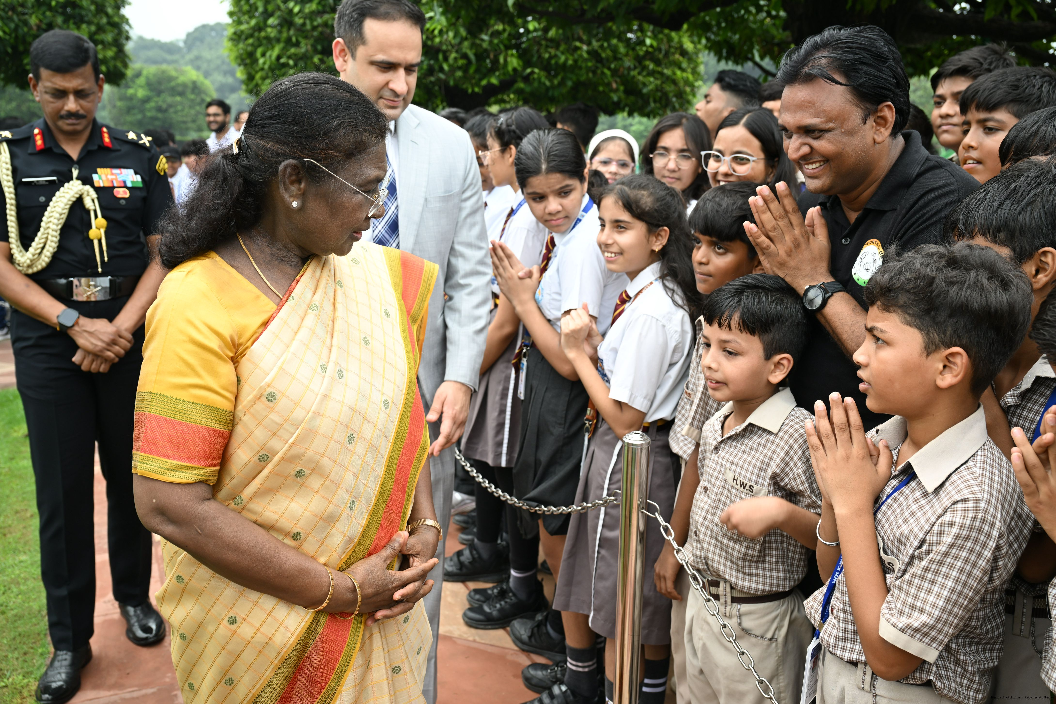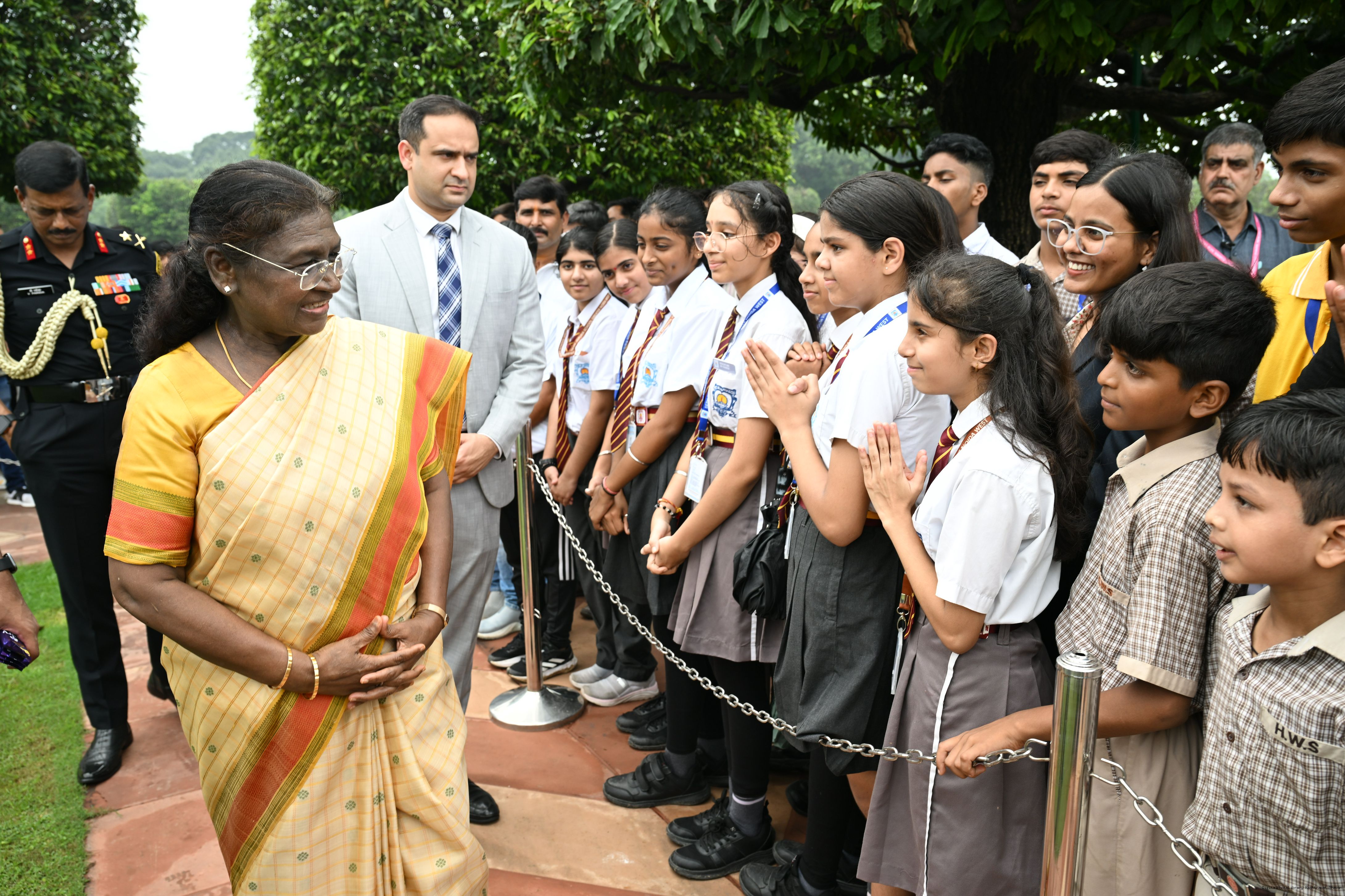 | Caption: | The President of India, Smt Droupadi Murmu interacted with sportspersons who visited Amrit Udyan on National Sports Day at Rashtrapati Bhavan on August 29, 2025. |