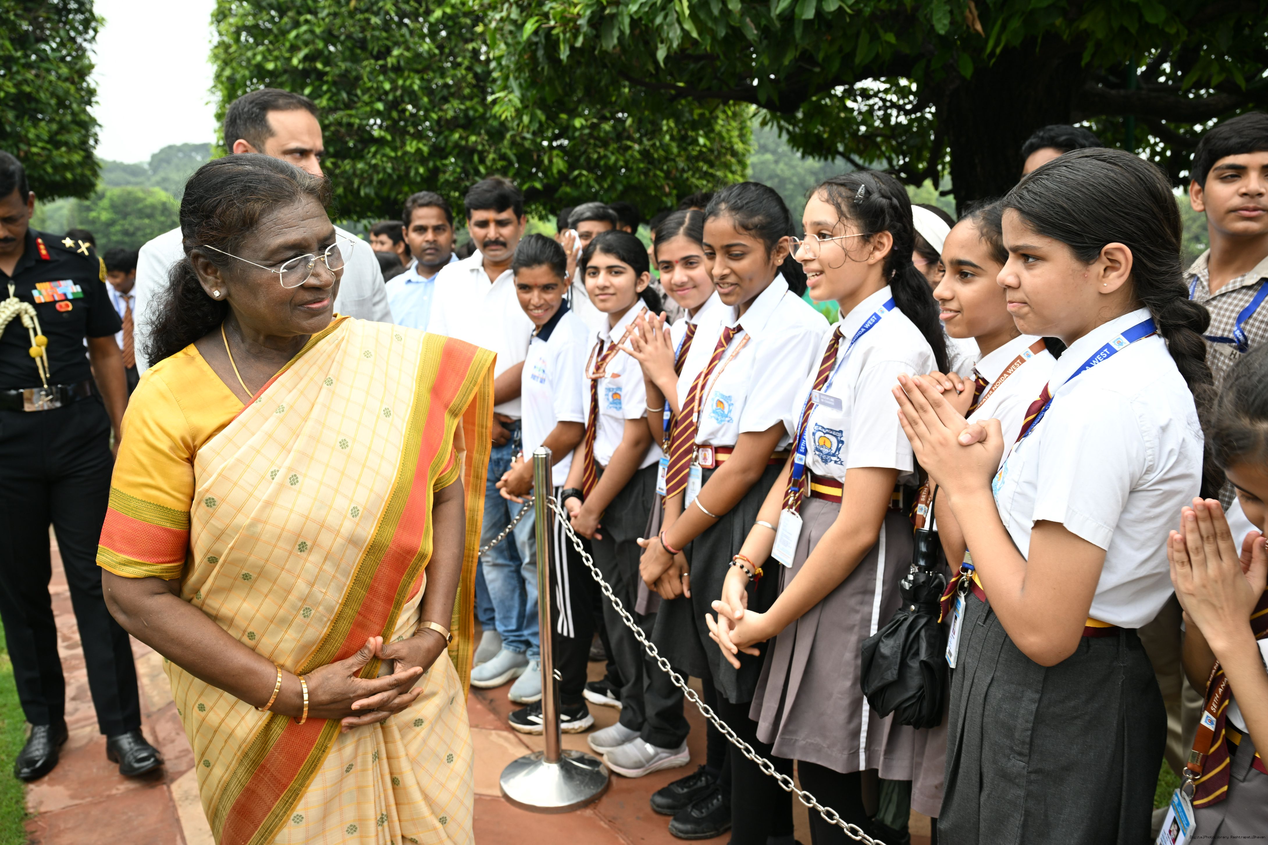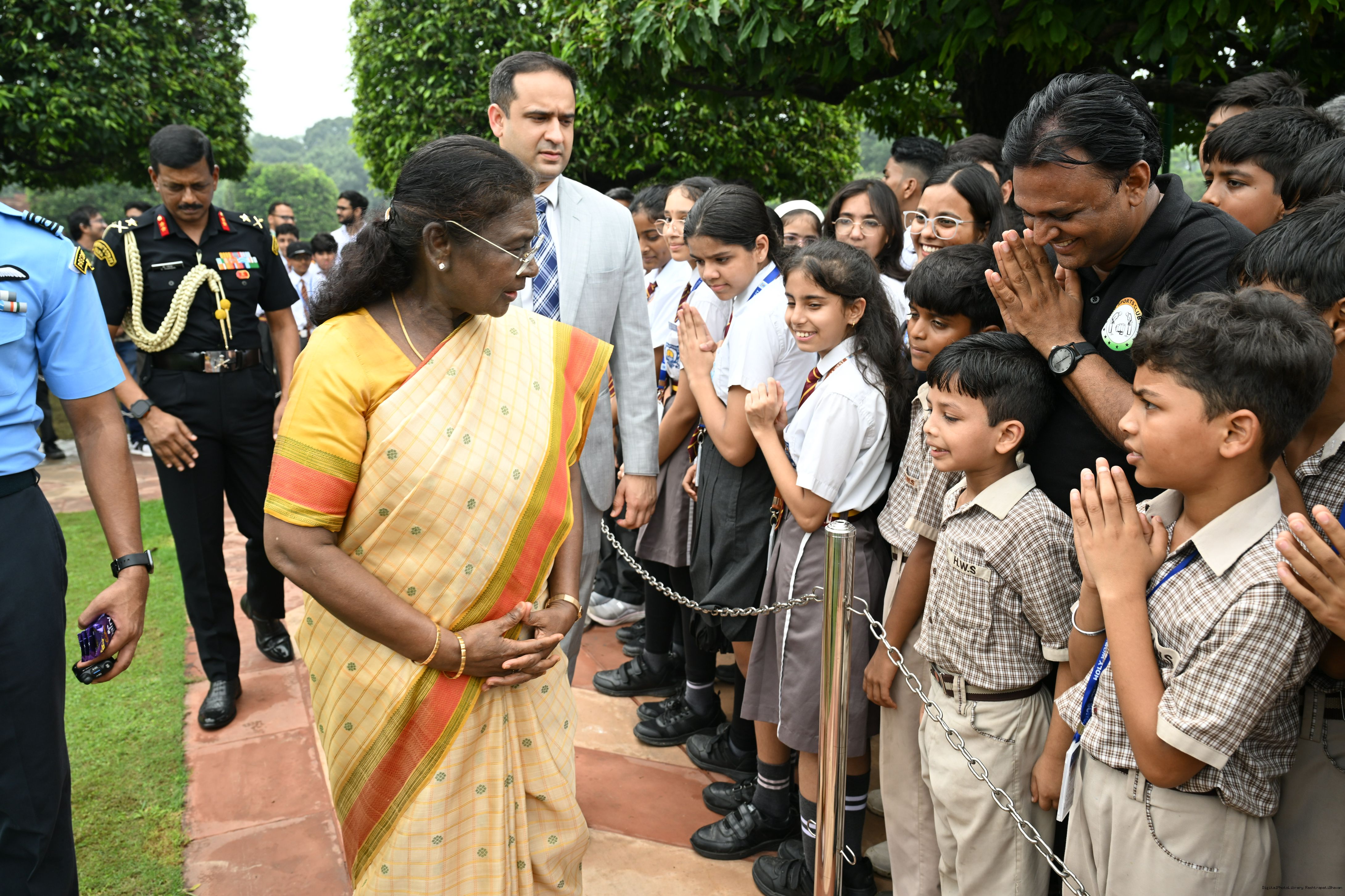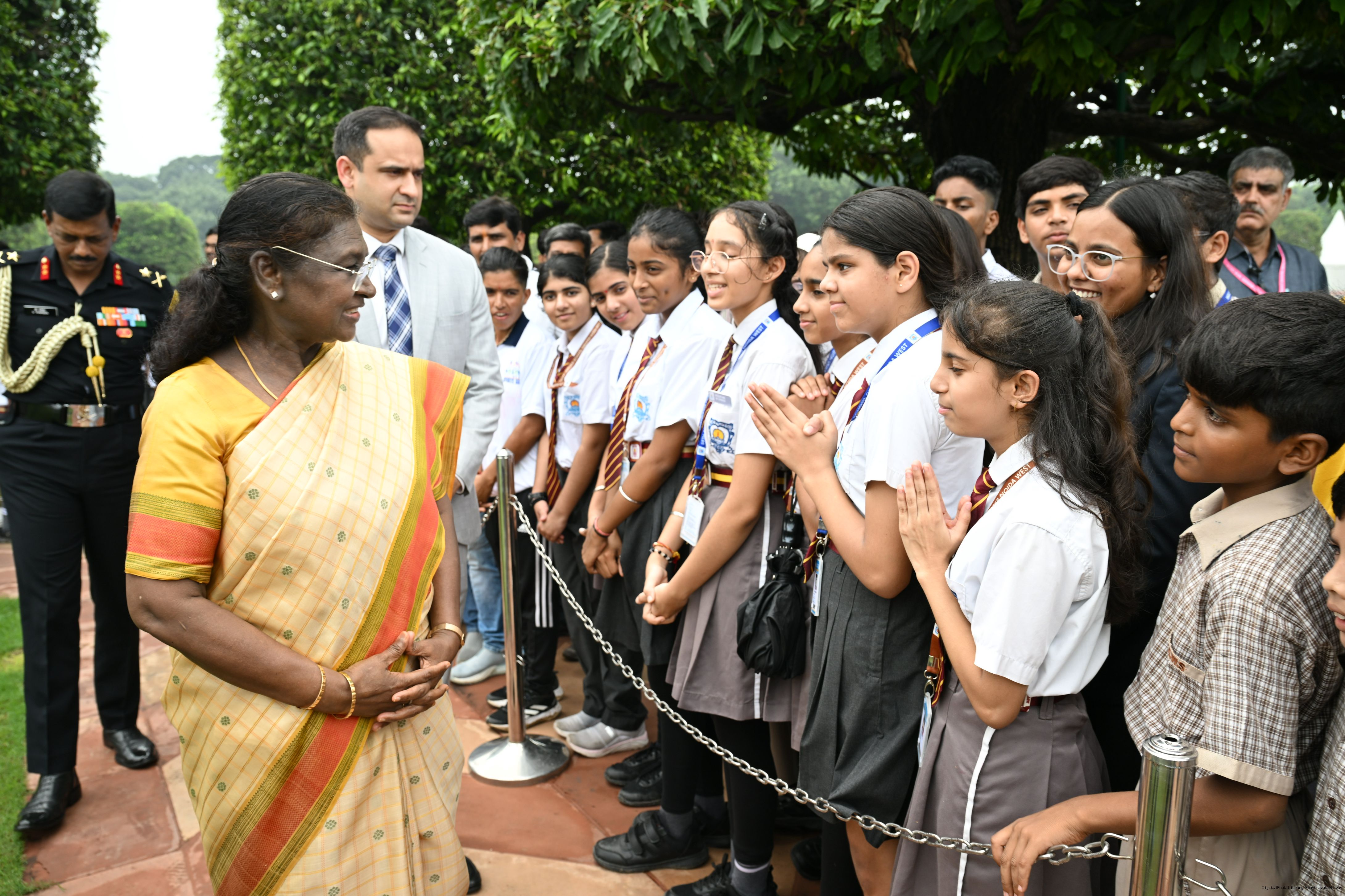 | Caption: | The President of India, Smt Droupadi Murmu interacted with sportspersons who visited Amrit Udyan on National Sports Day at Rashtrapati Bhavan on August 29, 2025. |