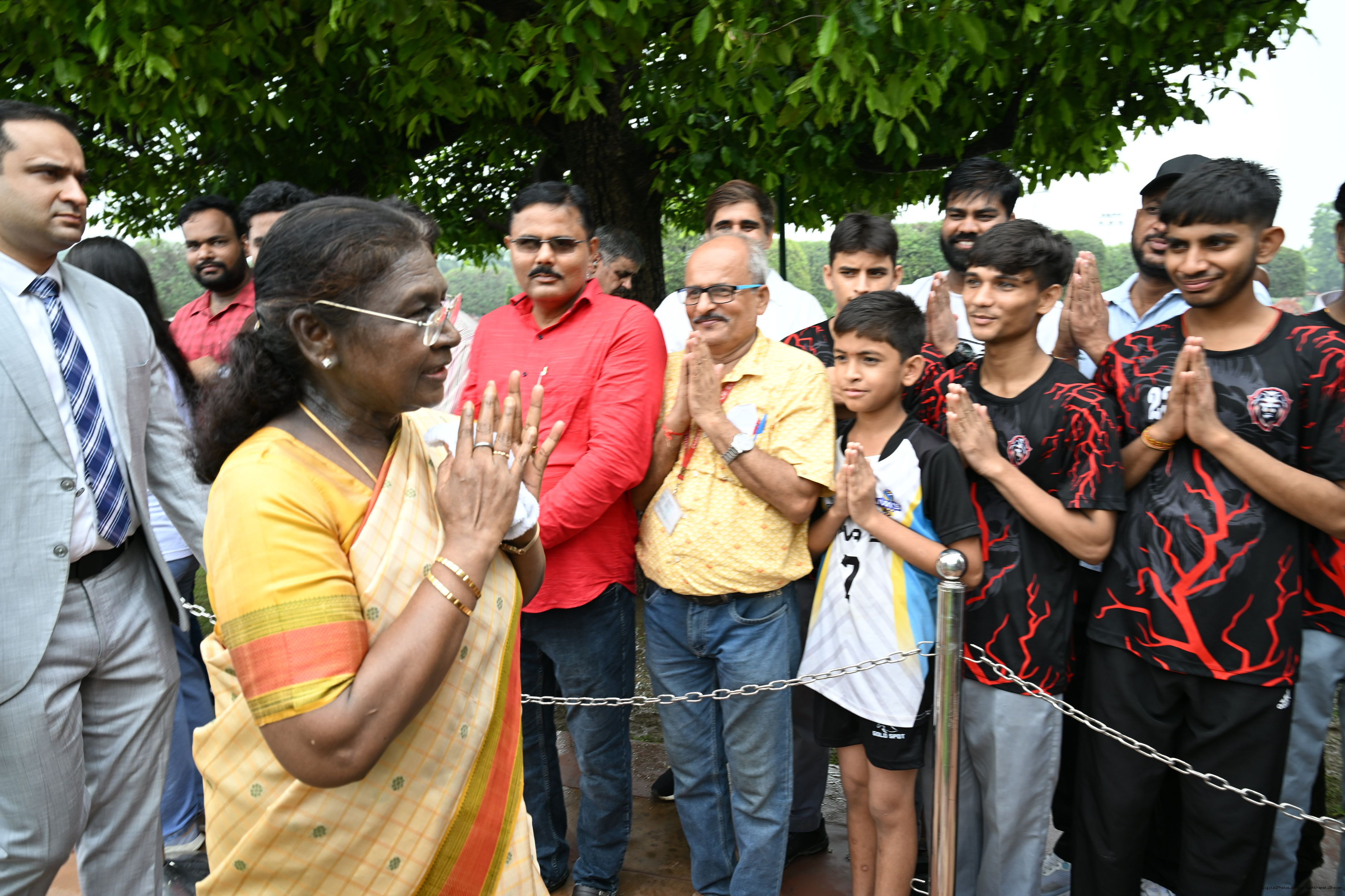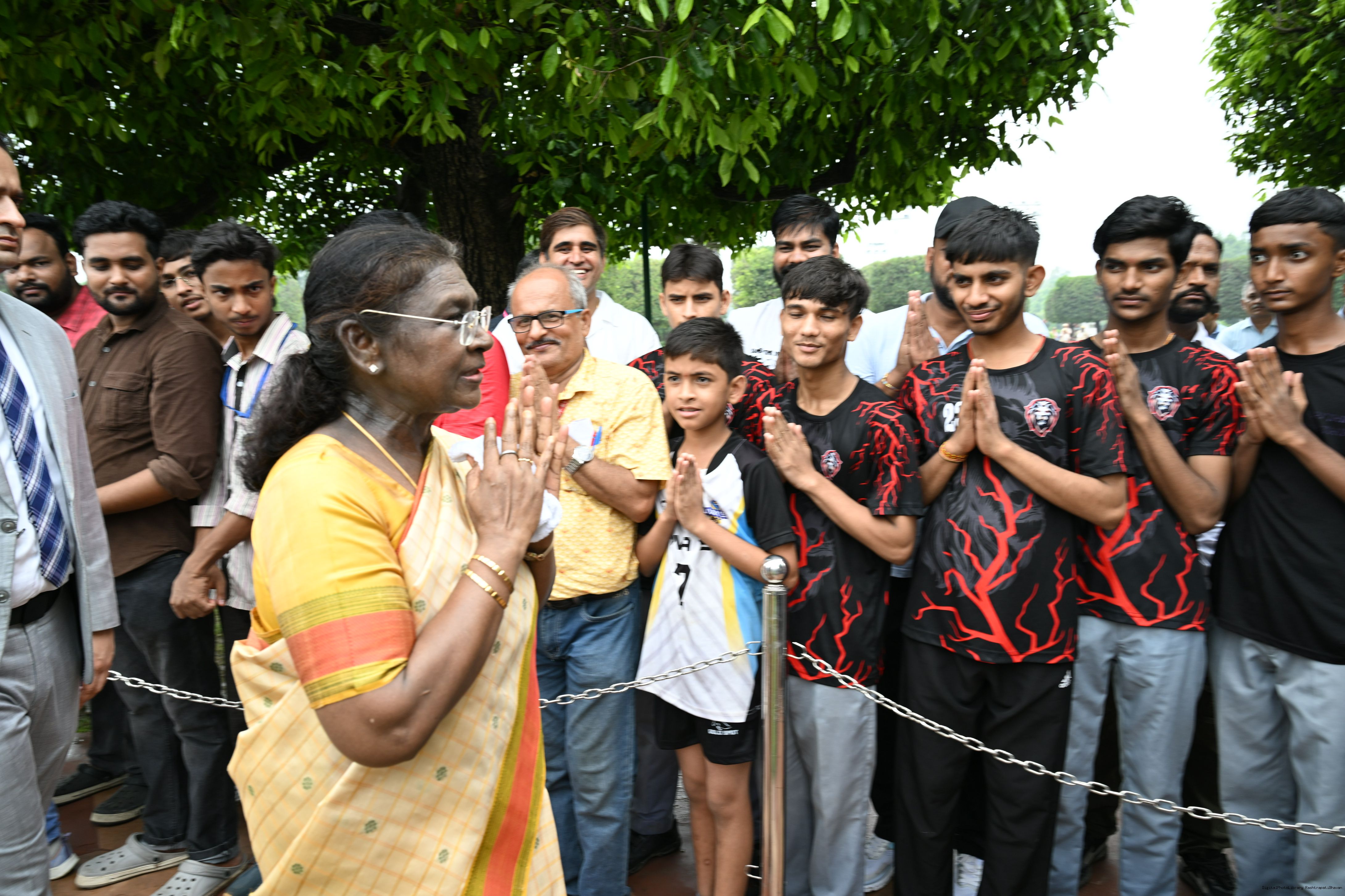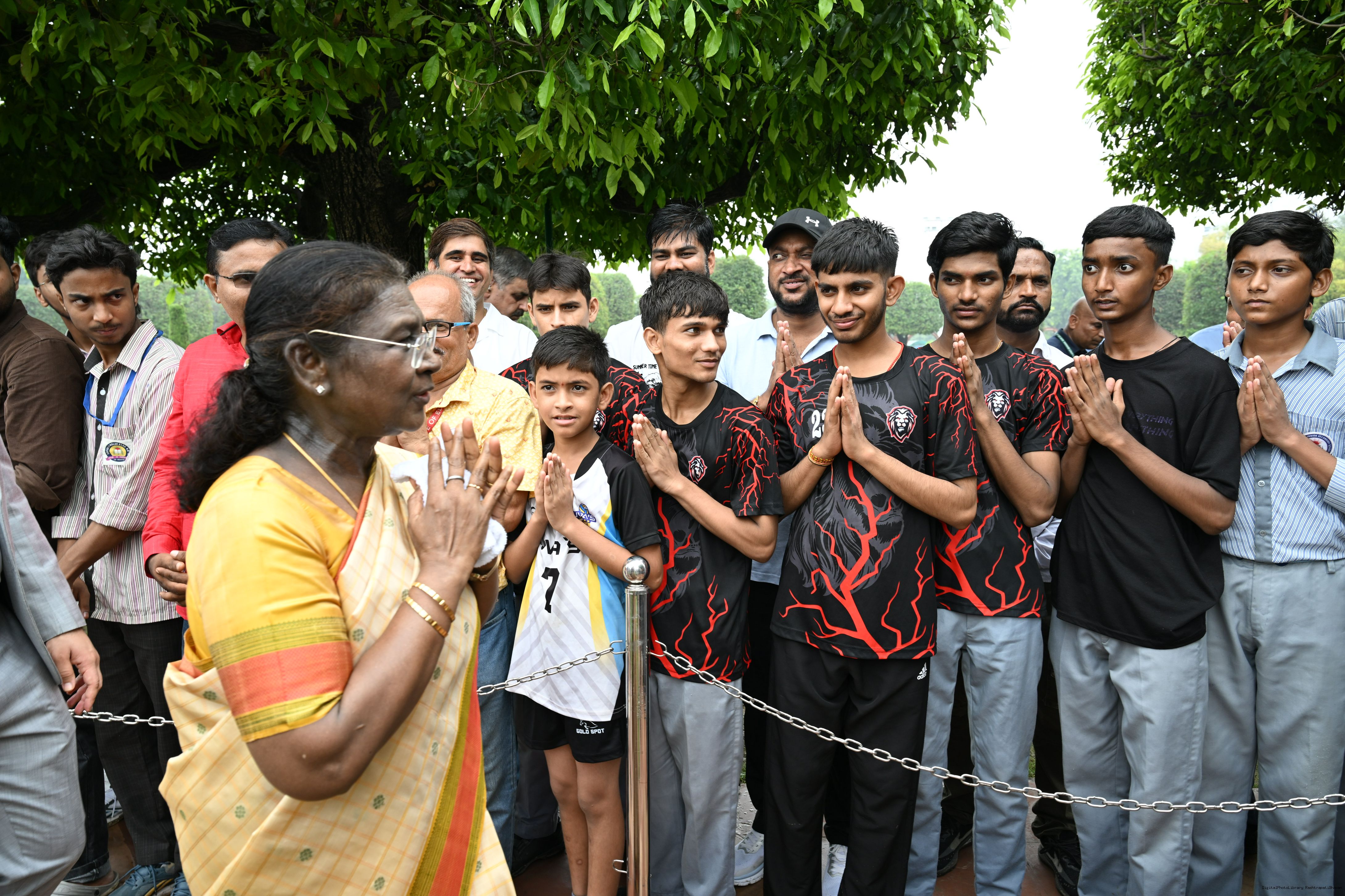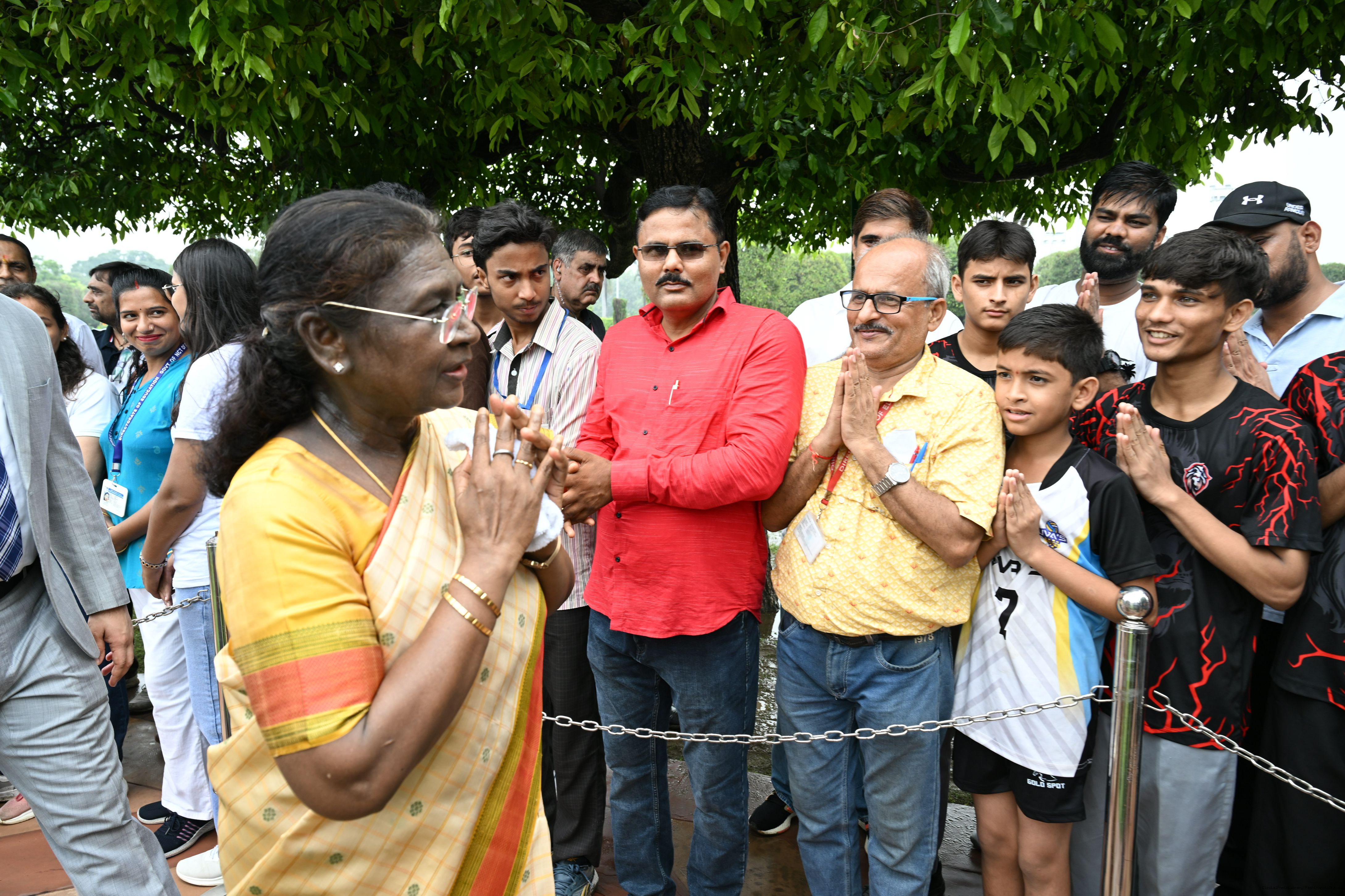 | Caption: | The President of India, Smt Droupadi Murmu interacted with sportspersons who visited Amrit Udyan on National Sports Day at Rashtrapati Bhavan on August 29, 2025. |