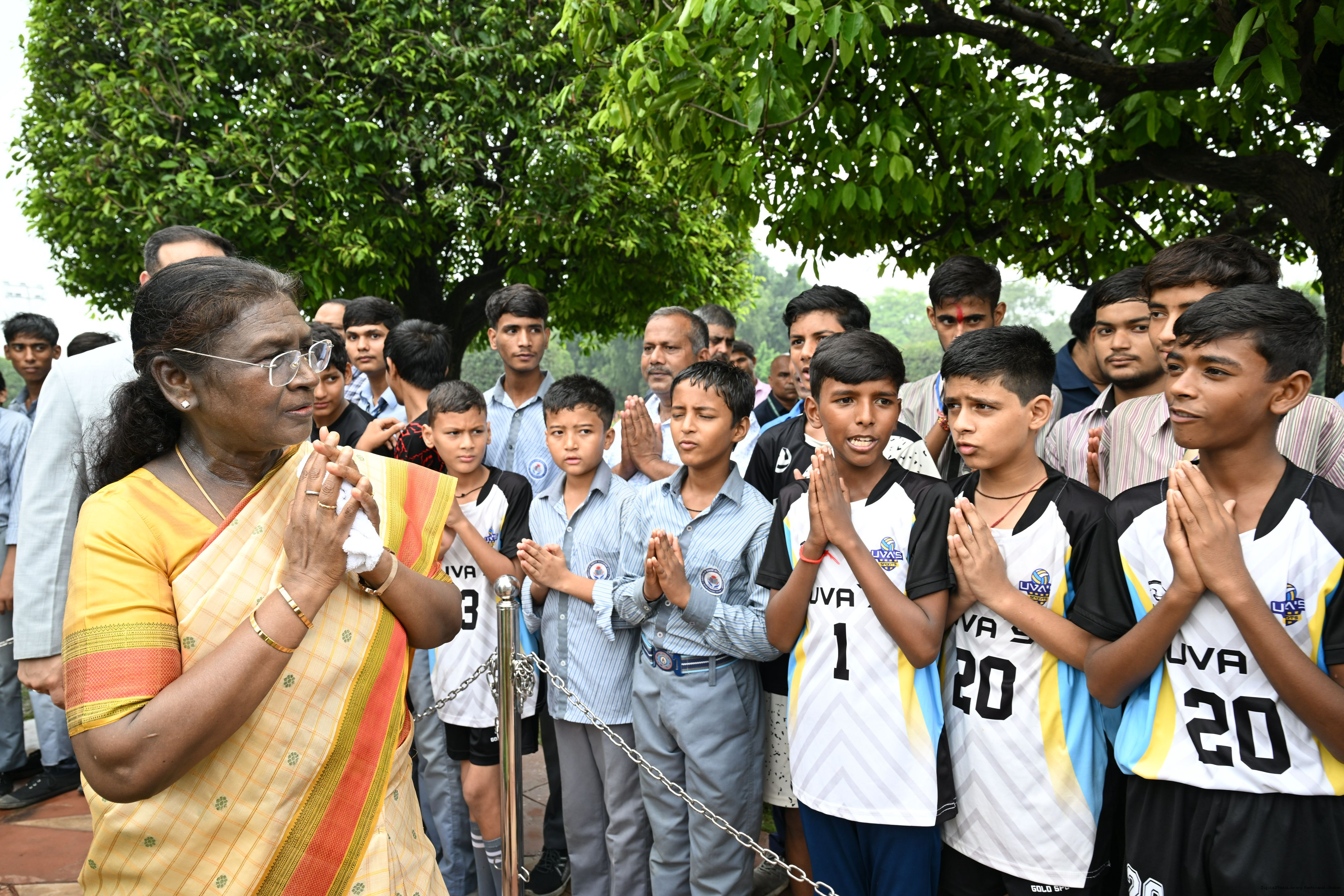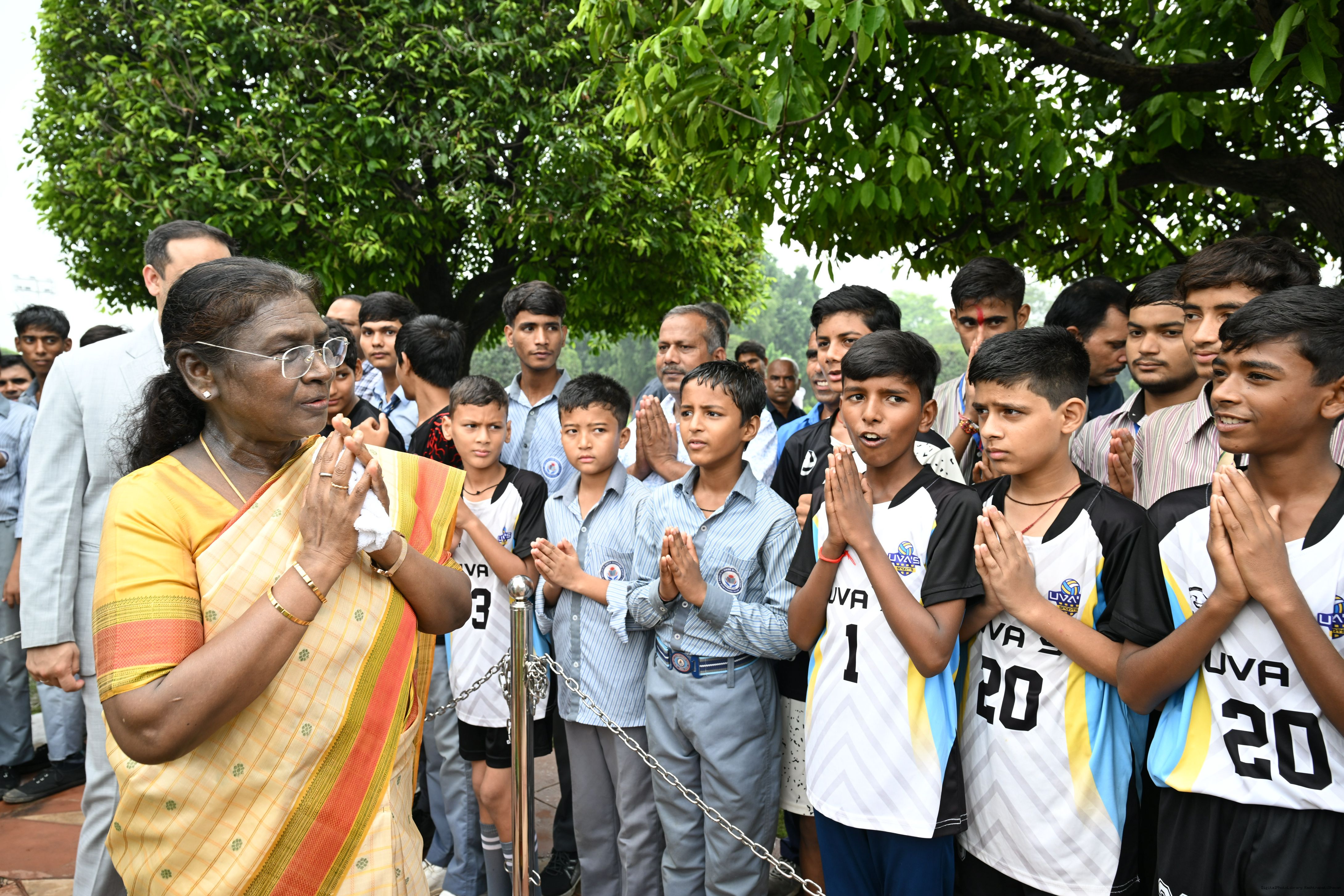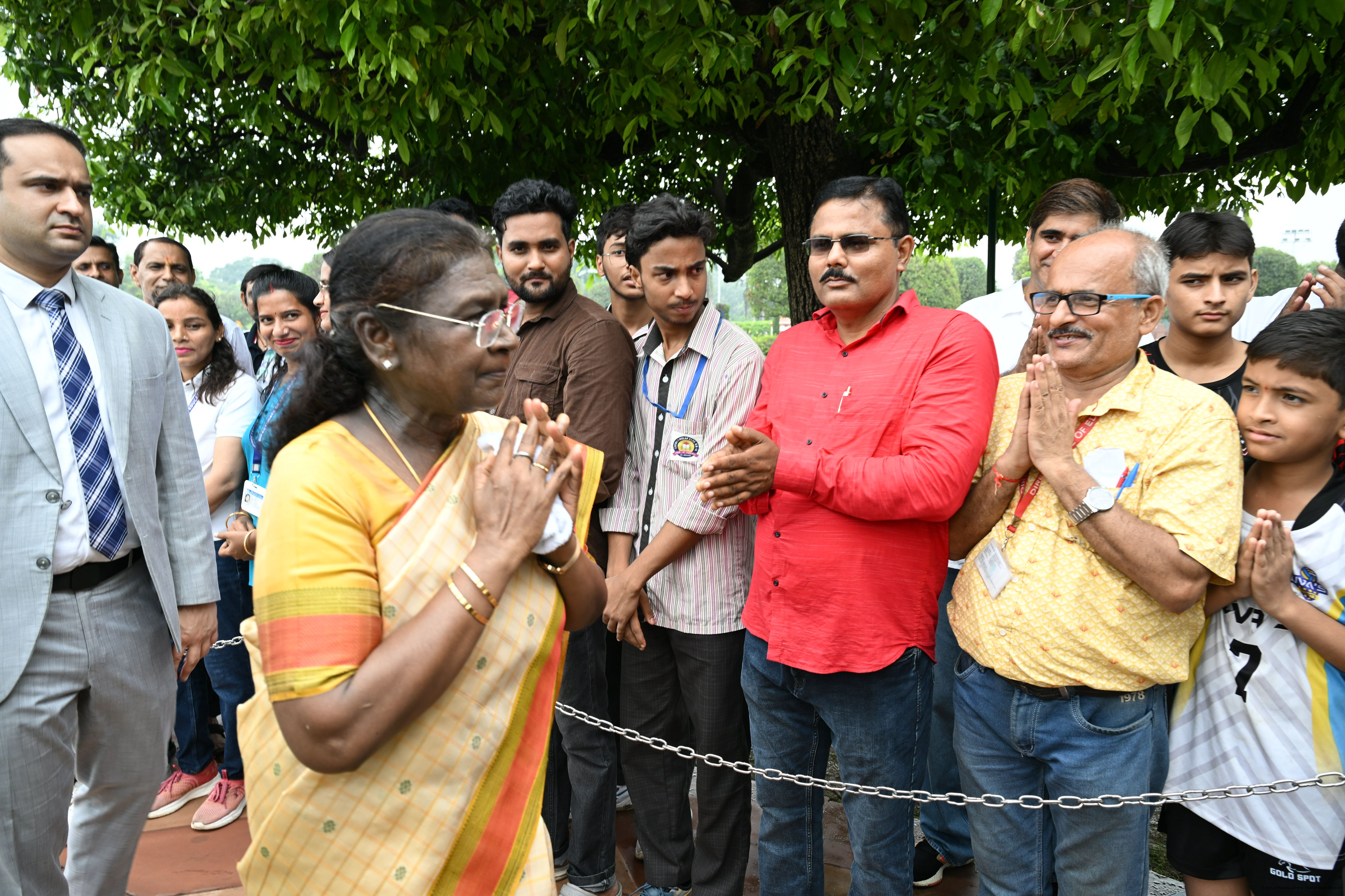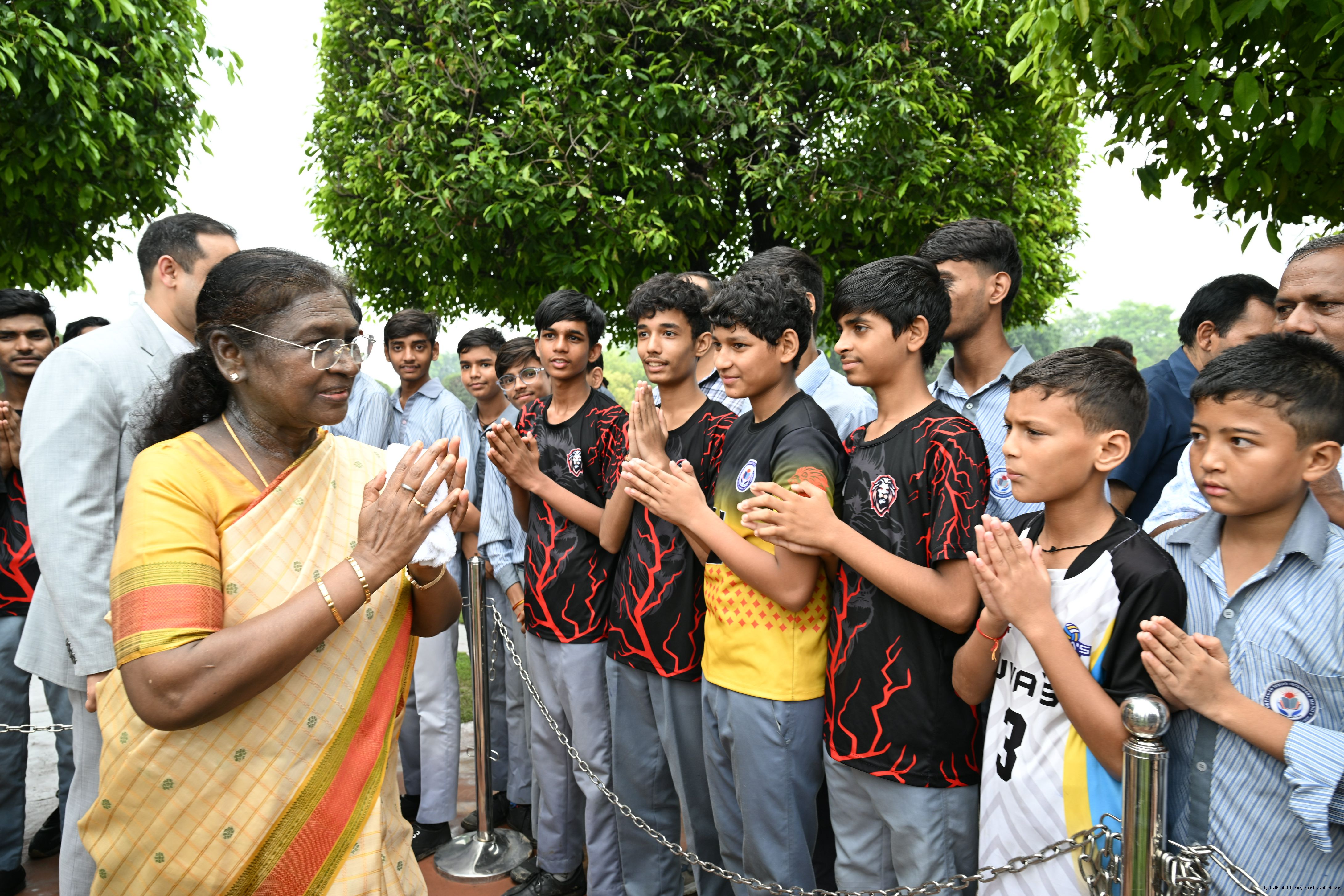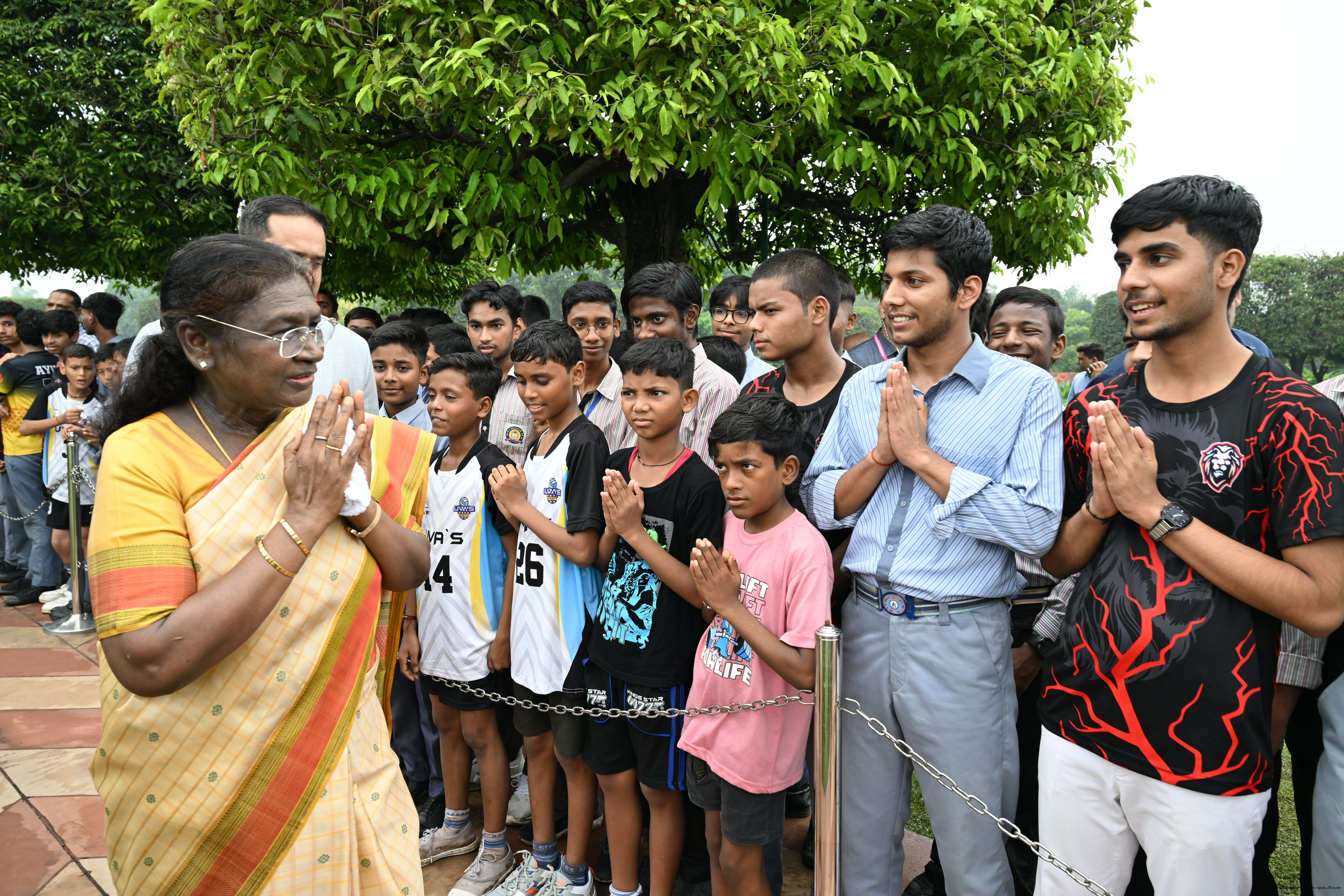 | Caption: | The President of India, Smt Droupadi Murmu interacted with sportspersons who visited Amrit Udyan on National Sports Day at Rashtrapati Bhavan on August 29, 2025. |
