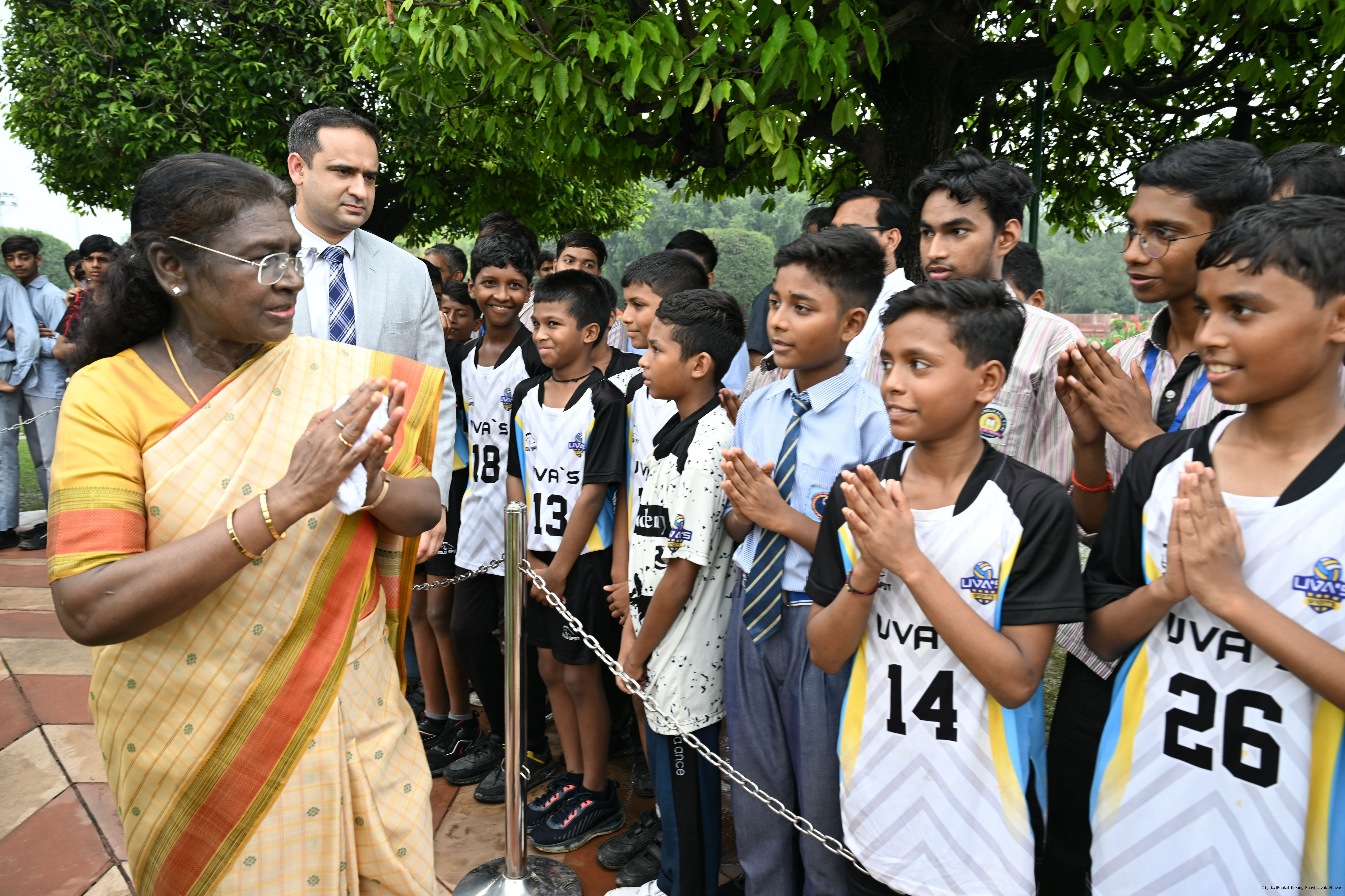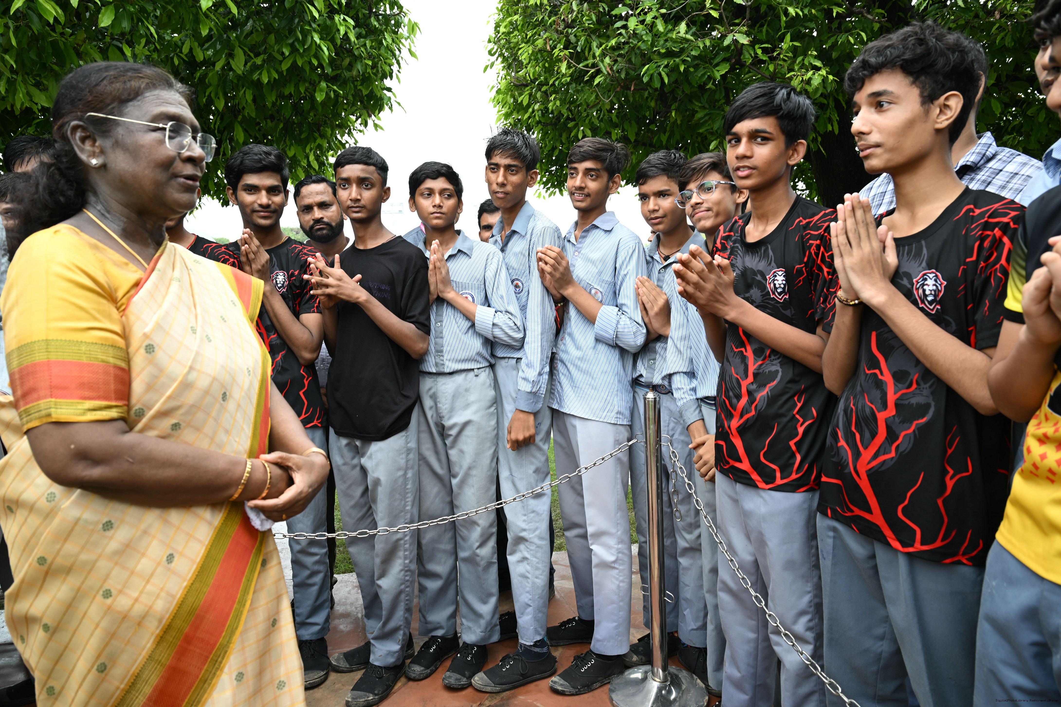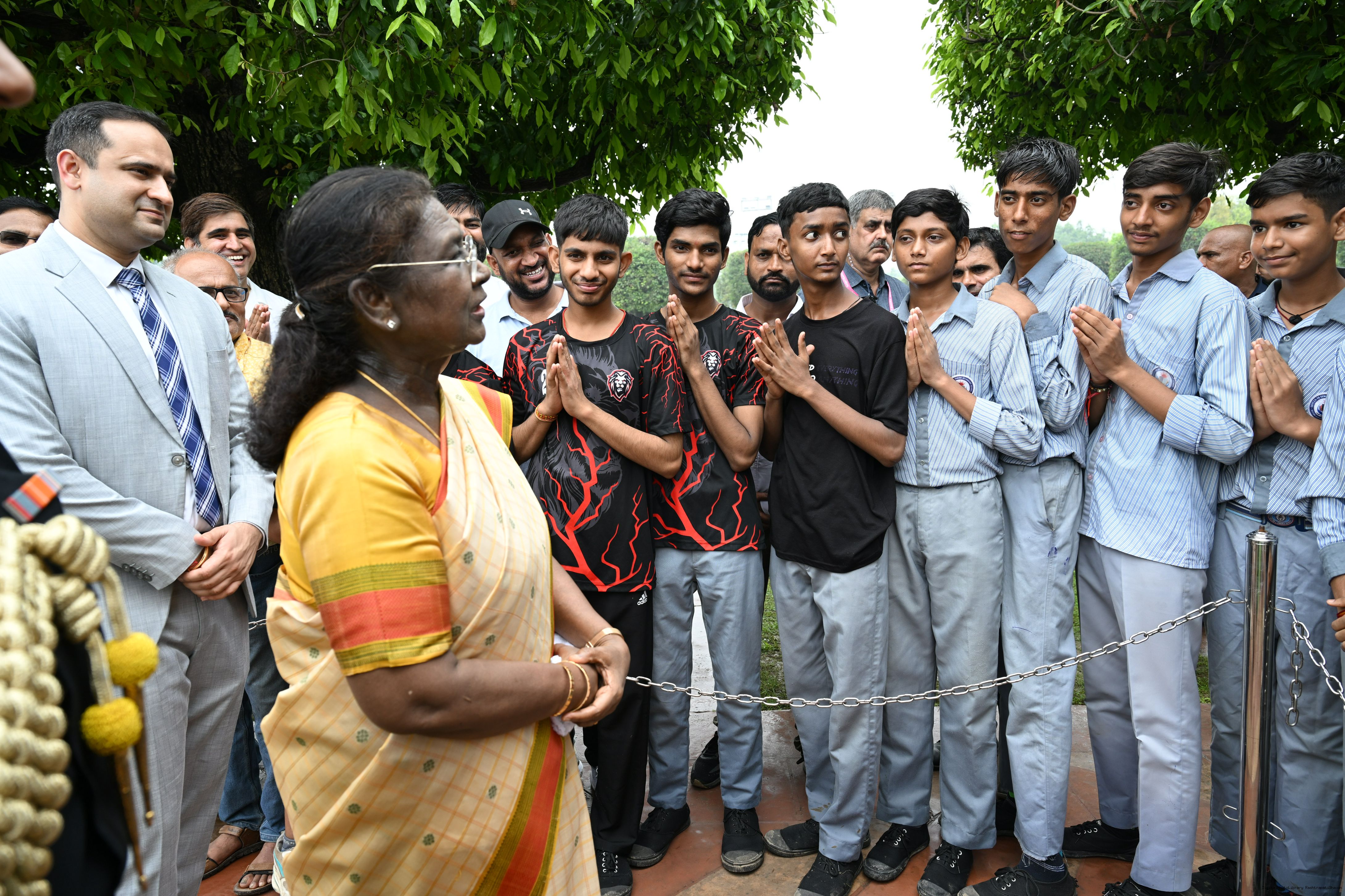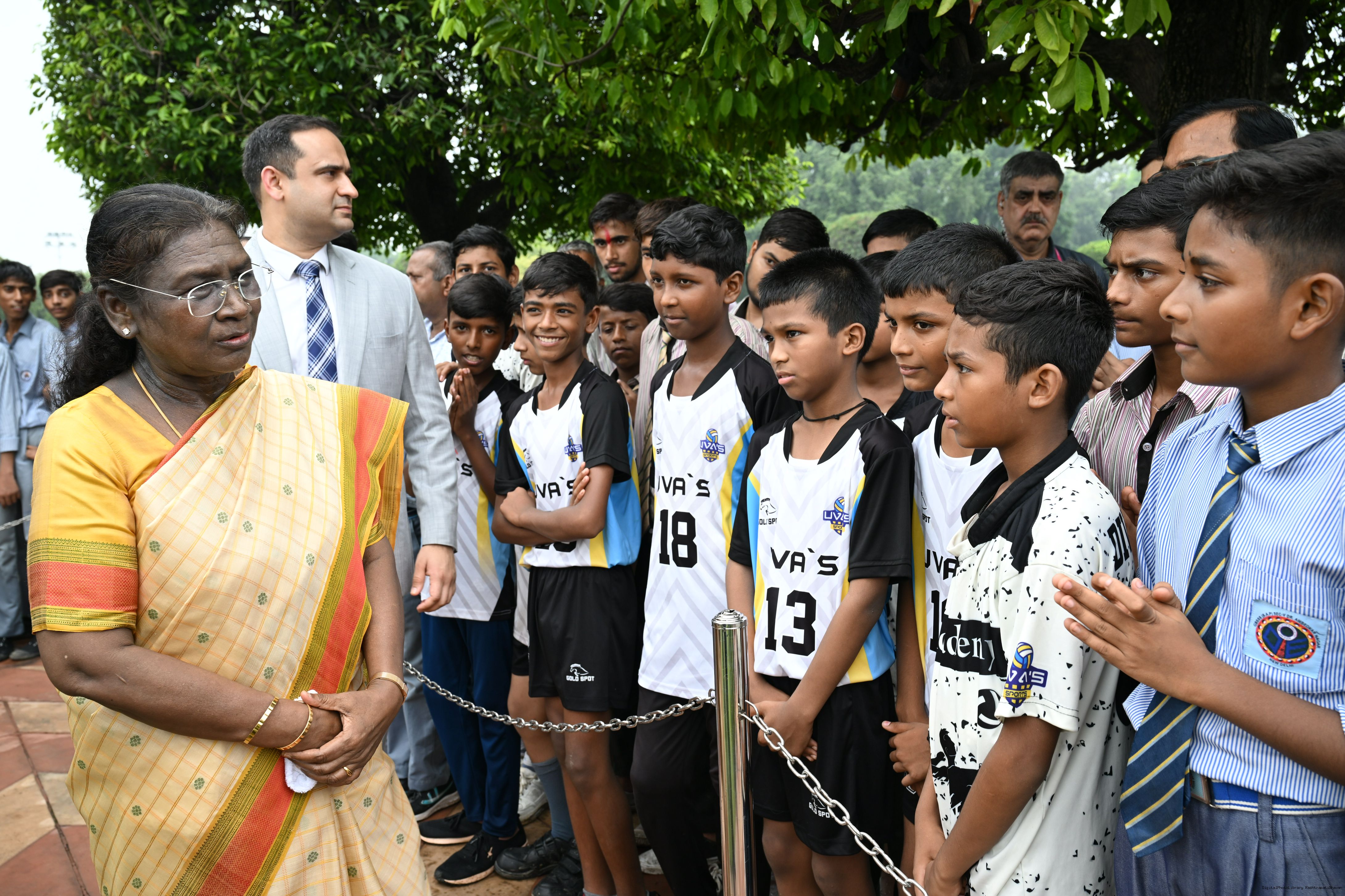 | Caption: | The President of India, Smt Droupadi Murmu interacted with sportspersons who visited Amrit Udyan on National Sports Day at Rashtrapati Bhavan on August 29, 2025. |