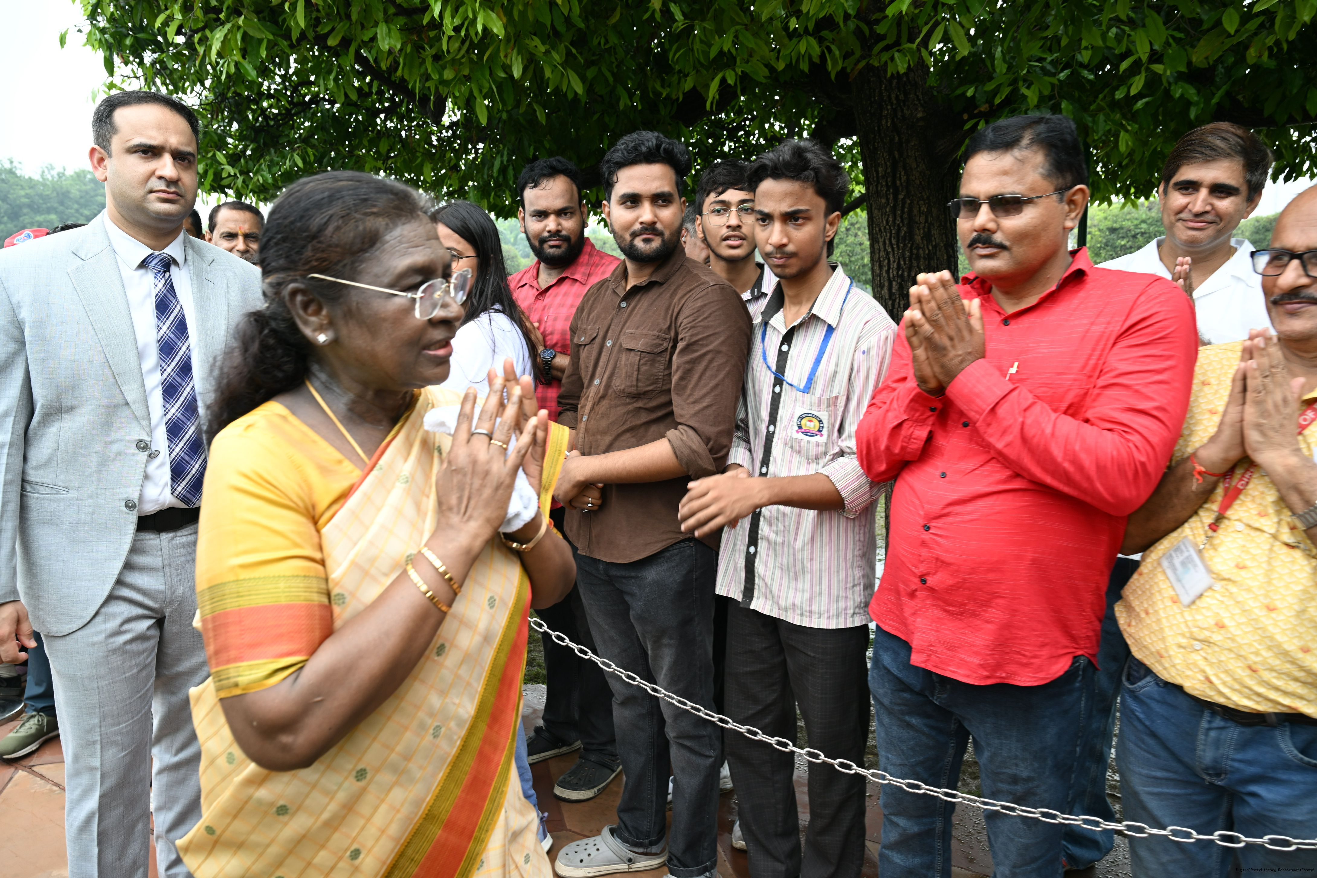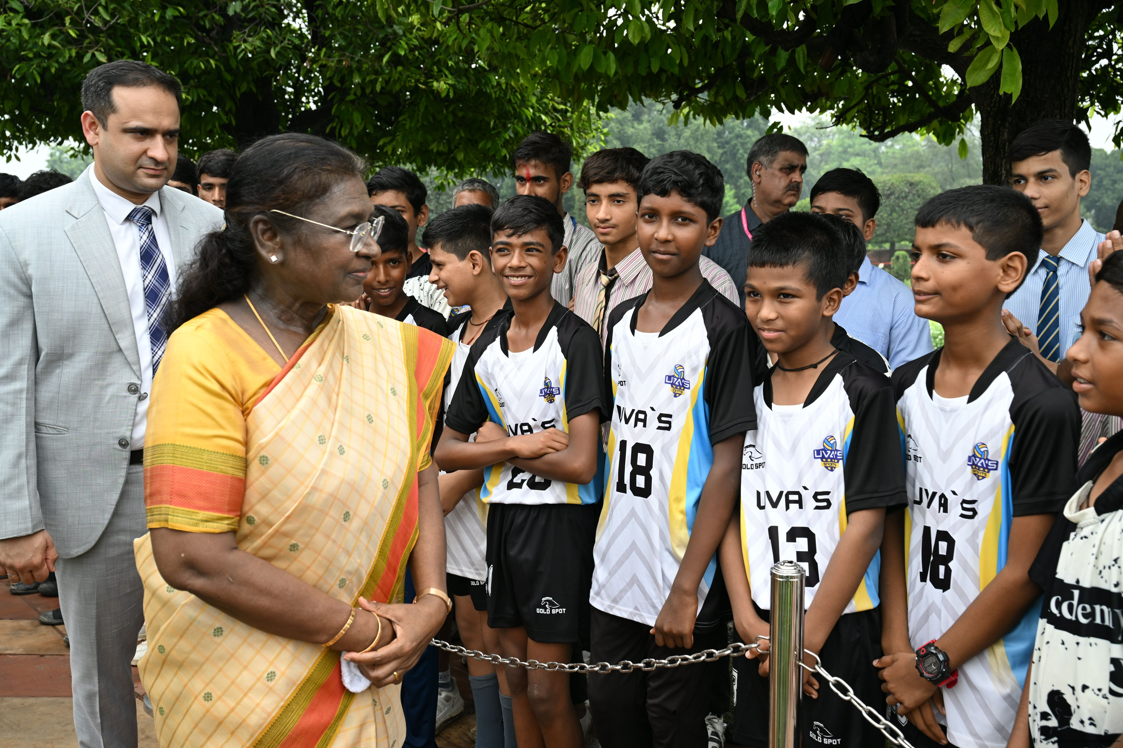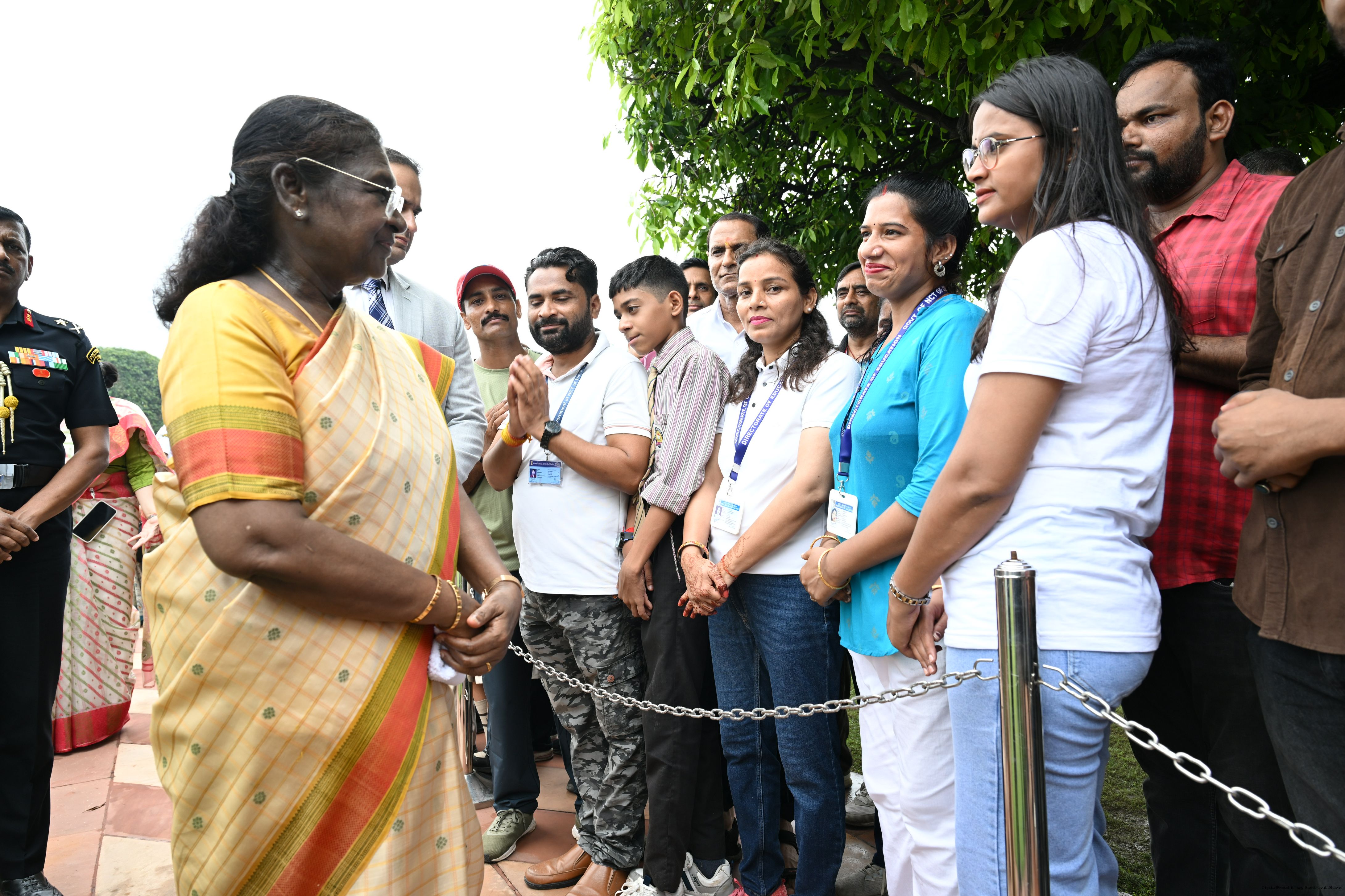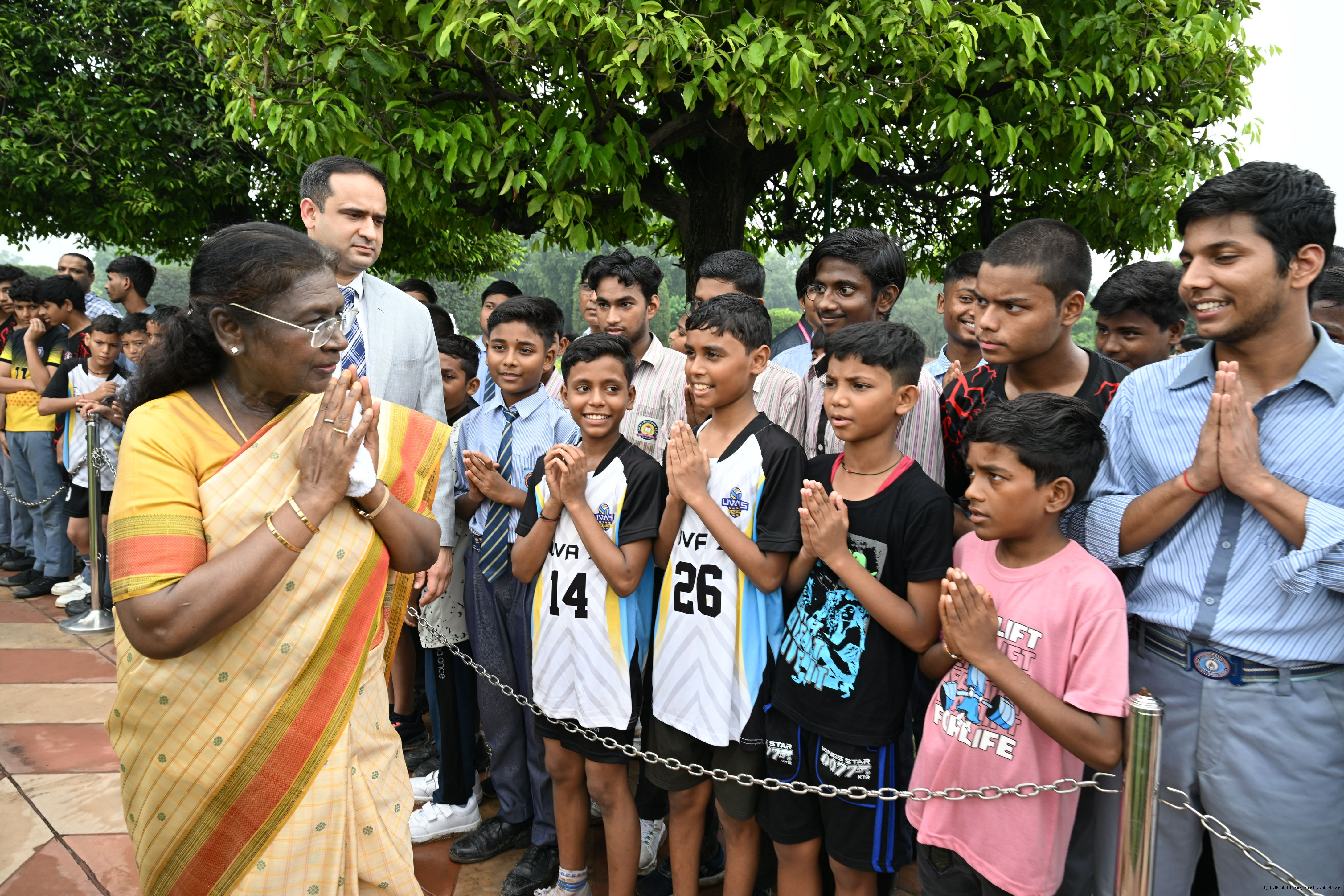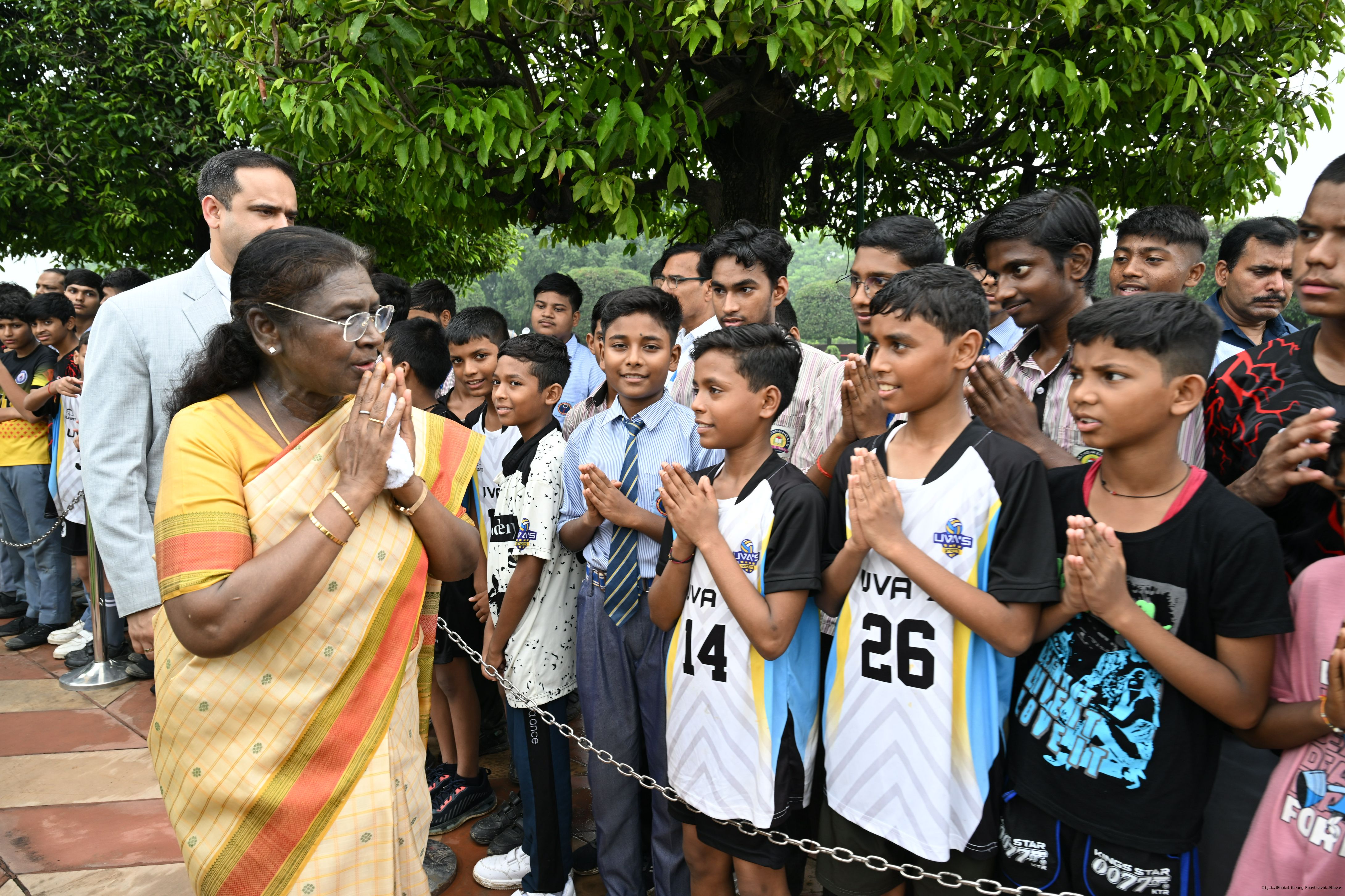 | Caption: | The President of India, Smt Droupadi Murmu interacted with sportspersons who visited Amrit Udyan on National Sports Day at Rashtrapati Bhavan on August 29, 2025. |