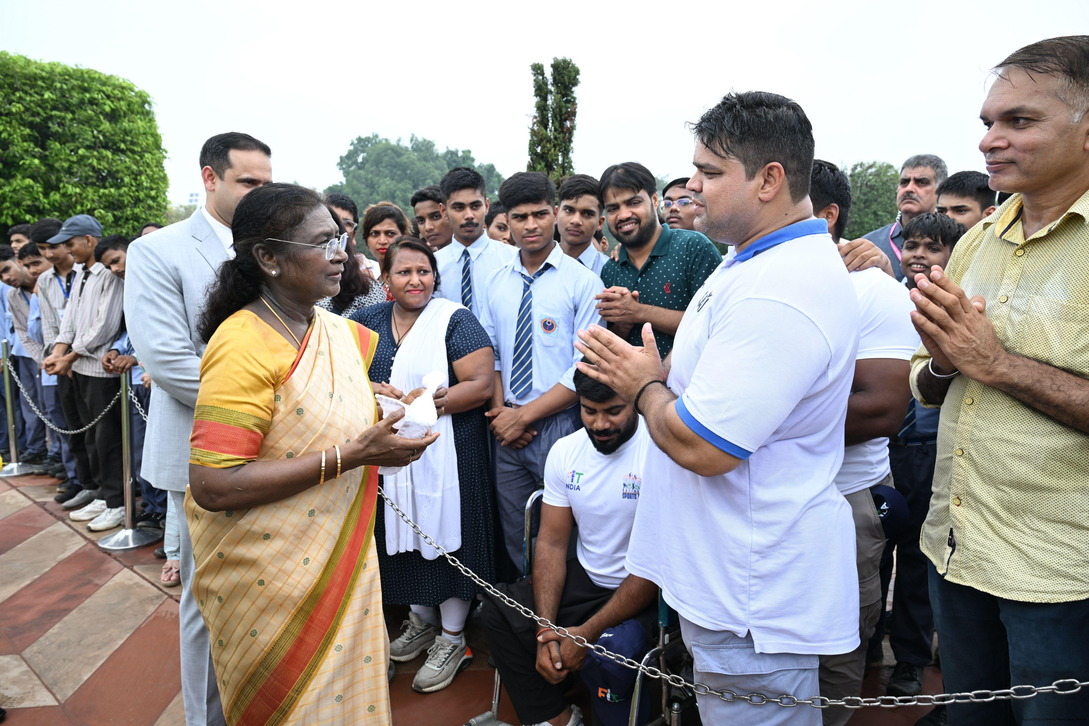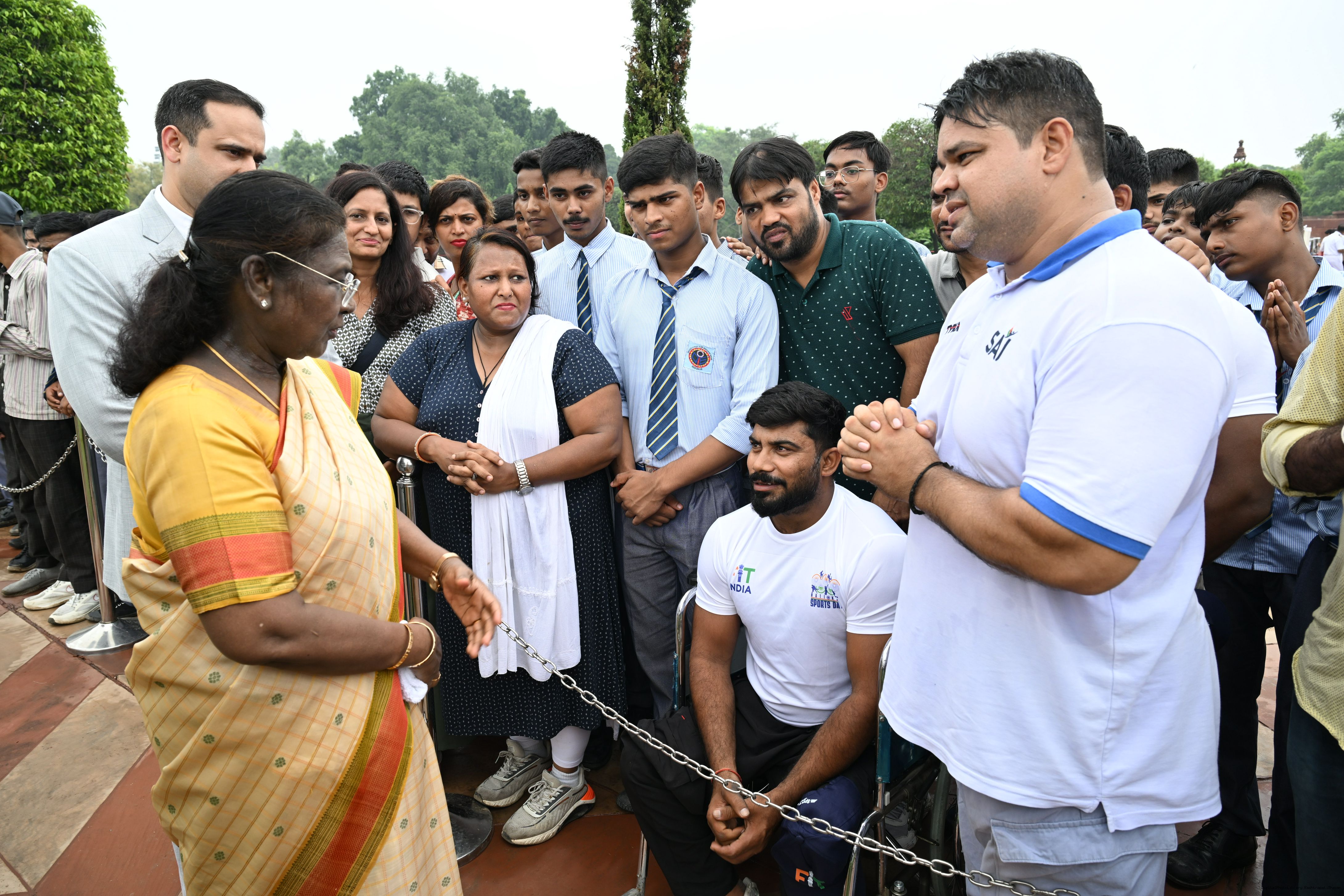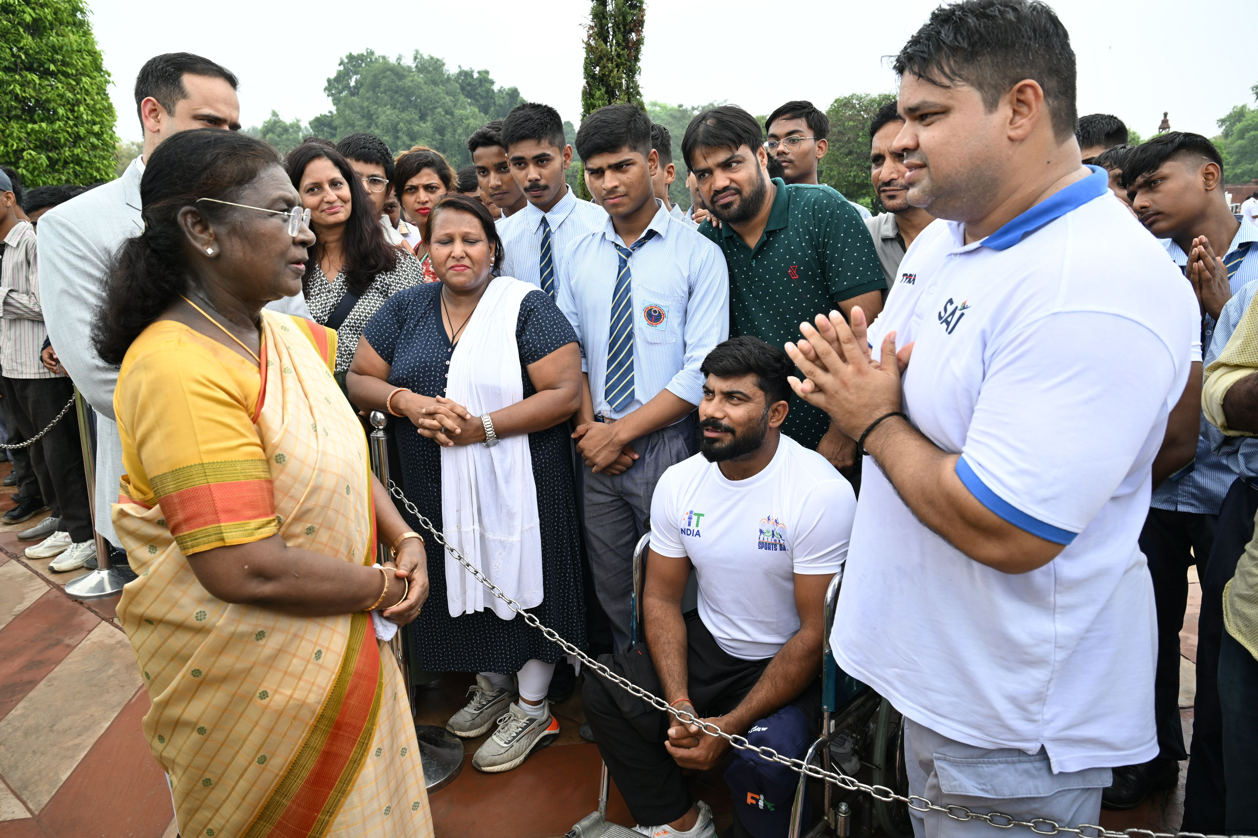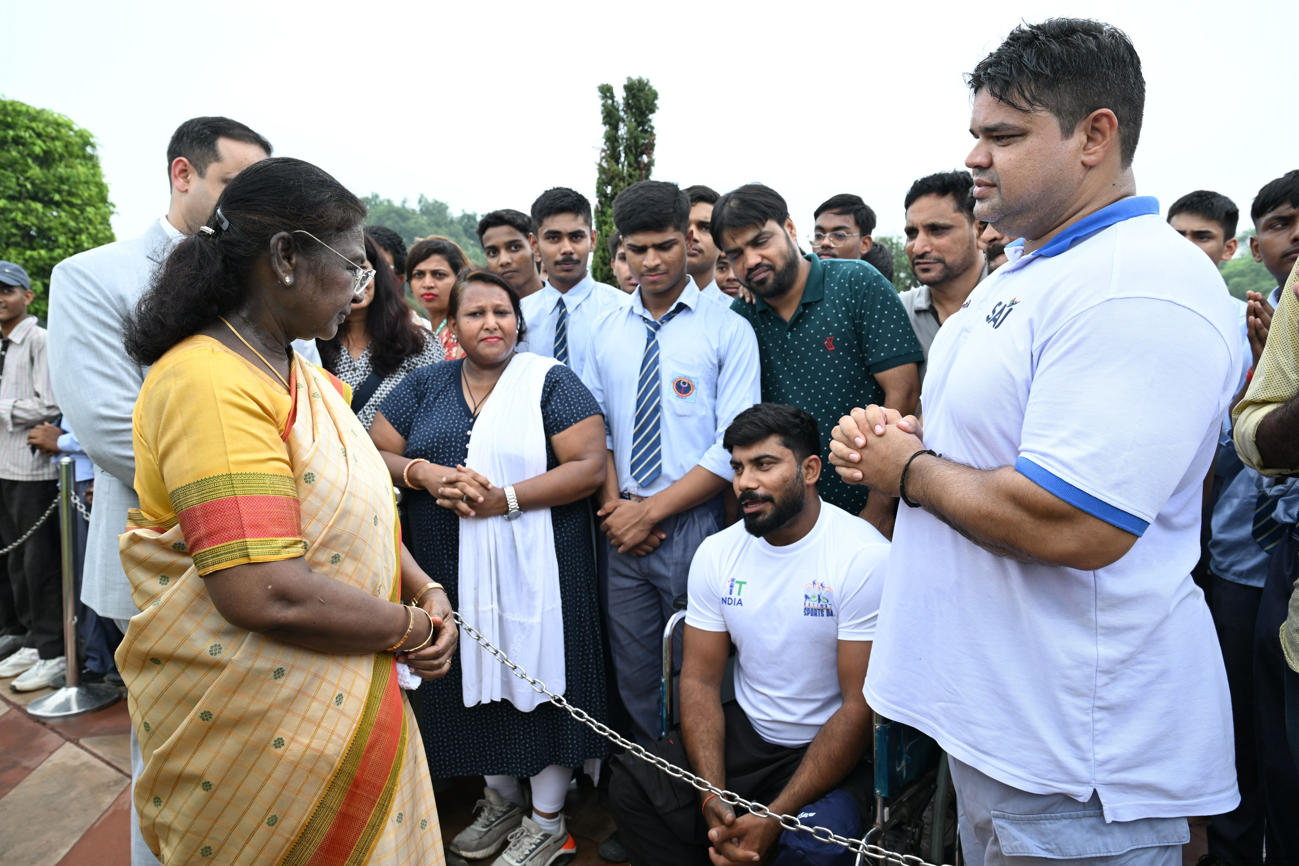 | Caption: | The President of India, Smt Droupadi Murmu interacted with sportspersons who visited Amrit Udyan on National Sports Day at Rashtrapati Bhavan on August 29, 2025. |