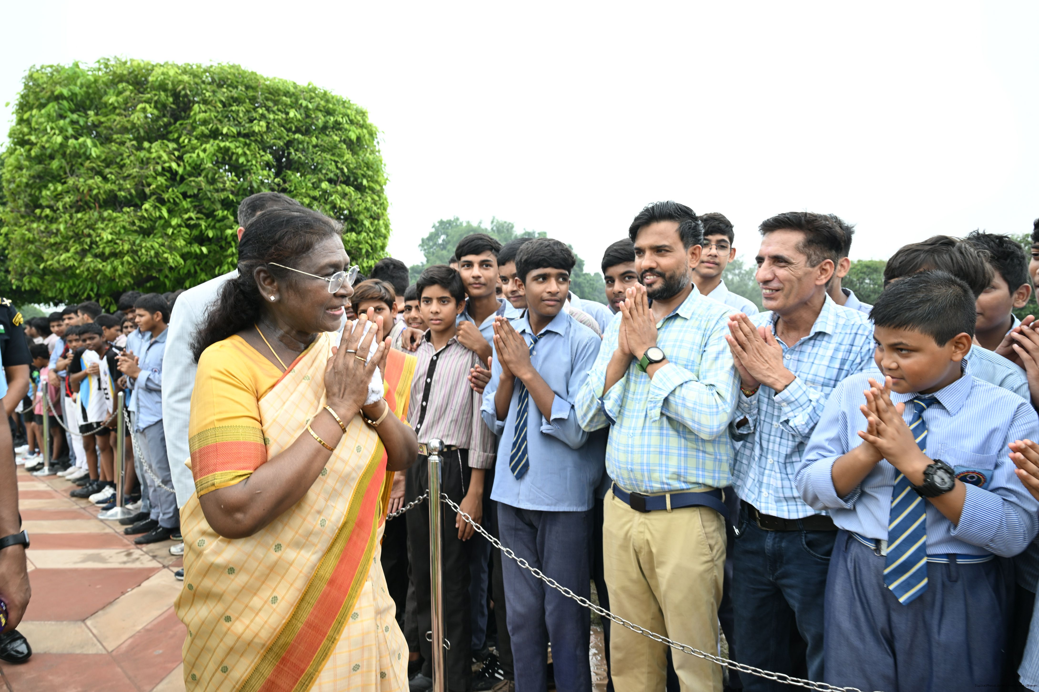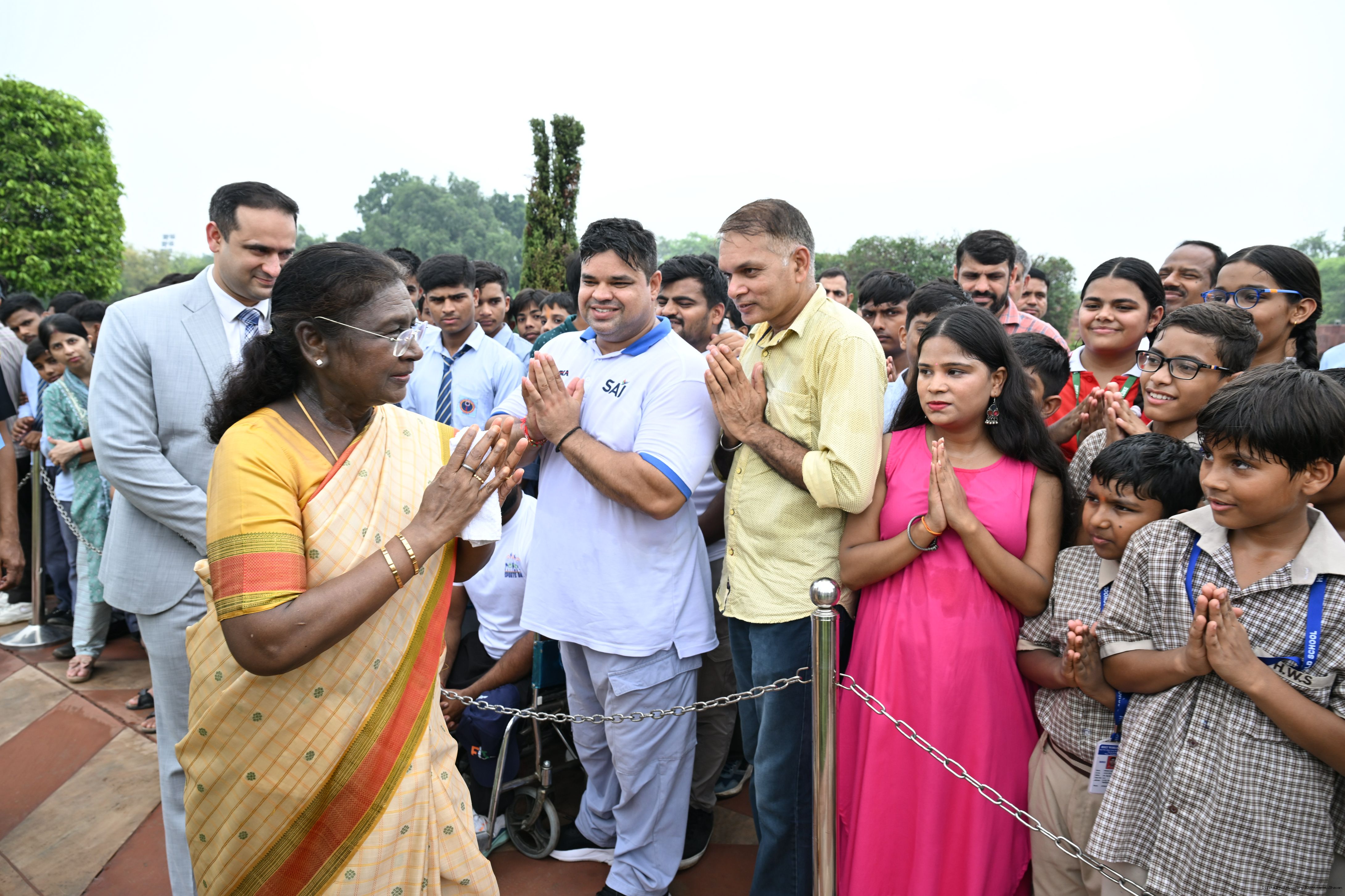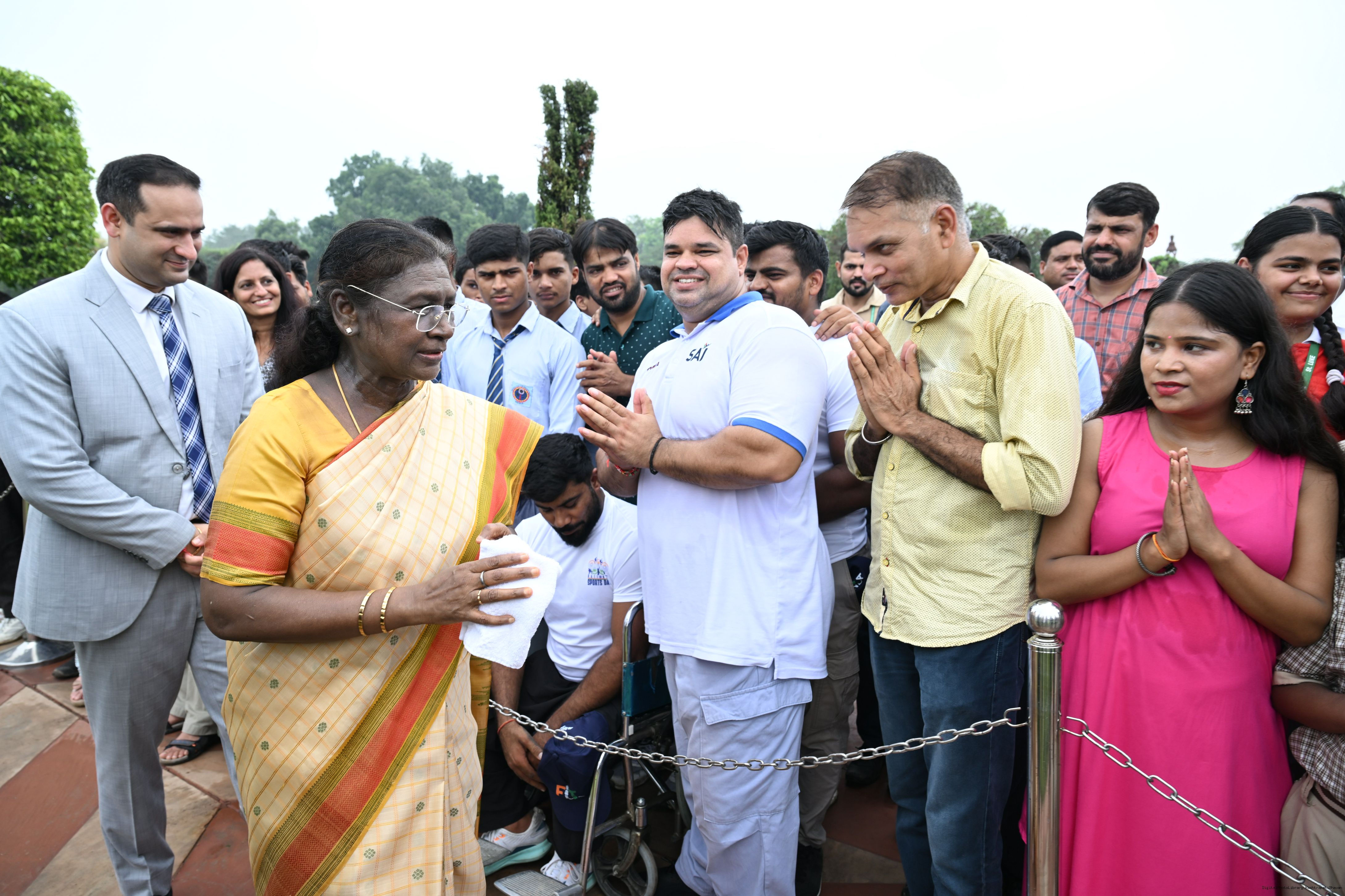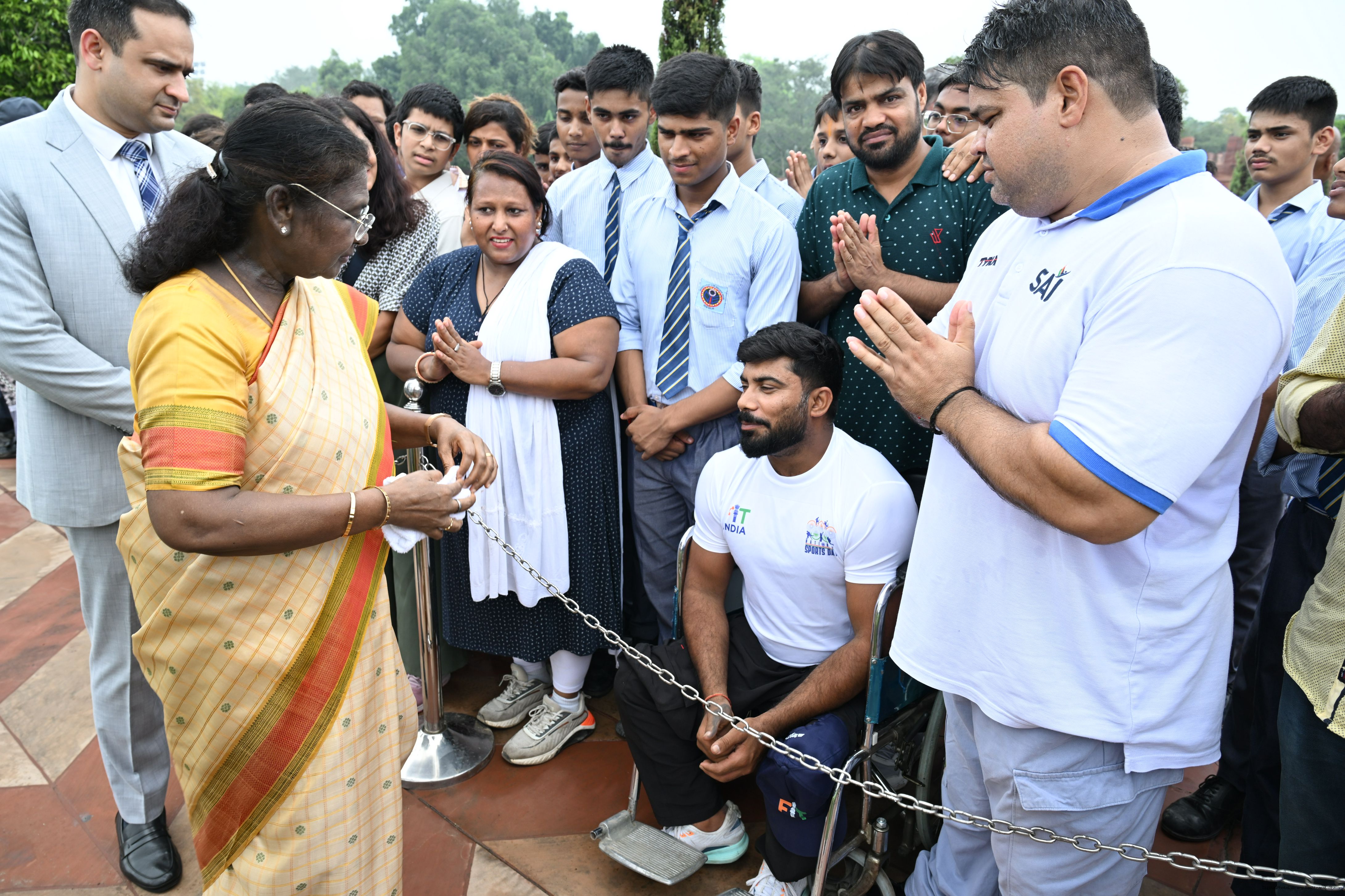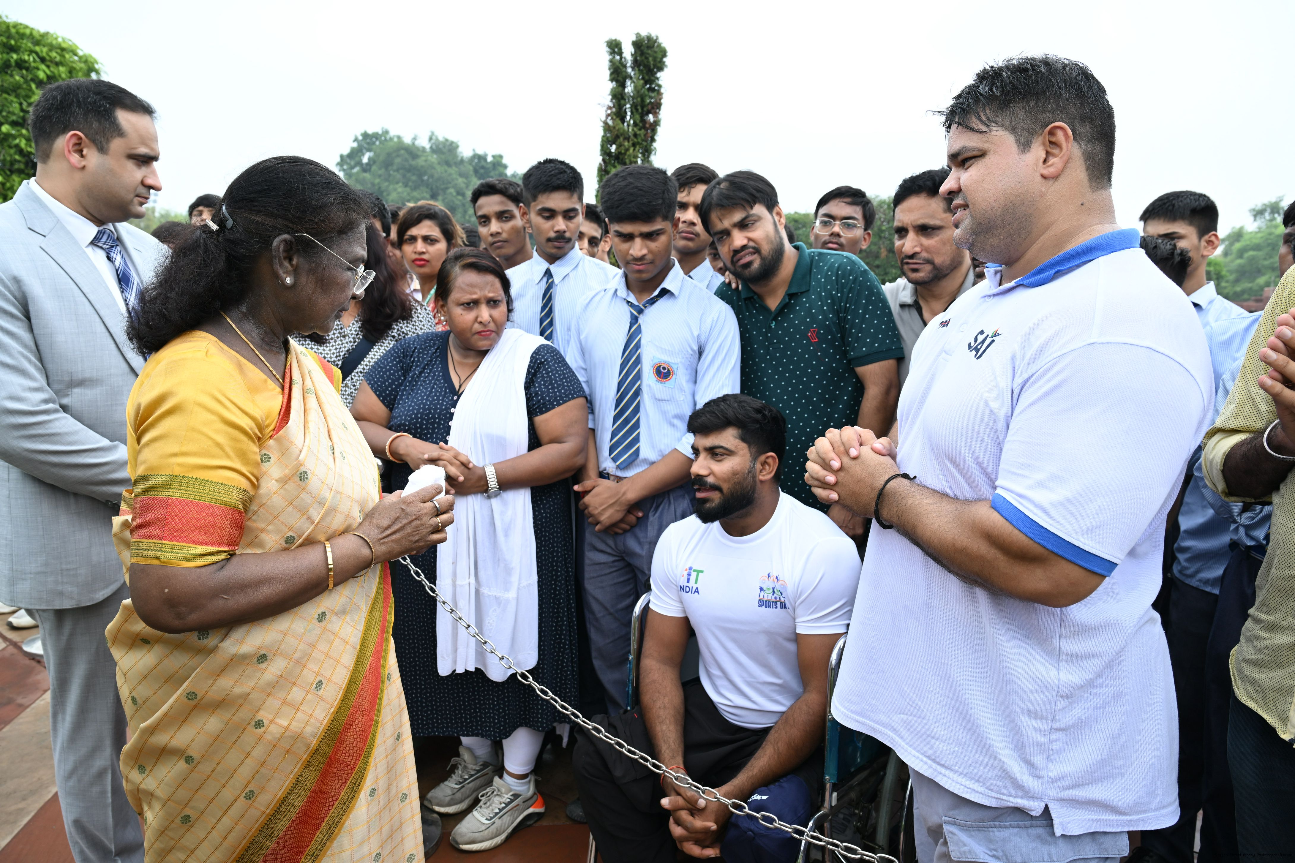 | Caption: | The President of India, Smt Droupadi Murmu interacted with sportspersons who visited Amrit Udyan on National Sports Day at Rashtrapati Bhavan on August 29, 2025. |