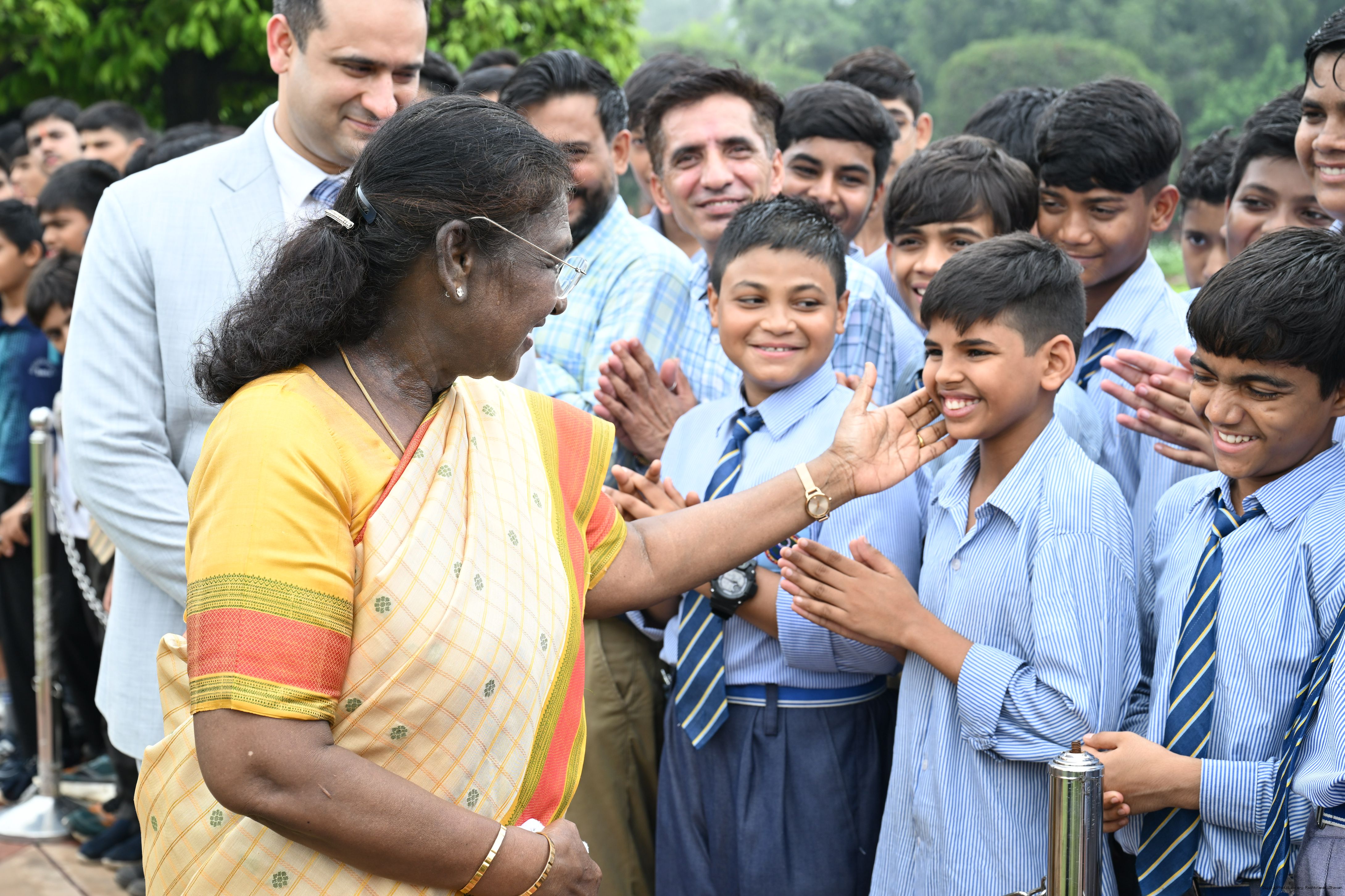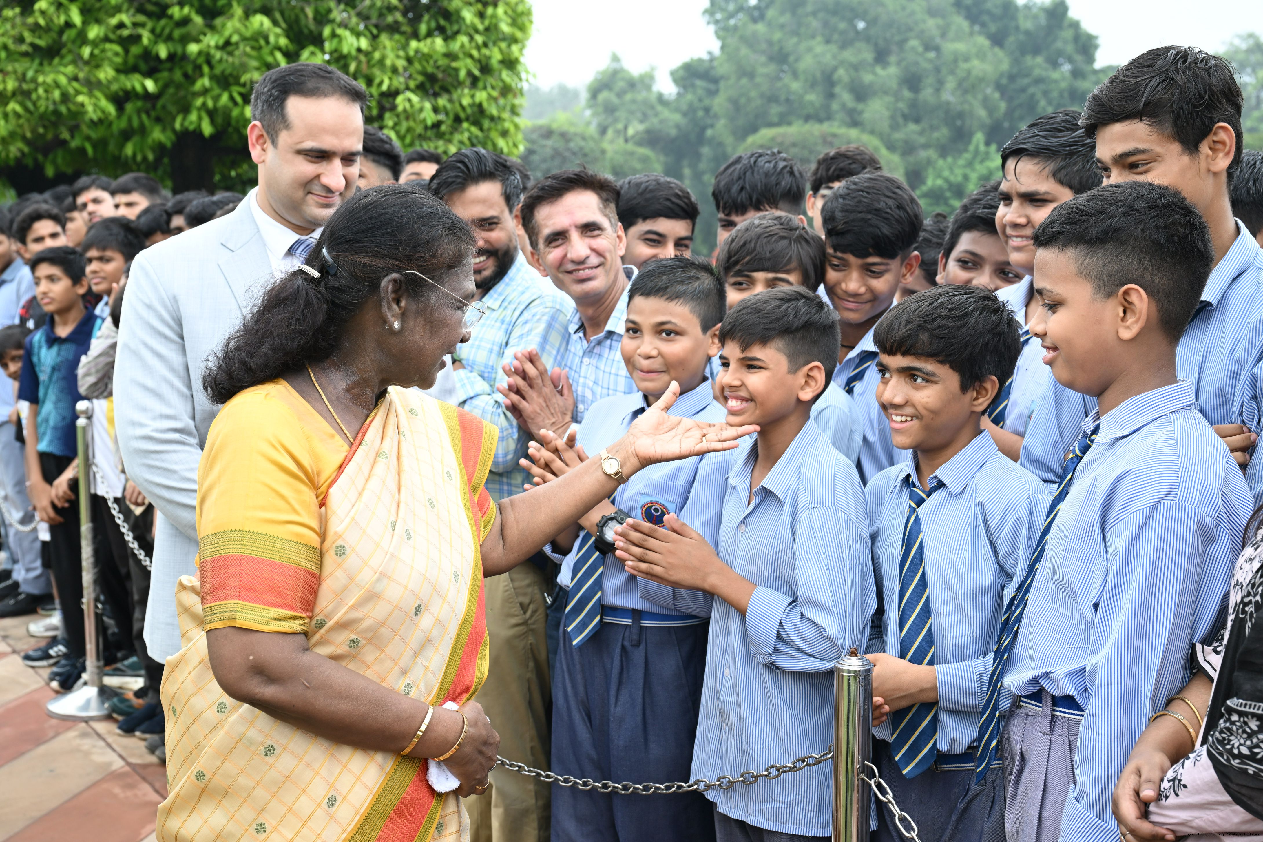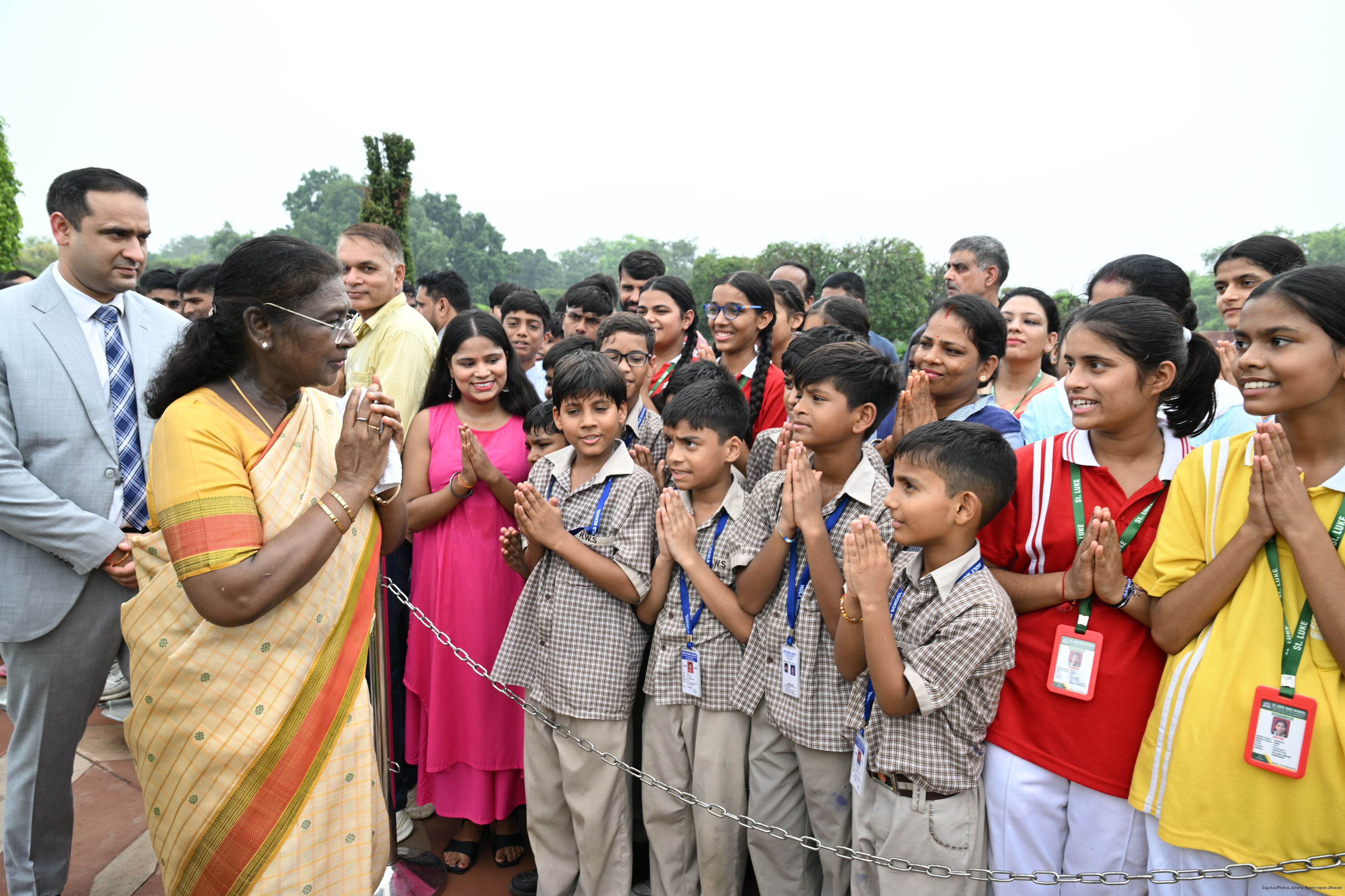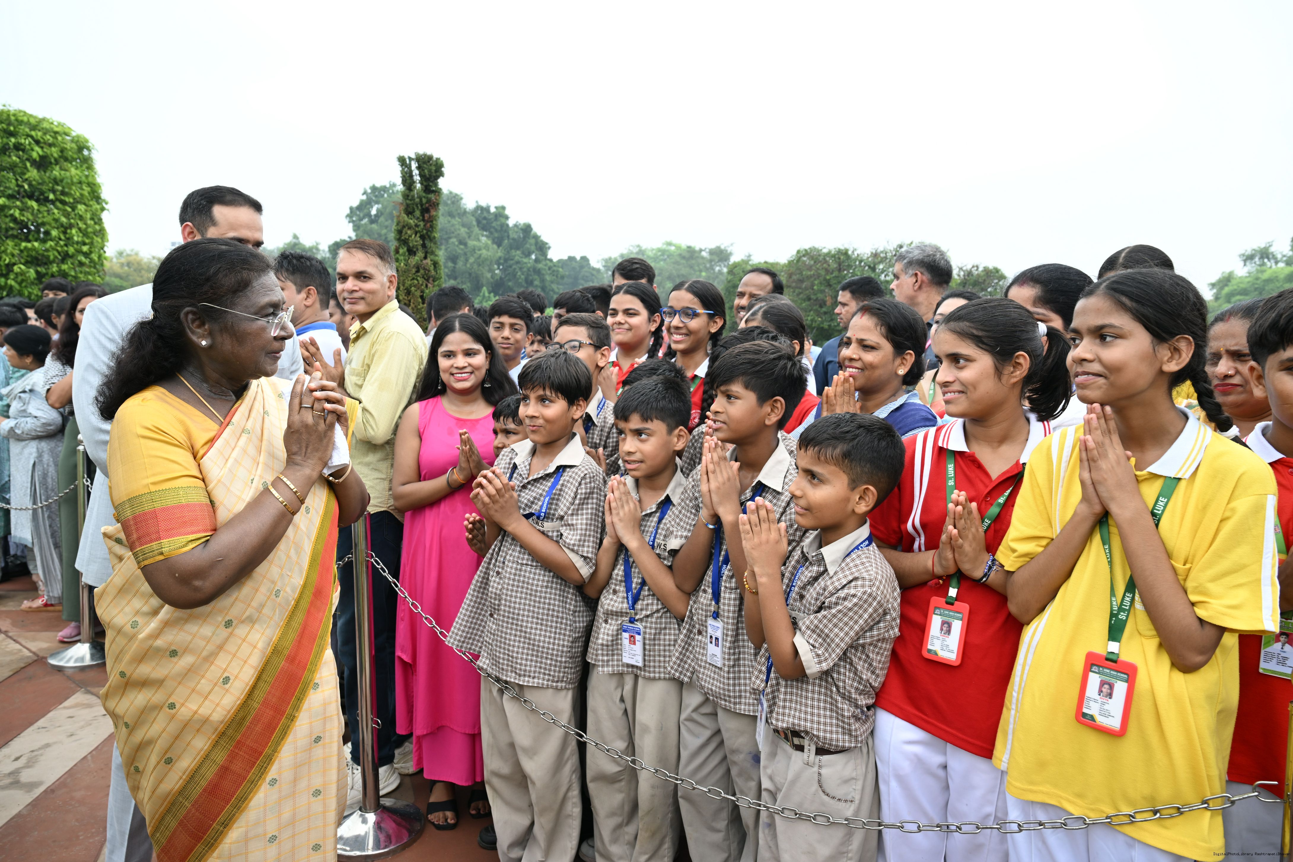 | Caption: | The President of India, Smt Droupadi Murmu interacted with sportspersons who visited Amrit Udyan on National Sports Day at Rashtrapati Bhavan on August 29, 2025. |
