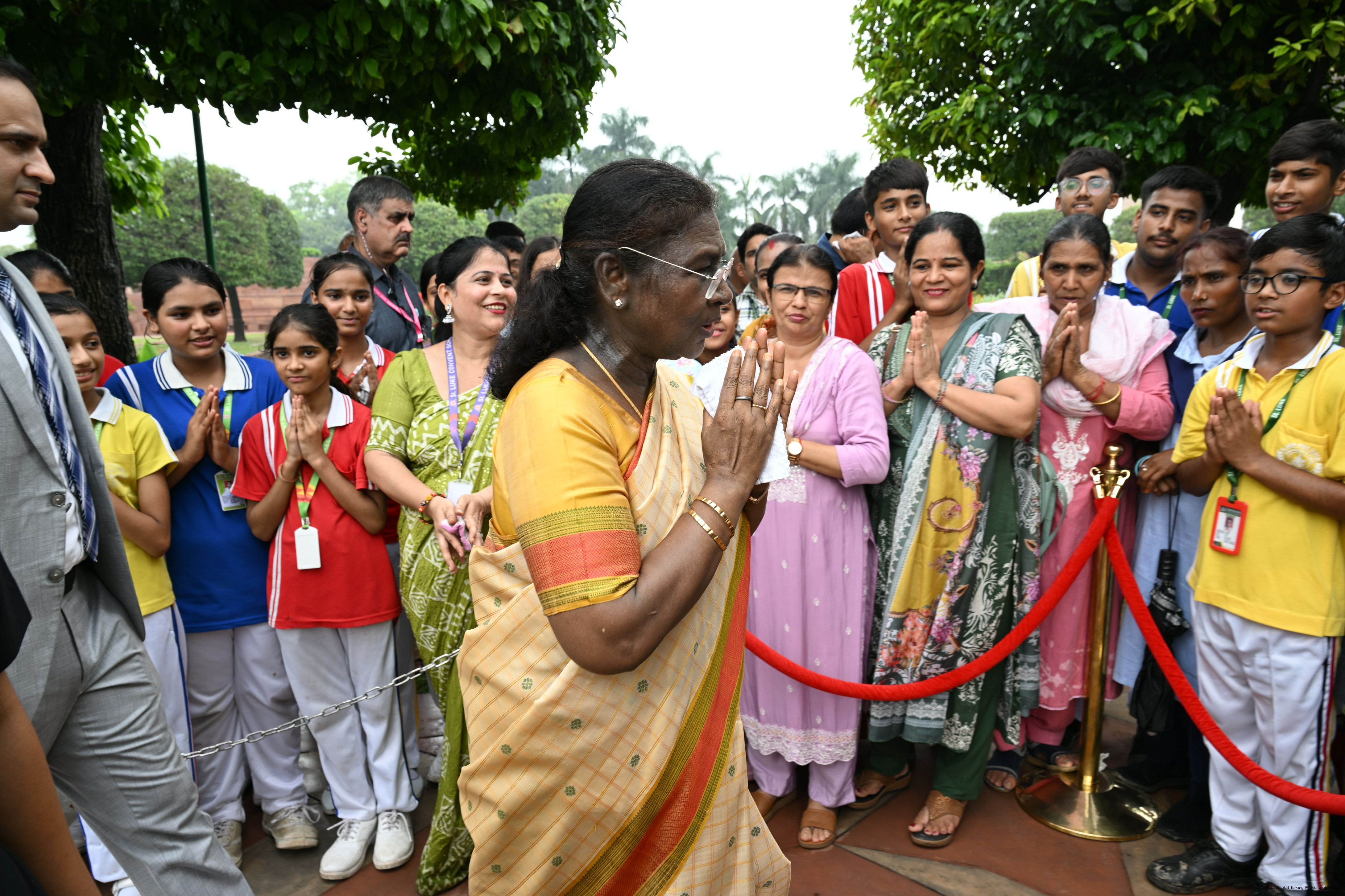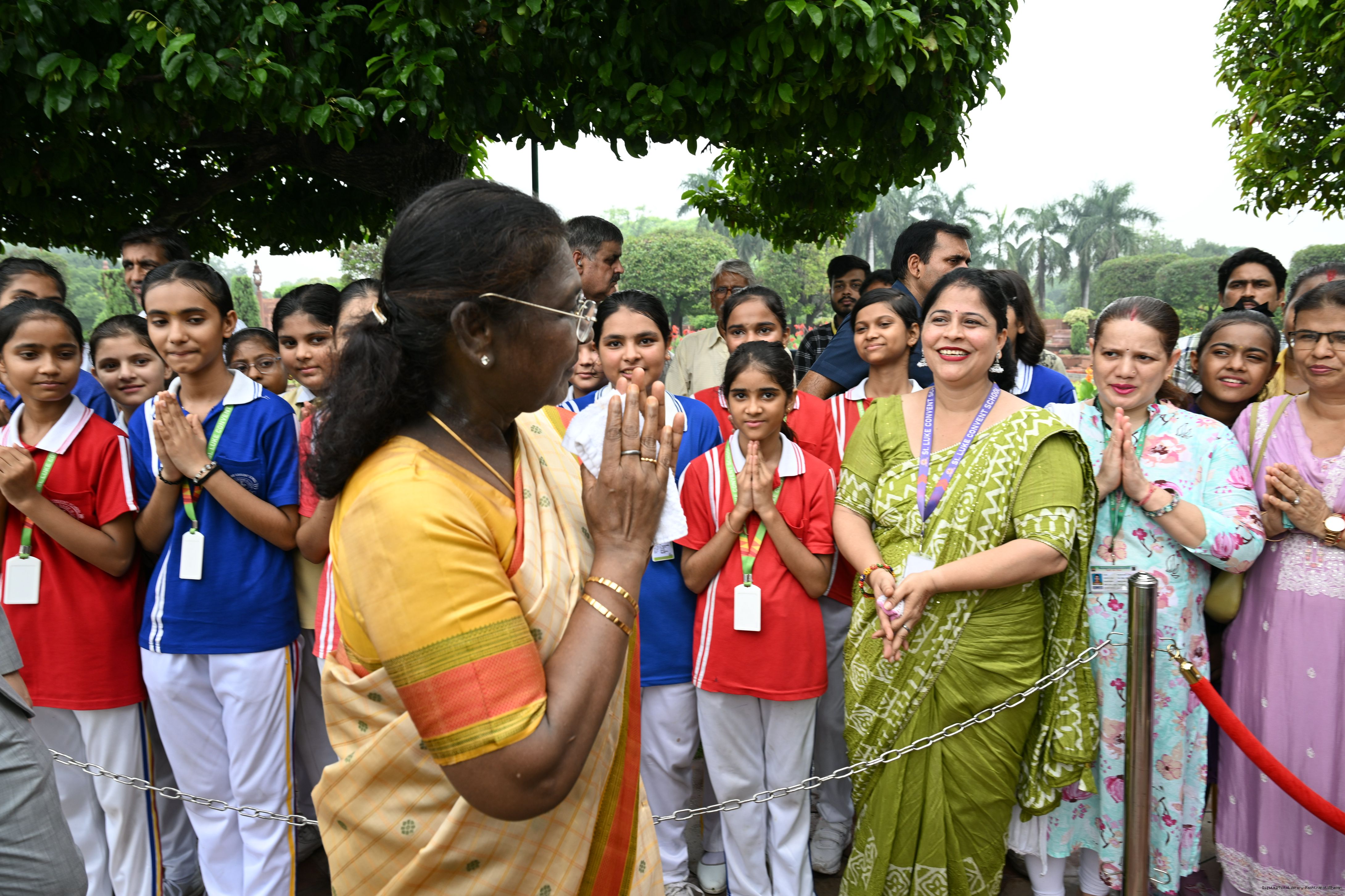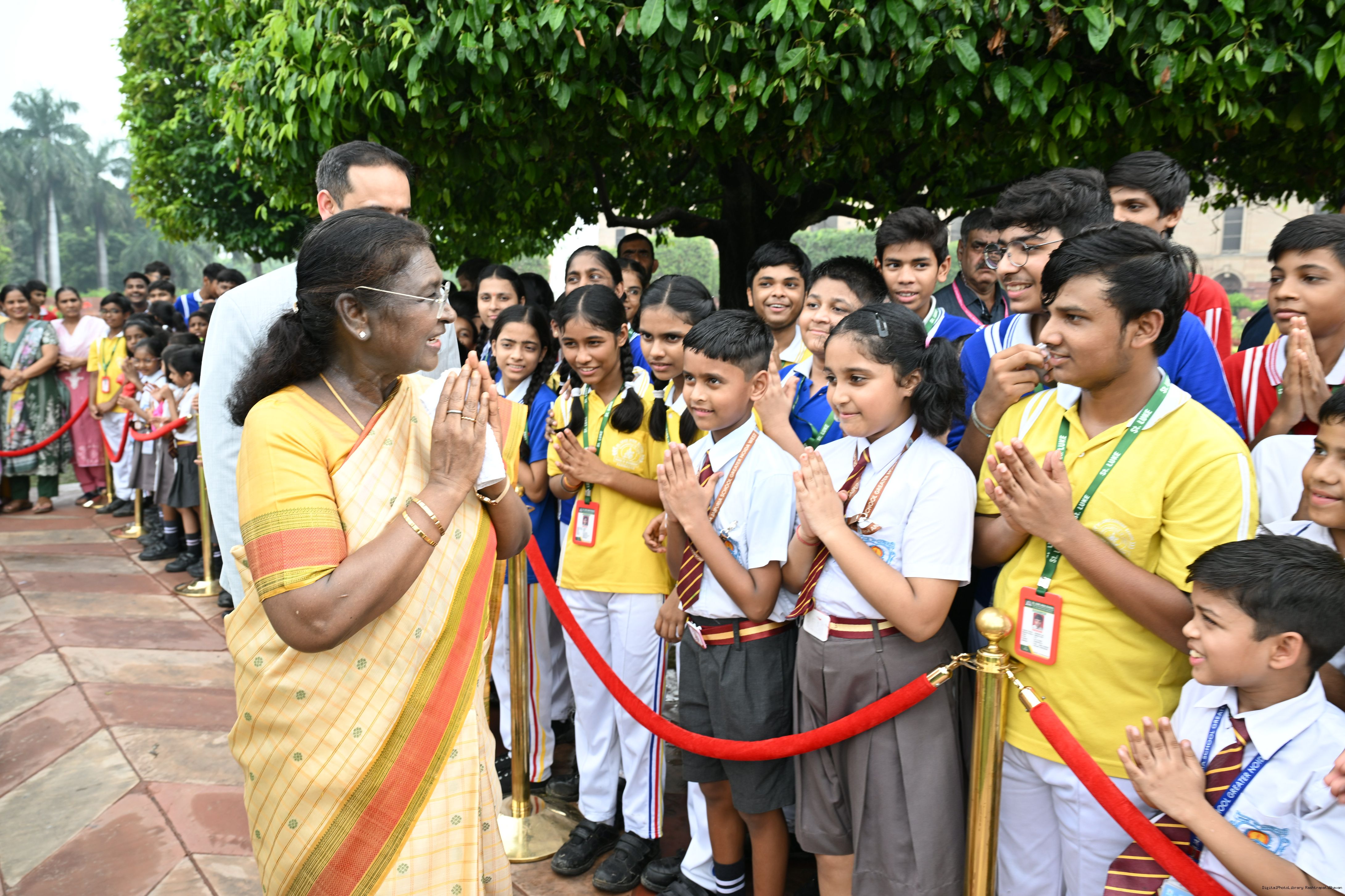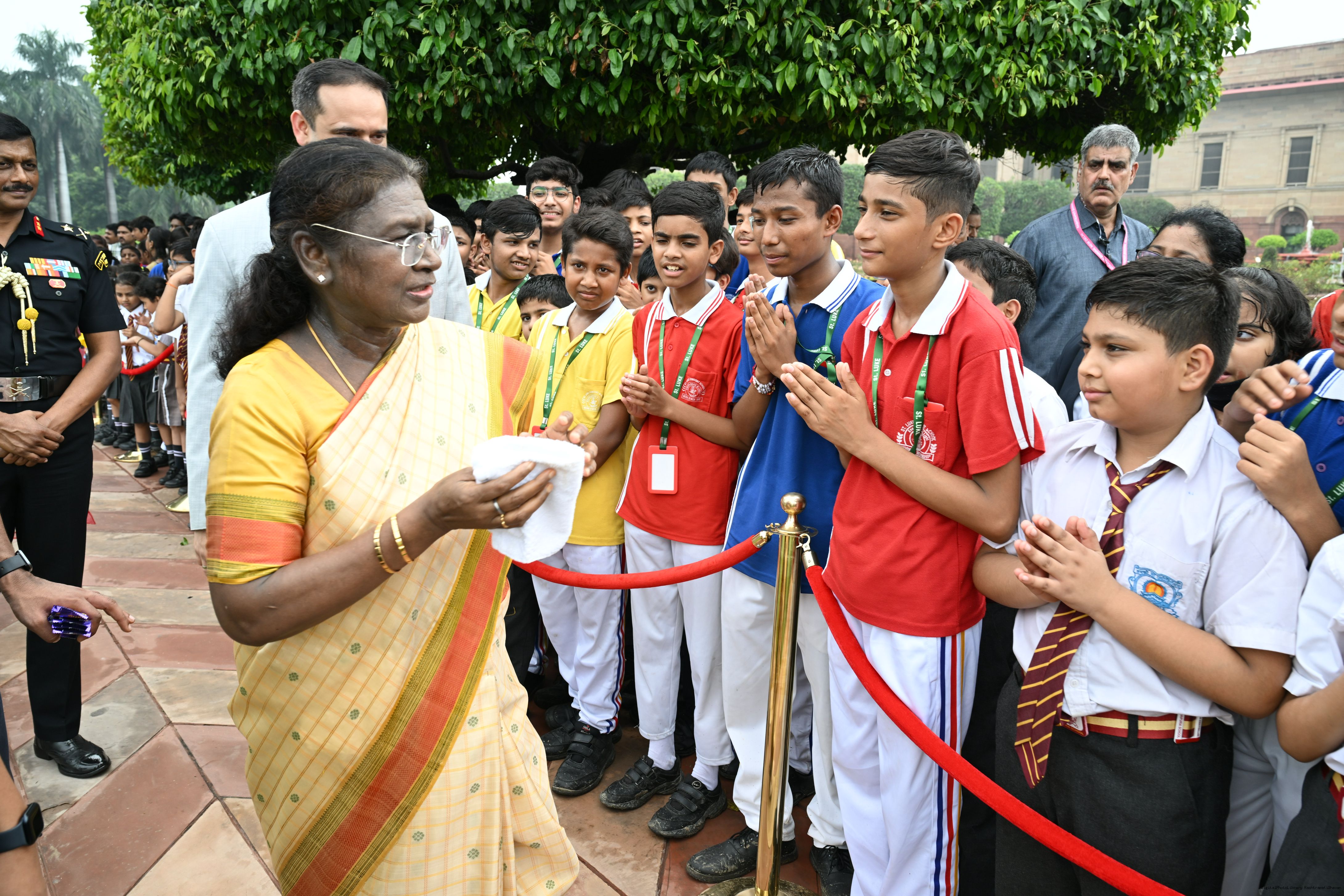 | Caption: | The President of India, Smt Droupadi Murmu interacted with sportspersons who visited Amrit Udyan on National Sports Day at Rashtrapati Bhavan on August 29, 2025. |