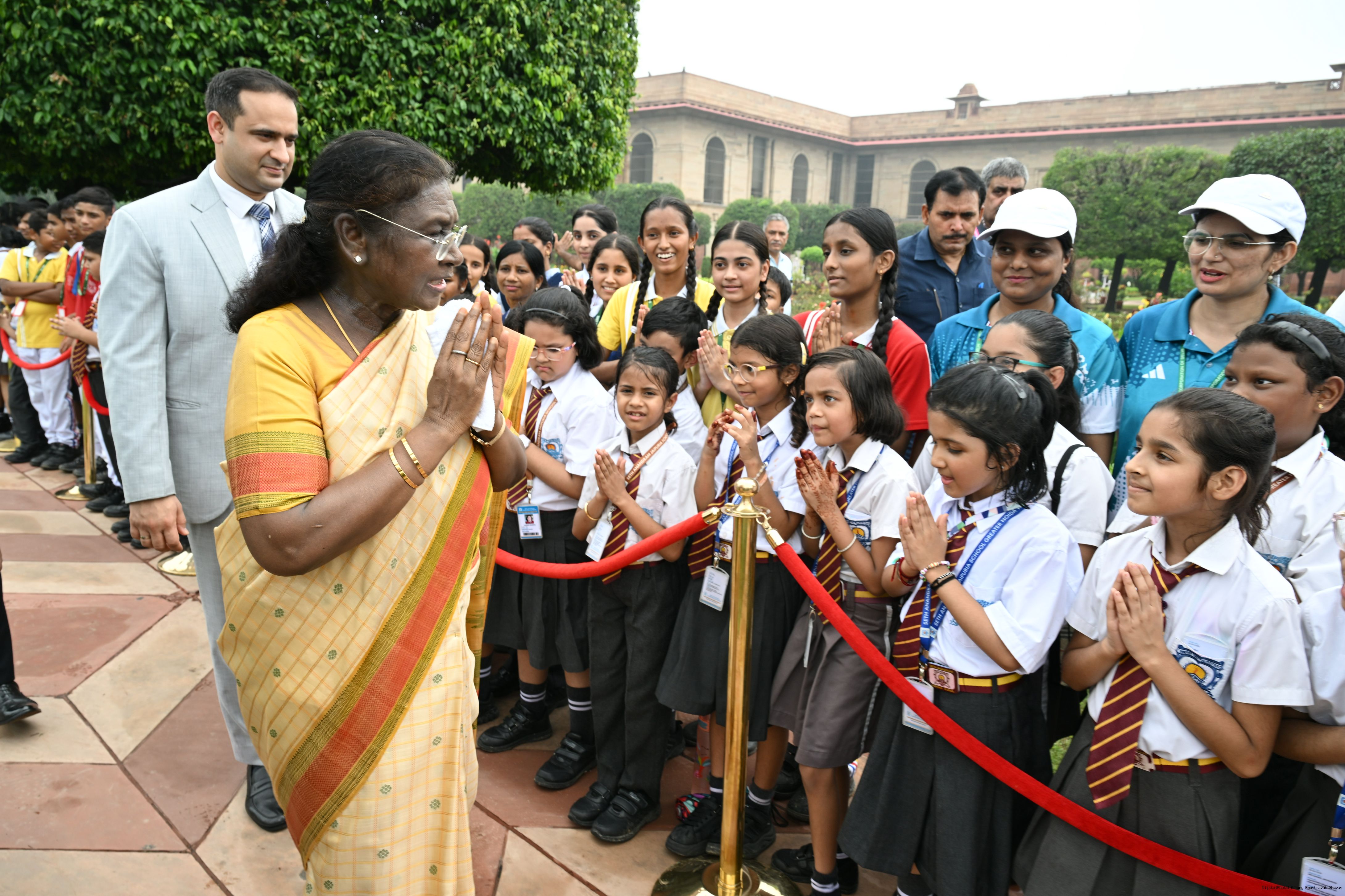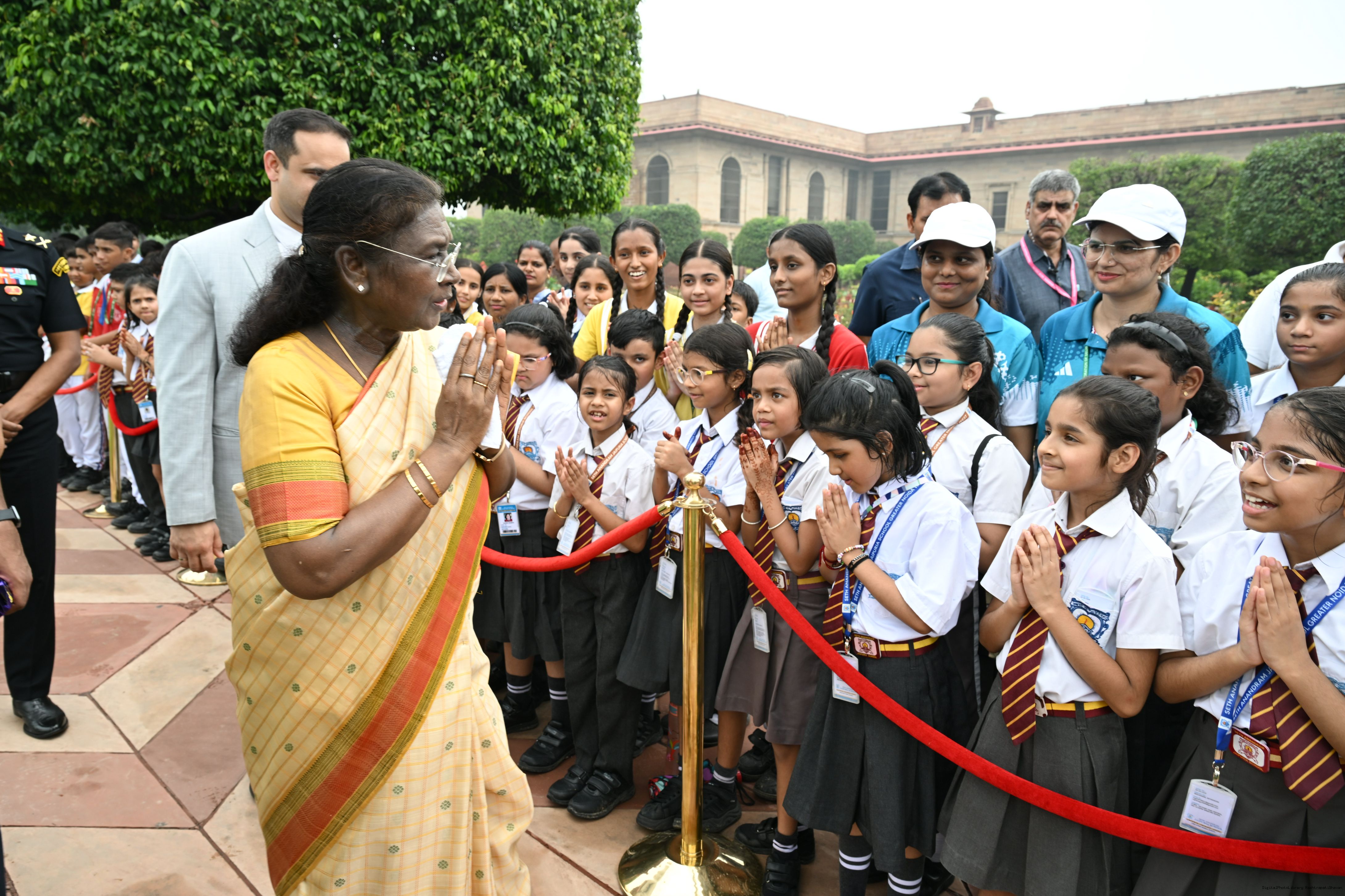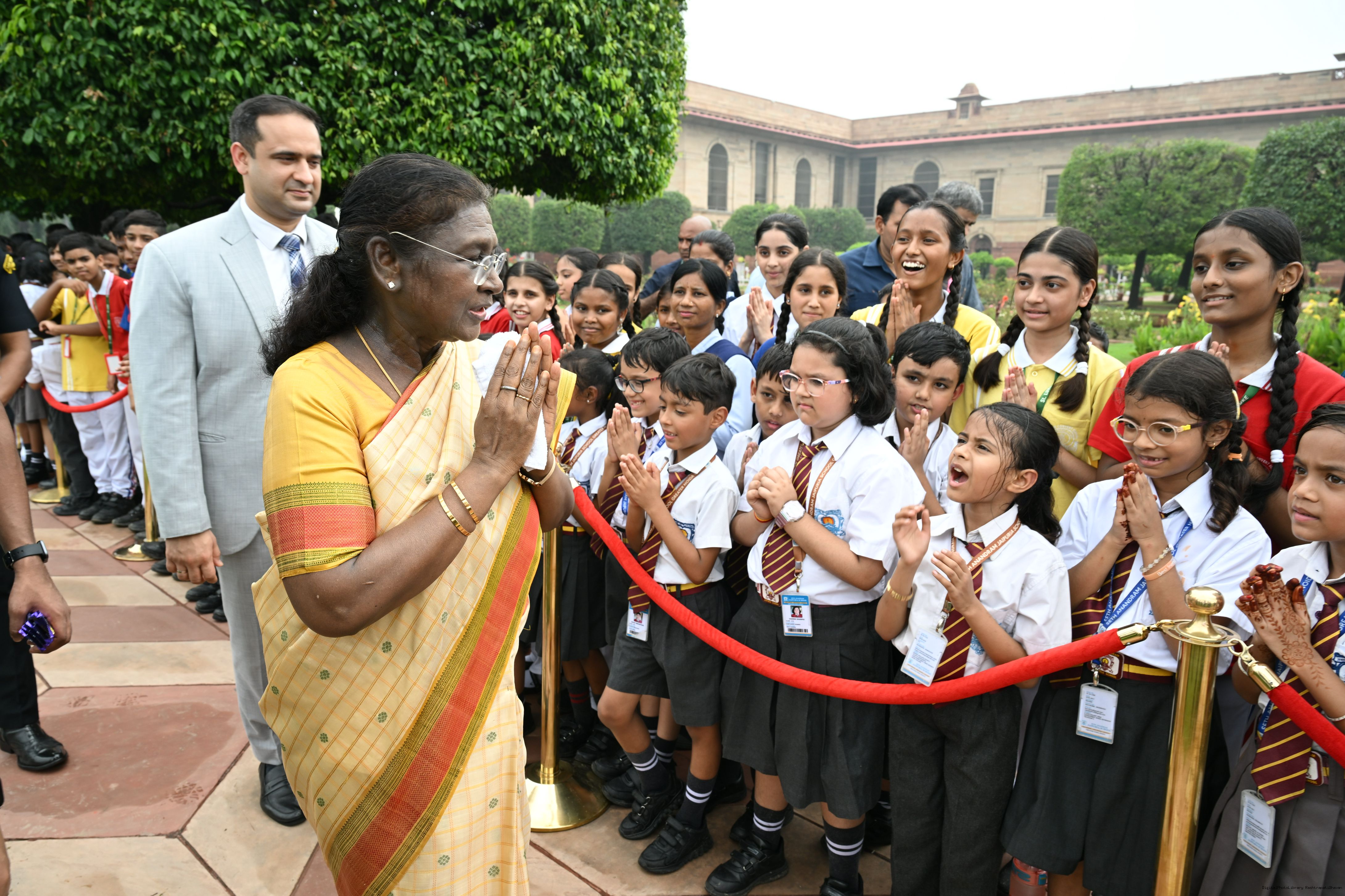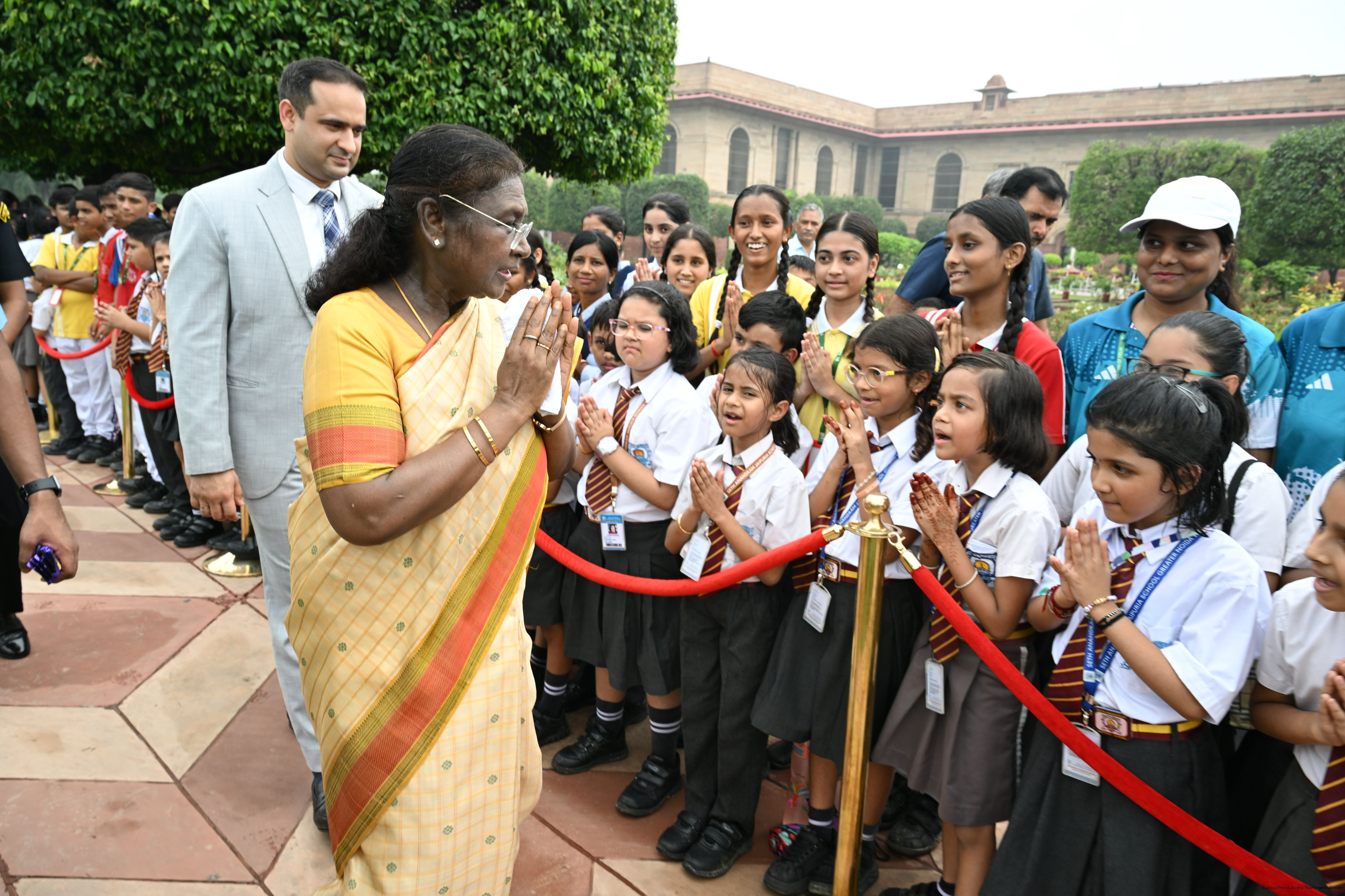 | Caption: | The President of India, Smt Droupadi Murmu interacted with sportspersons who visited Amrit Udyan on National Sports Day at Rashtrapati Bhavan on August 29, 2025. |