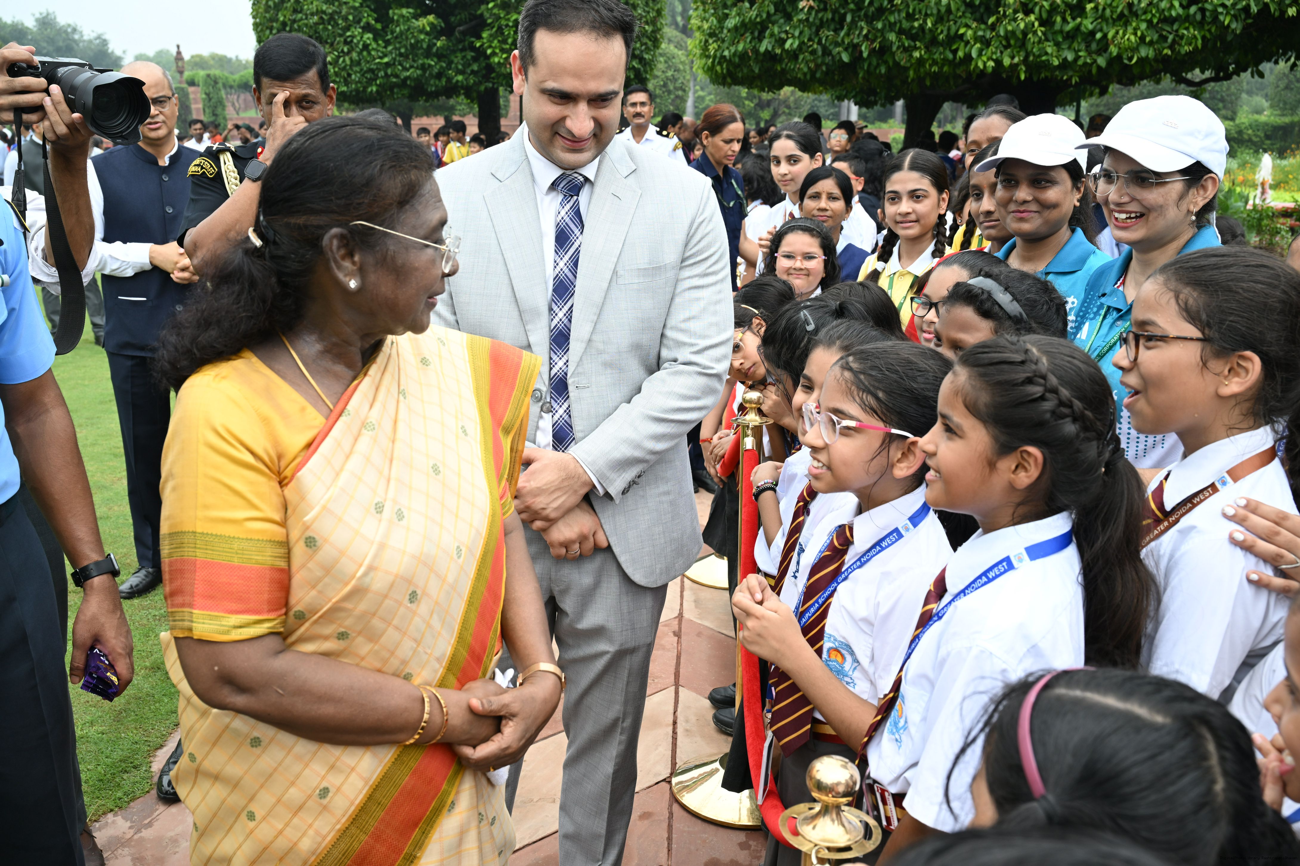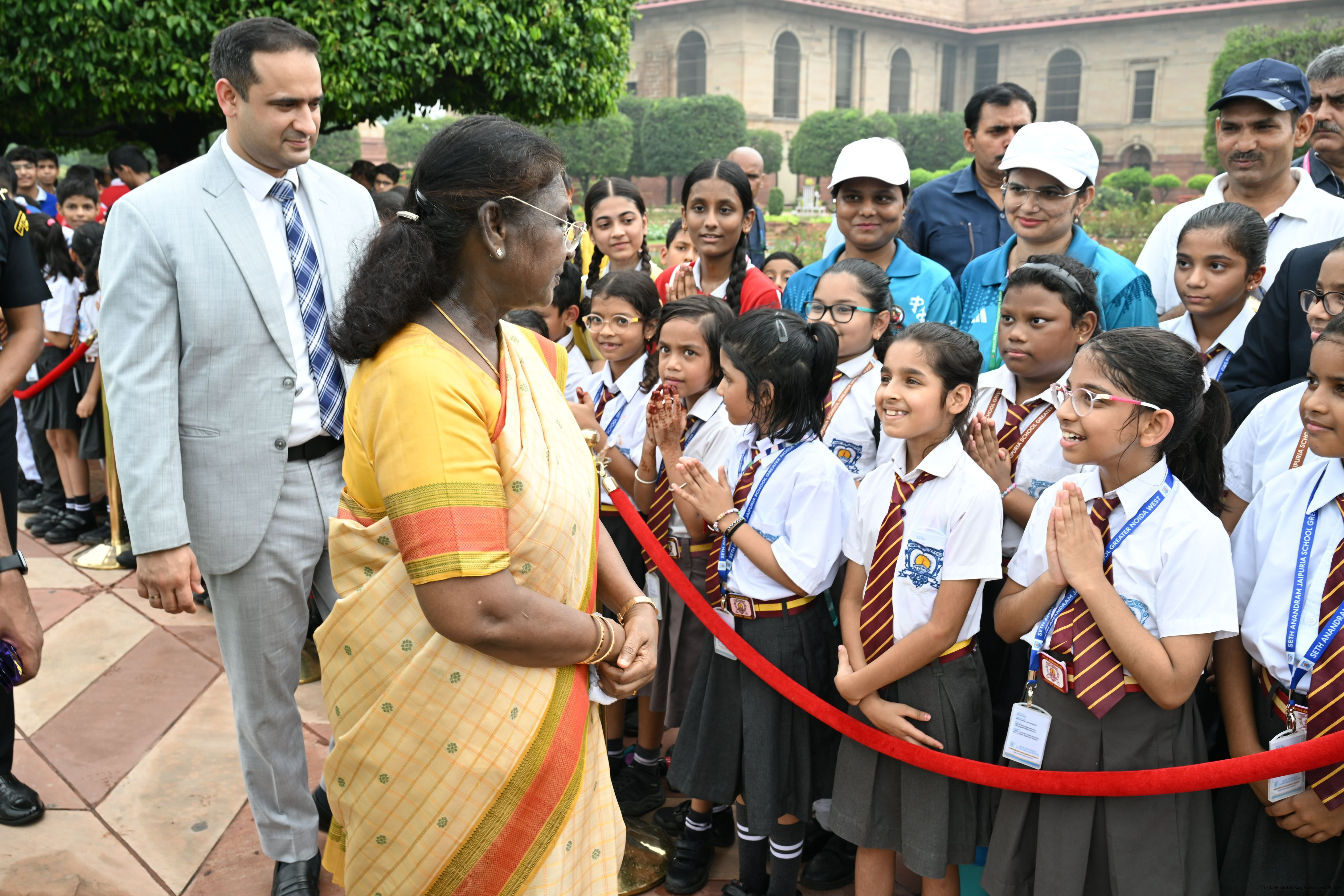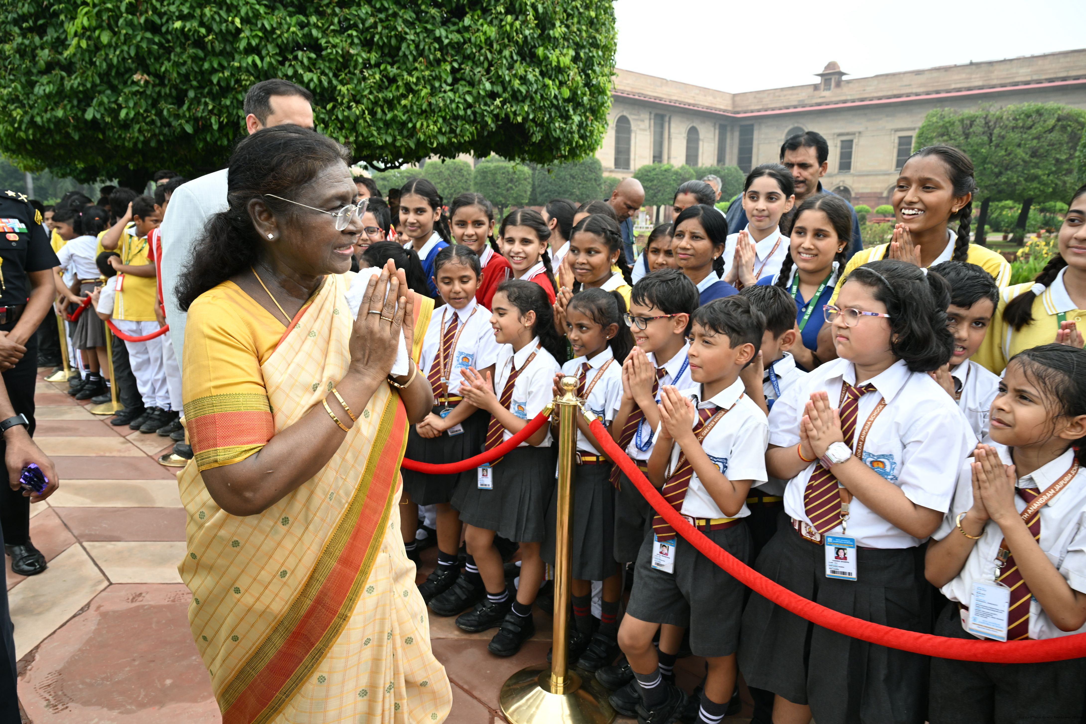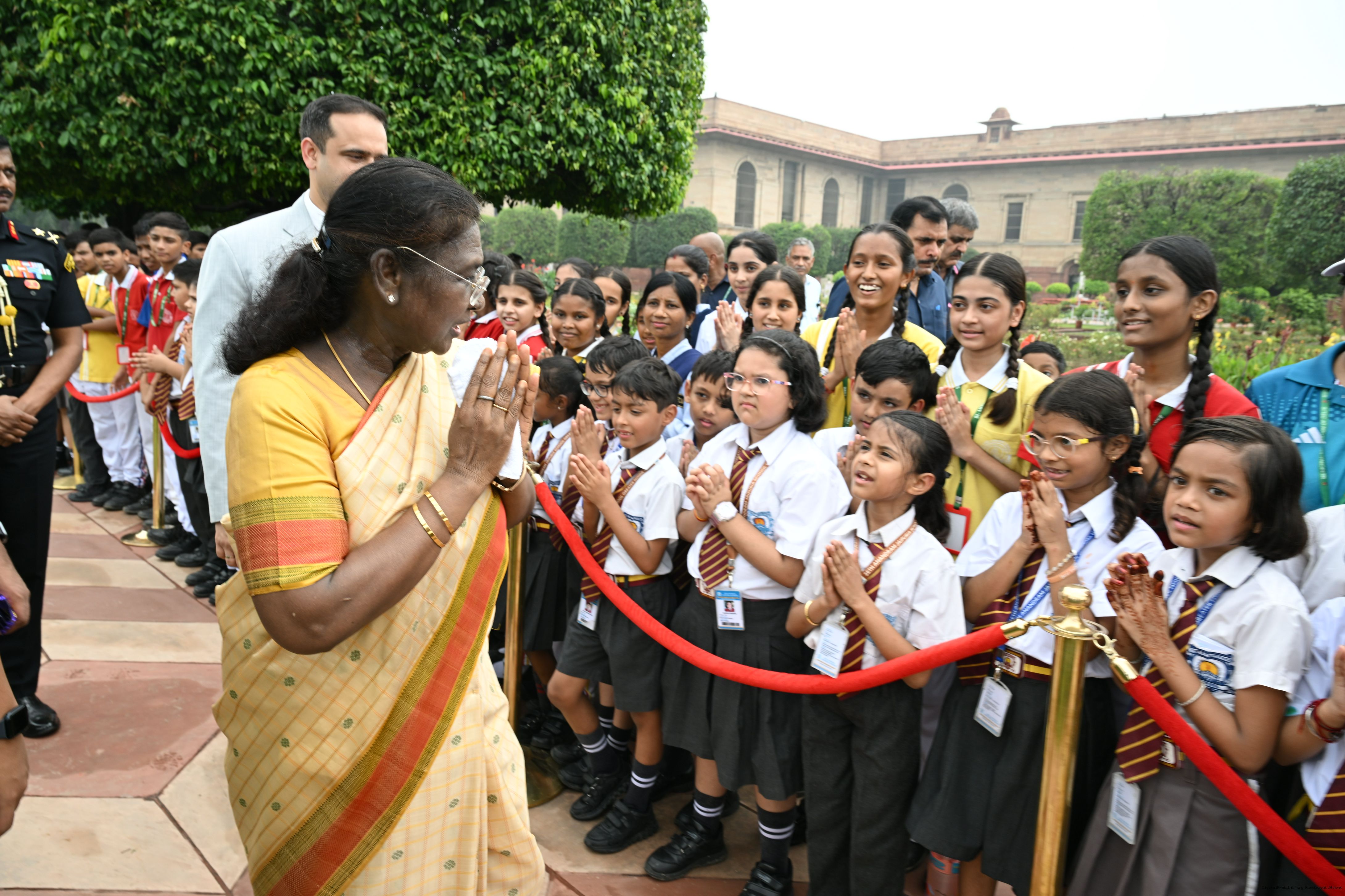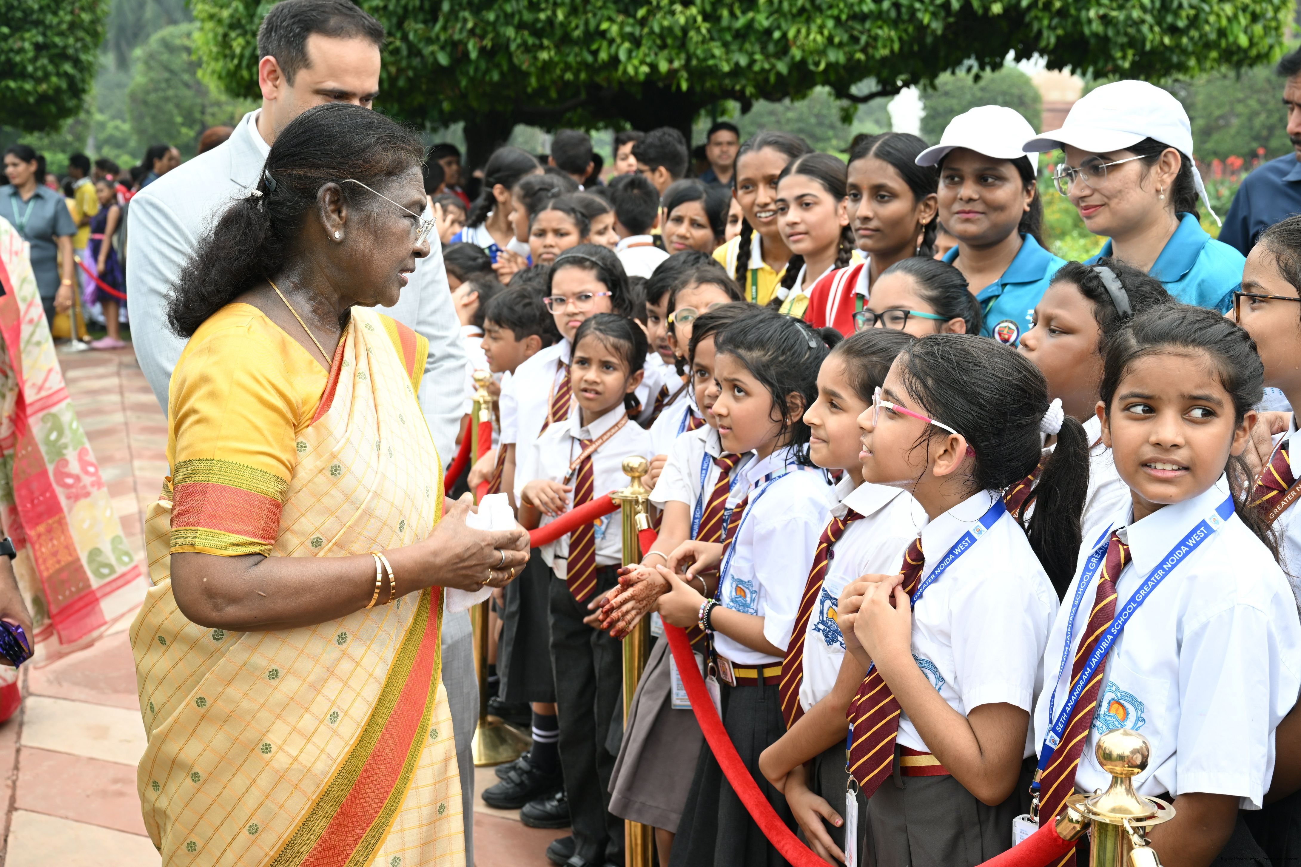 | Caption: | The President of India, Smt Droupadi Murmu interacted with sportspersons who visited Amrit Udyan on National Sports Day at Rashtrapati Bhavan on August 29, 2025. |