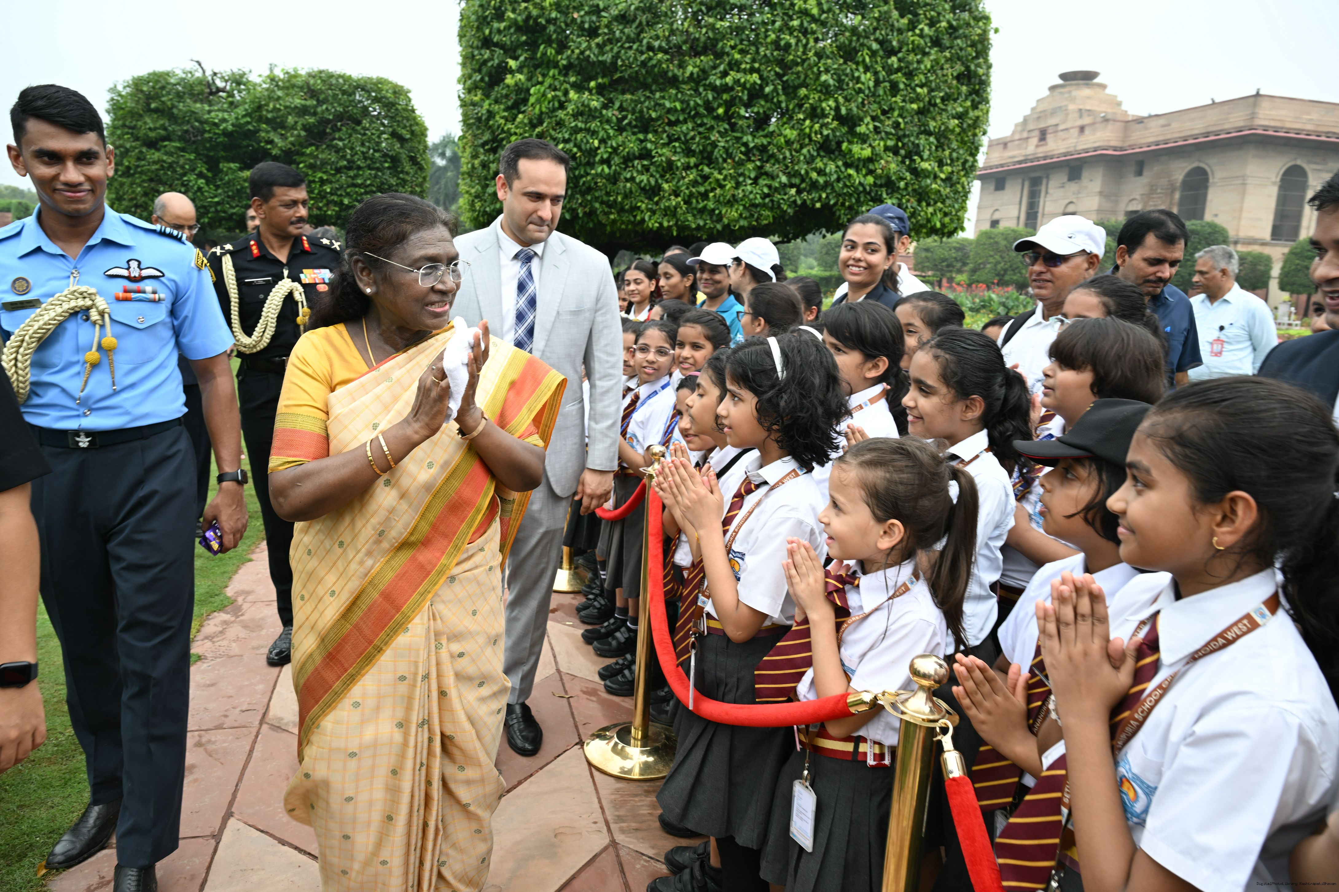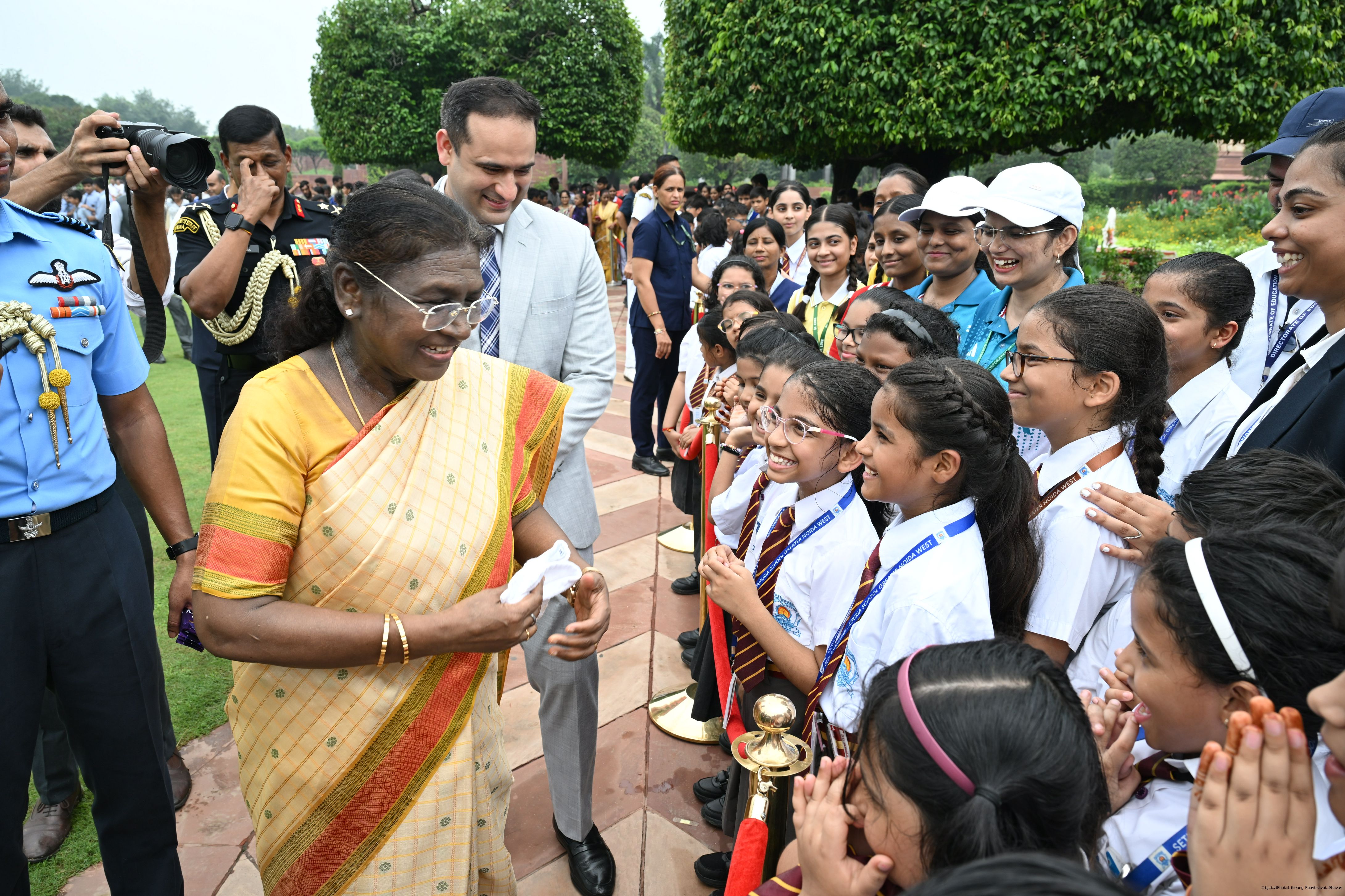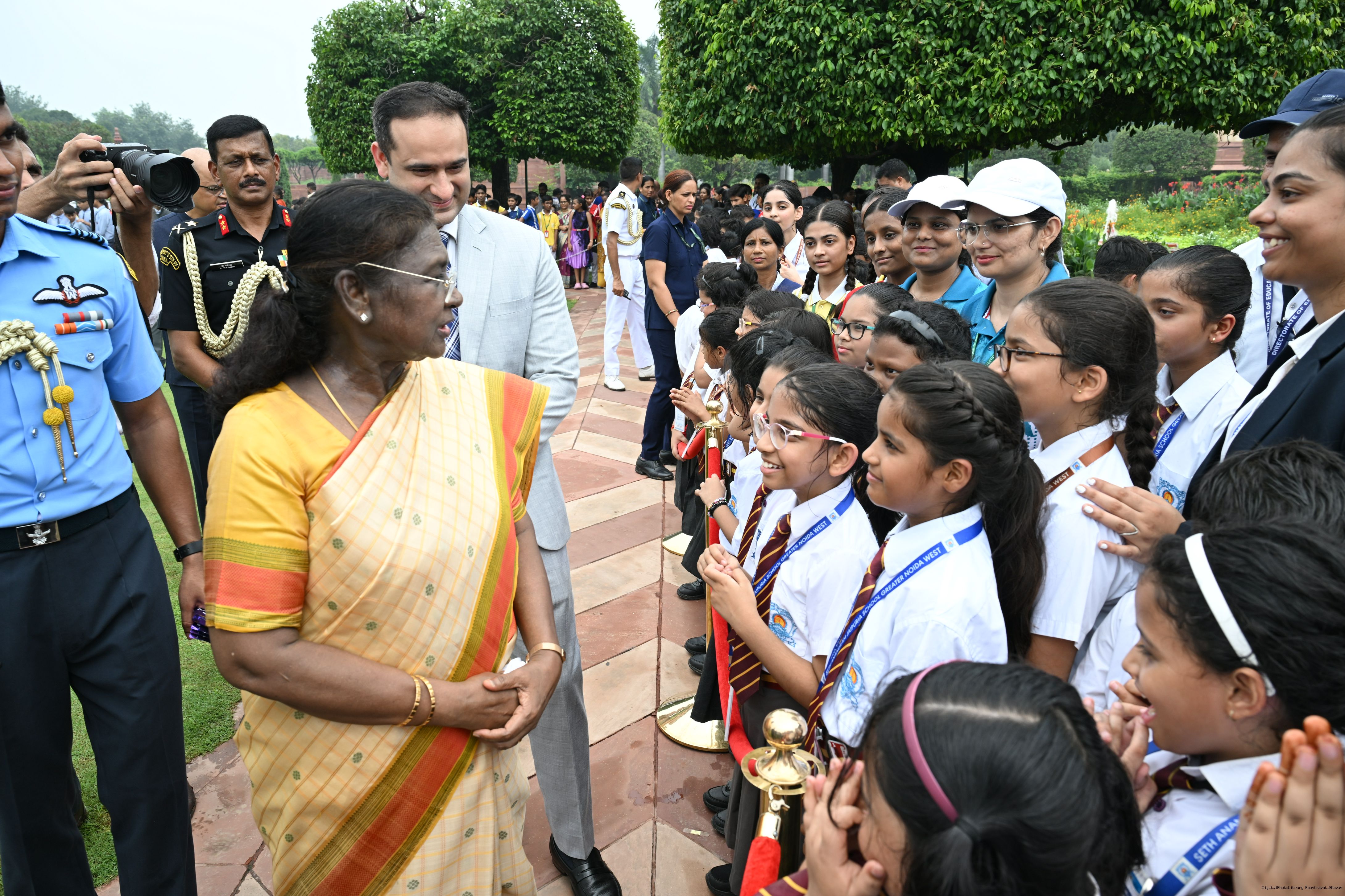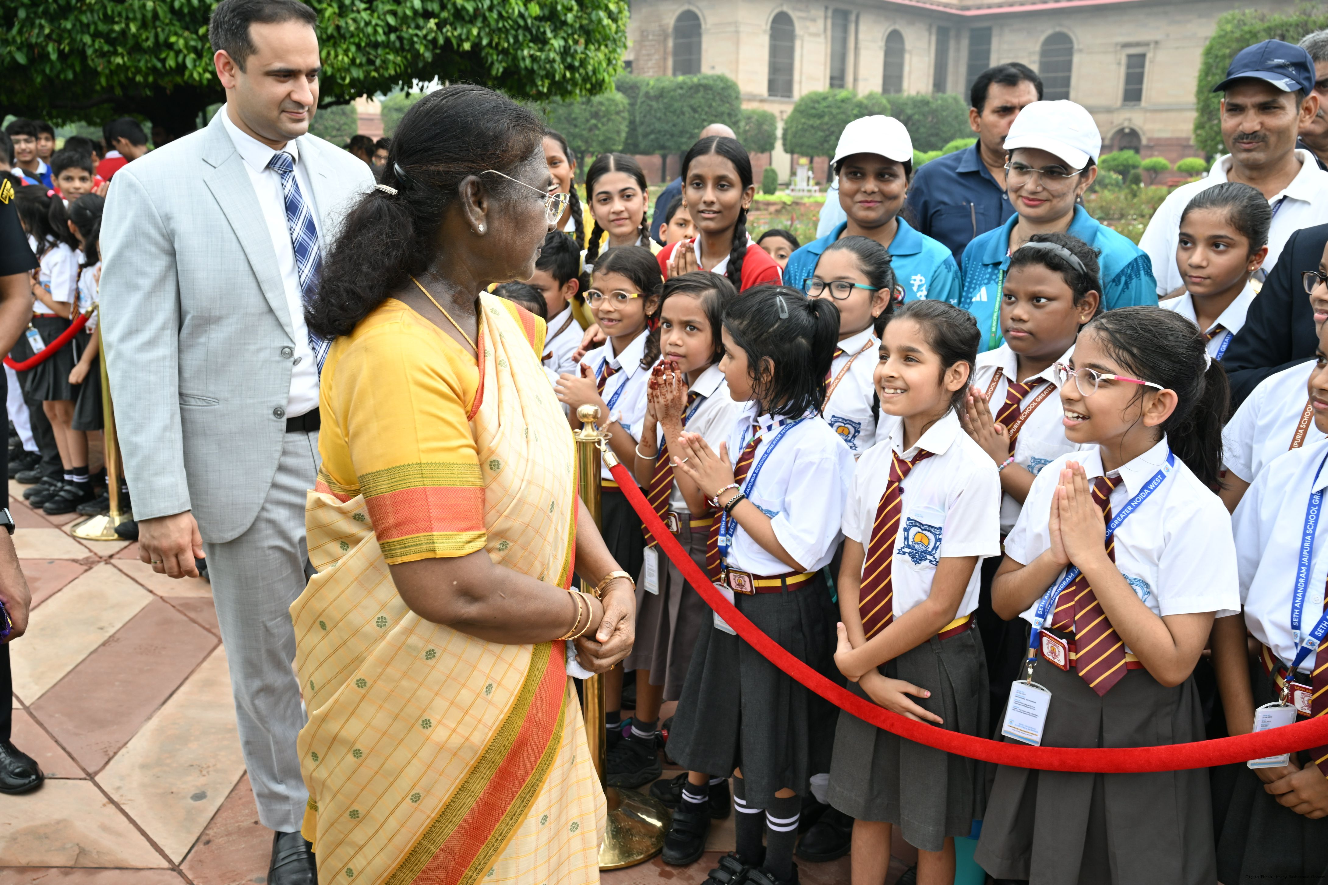 | Caption: | The President of India, Smt Droupadi Murmu interacted with sportspersons who visited Amrit Udyan on National Sports Day at Rashtrapati Bhavan on August 29, 2025. |