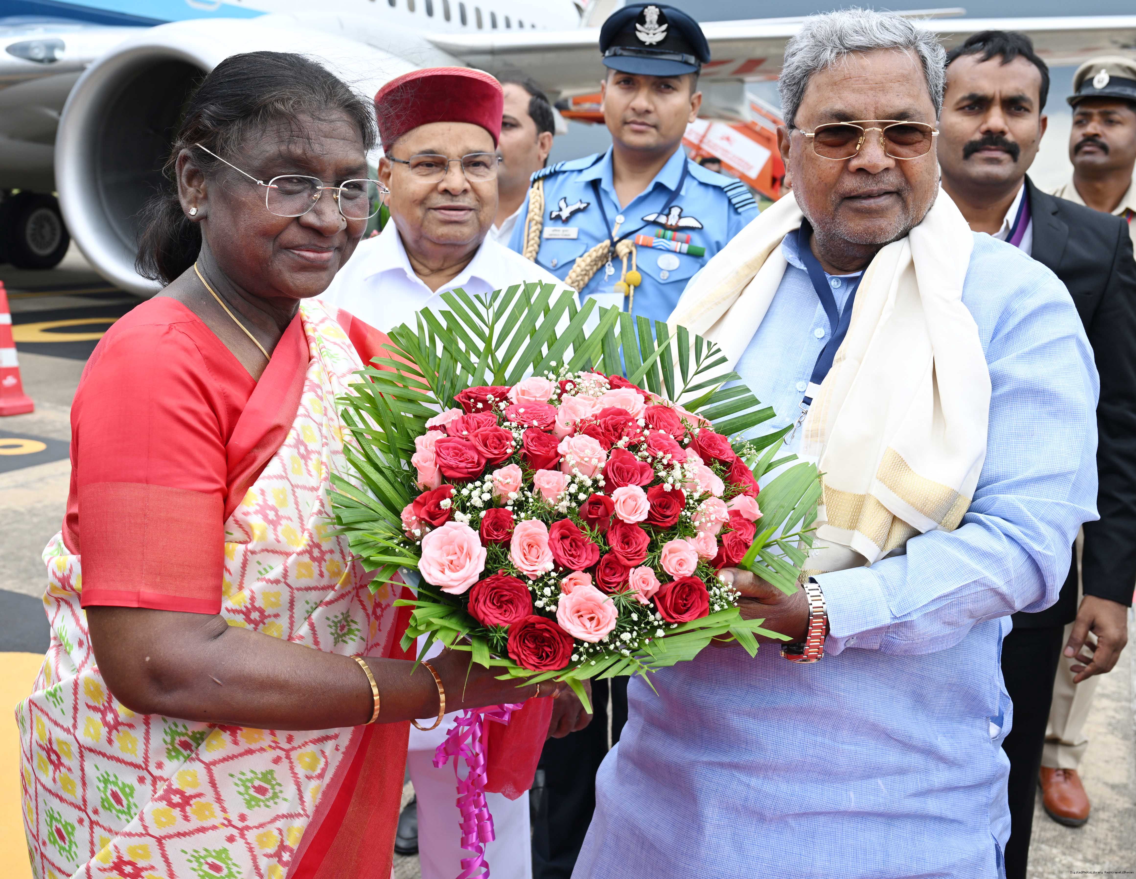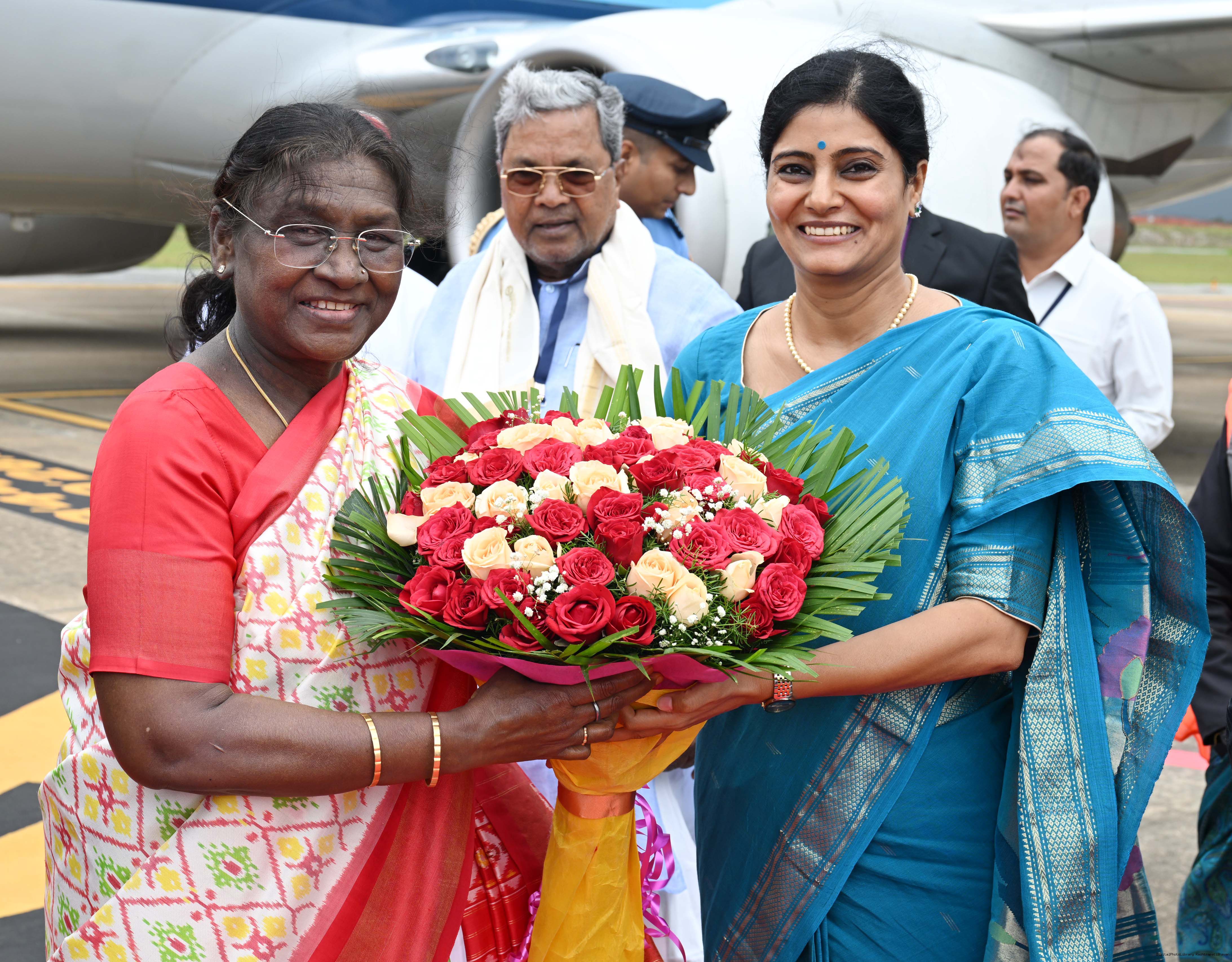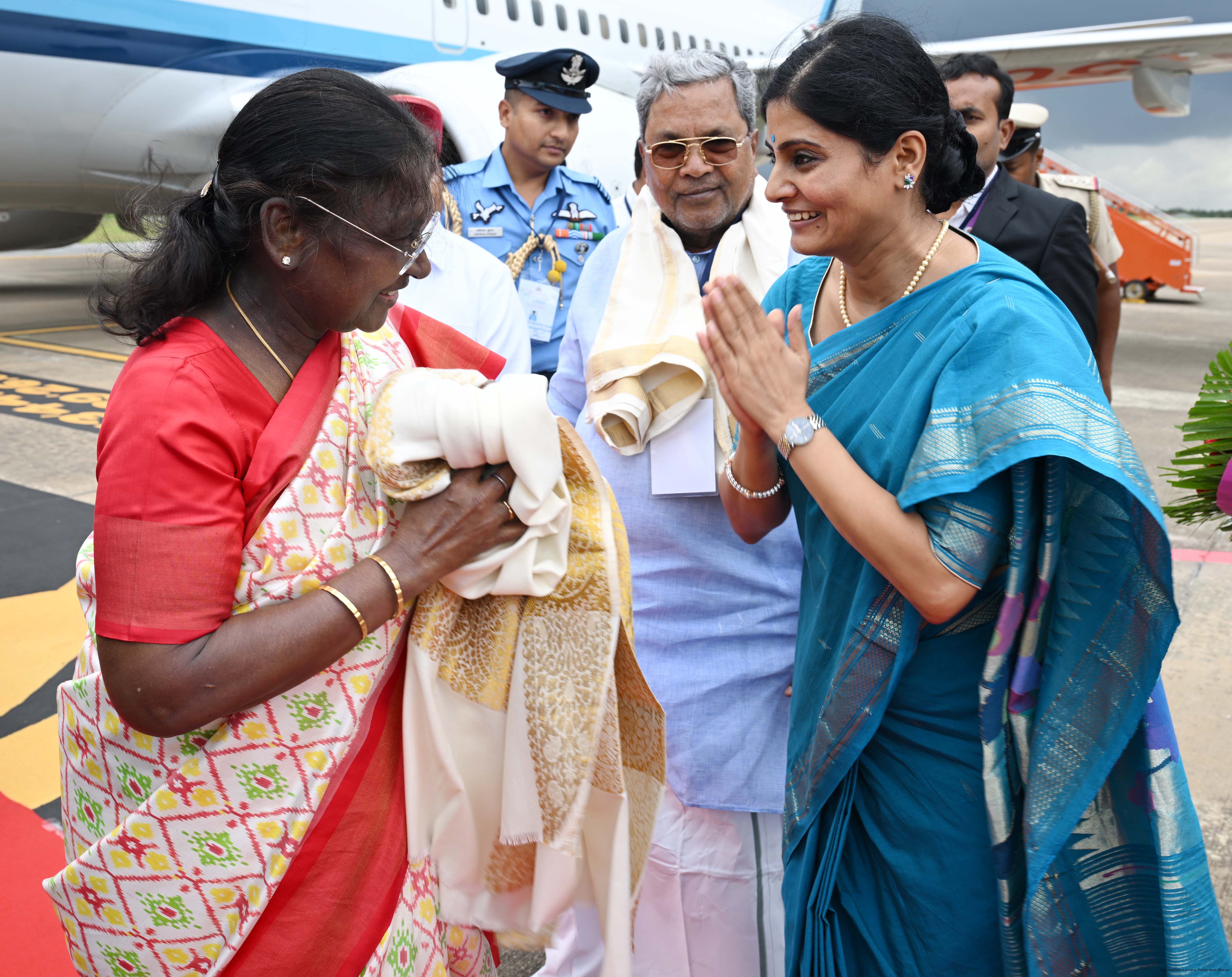 | Caption: | The Governor of Karnataka, Shri Thaawarchand Gehlot, Chief Minister Shri Siddaramaiah and Minister of State for Health and Family Welfare Smt Anupriya Patel received President Droupadi Murmu on her arrival at Mysuru, Karnataka on September 1, 2025. |