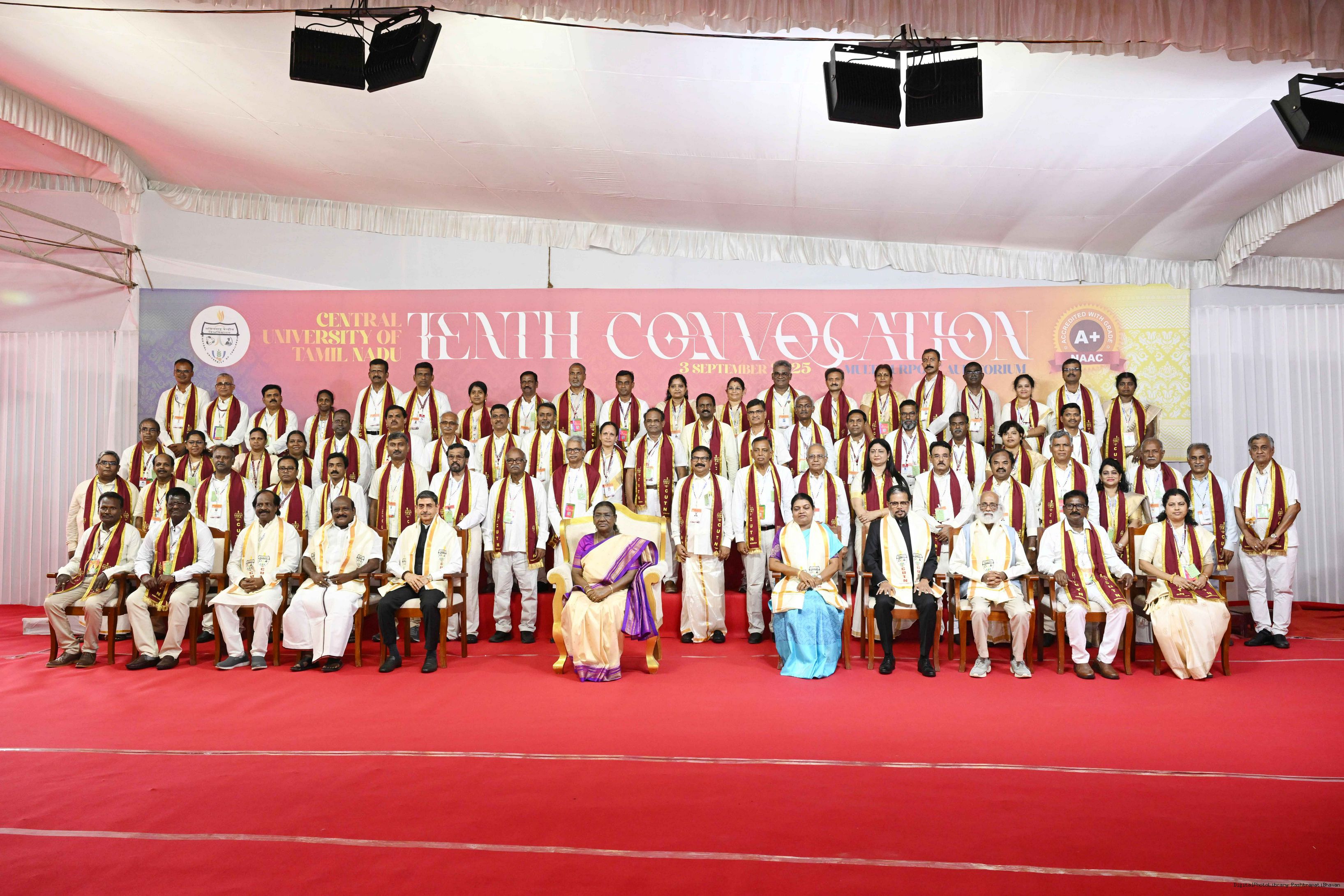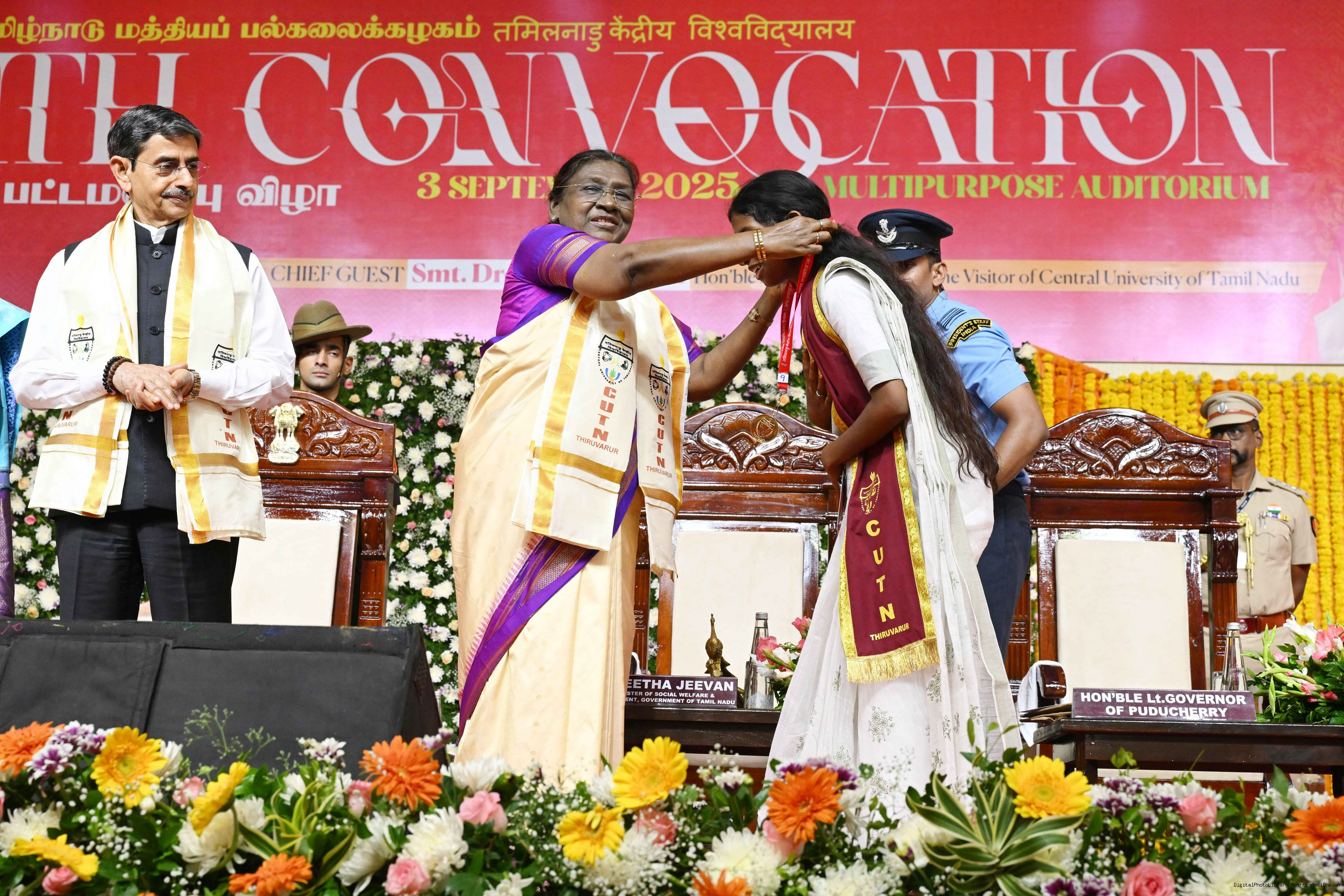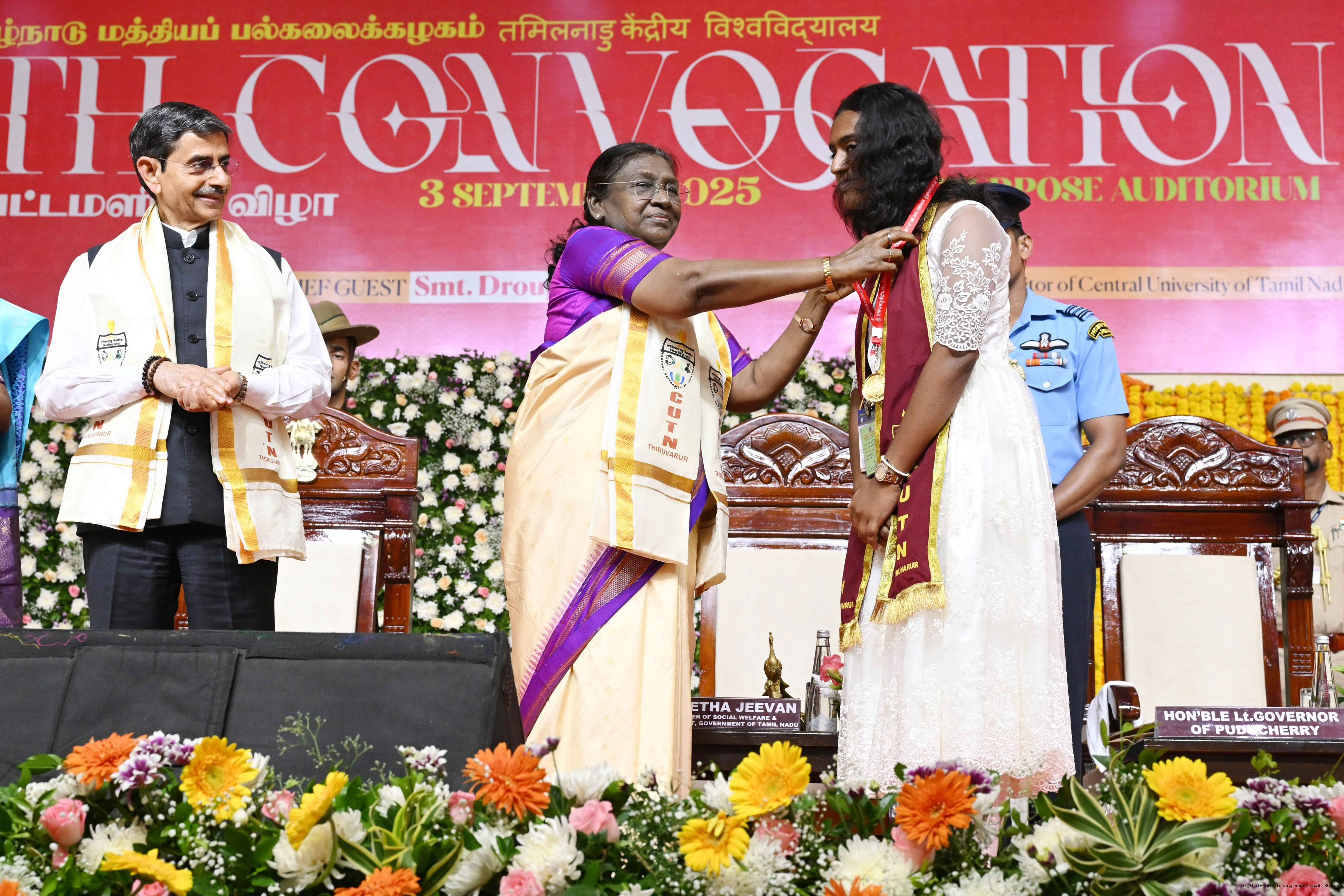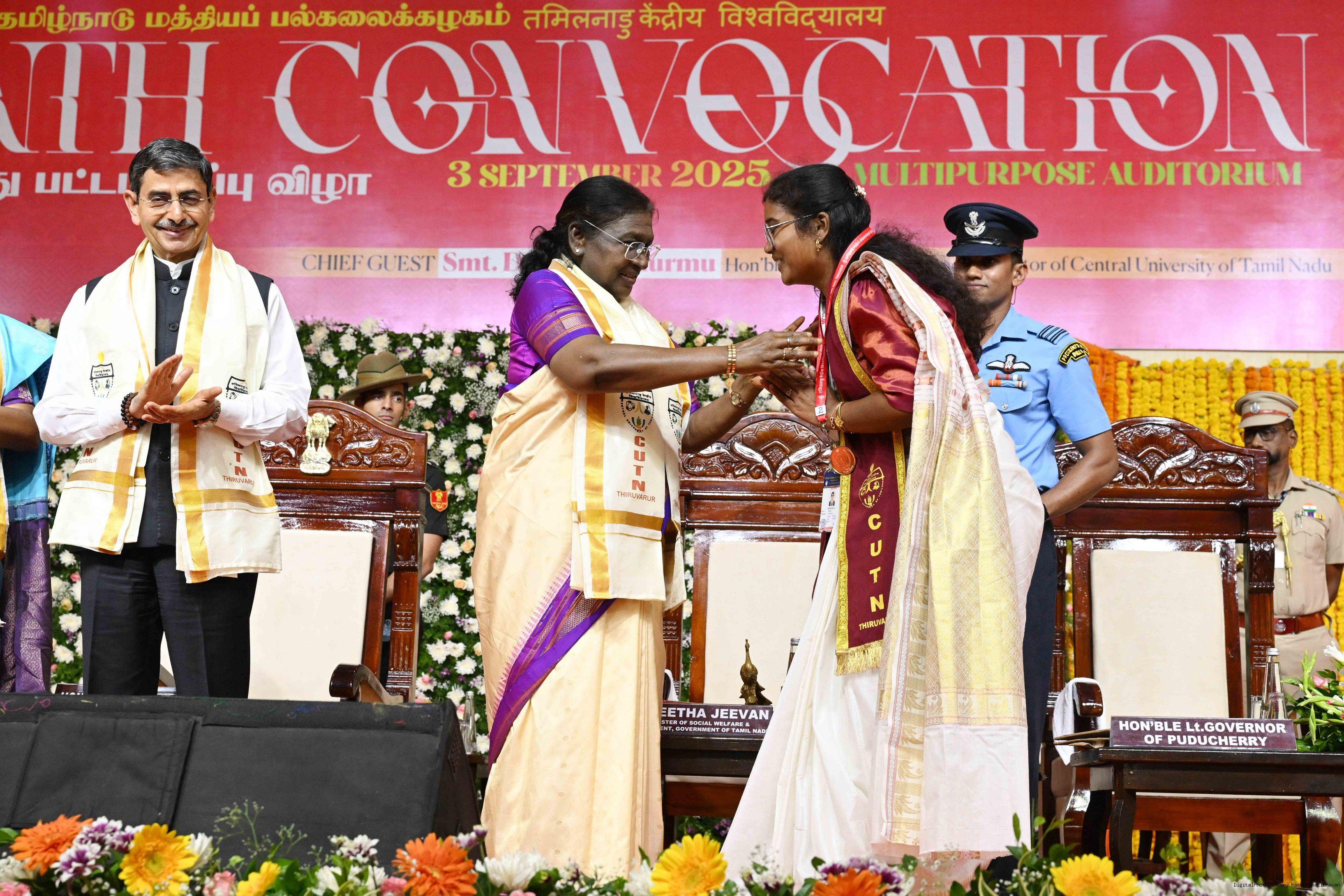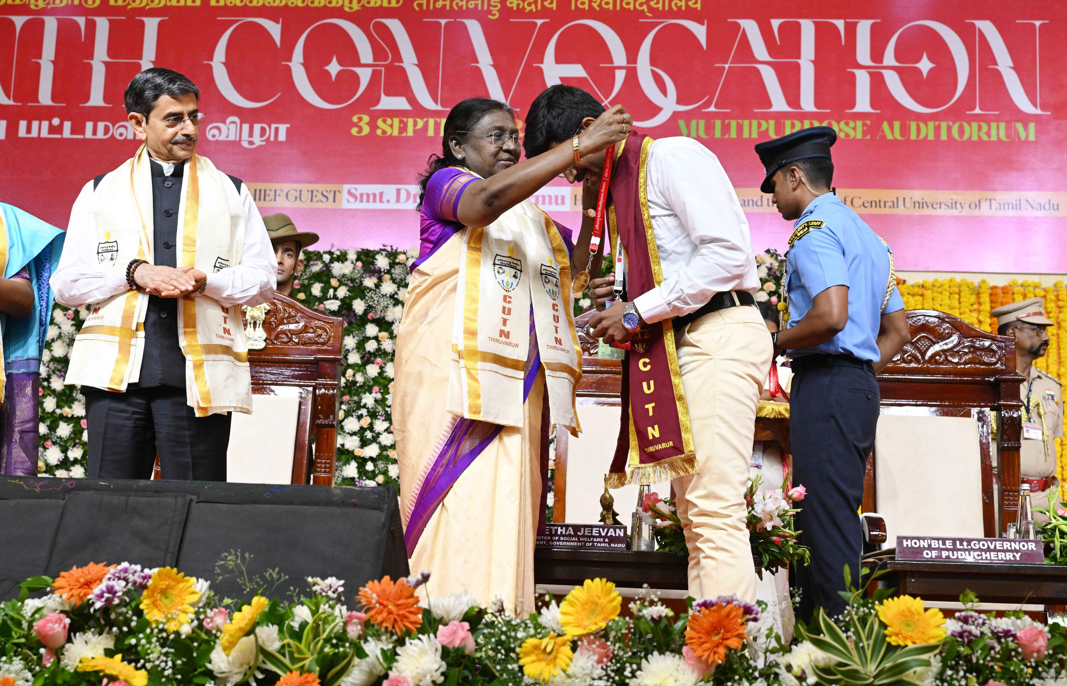 | Caption: | The President of India, Smt Droupadi Murmu, graced the 10th convocation ceremony of the Central University of Tamil Nadu at Thiruvarur, Tamil Nadu on September 3, 2025. |
