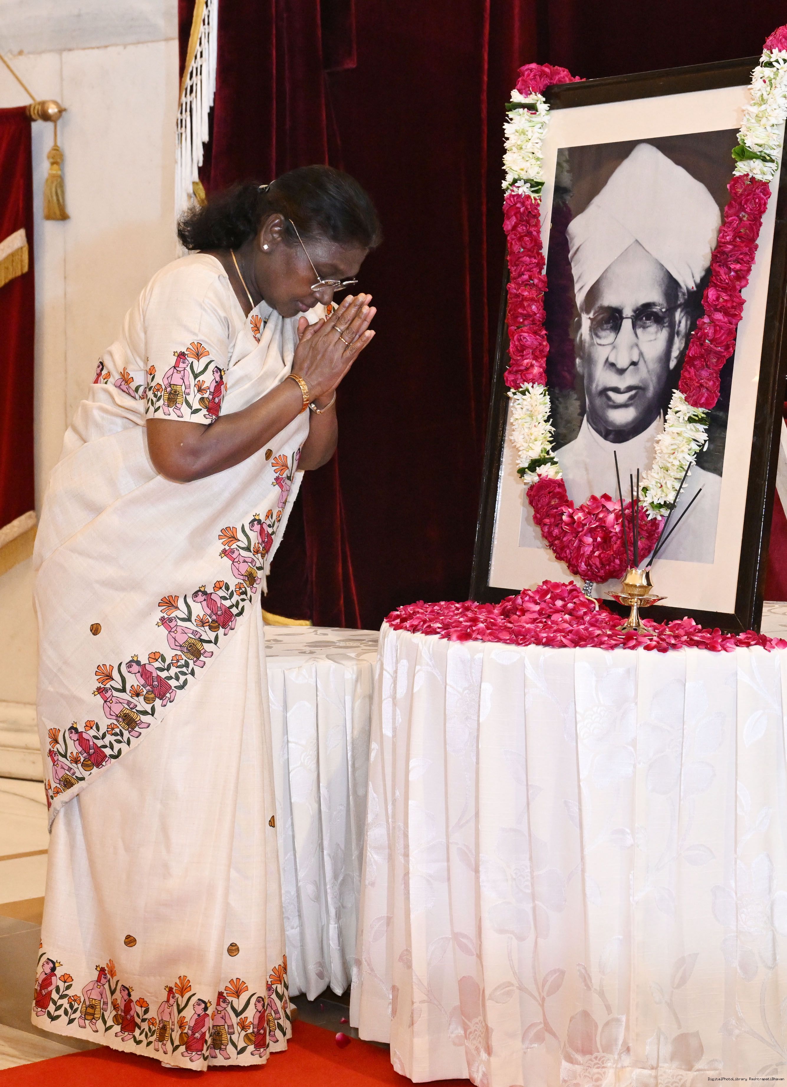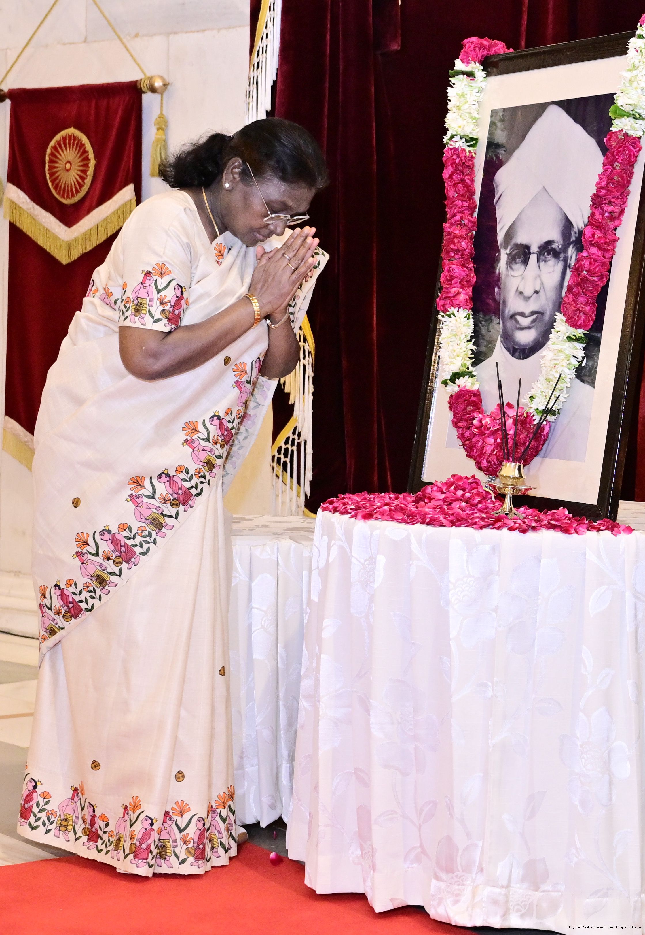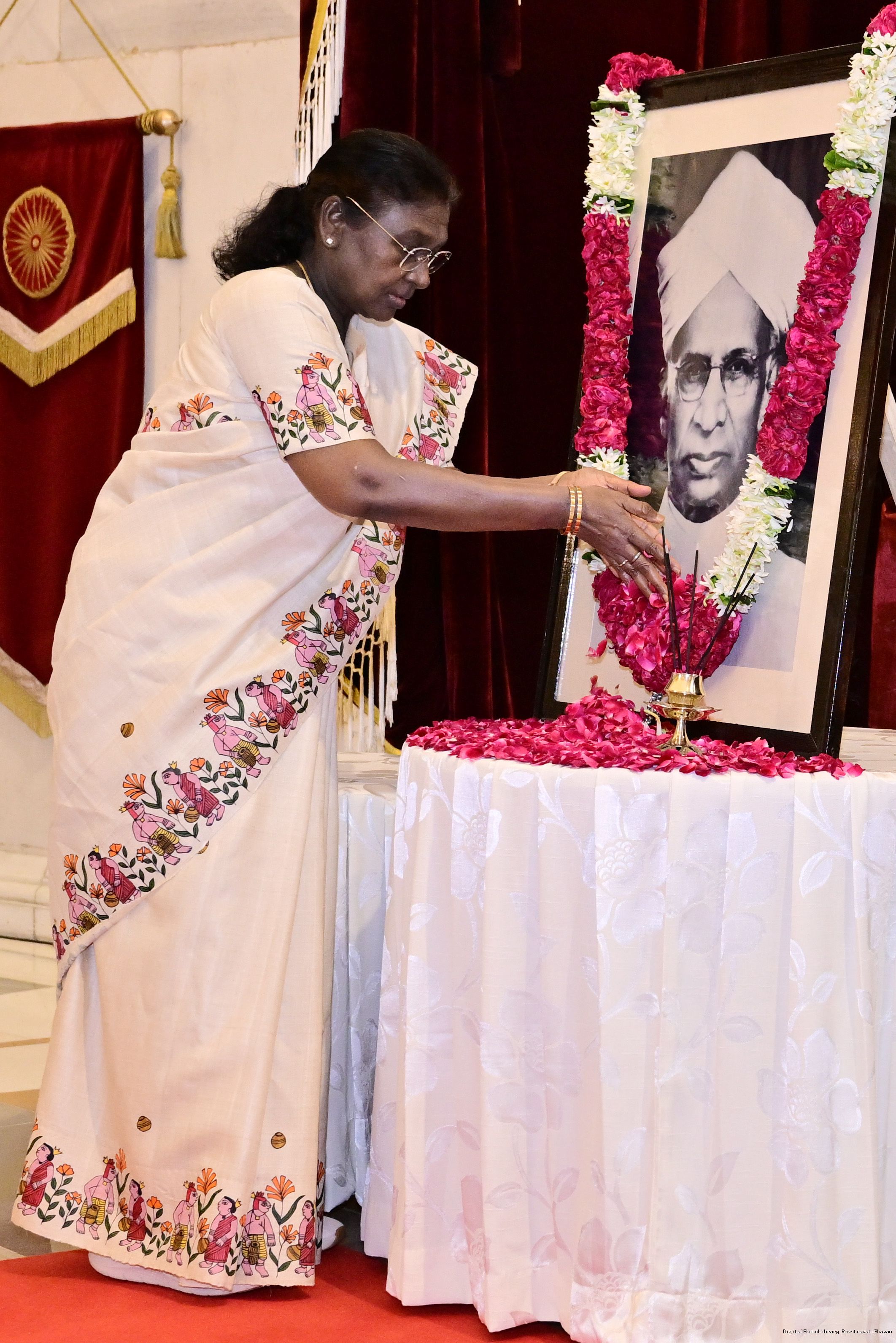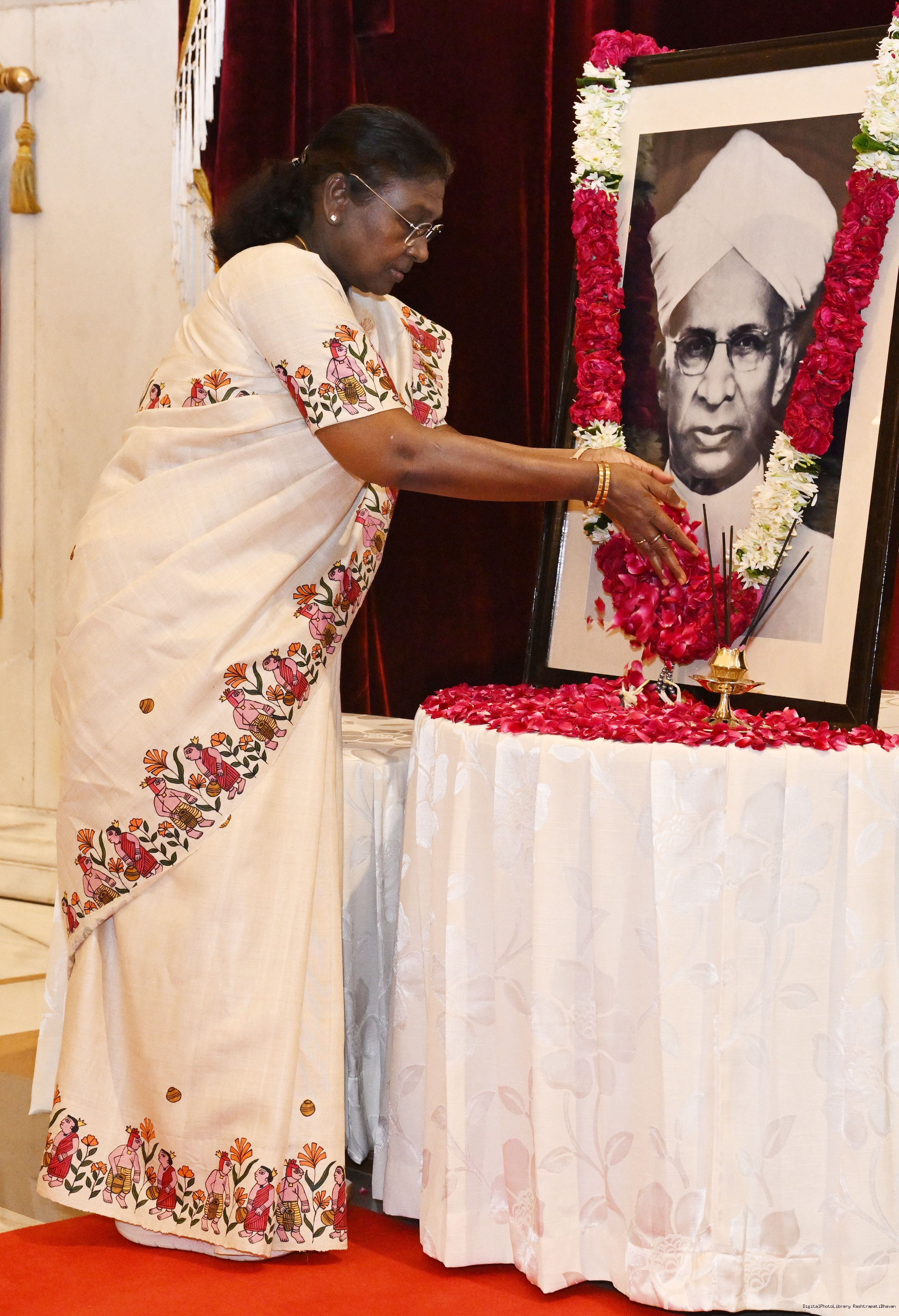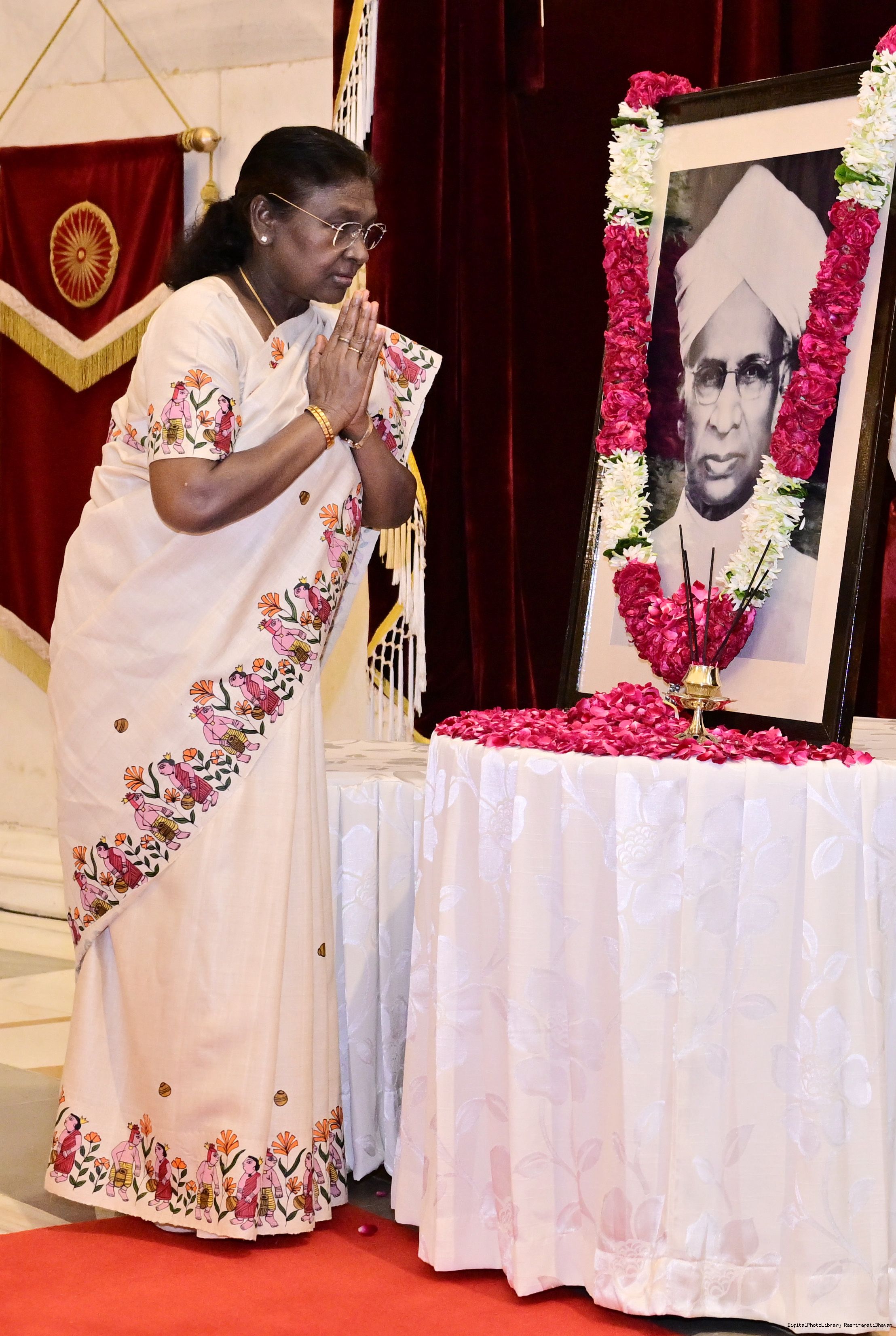 | Caption: | The President of India, Smt Droupadi Murmu, paid floral tributes to Dr Sarvepalli Radhakrishnan, former President of India, on his birth anniversary at Rashtrapati Bhavan on September 5, 2025. |