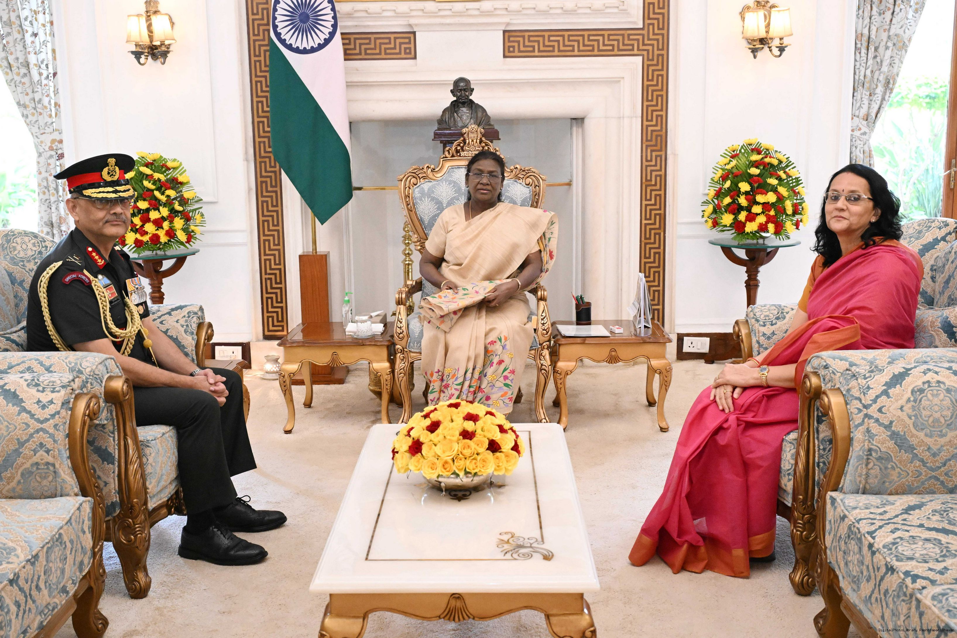 | Caption: | Lt. Gen Pushpendra Singh, AVSM, SM Vice Chief of Army staff along with wife Smt. Rajeshwari Singh meeting with the President of India, Smt. Droupadi Murmu at Rashtrapati Bhavan on September 9, 2025. |