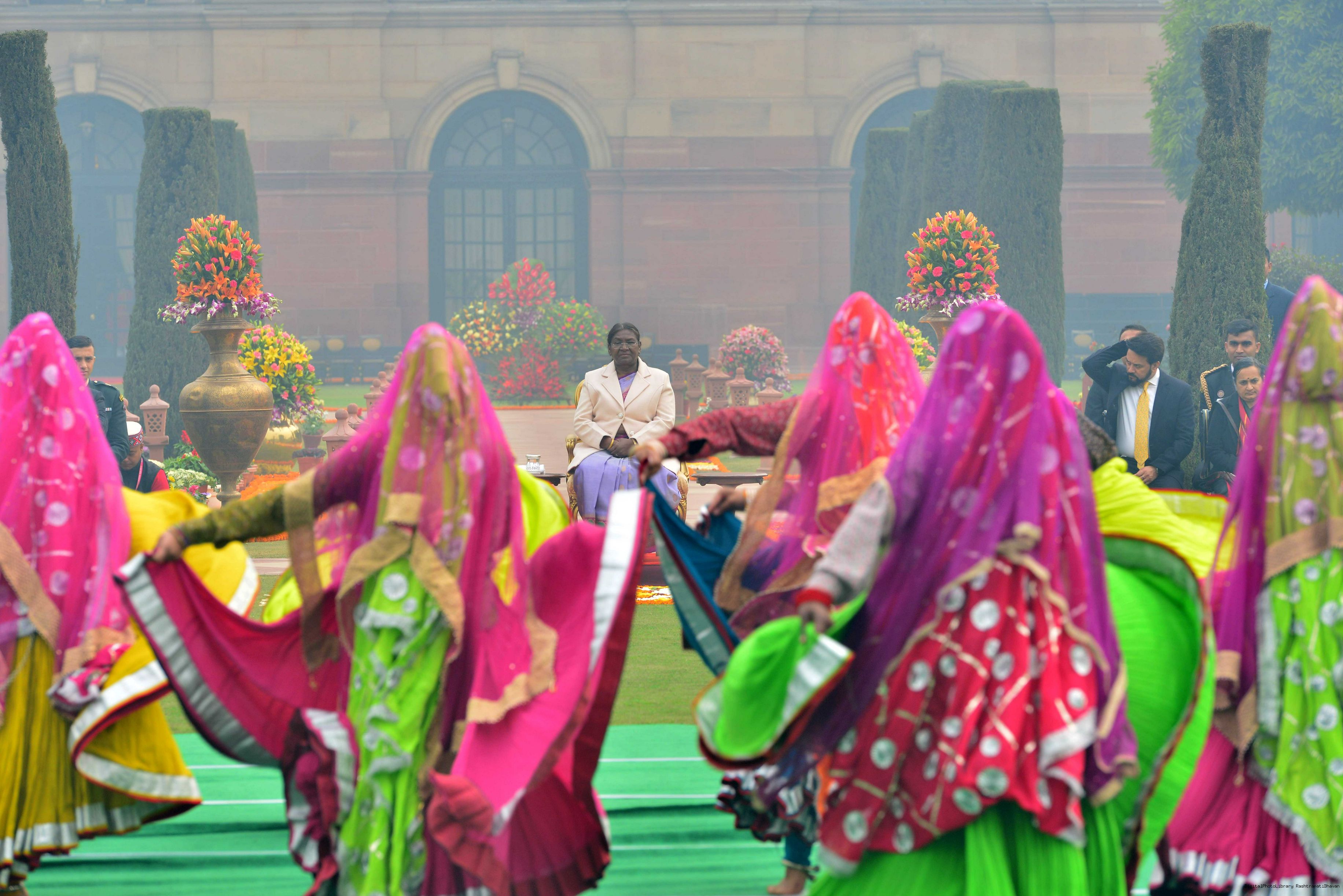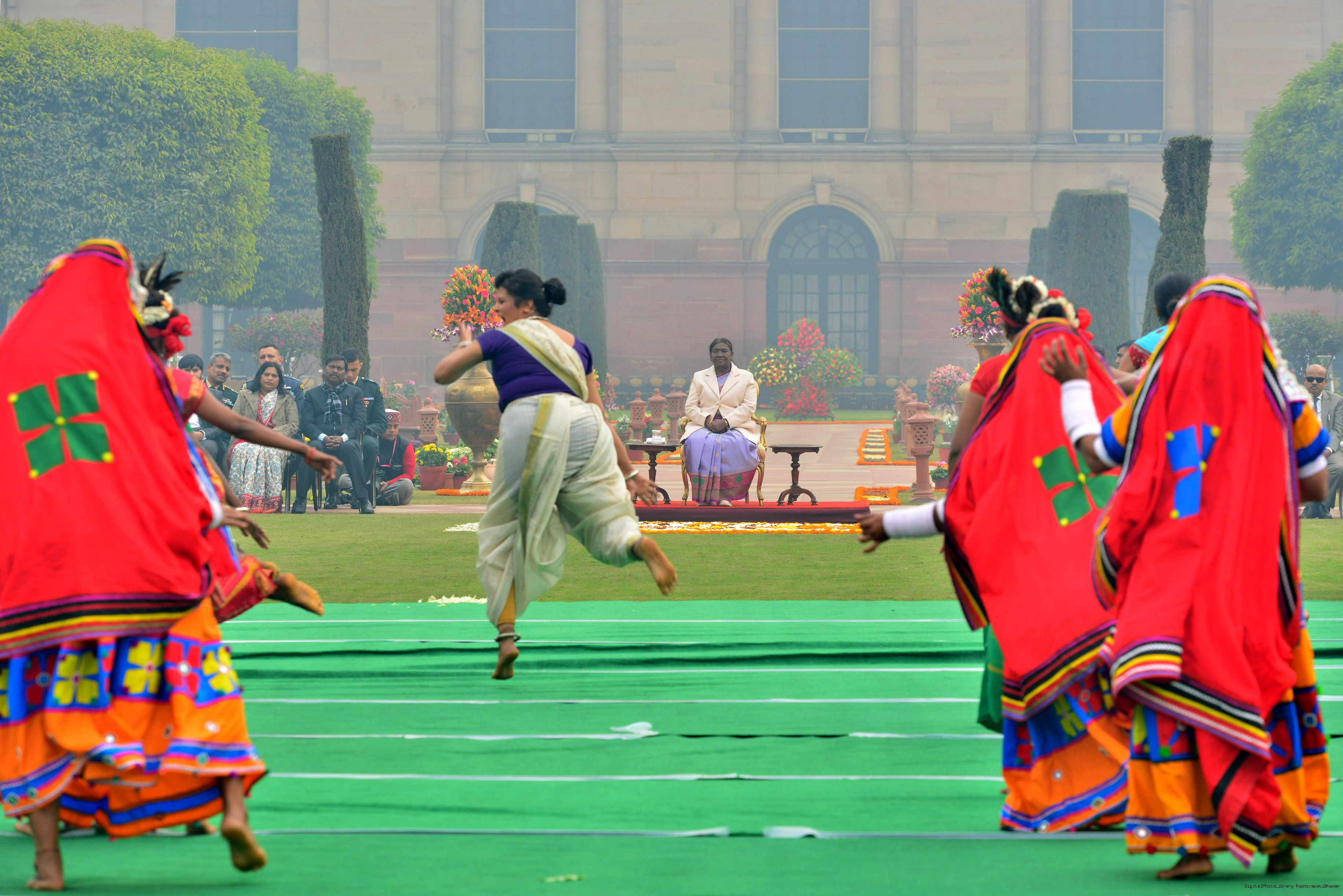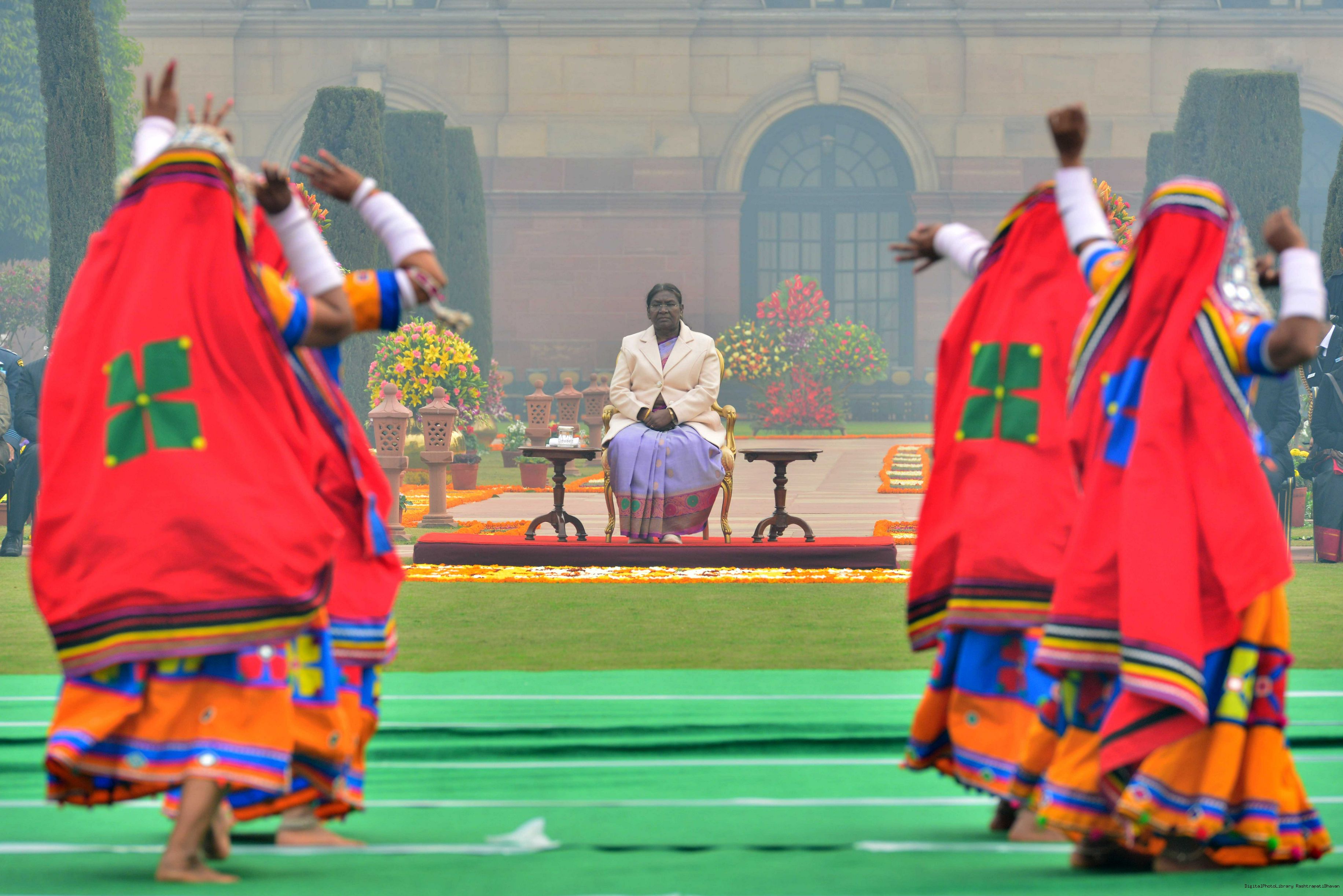 | Caption: | The President of India, Smt. Droupadi Murmu met tribal guests, tableaux artistes and tractor drivers, NSS volunteers and NCC cadets, officials and other participants of the Republic Day Parade 2024, at Rashtrapati Bhavan on January 28, 2024. |