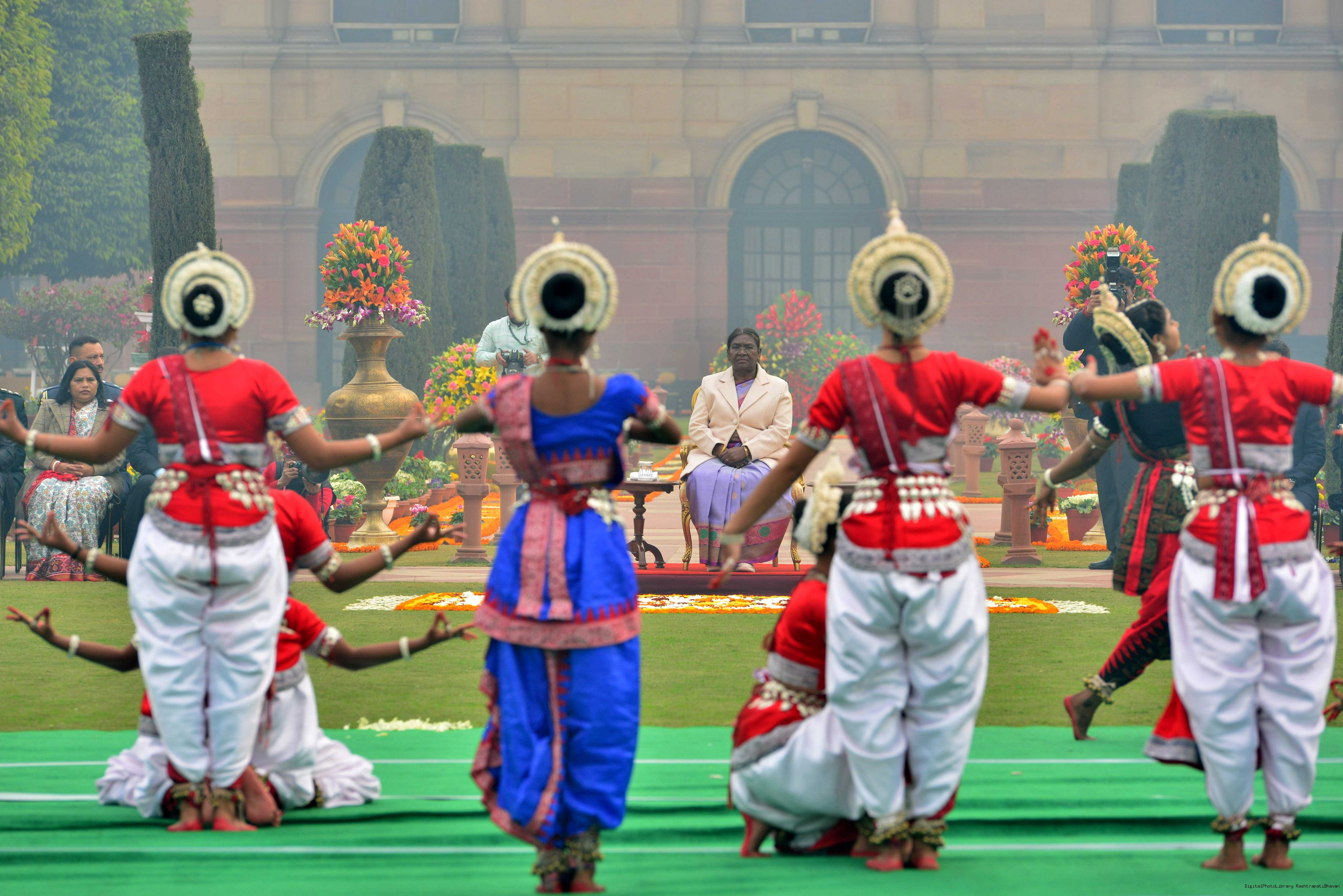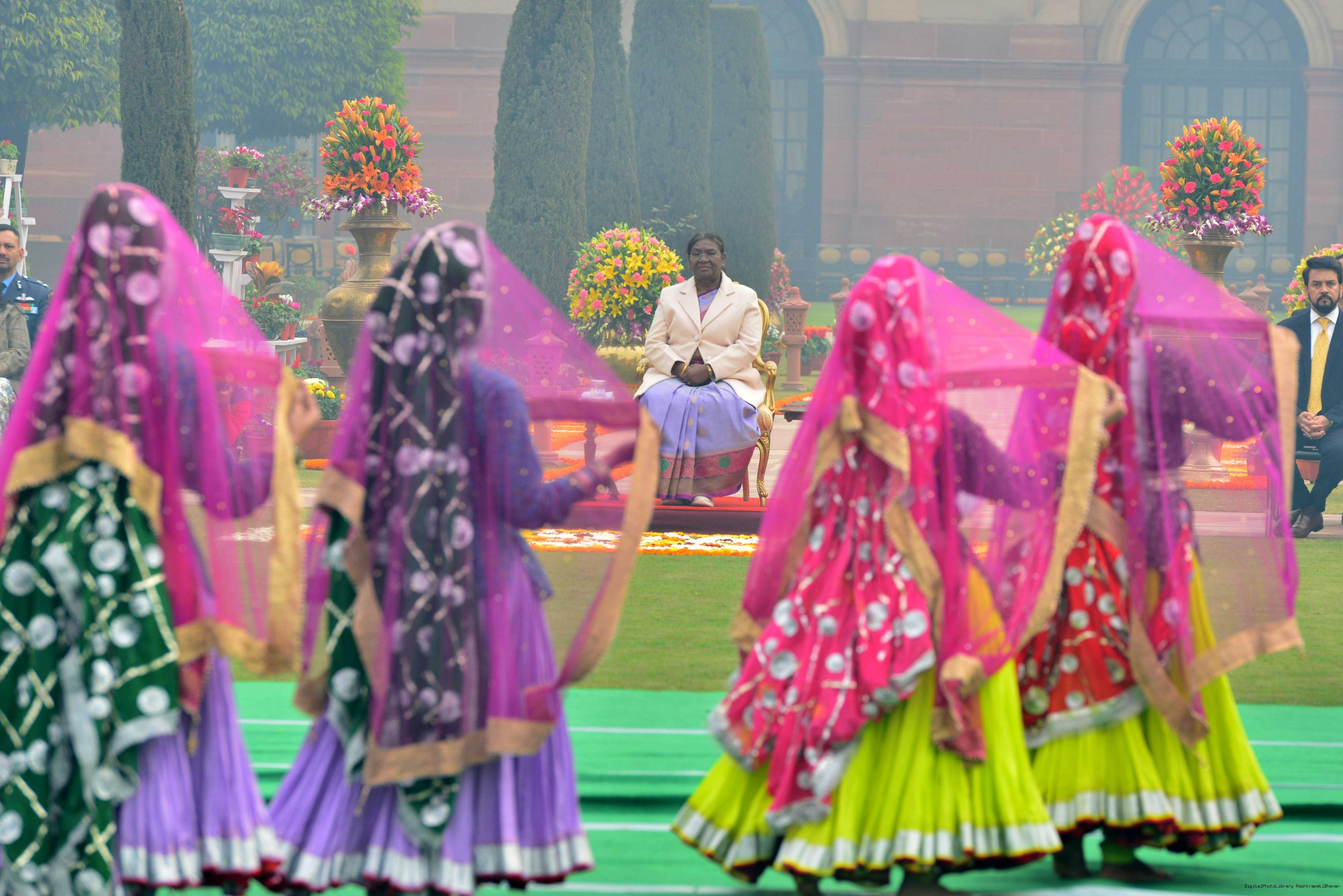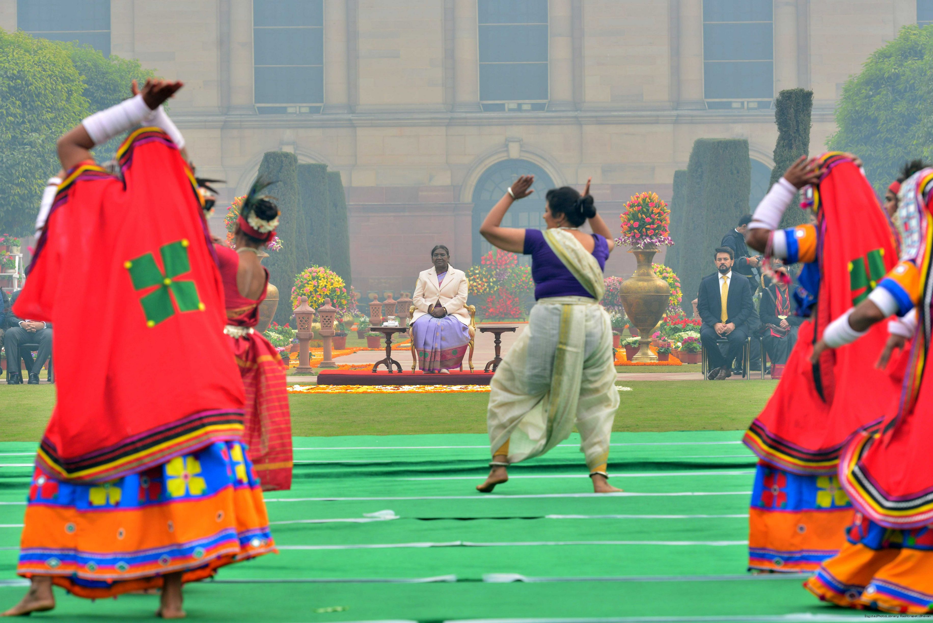 | Caption: | The President of India, Smt. Droupadi Murmu met tribal guests, tableaux artistes and tractor drivers, NSS volunteers and NCC cadets, officials and other participants of the Republic Day Parade 2024, at Rashtrapati Bhavan on January 28, 2024. |