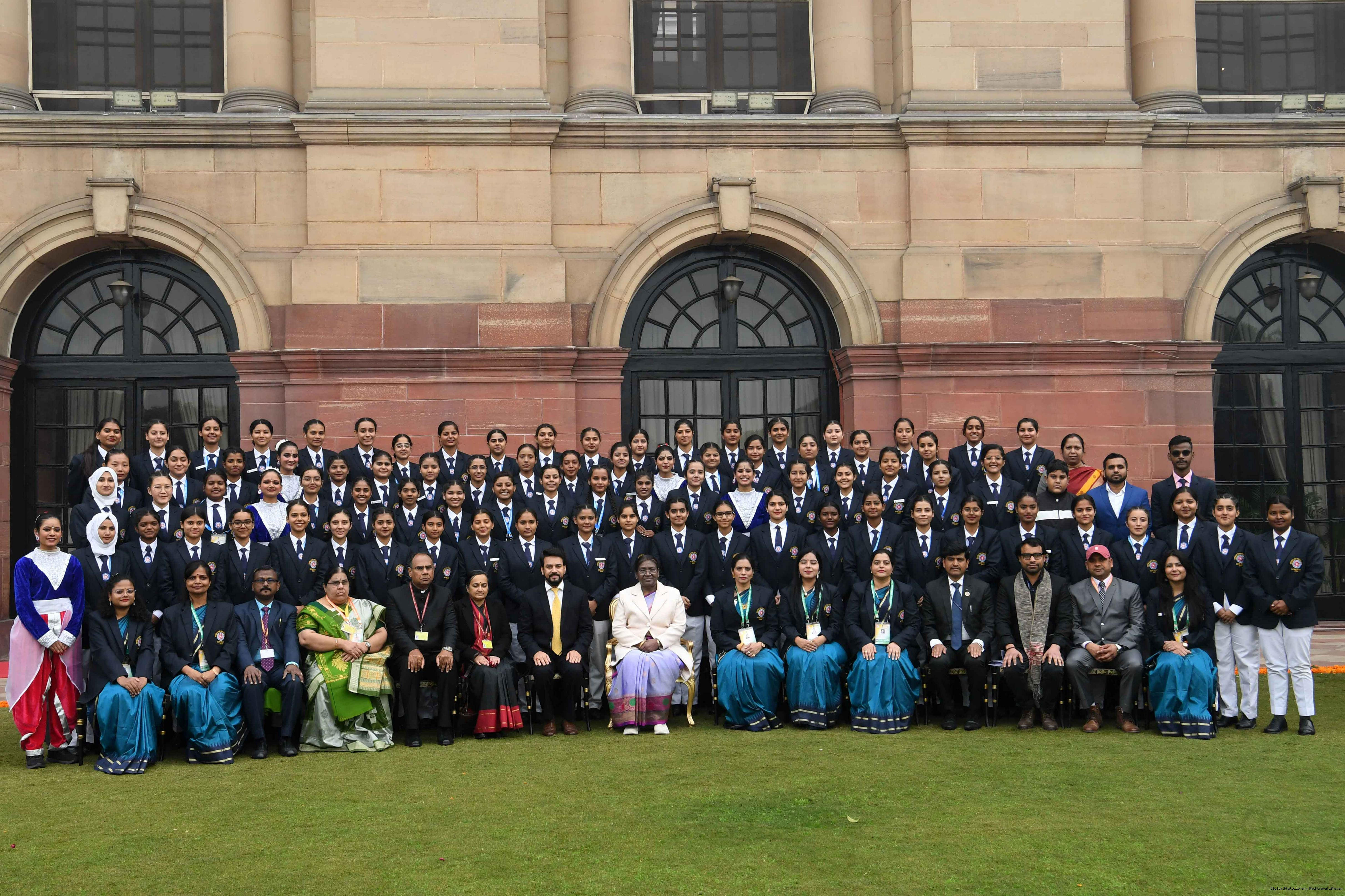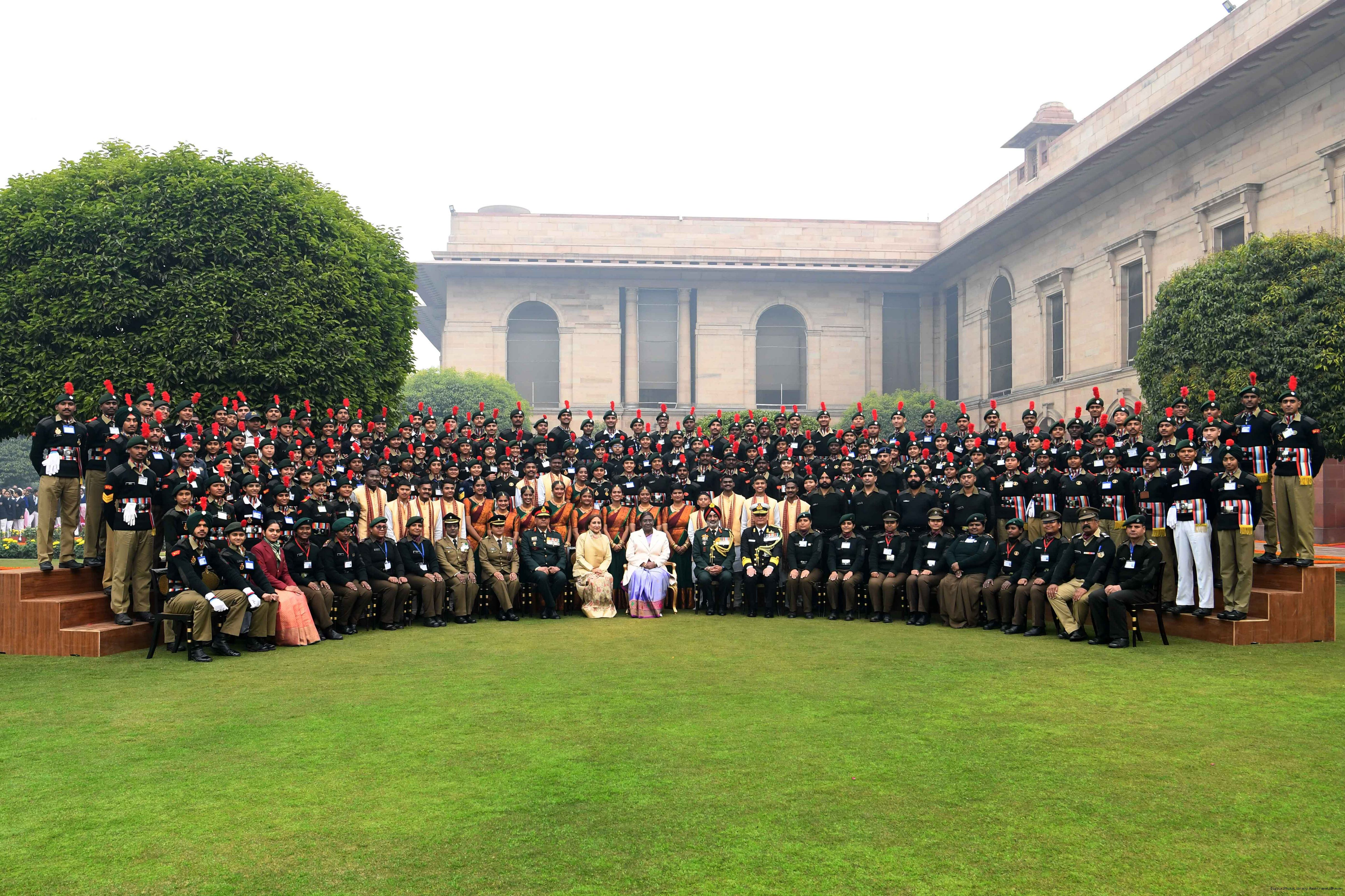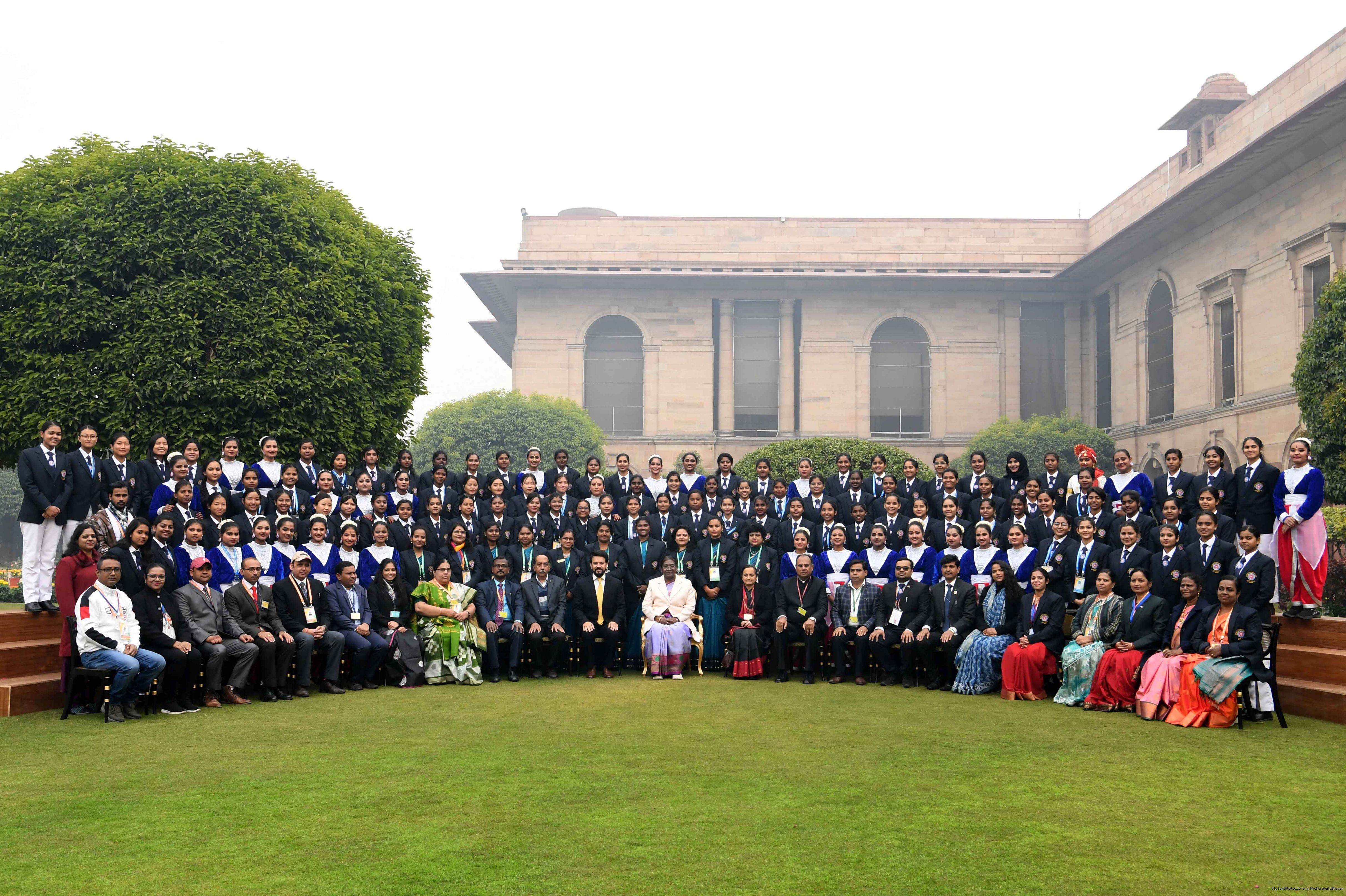 | Caption: | The President of India, Smt. Droupadi Murmu met tribal guests, tableaux artistes and tractor drivers, NSS volunteers and NCC cadets, officials and other participants of the Republic Day Parade 2024, at Rashtrapati Bhavan on January 28, 2024. |