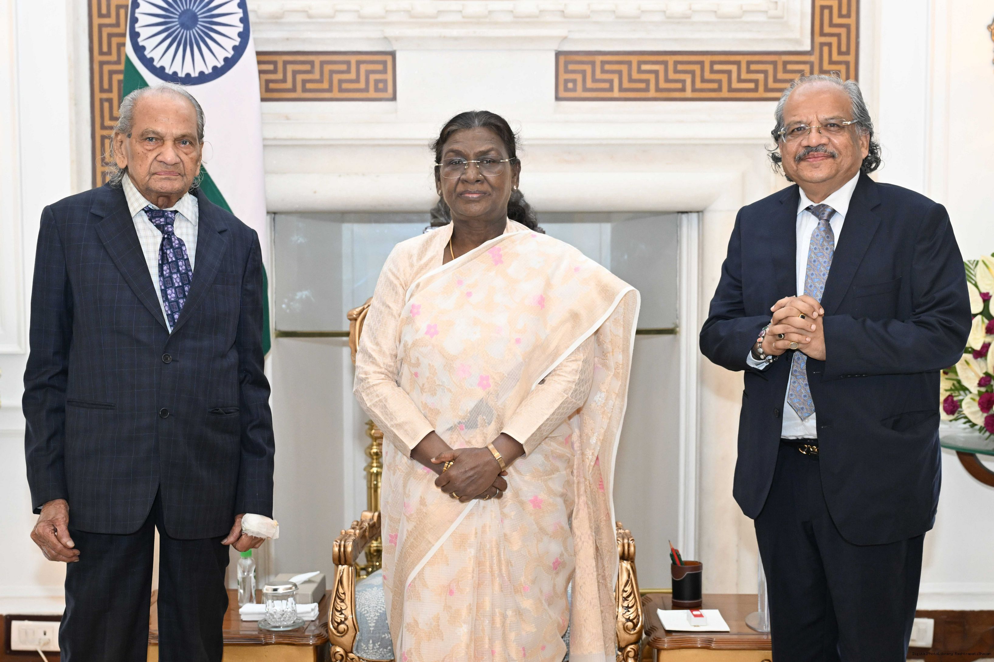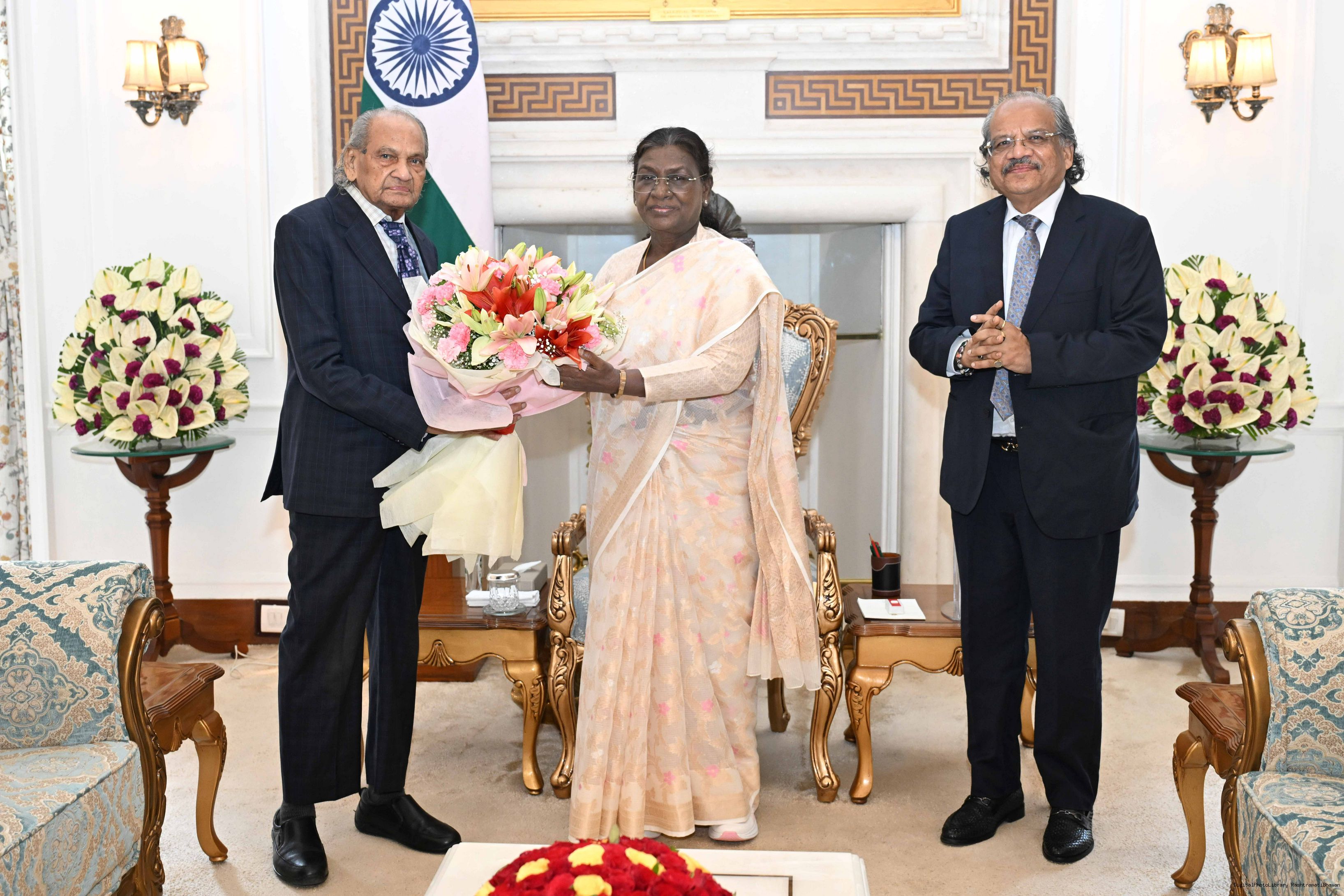 | Caption: | Dr. Ram V. Sutar, Padma Bhushan Awardees along with Dr. Anil Ram Sutar meeting with the President of India, Smt. Droupadi Murmu at Rashtrapati Bhavan on September 10, 2025. |