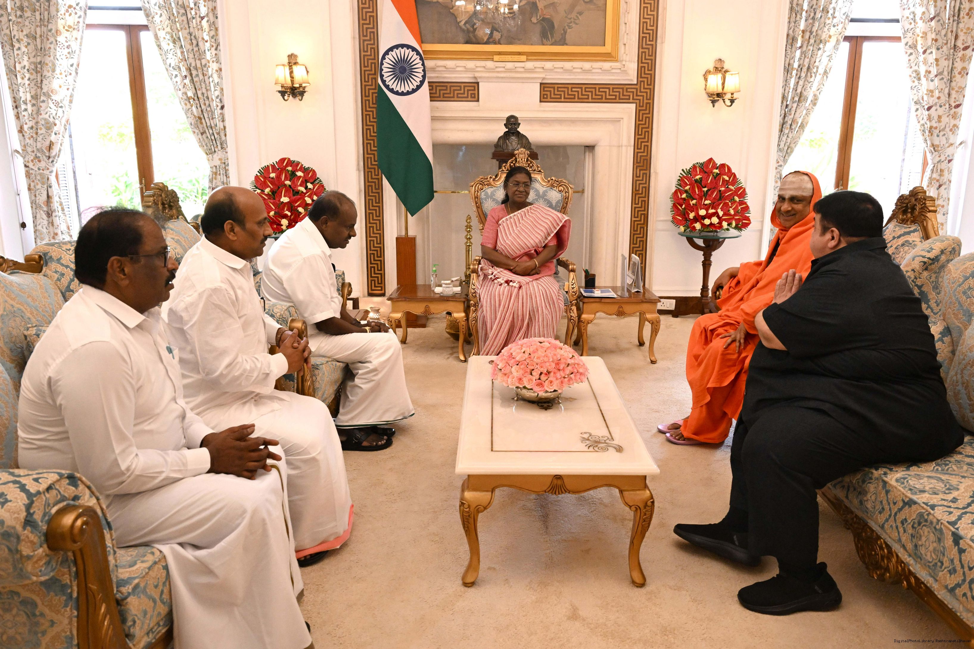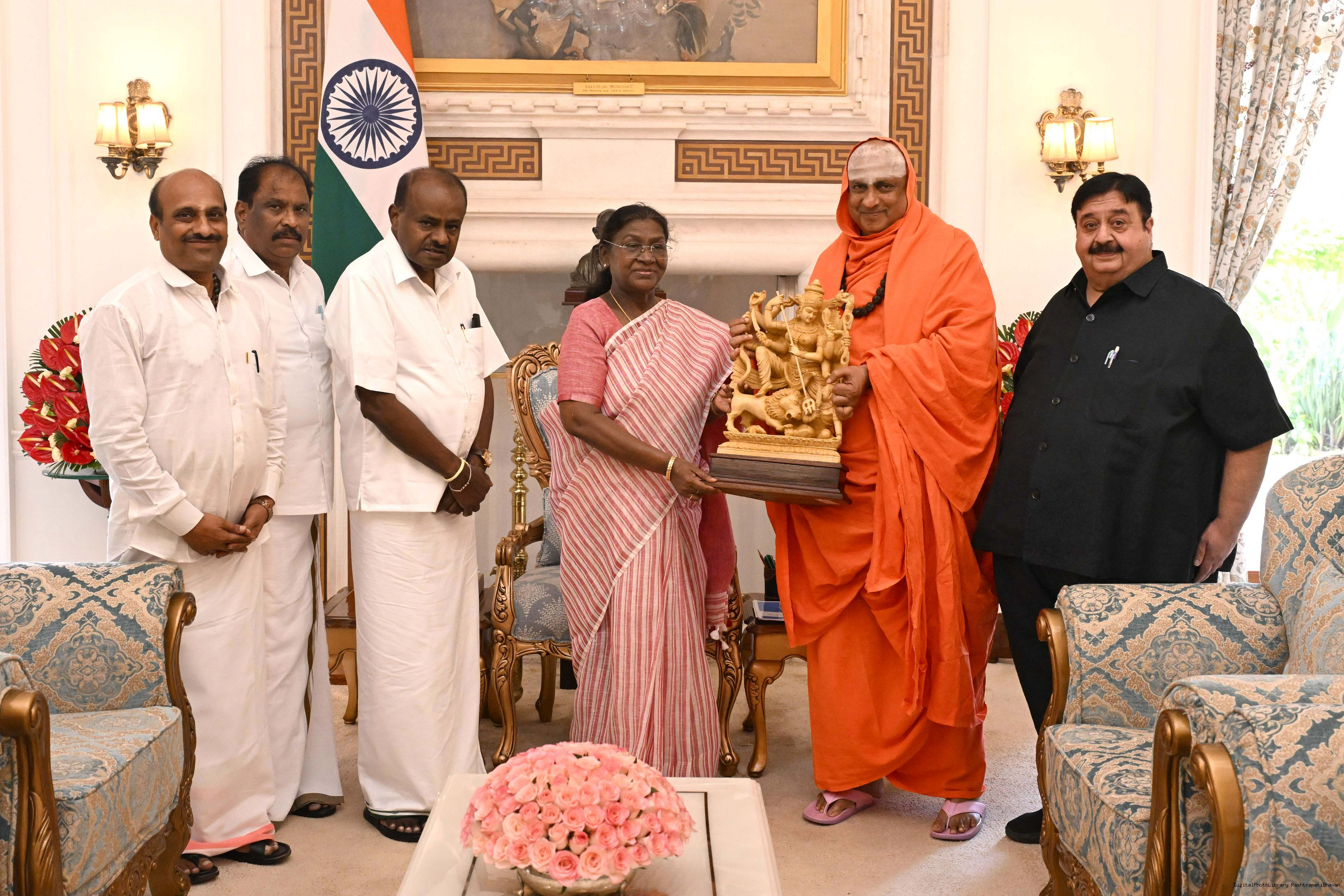 | Caption: | Shri H.D. Kumaraswamy, Minister of Heave Industries and steel along with Shri Shivaratreeshwara Deshikendra Swamiji from Sutturu Matha and others meeting with the President of India, Smt. Droupadi Murmu at Rashtrapati Bhavan on September 11, 2025. |