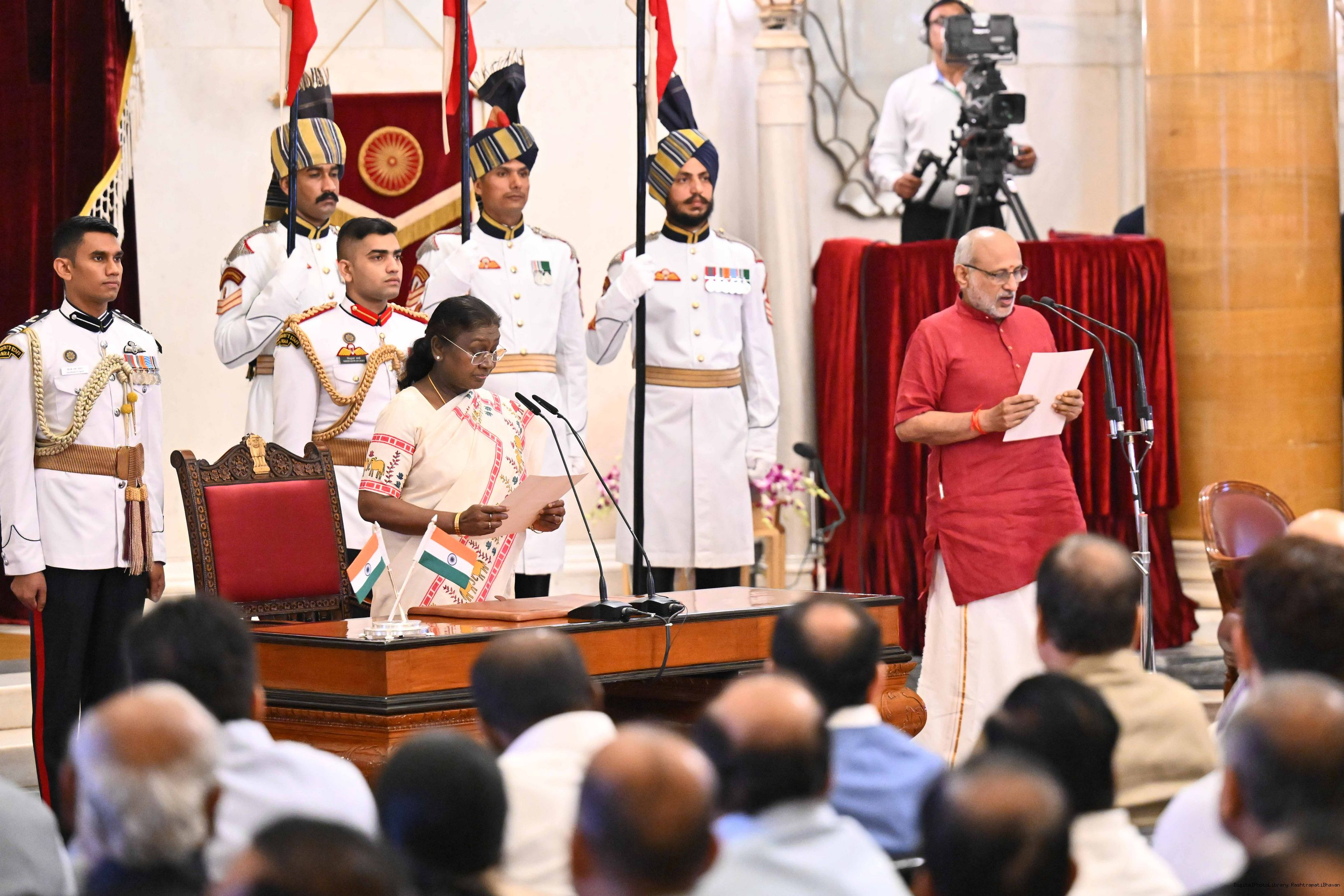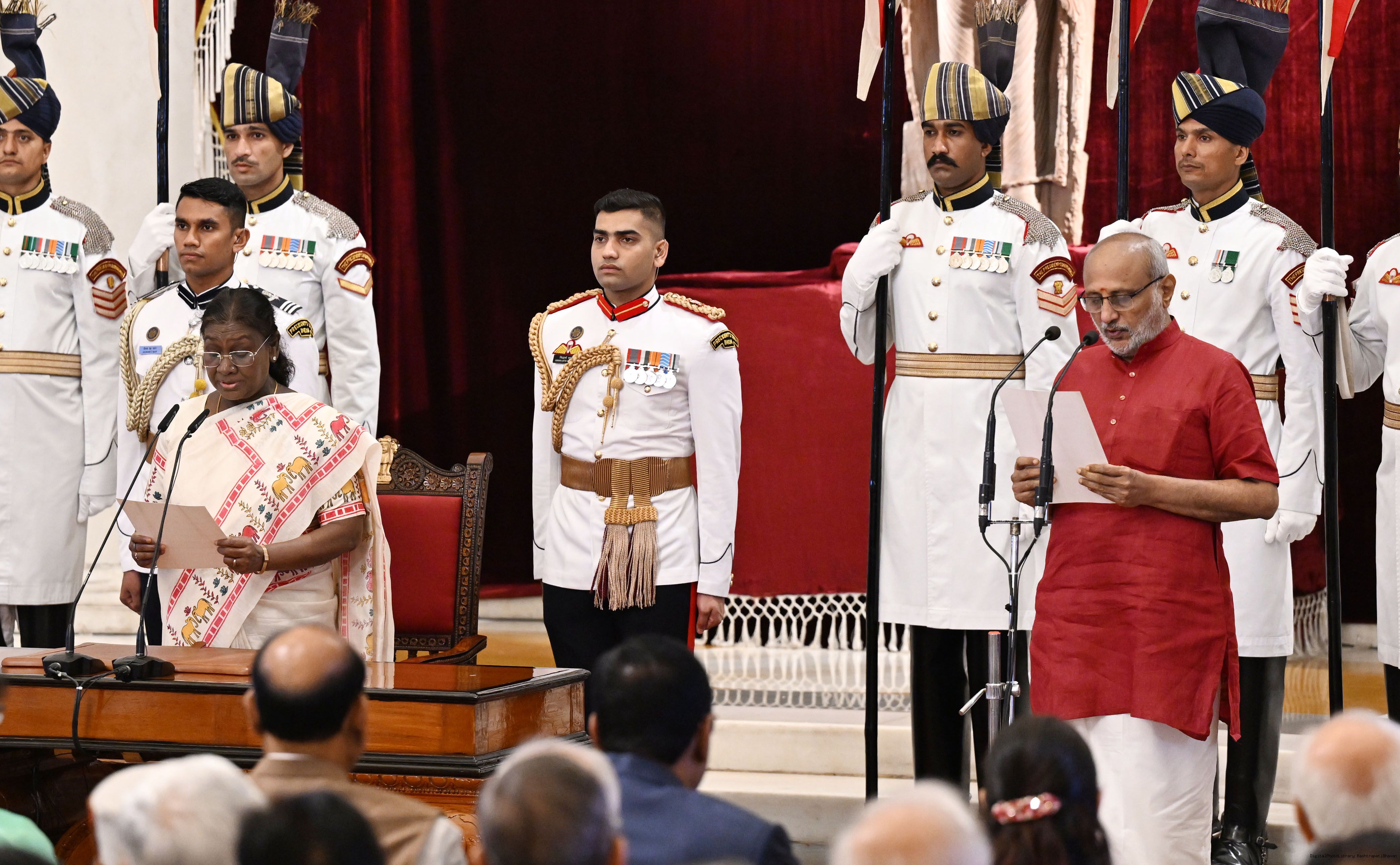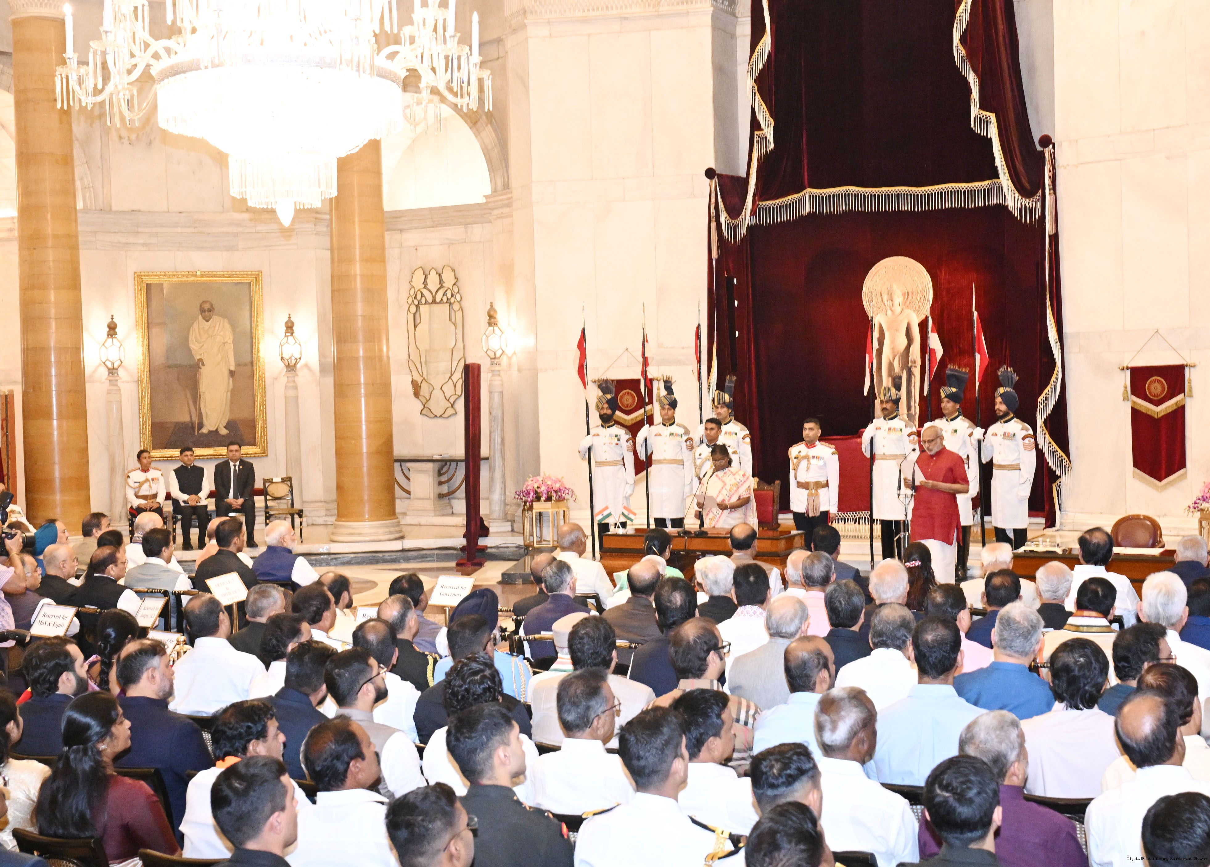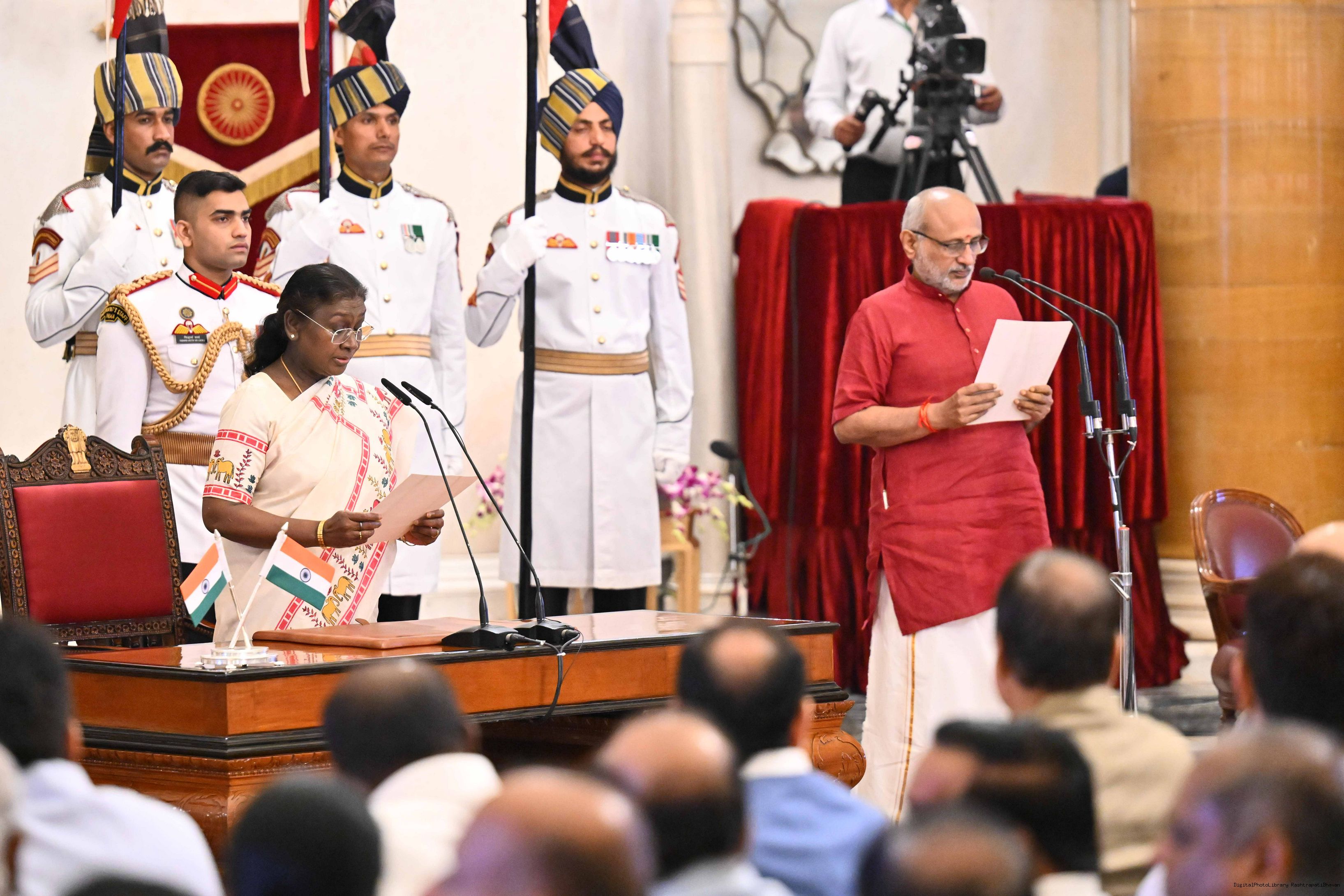 | Caption: | The President of India, Smt Droupadi Murmu administered the Oath of Office of Vice President of India to Shri C. P. Radhakrishnan at a Swearing-in-Ceremony held at Ganatantra Mandap, Rashtrapati Bhavan on September 12, 2025. |
