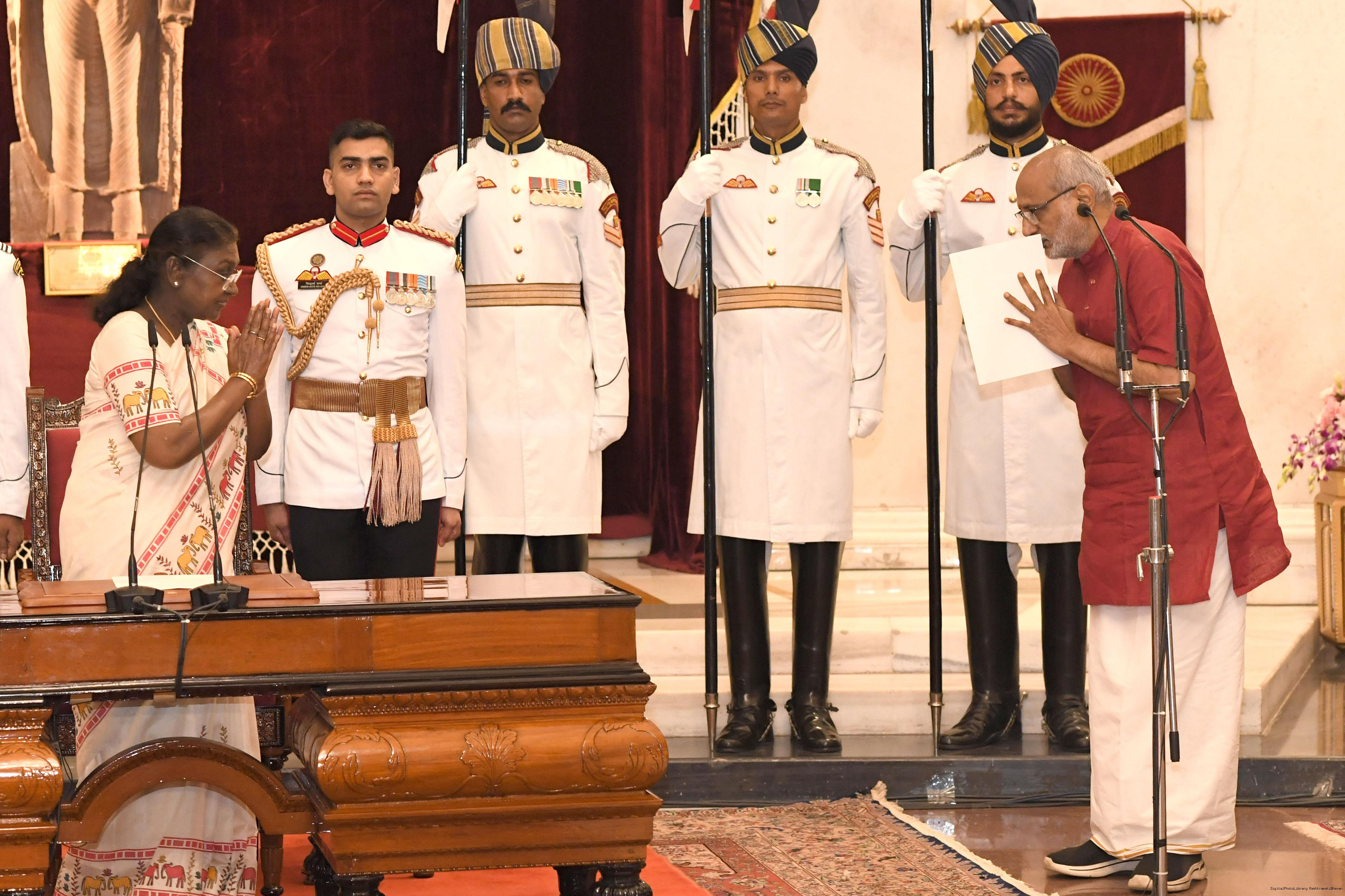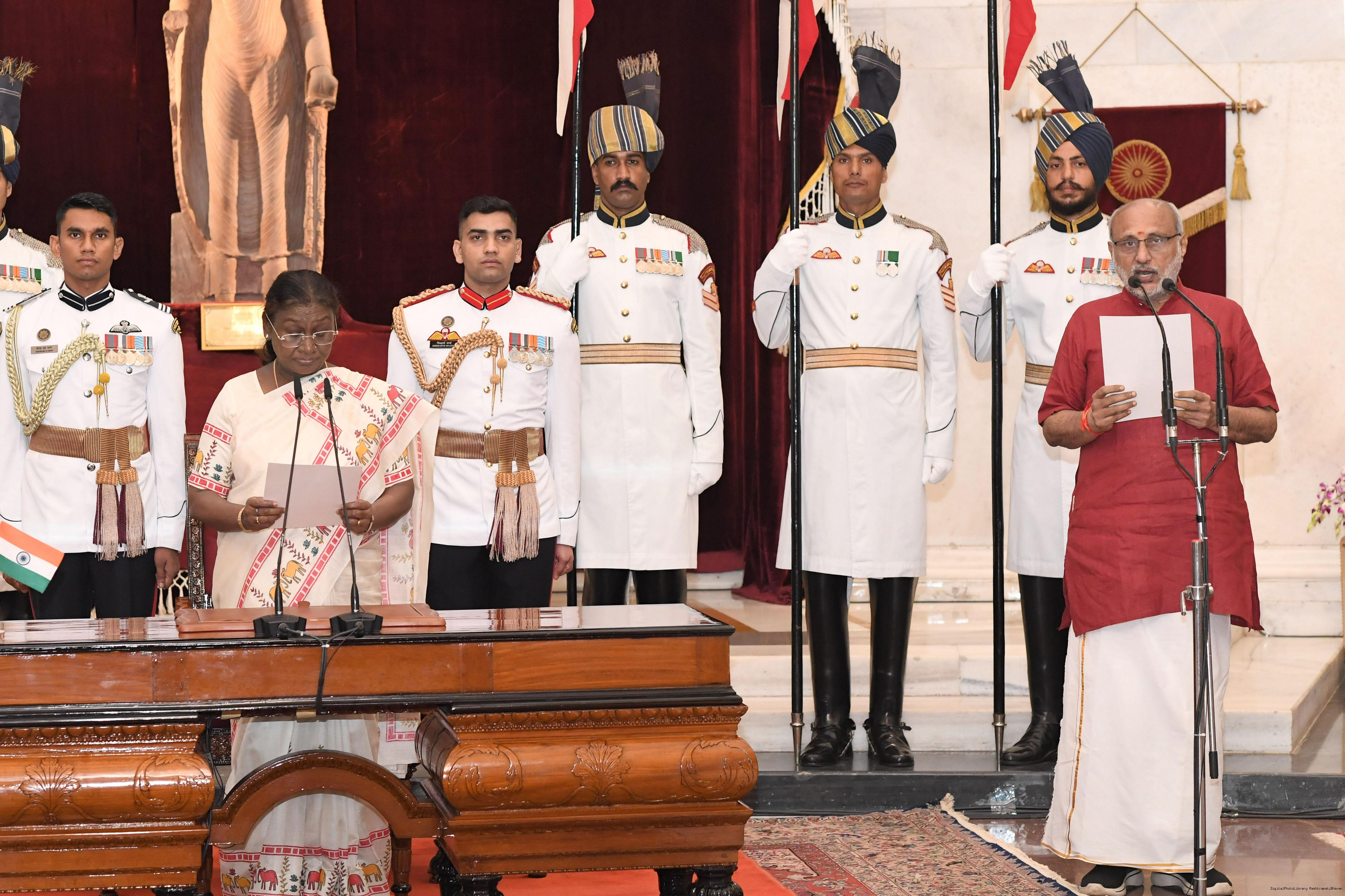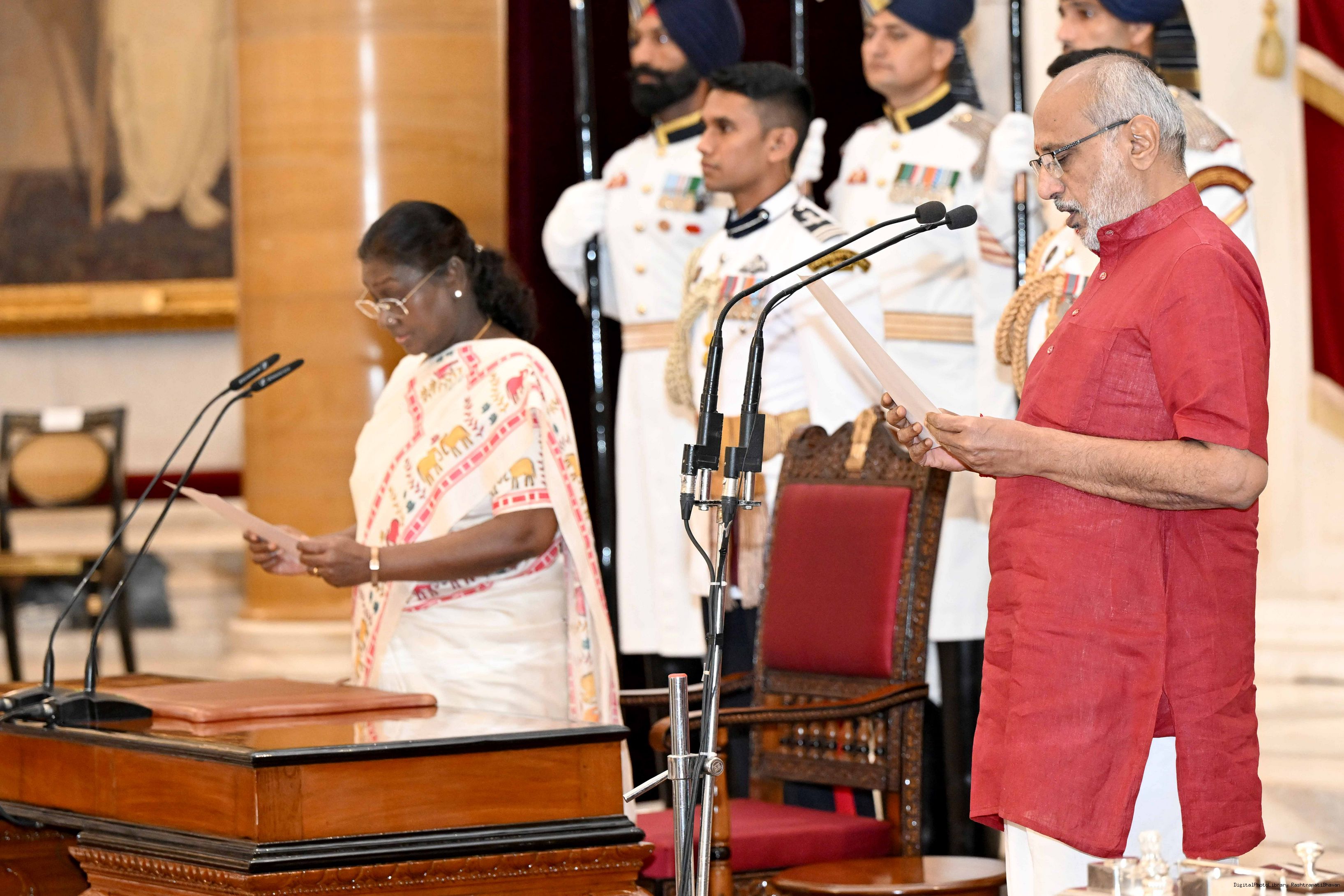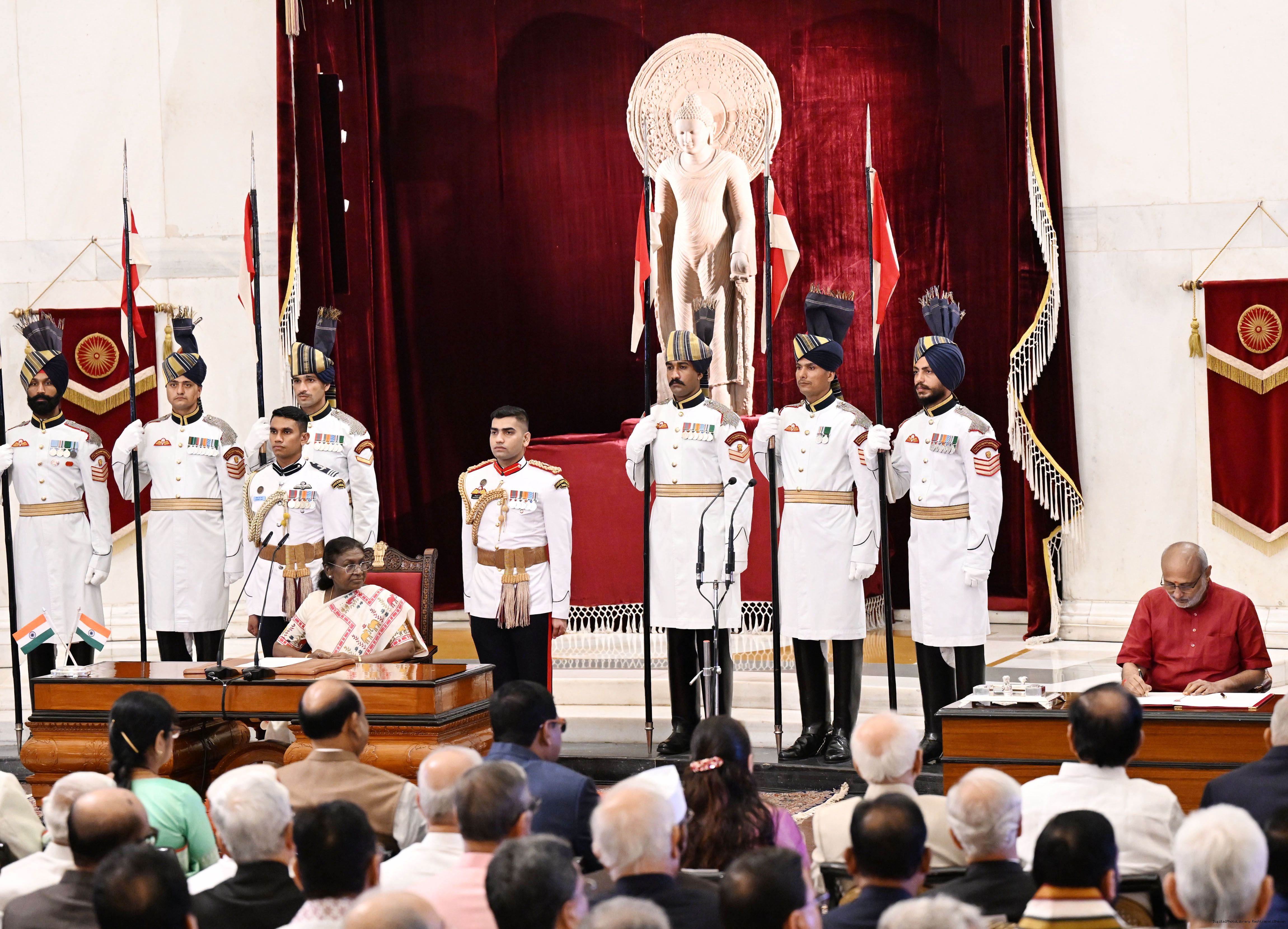 | Caption: | The President of India, Smt Droupadi Murmu administered the Oath of Office of Vice President of India to Shri C. P. Radhakrishnan at a Swearing-in-Ceremony held at Ganatantra Mandap, Rashtrapati Bhavan on September 12, 2025. |