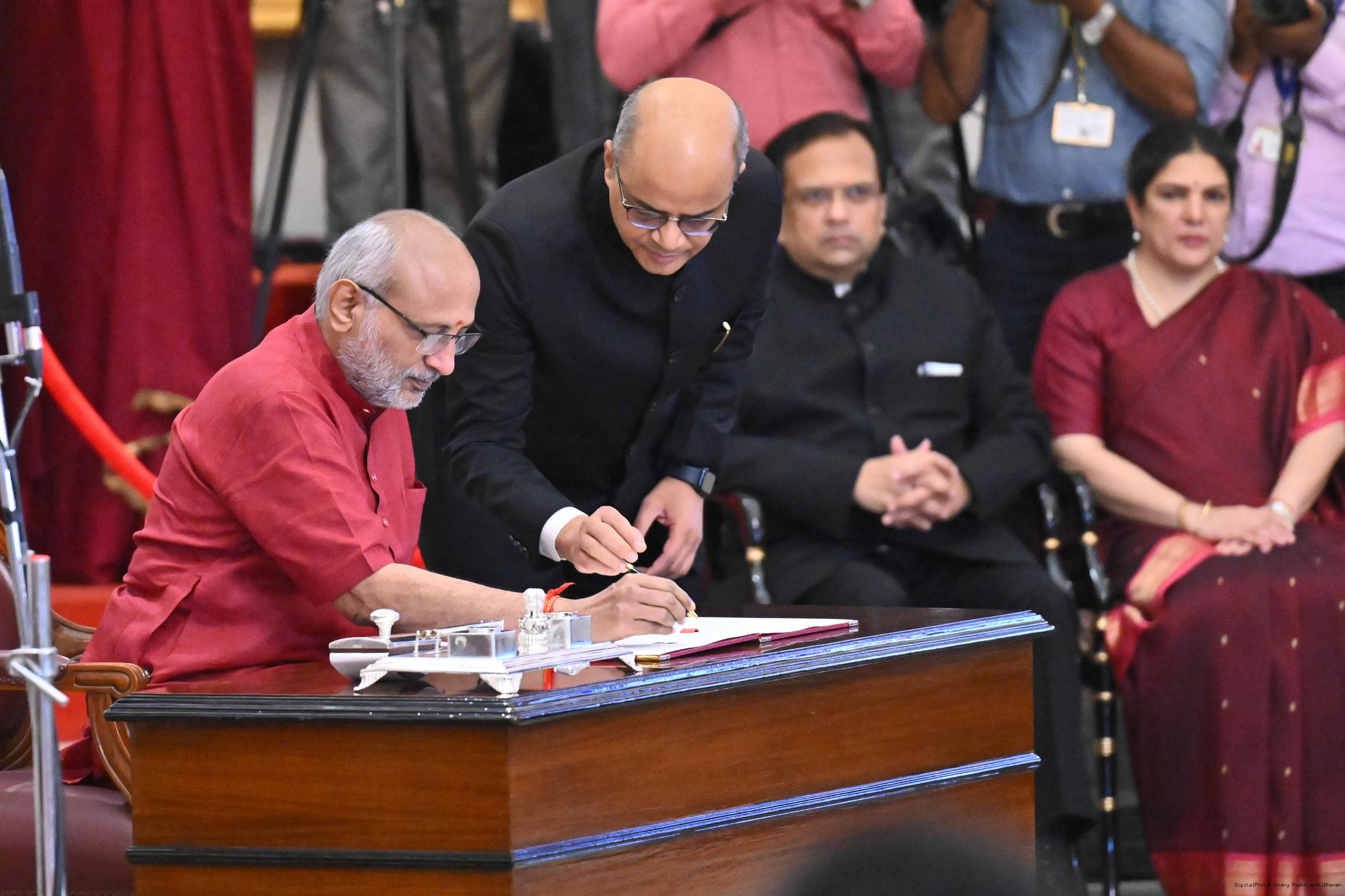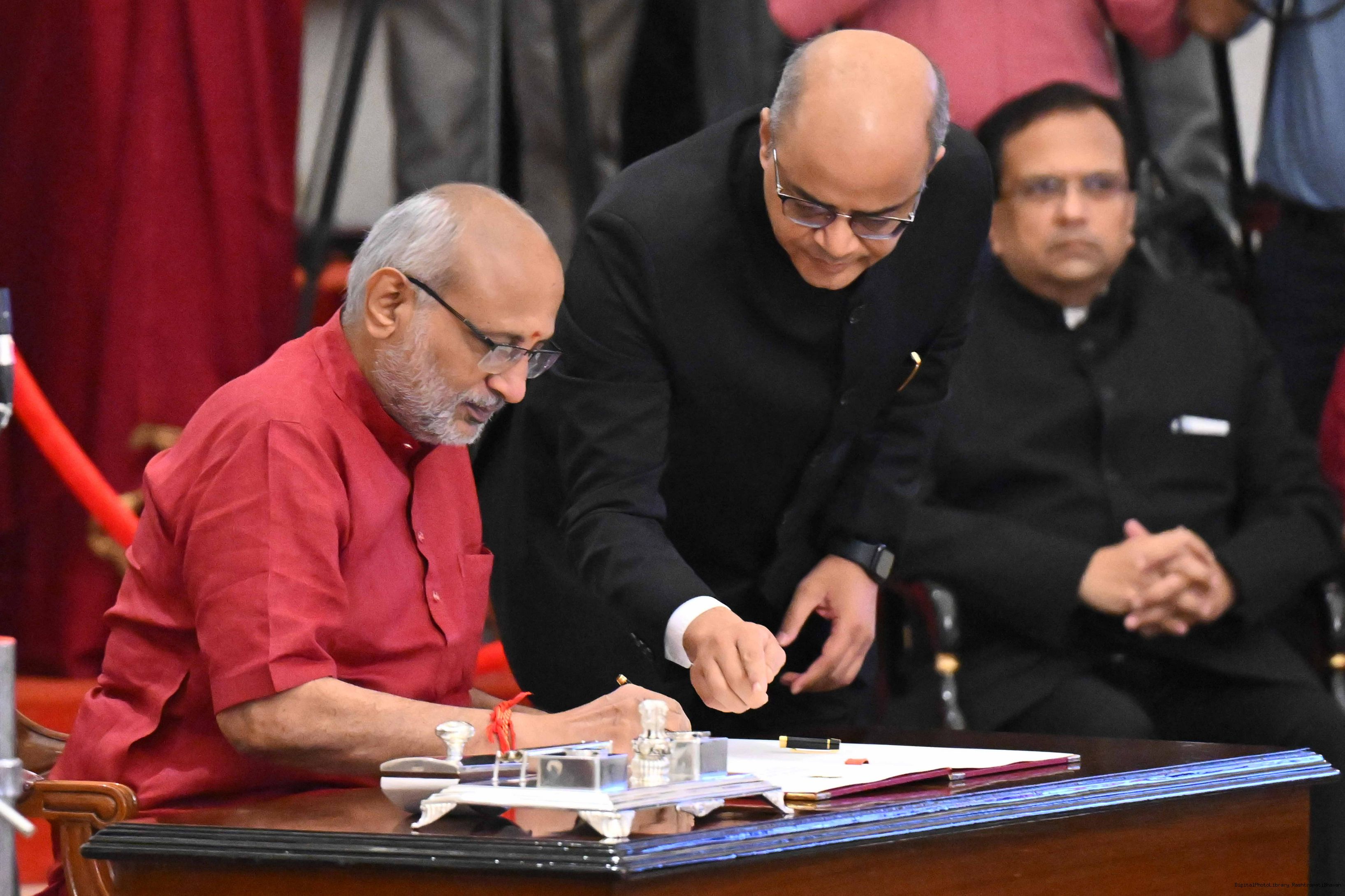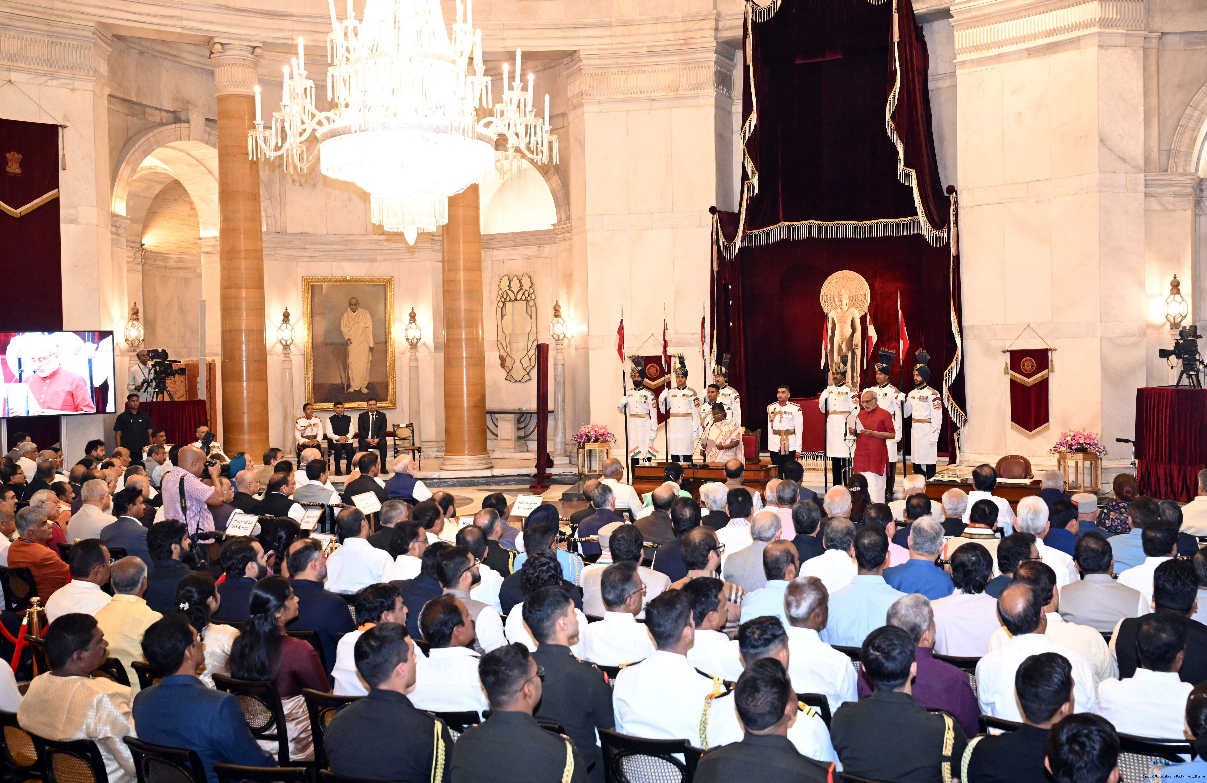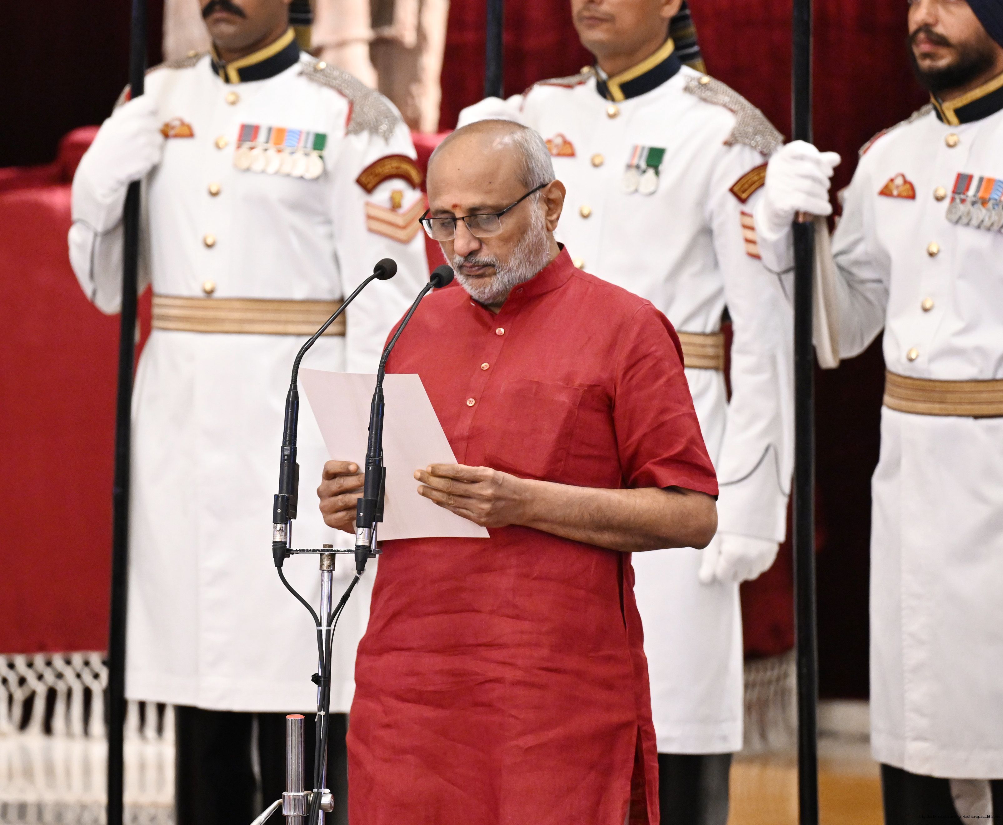 | Caption: | The President of India, Smt Droupadi Murmu administered the Oath of Office of Vice President of India to Shri C. P. Radhakrishnan at a Swearing-in-Ceremony held at Ganatantra Mandap, Rashtrapati Bhavan on September 12, 2025. |