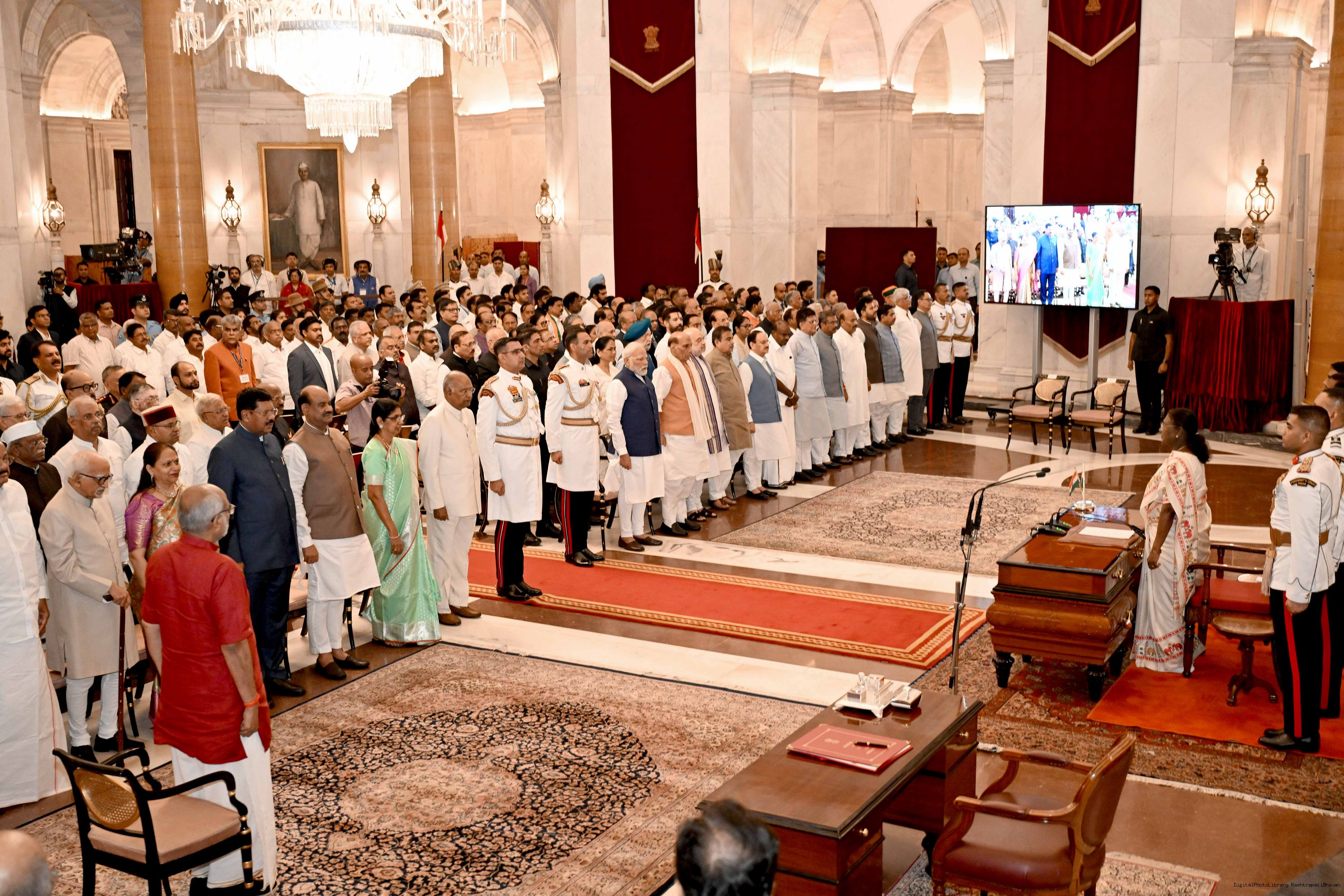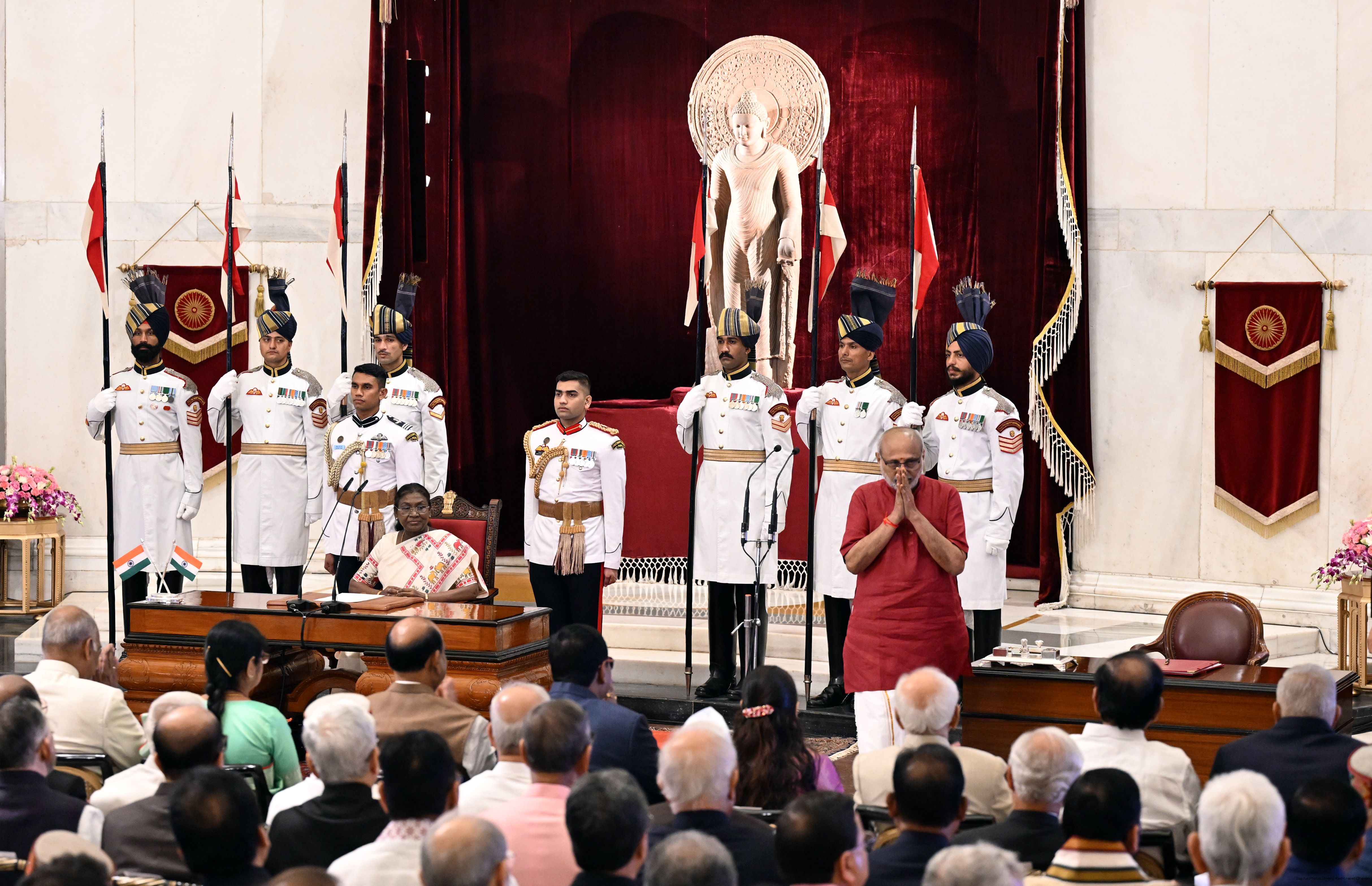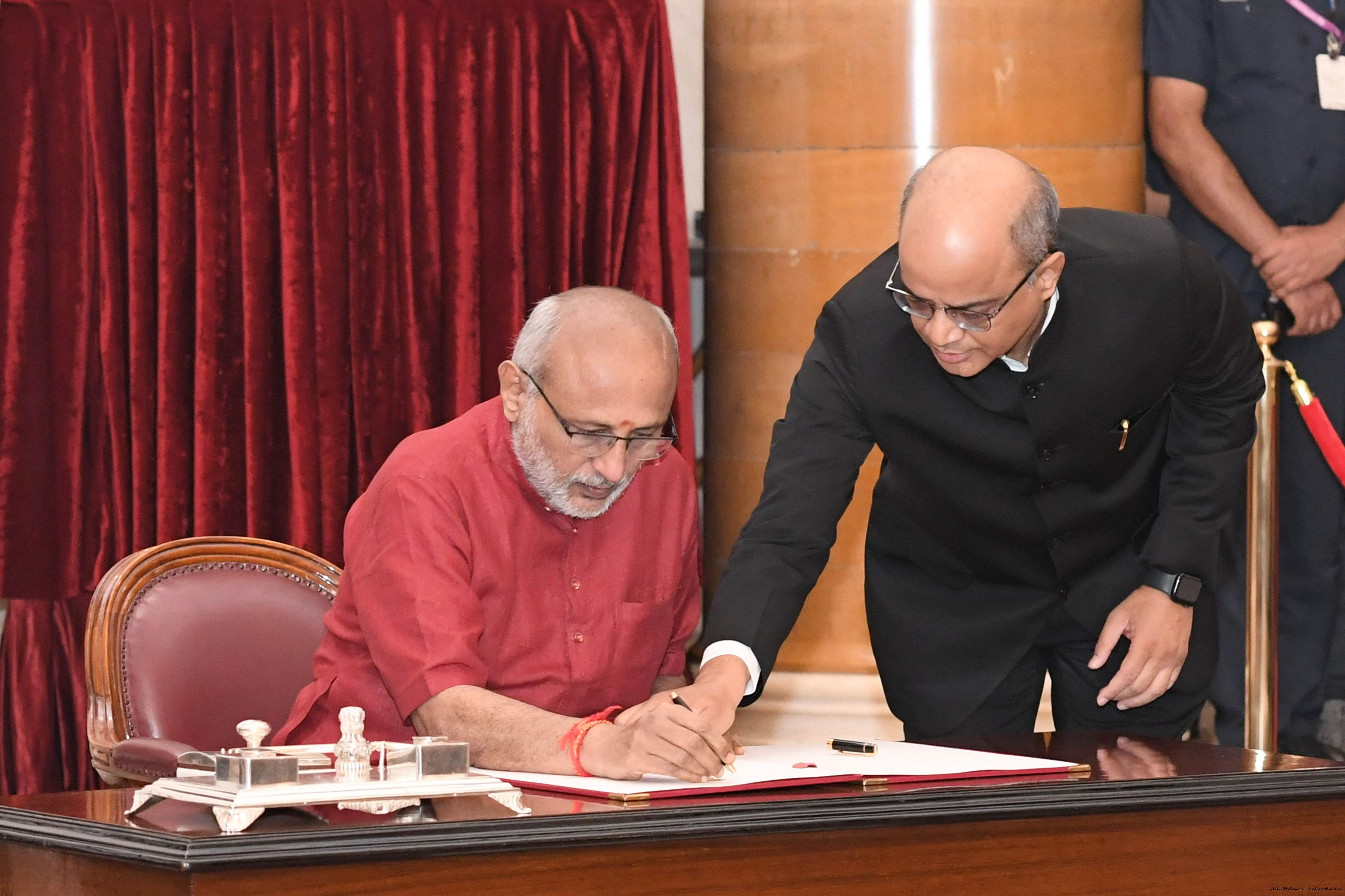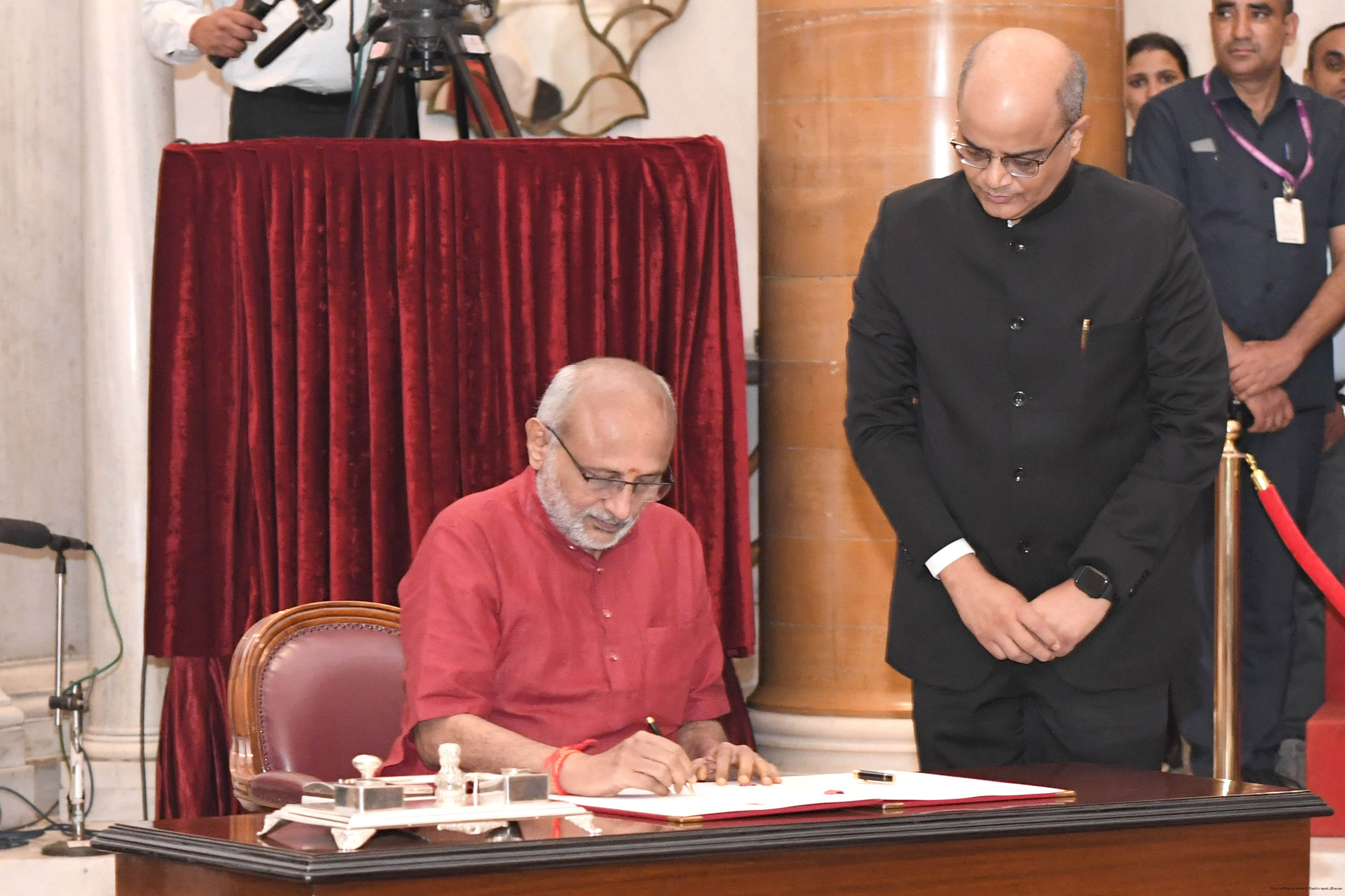 | Caption: | The President of India, Smt Droupadi Murmu administered the Oath of Office of Vice President of India to Shri C. P. Radhakrishnan at a Swearing-in-Ceremony held at Ganatantra Mandap, Rashtrapati Bhavan on September 12, 2025. |