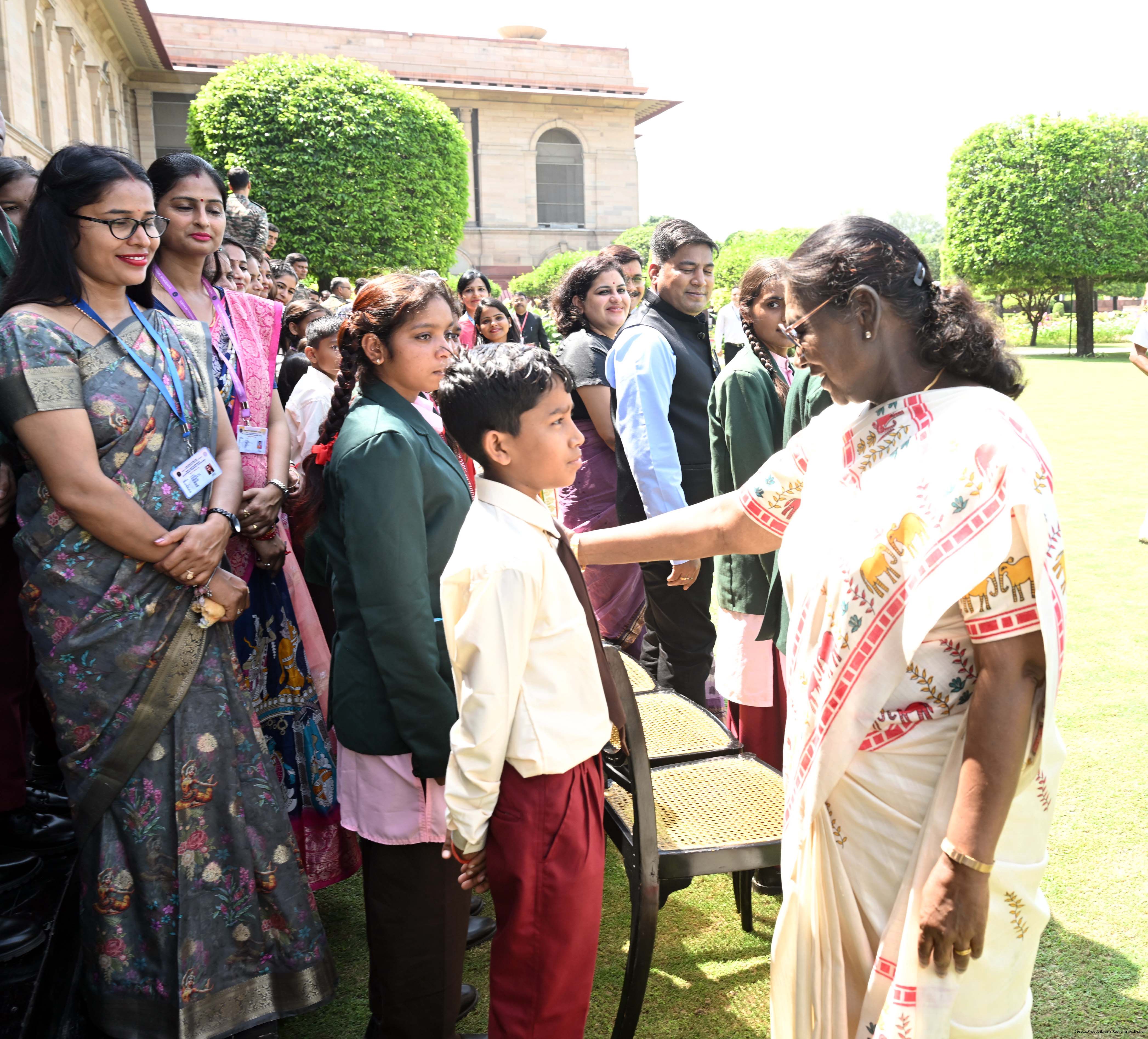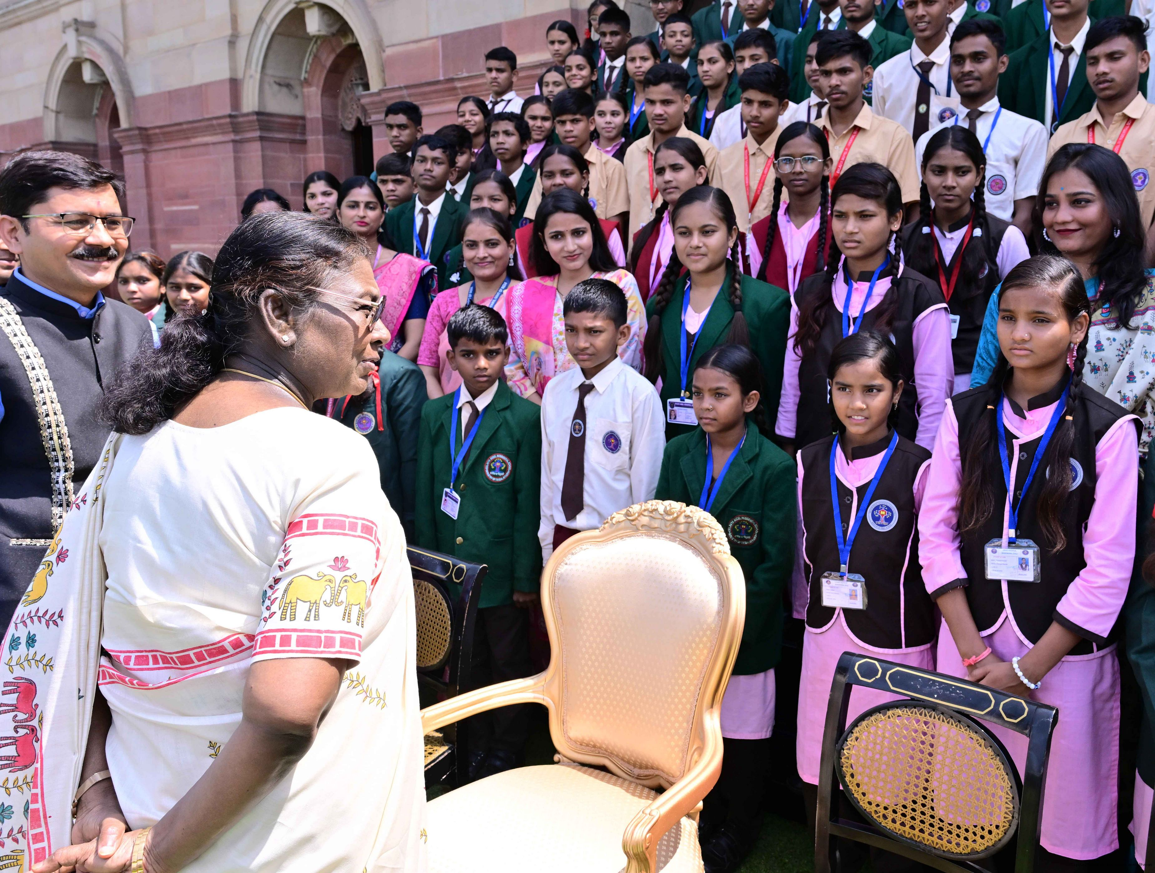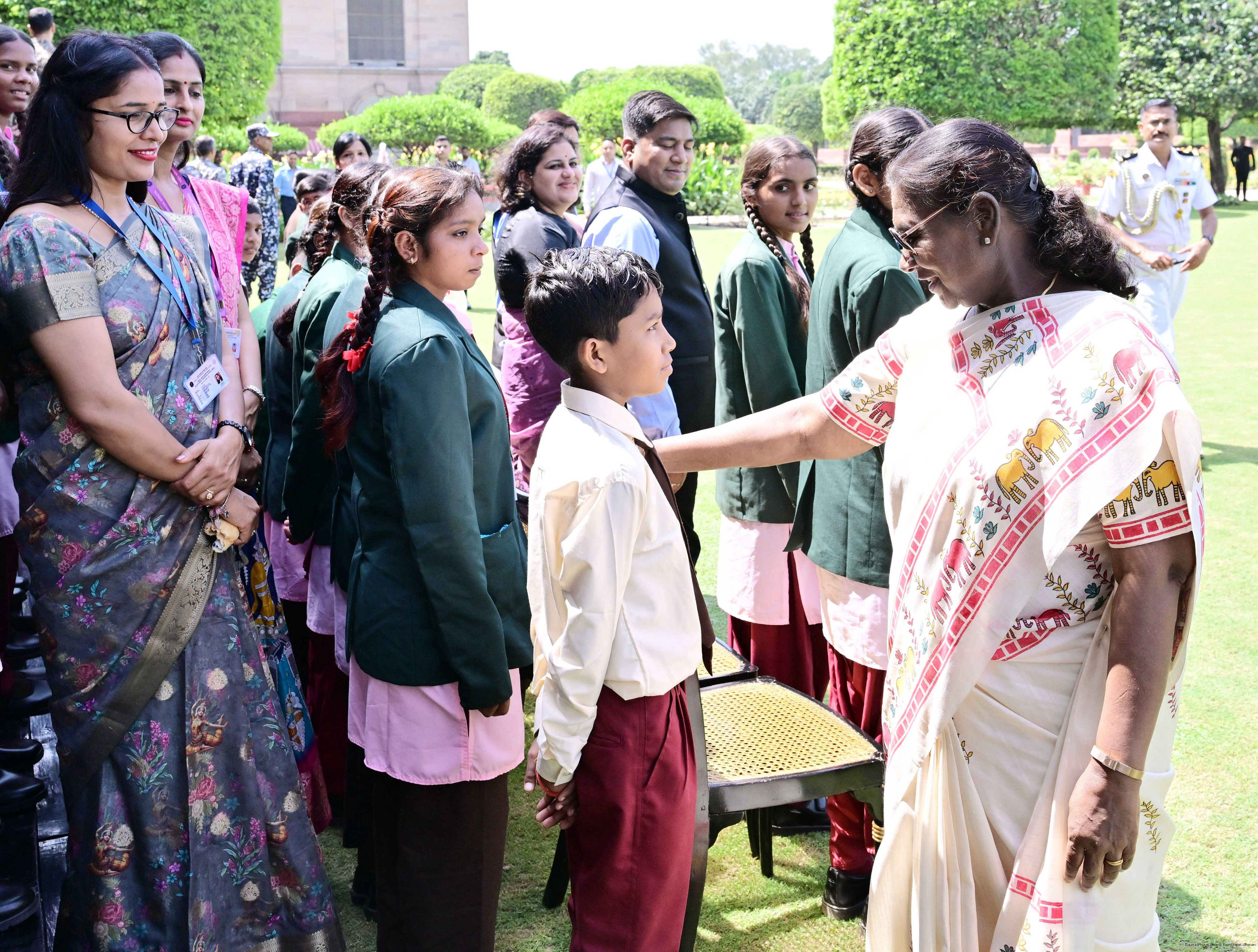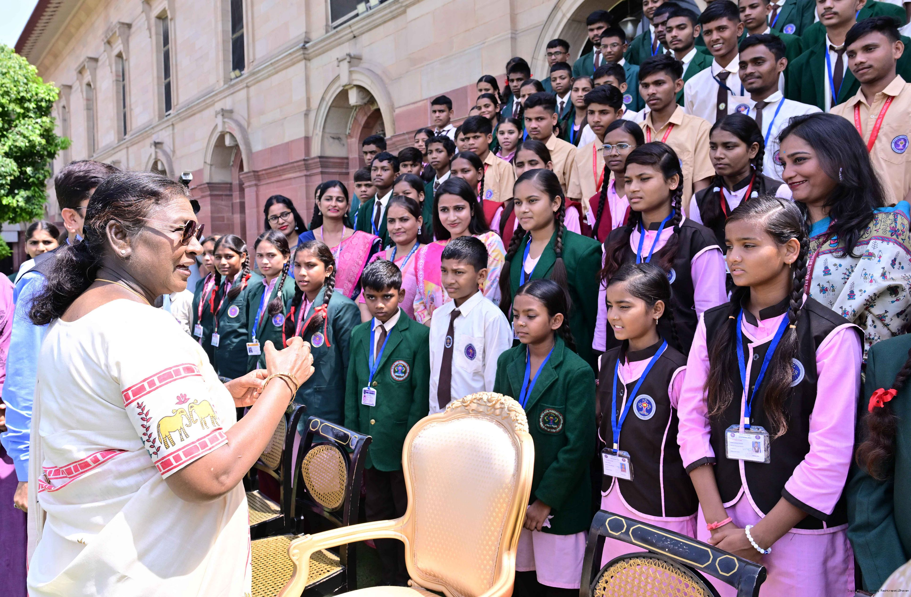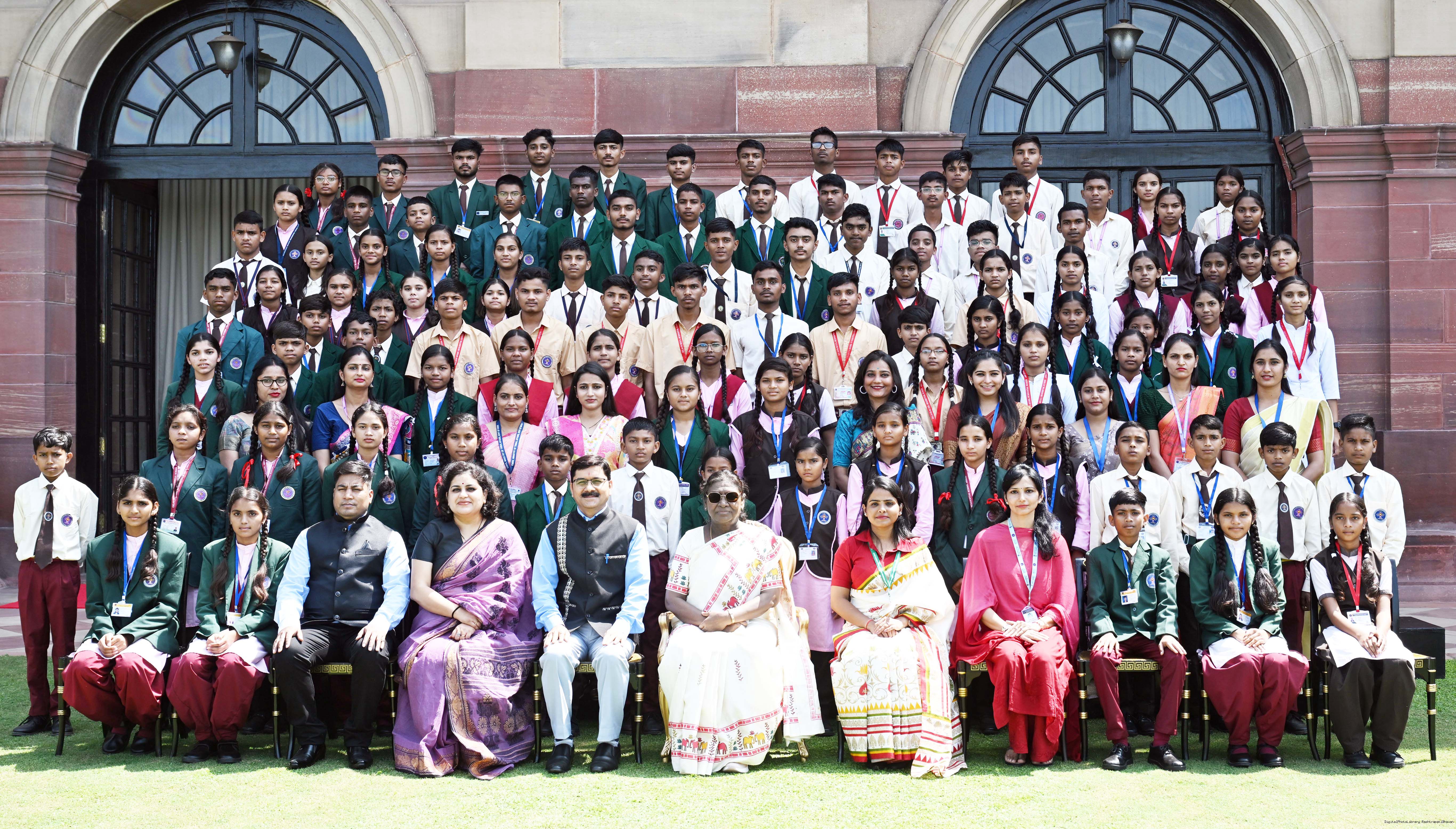 | Caption: | The President of India, Smt Droupadi Murmu met and posing a group photographs students of Ekalavya Model Residential School (EMRS), 10 escorts and 4 NESTS officials at Rashtrapati Bhavan on September 12, 2025. |
