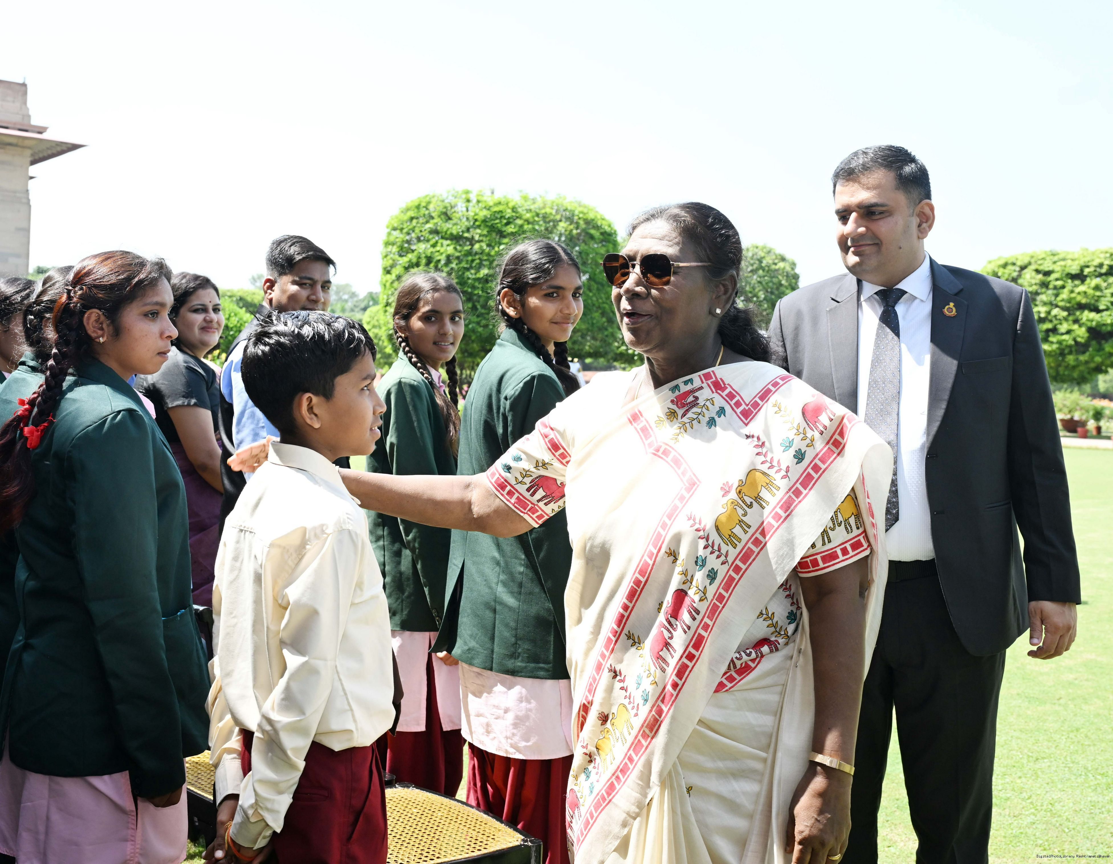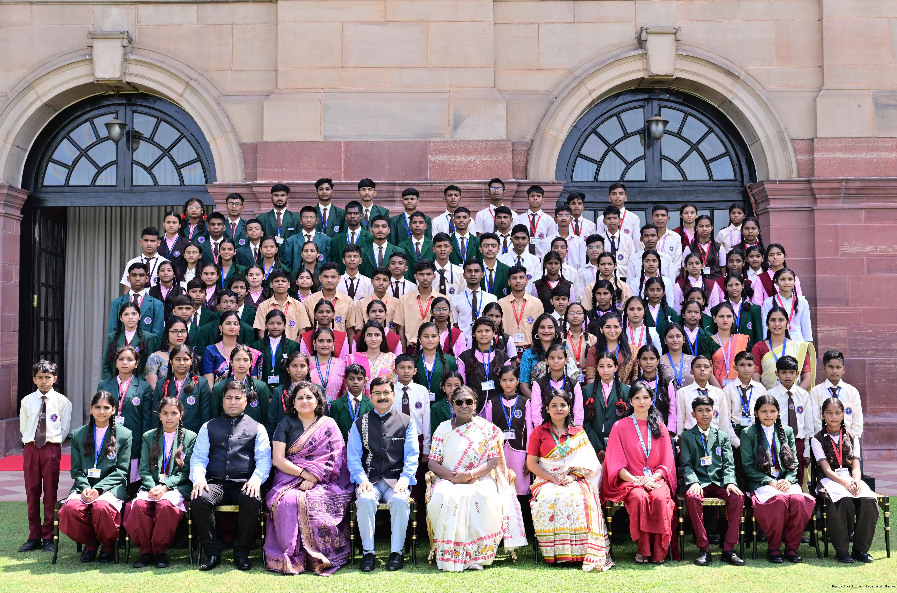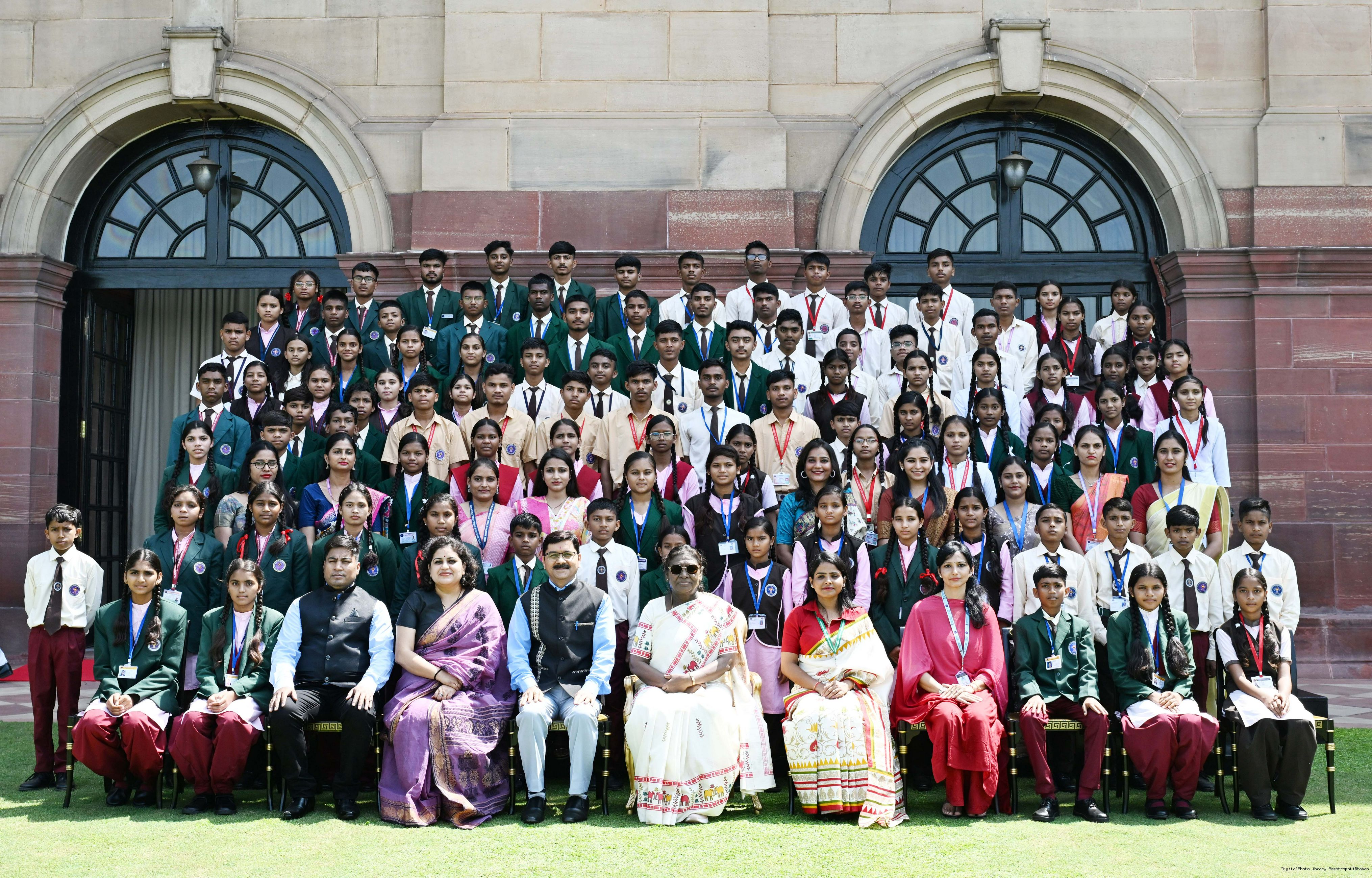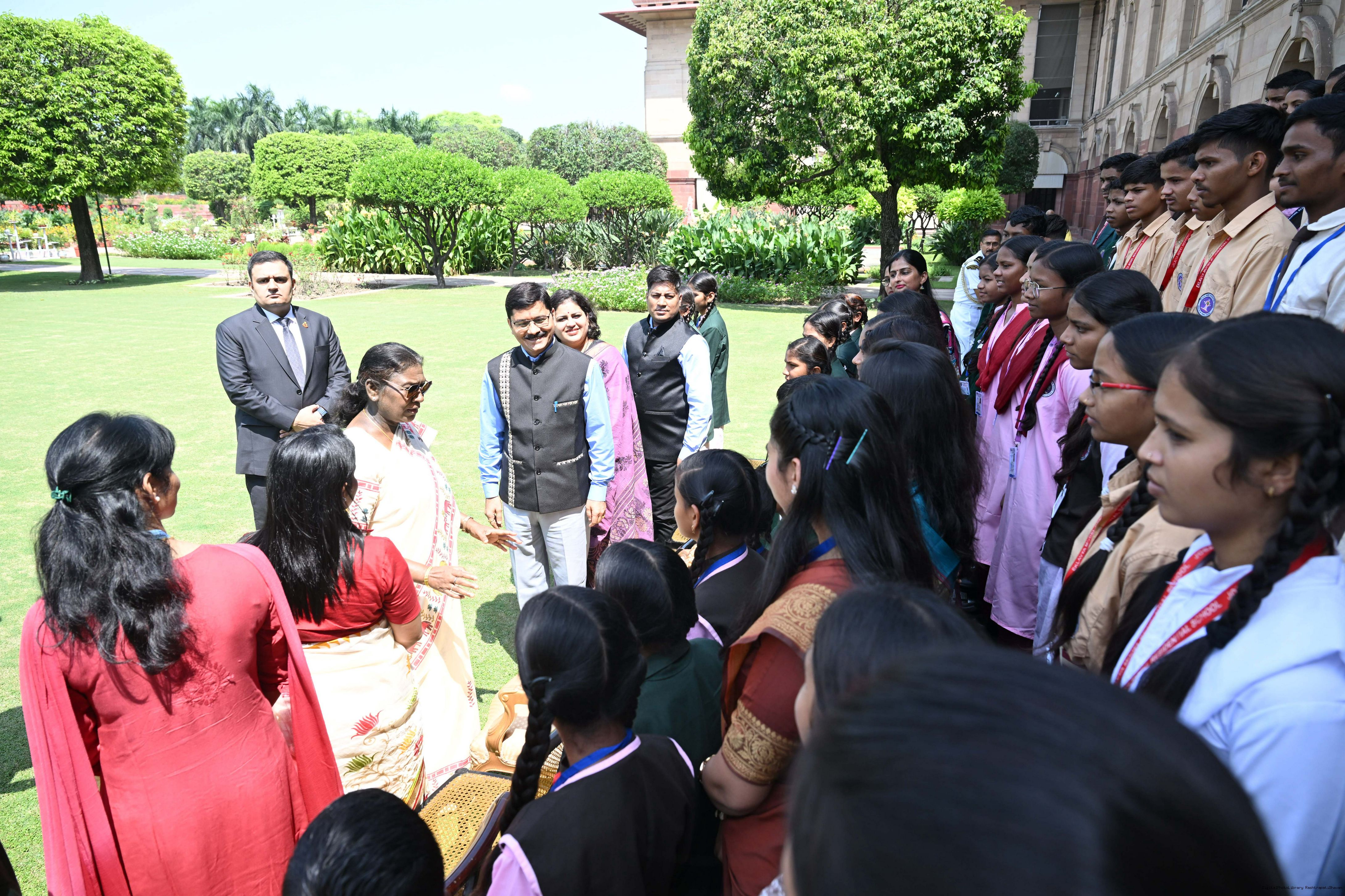 | Caption: | The President of India, Smt Droupadi Murmu met and posing a group photographs students of Ekalavya Model Residential School (EMRS), 10 escorts and 4 NESTS officials at Rashtrapati Bhavan on September 12, 2025. |