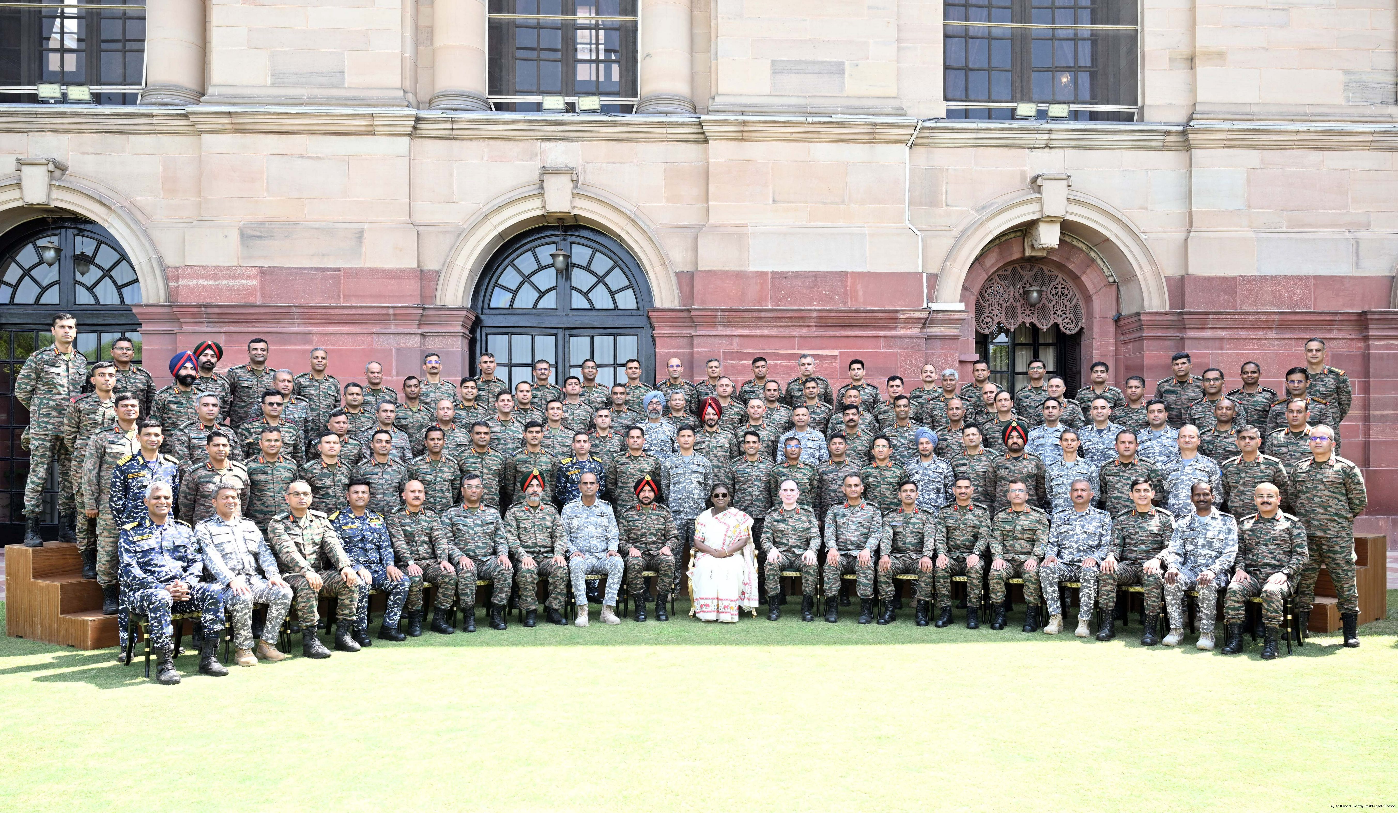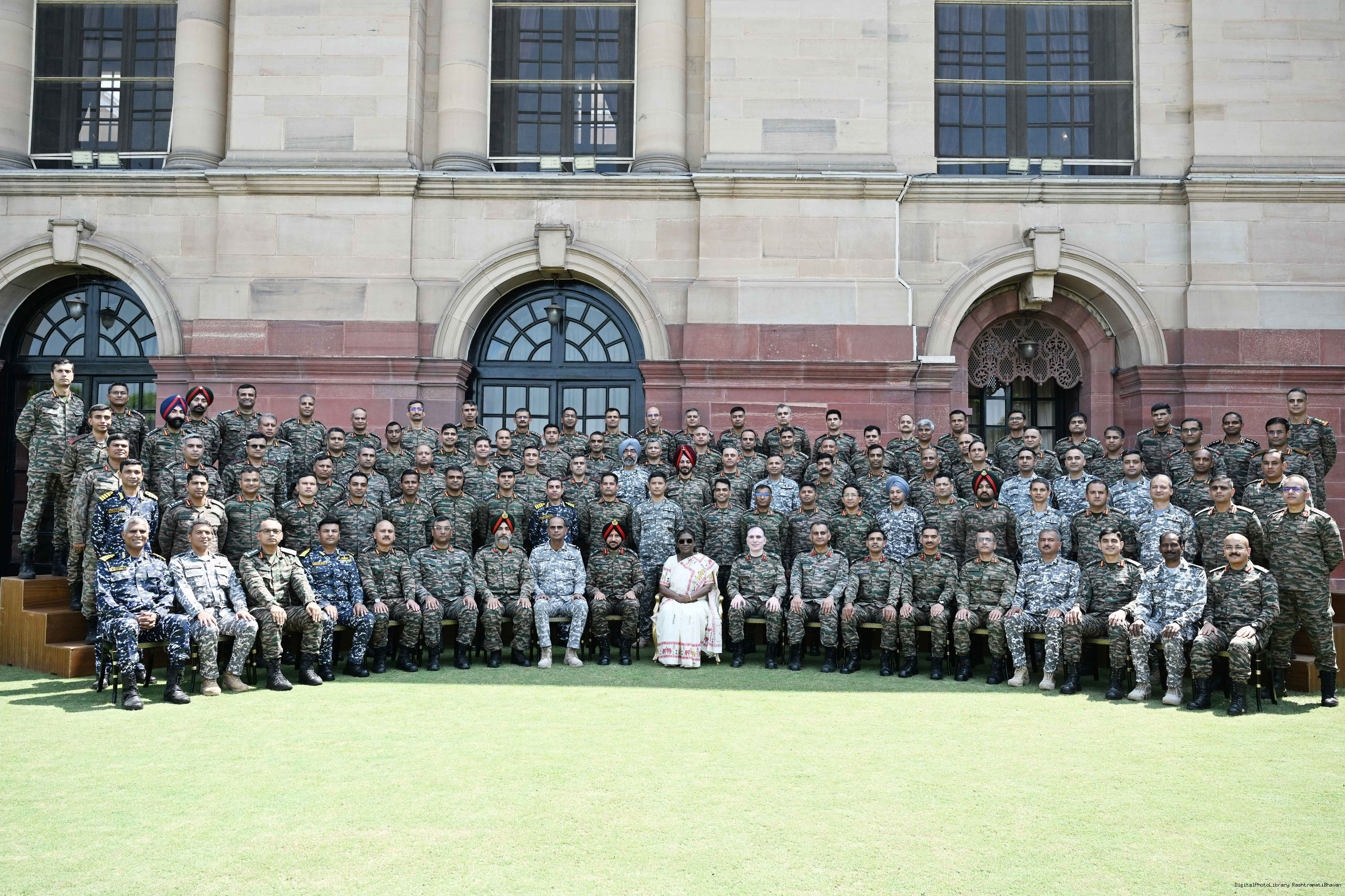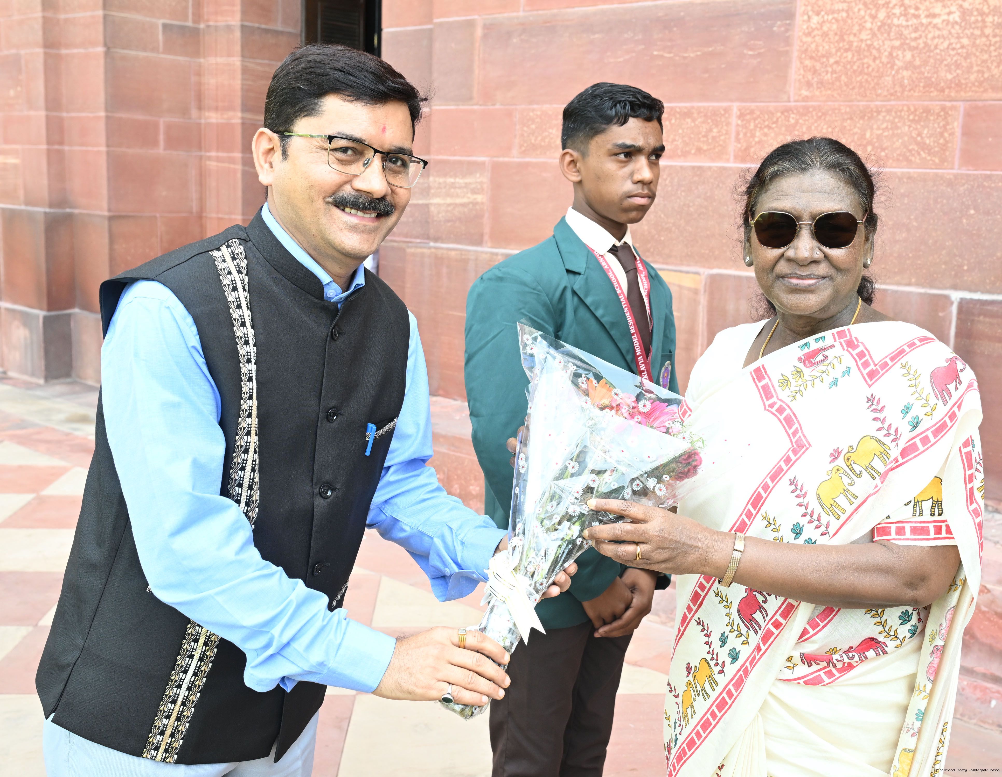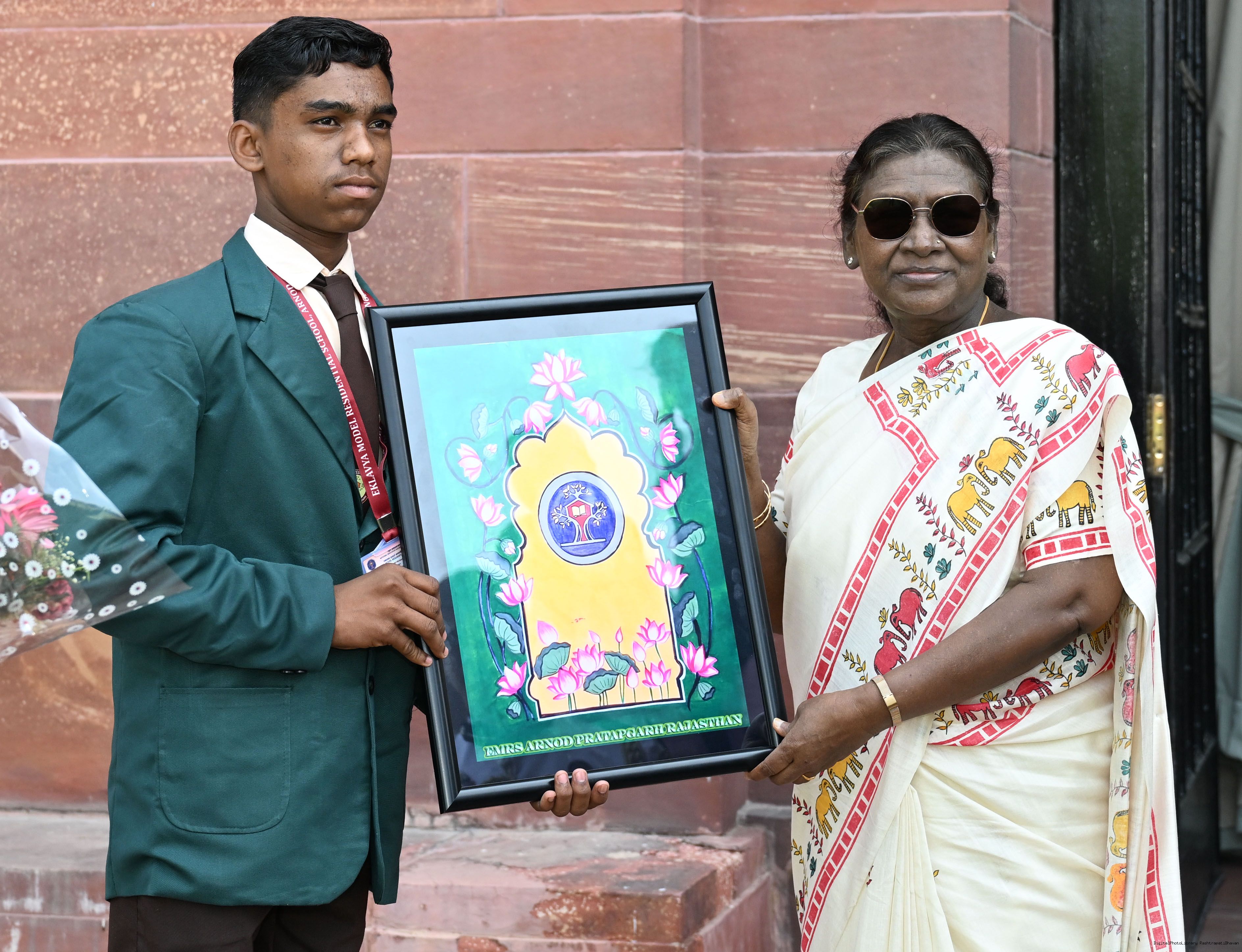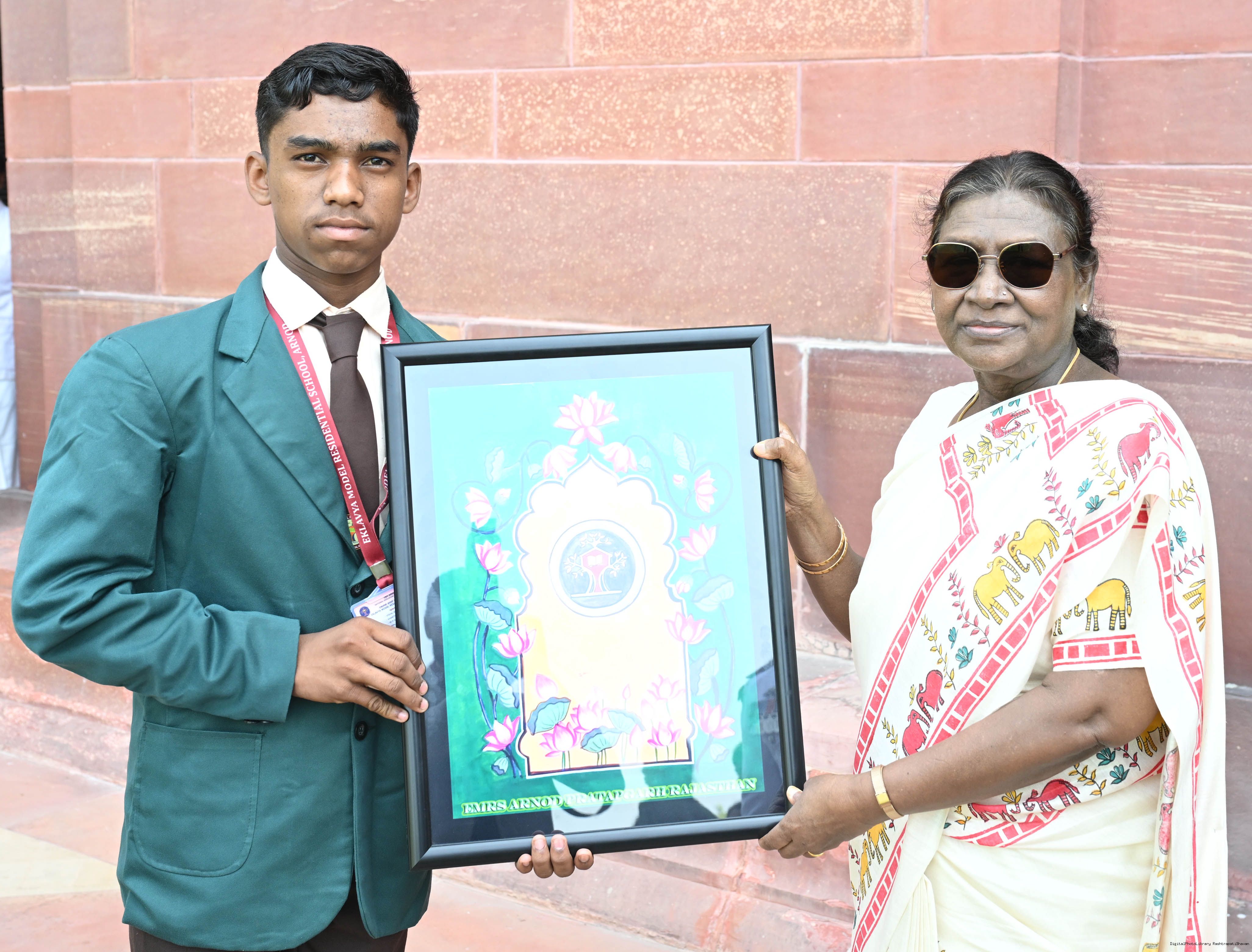 | Caption: | The President of India, Smt Droupadi Murmu met and posing a group photographs students of Ekalavya Model Residential School (EMRS), 10 escorts and 4 NESTS officials at Rashtrapati Bhavan on September 12, 2025. |