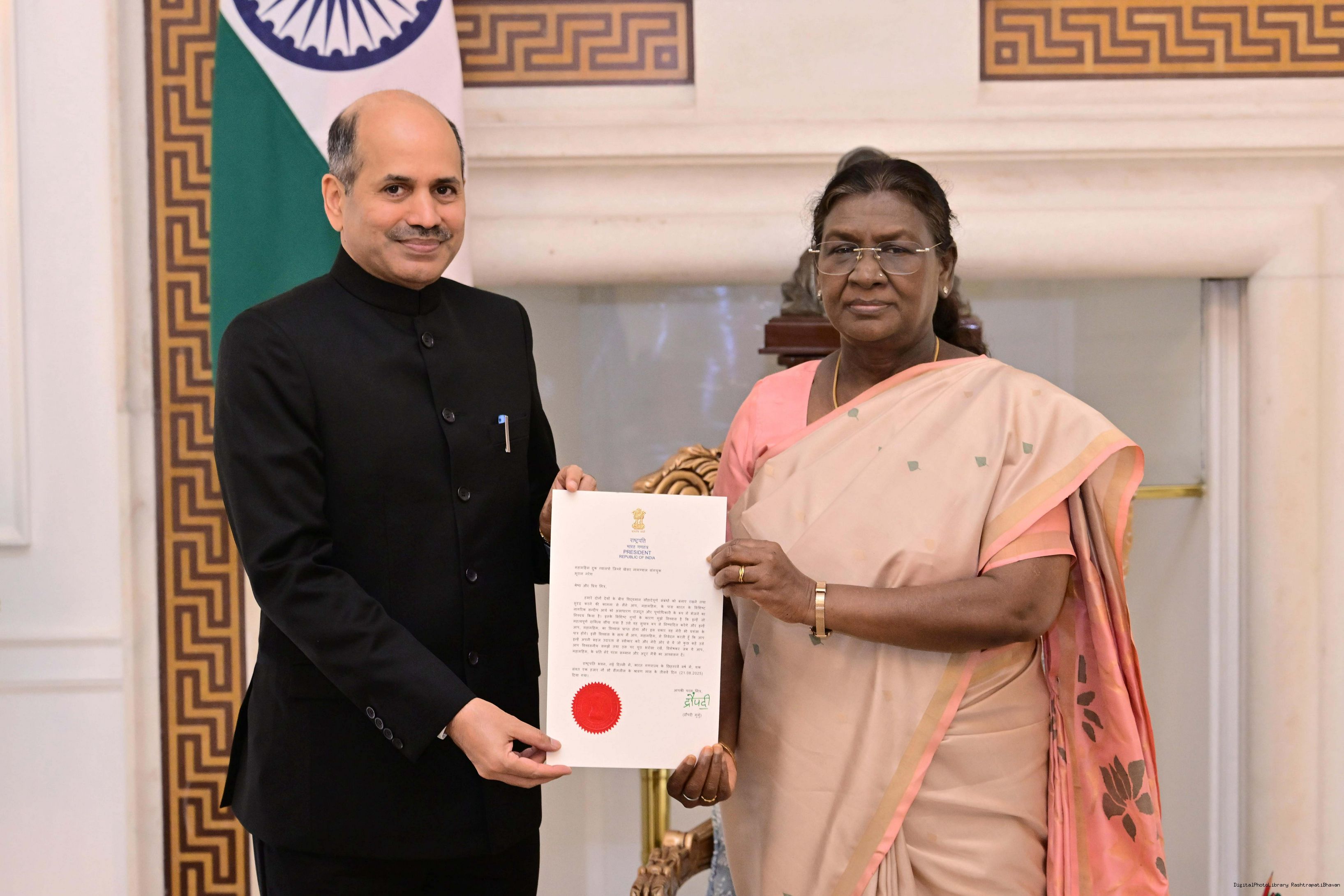 | Caption: | The Ambassador-designate of India to Bhutan, Shri Sandeep Arya meeting with the President of India, Smt. Droupadi Murmu at Rashtrapati Bhavan on September 15, 2025. |