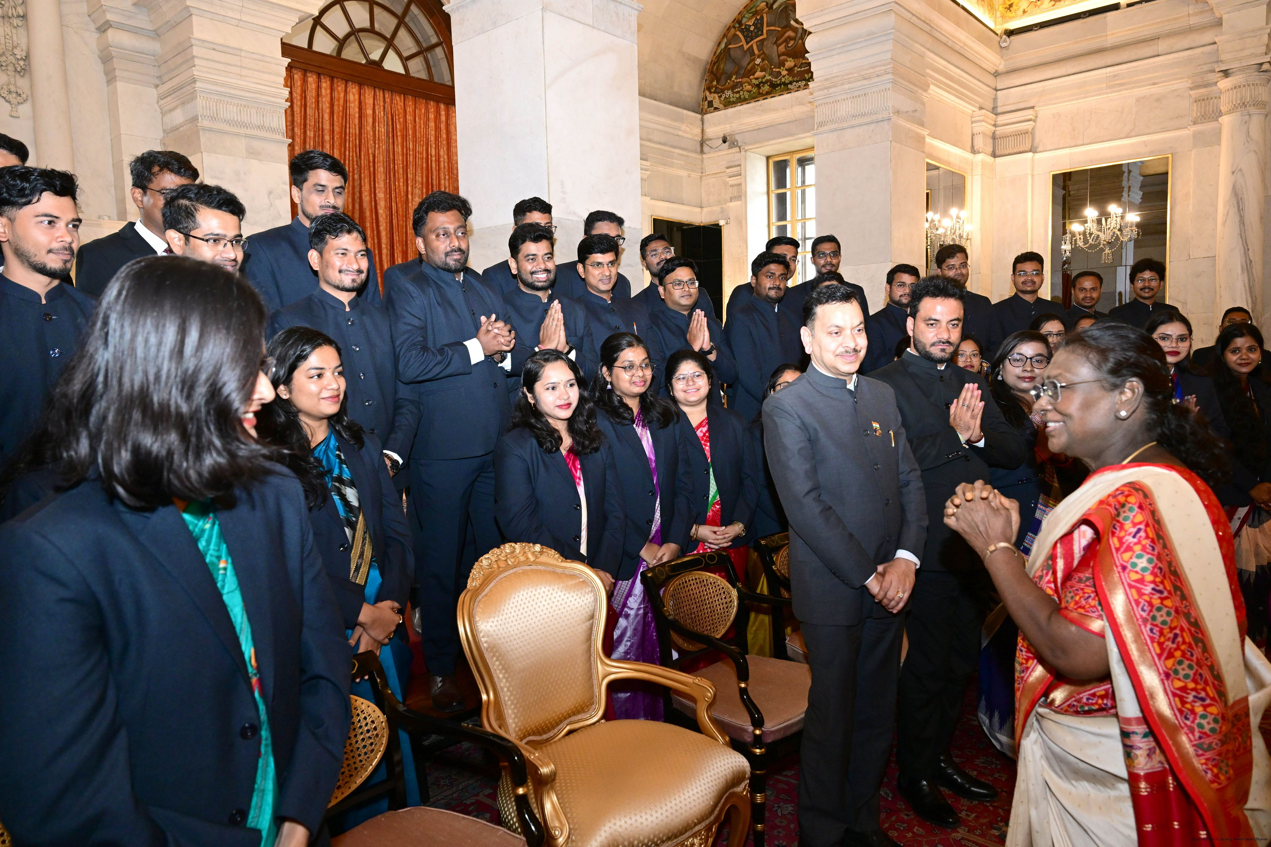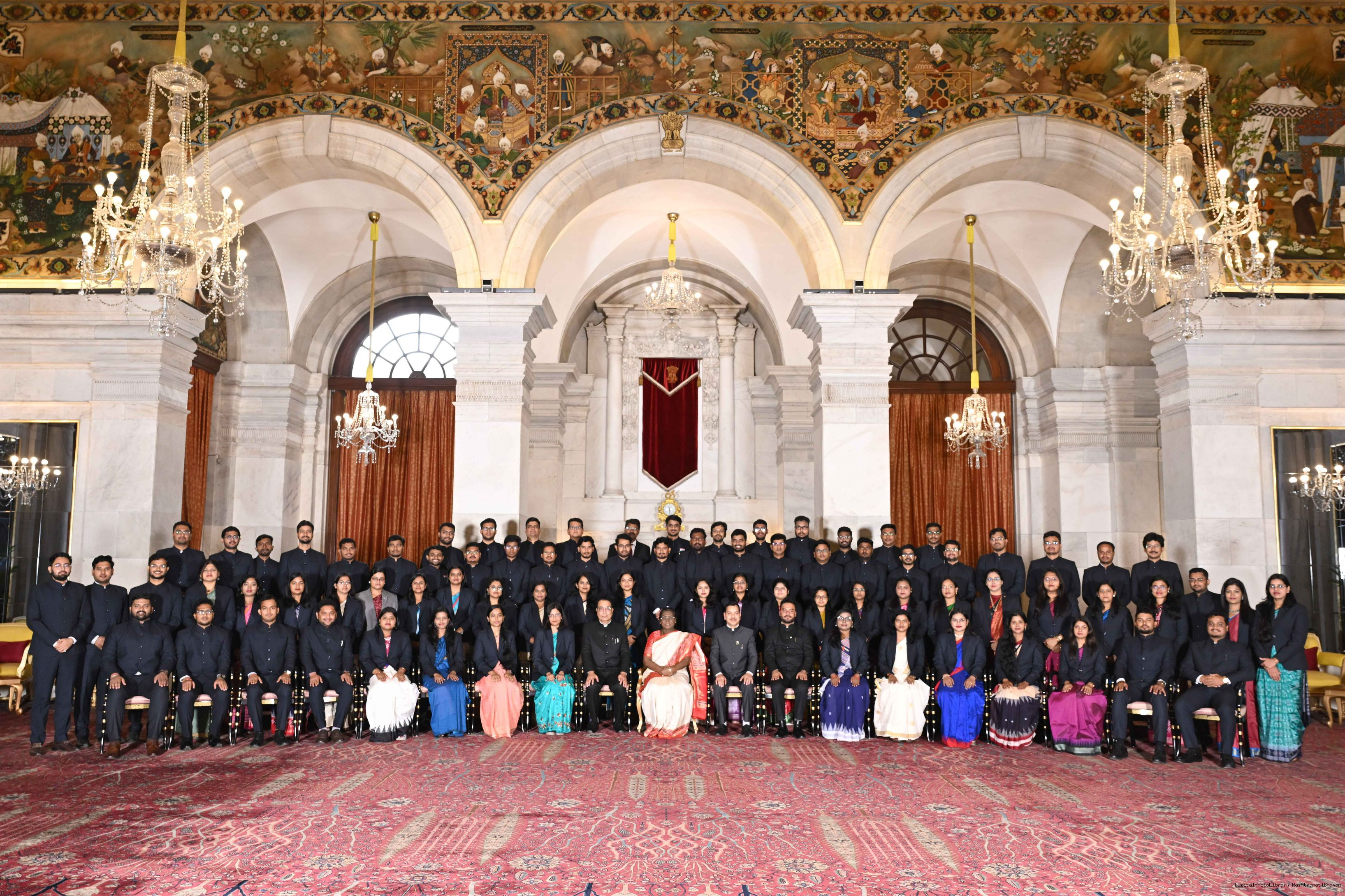| Caption: | The President of India, Smt. Droupadi Murmu posing a group photograph with 79 Odisha Administrative Service (OAS) Officers selected for 2nd One-week training at NCGG at Rashtrapati Bhavan on September 19, 2025. |