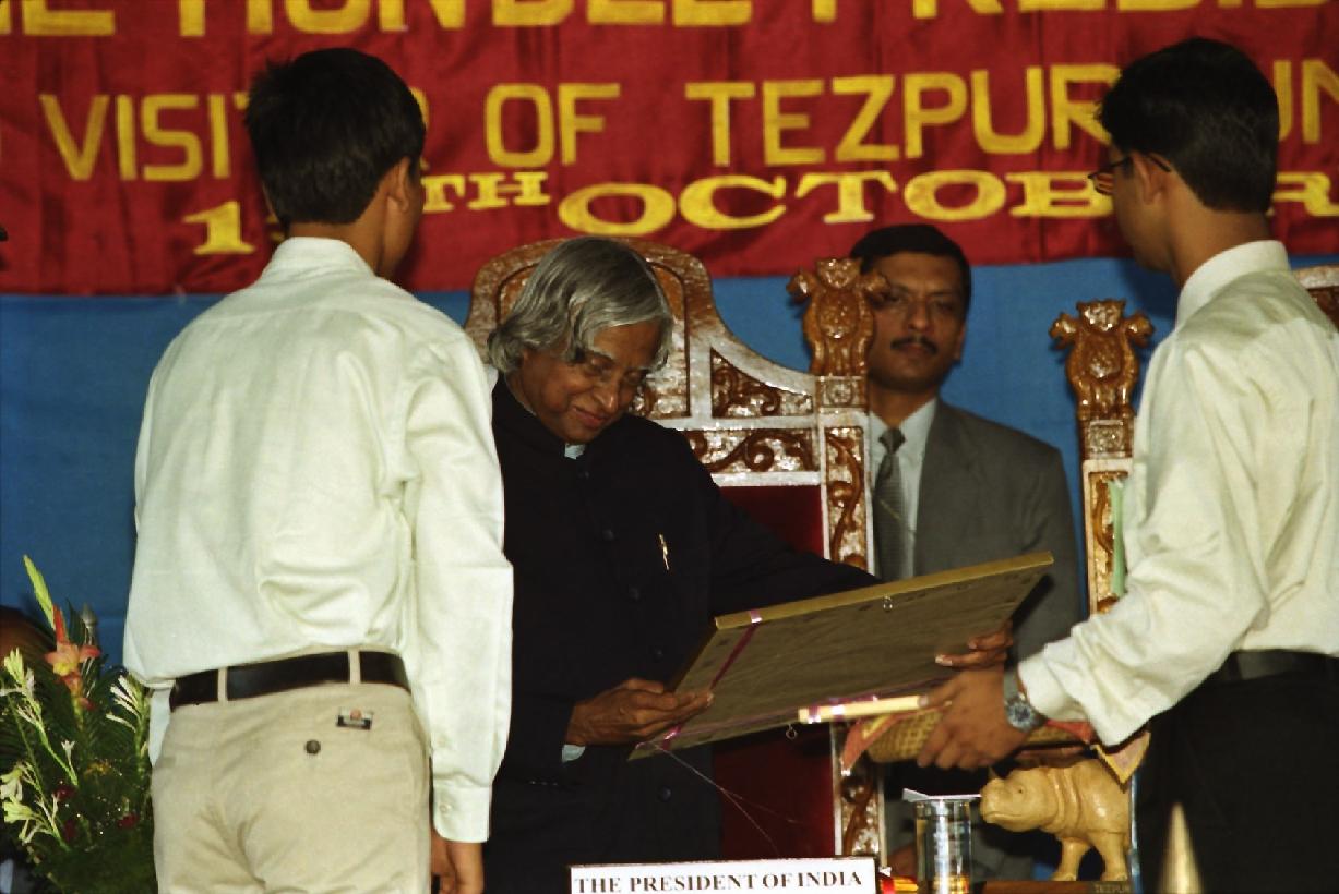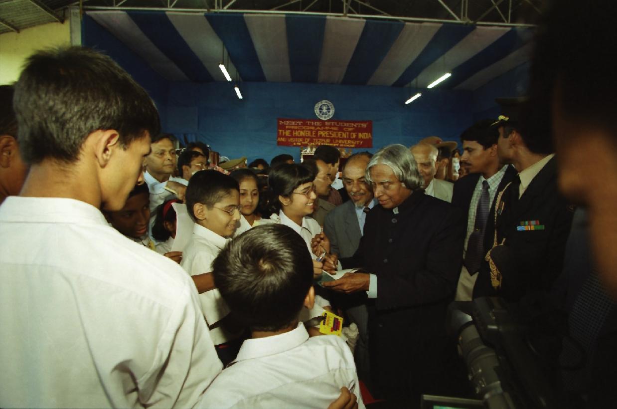 | Caption: | The President of India, Dr A P J Abdul Kalam meeting with the Students of Tezpur University at Tezpur in Arunachal Pradesh on Oct 15, 2002 |