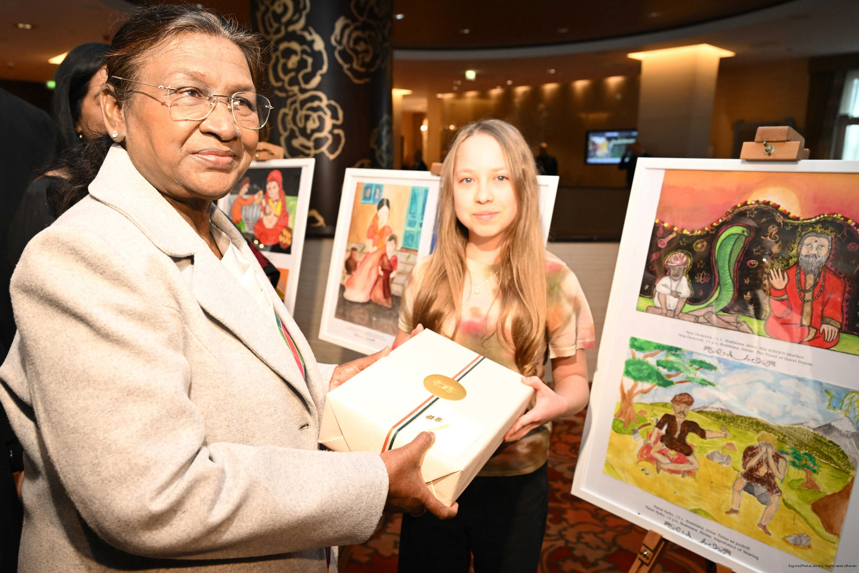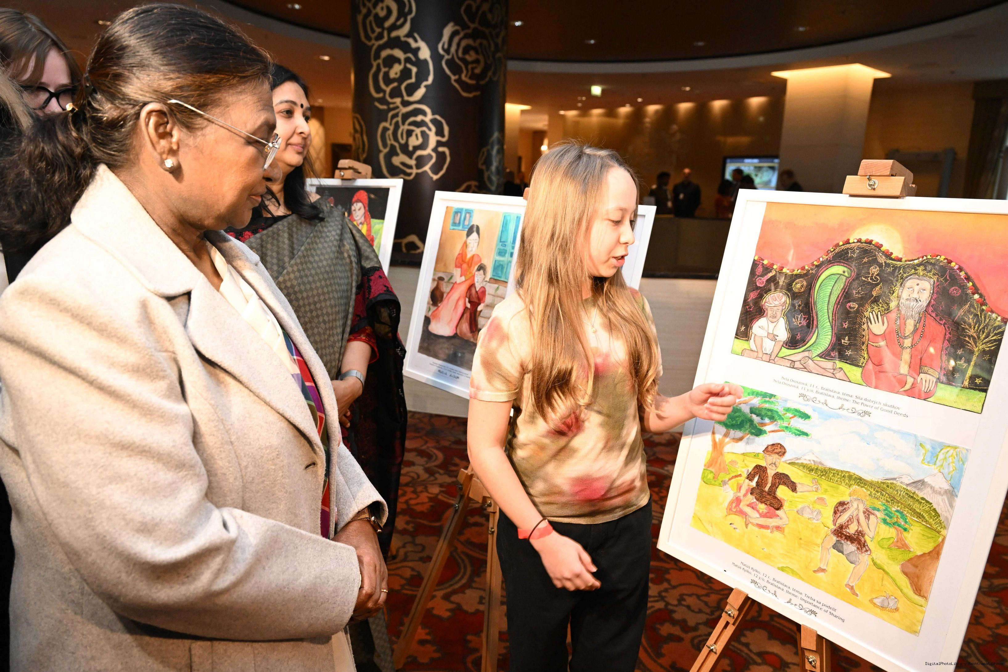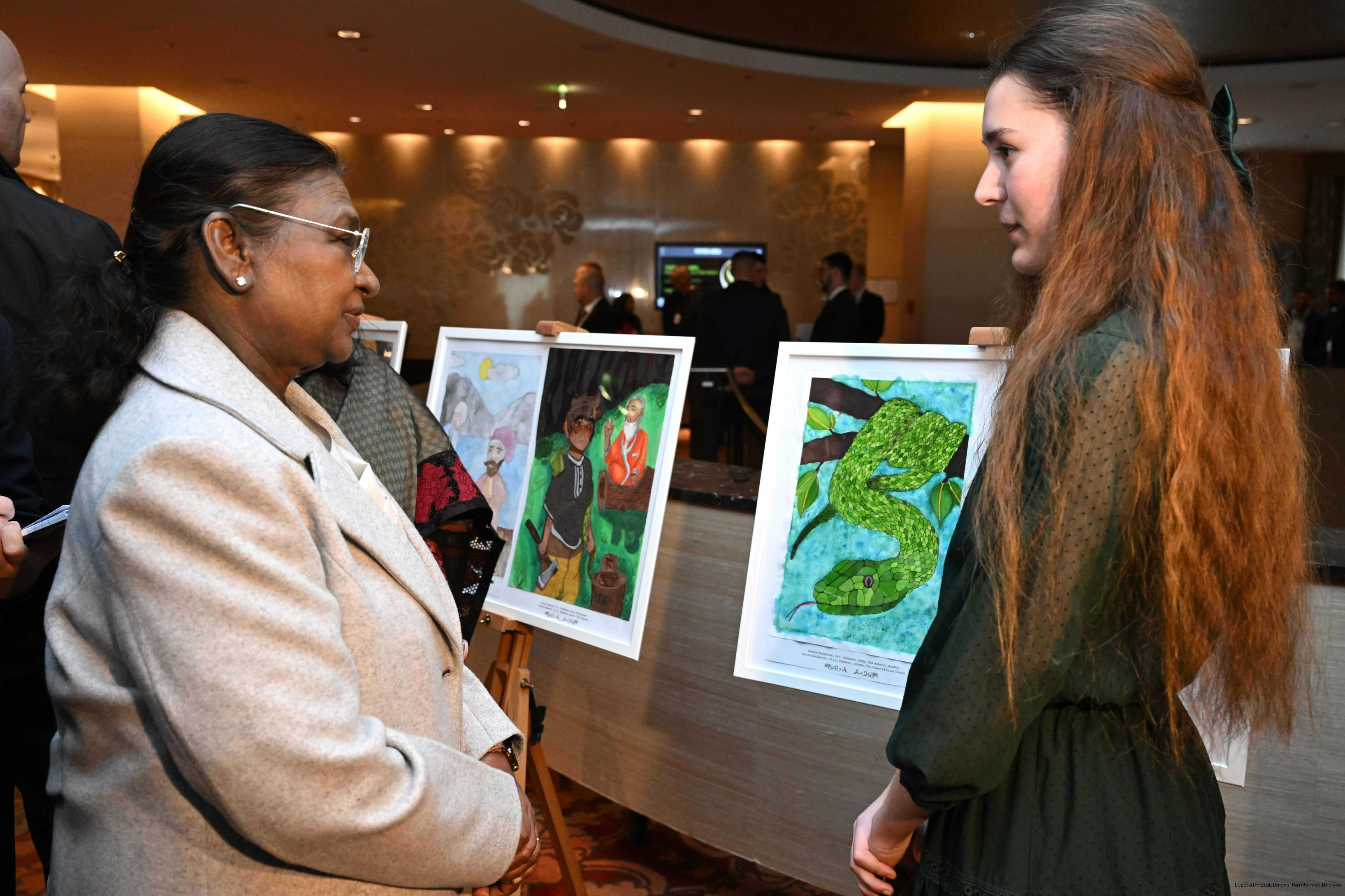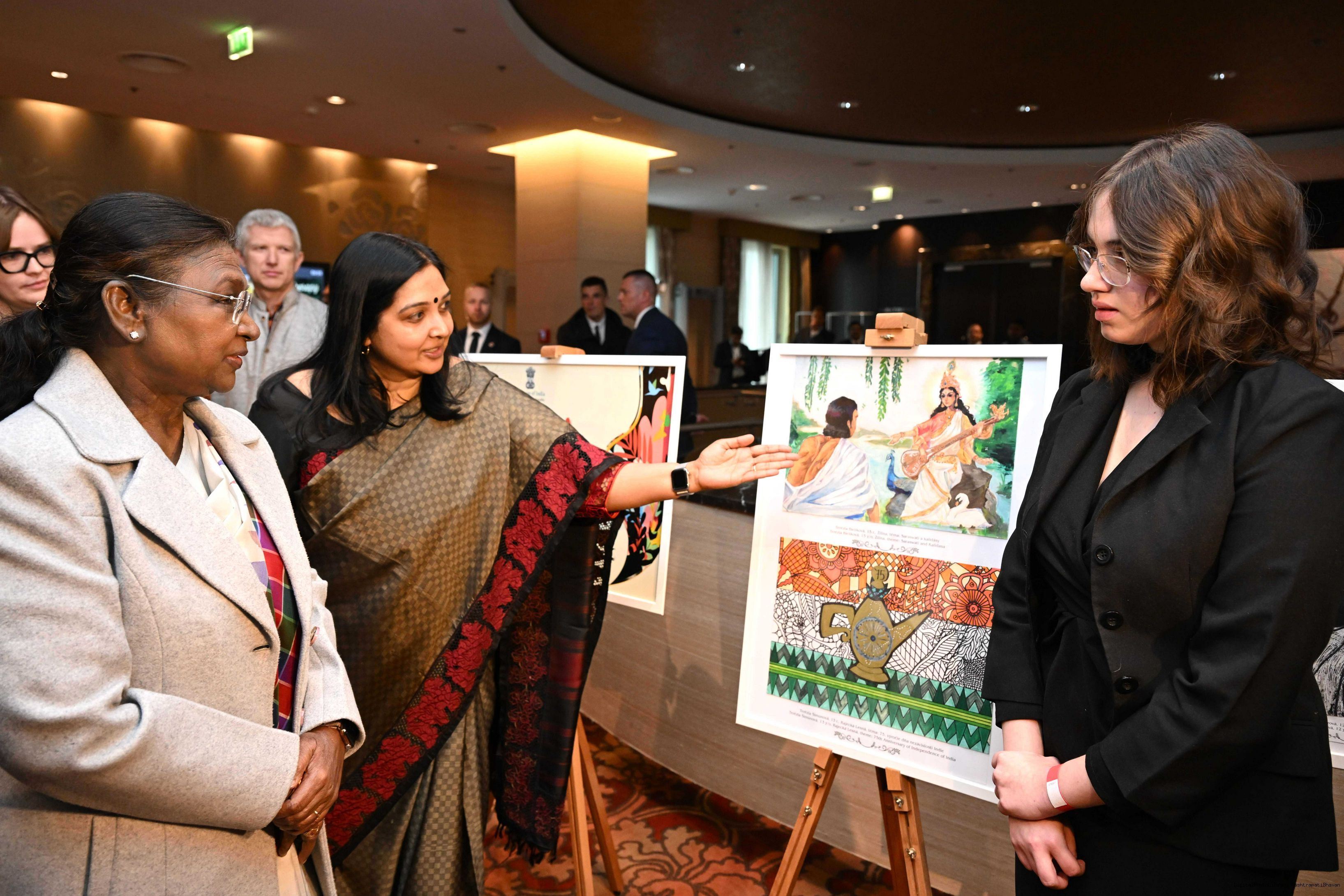 | Caption: | The President of India, Smt. Droupadi Murmu visited to the Exhibition of Painting on Indian Theme by Slovak Children at Grand Hotel River Park, Slovak on April 10, 2025. |