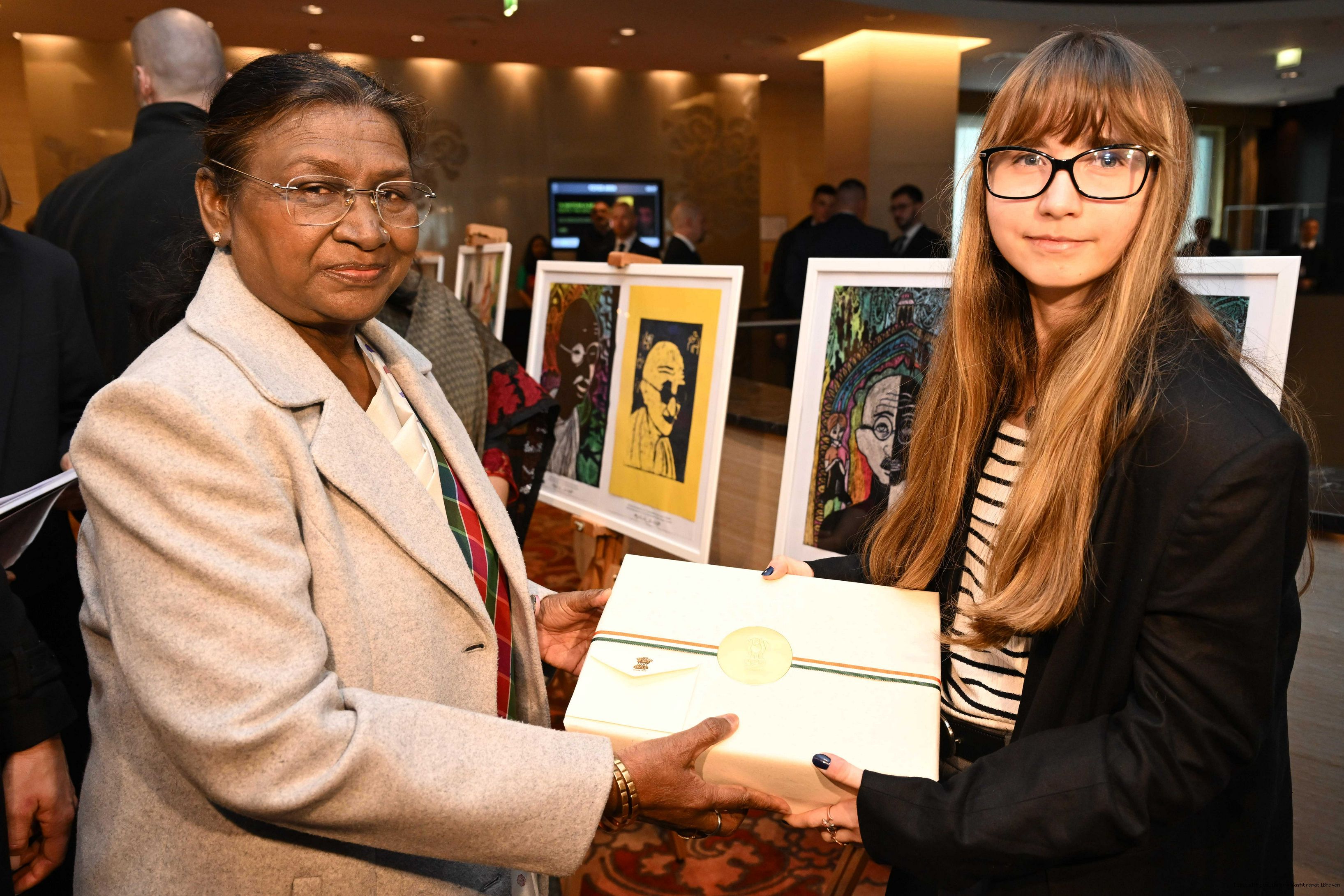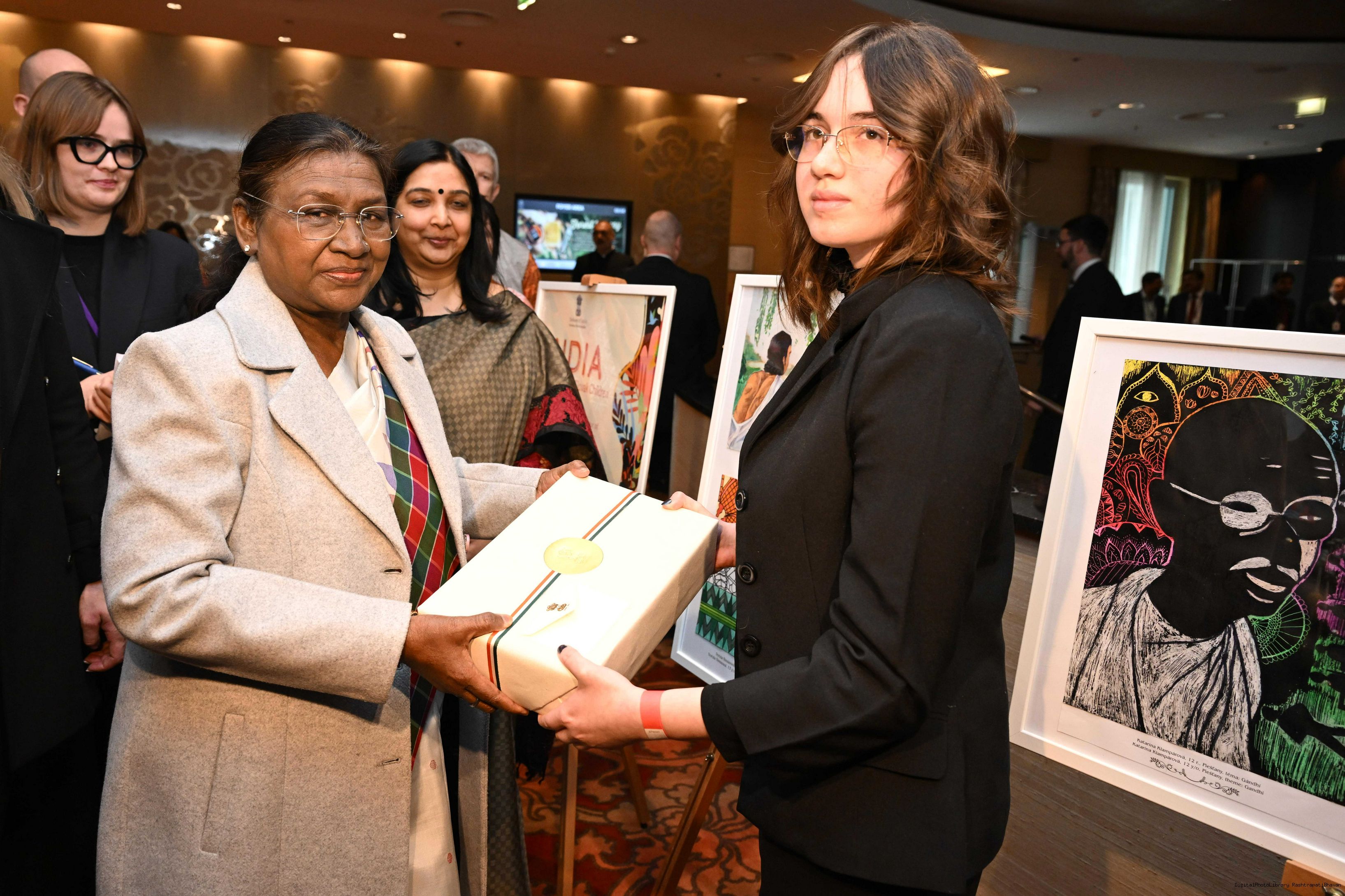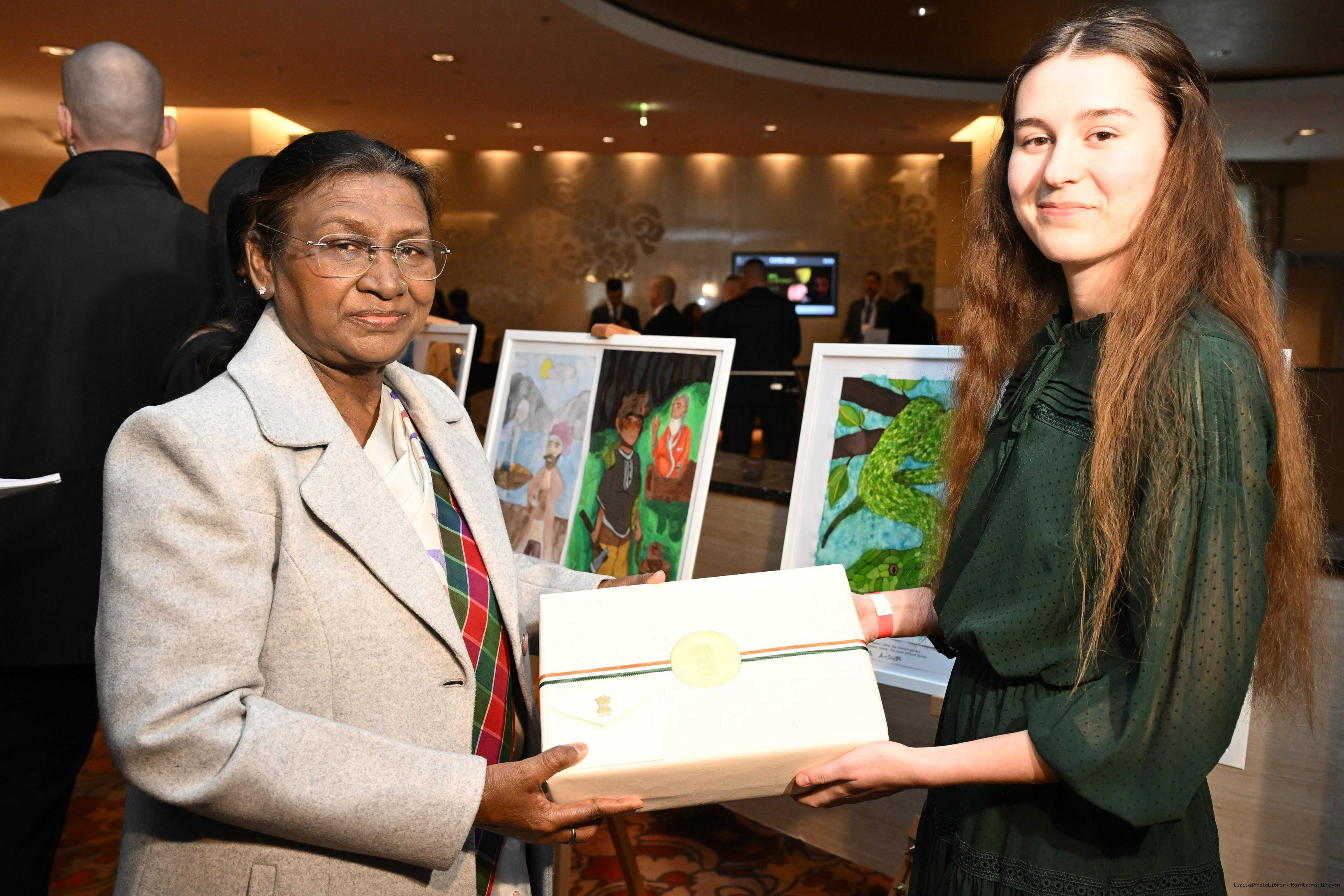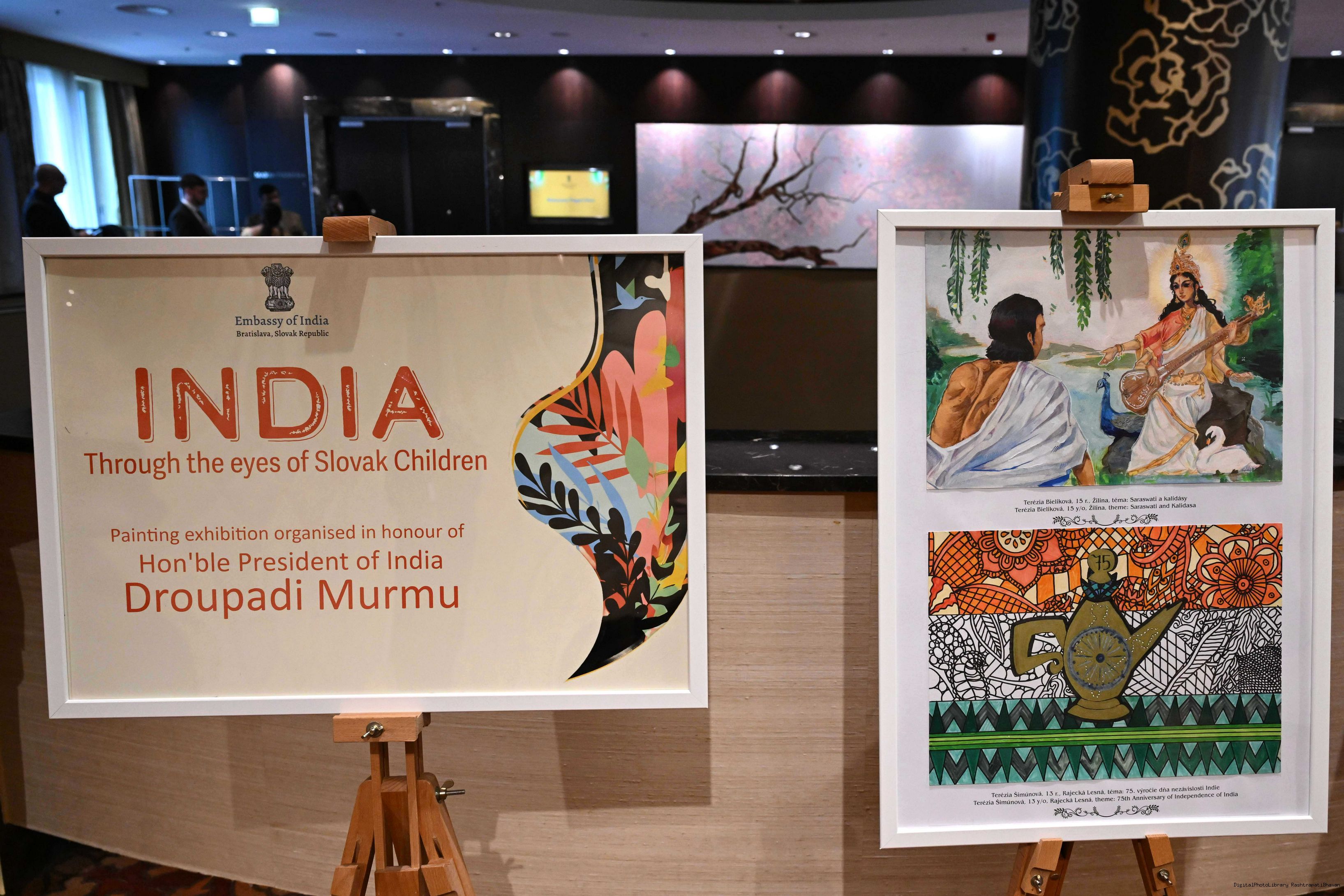 | Caption: | The President of India, Smt. Droupadi Murmu visited to the Exhibition of Painting on Indian Theme by Slovak Children at Grand Hotel River Park, Slovak on April 10, 2025. |