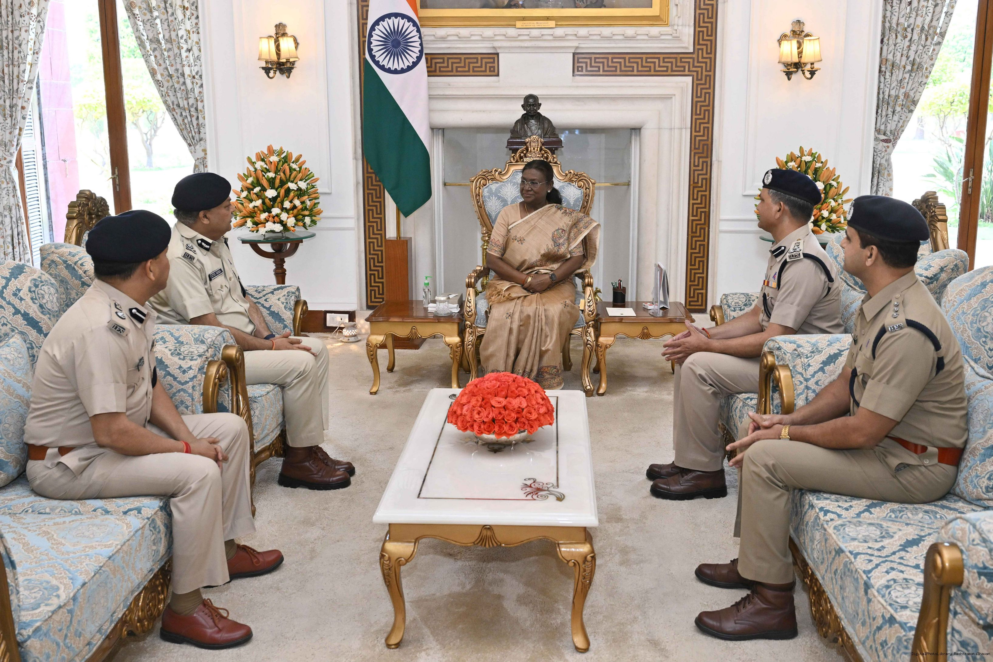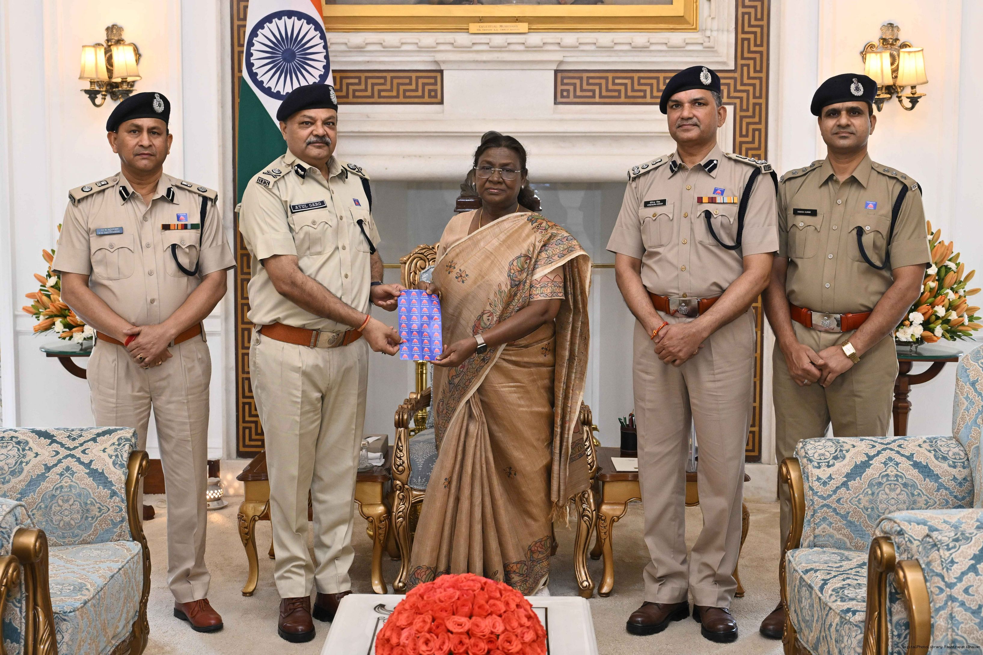 | Caption: | Shri Atul Garg, Director, Delhi Fire Service along with others meeting with the President of India, Smt. Droupadi Murmu at Rashtrapati Bhavan on April 17, 2025. |