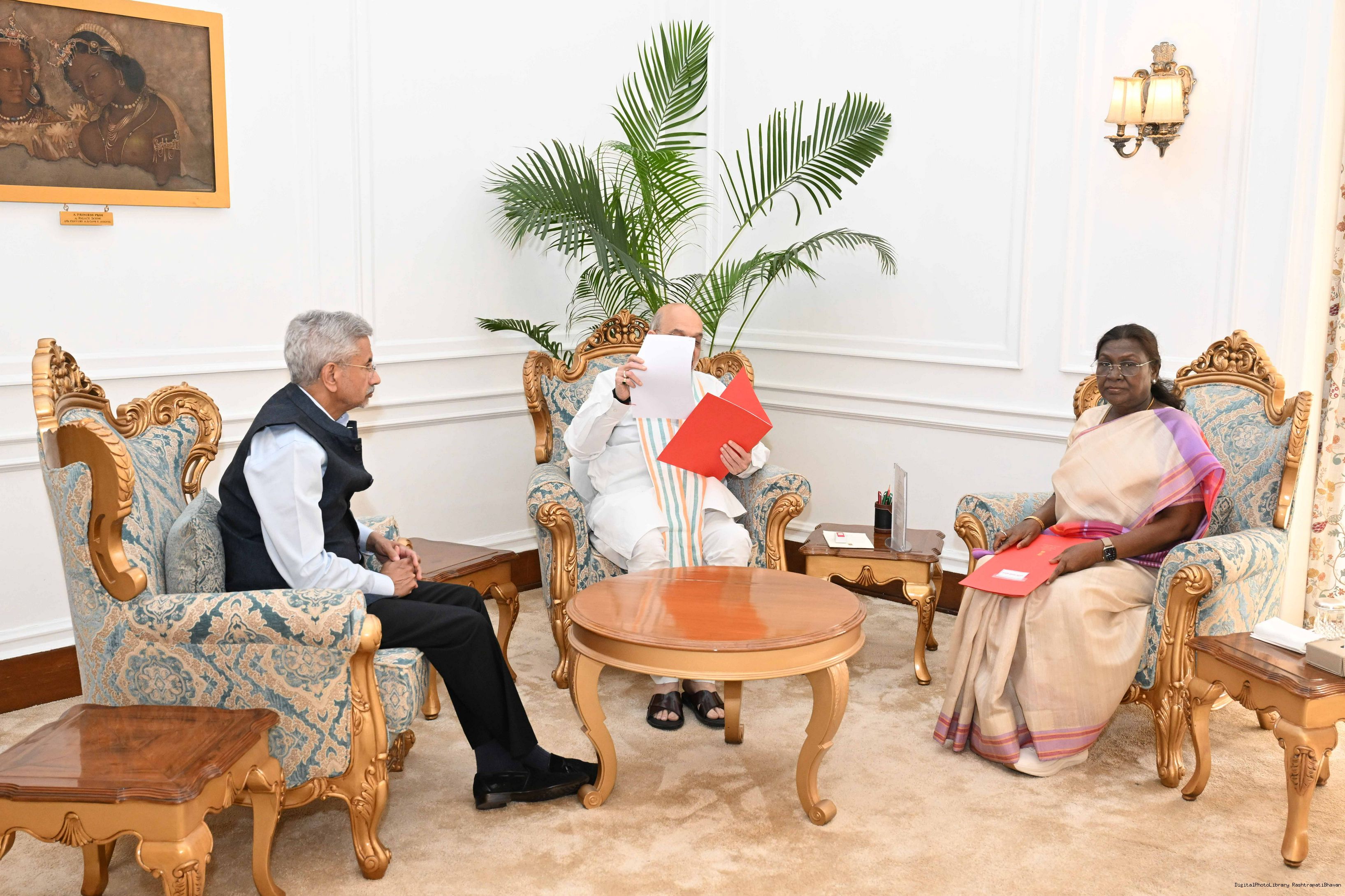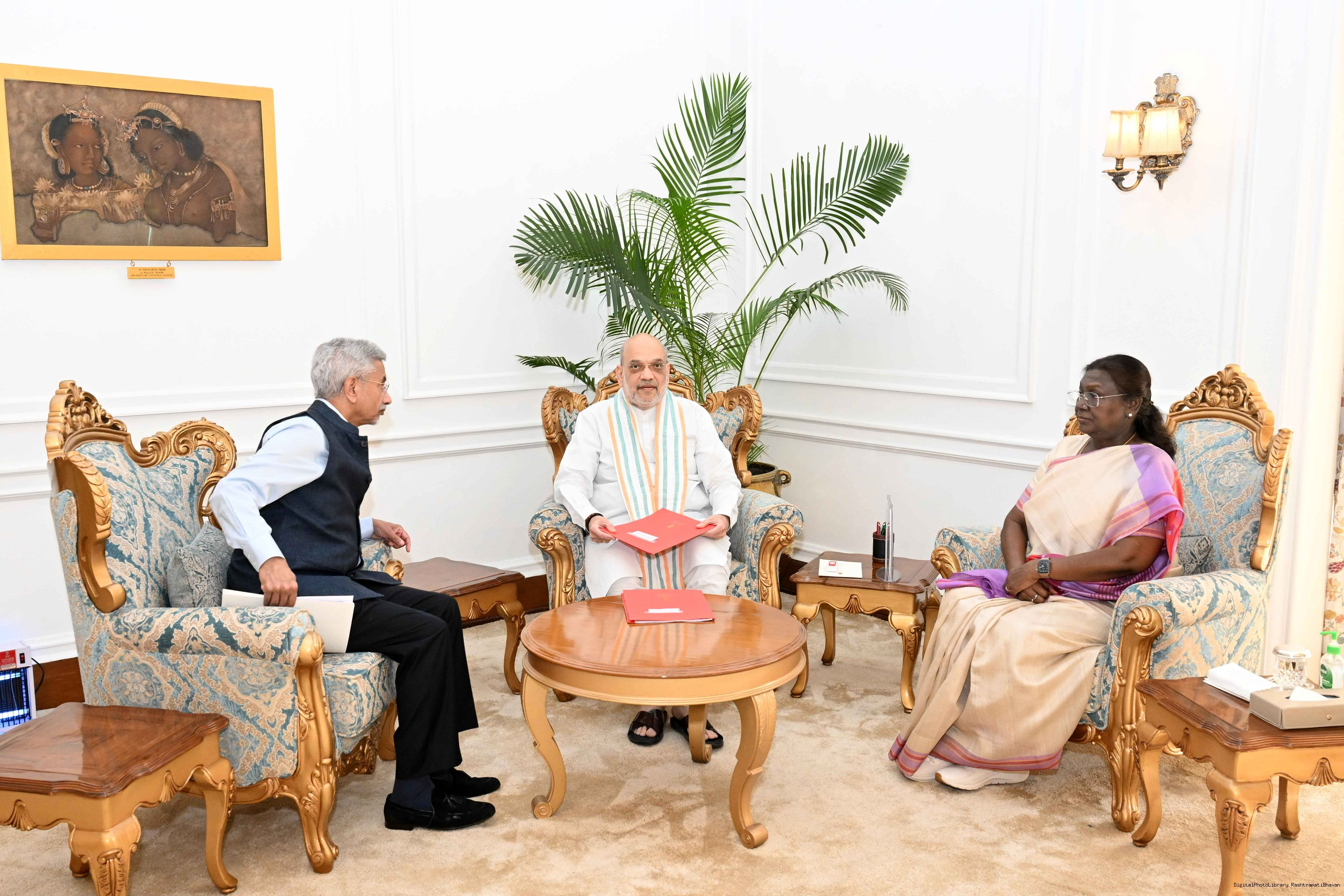 | Caption: | The Union Minister for Home Affairs and Cooperation, Shri Amit Shah and Minister of External Affairs, Dr S Jaishankar called on the President of India, Smt. Droupadi Murmu at Rashtrapati Bhavan on April 24, 2025. |