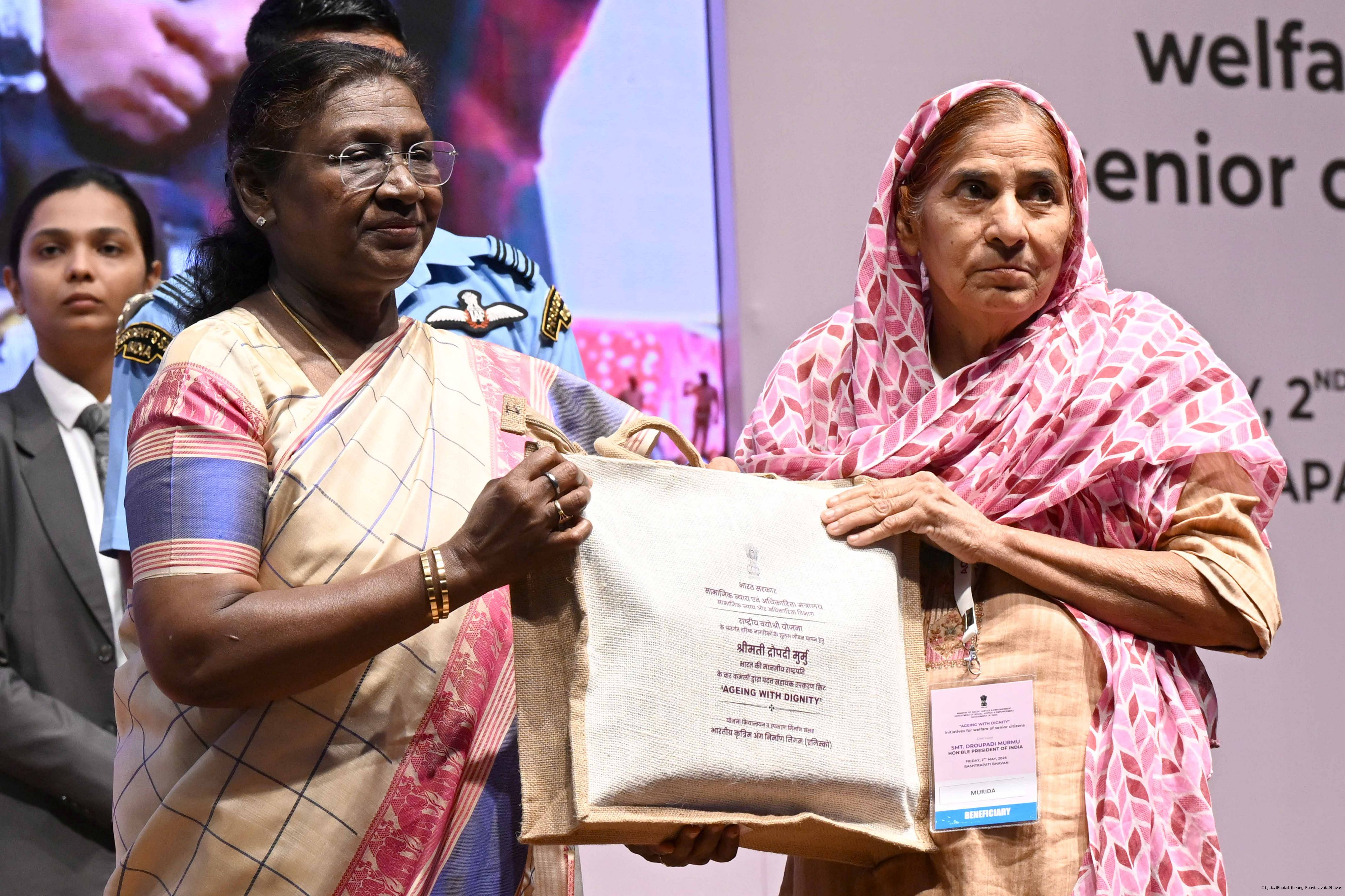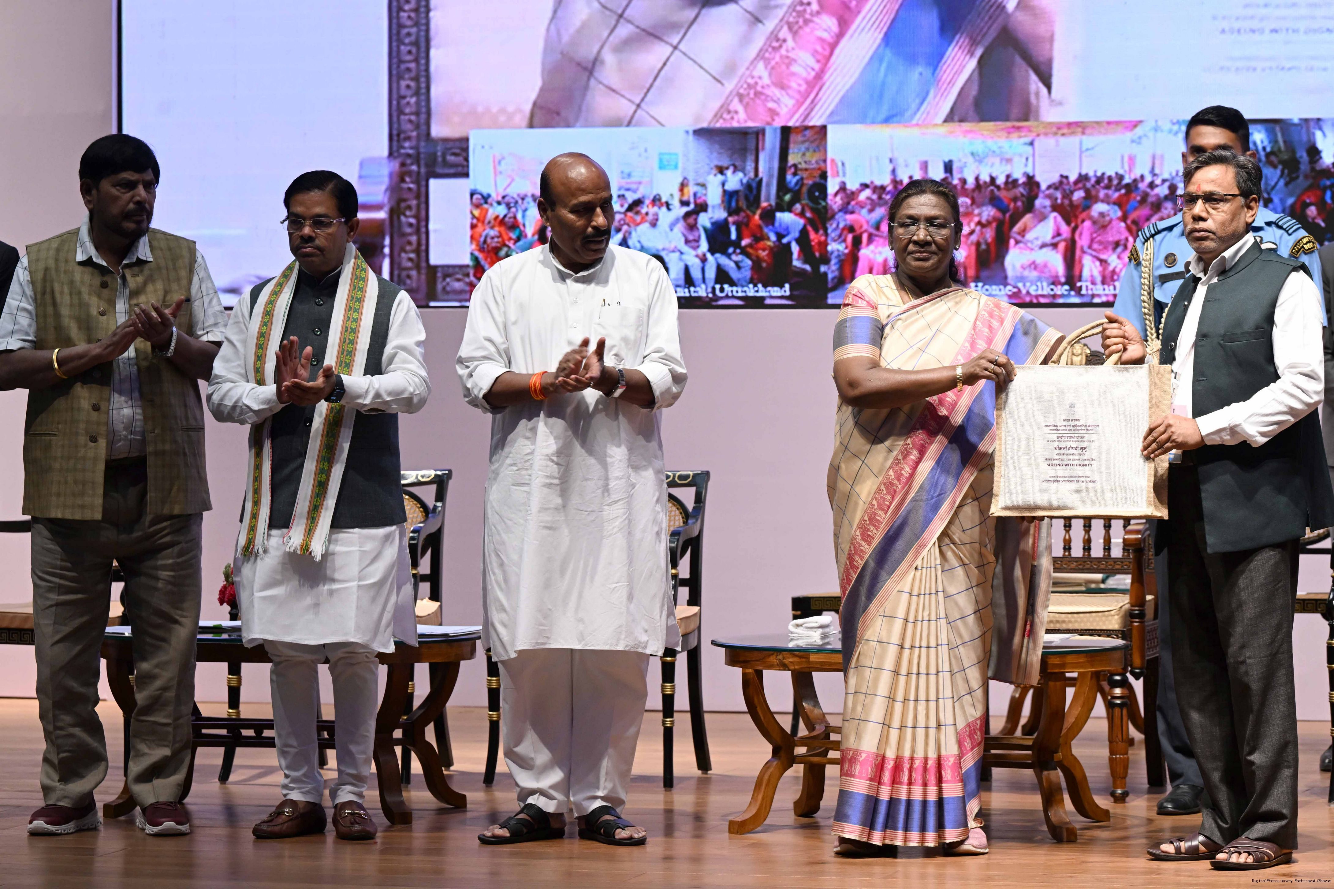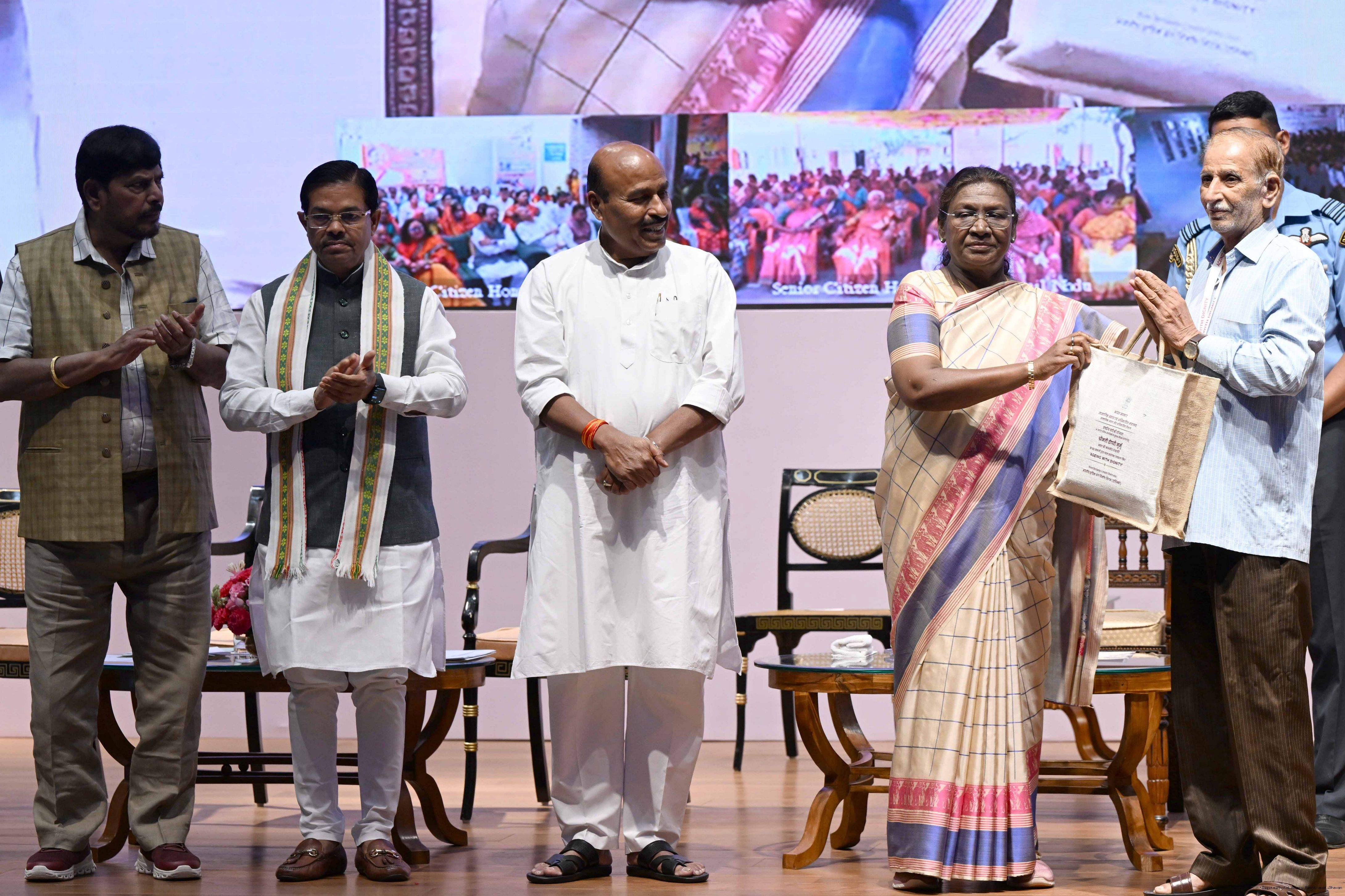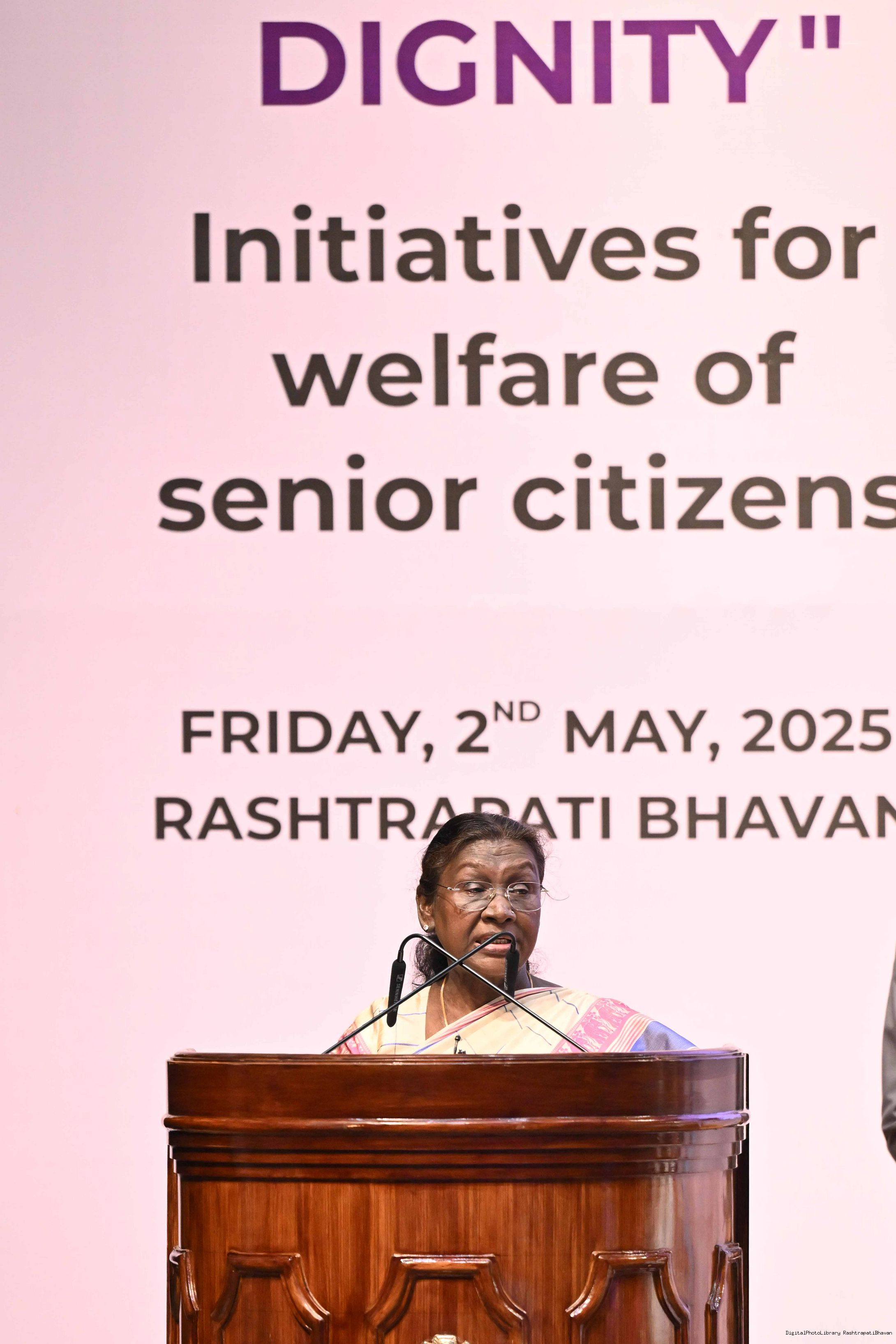 | Caption: | The President of India, Smt Droupadi Murmu graced an event ‘Ageing with Dignity’ - initiatives for the welfare of senior citizens at Rashtrapati Bhavan Cultural Centre on May 2, 2025. |