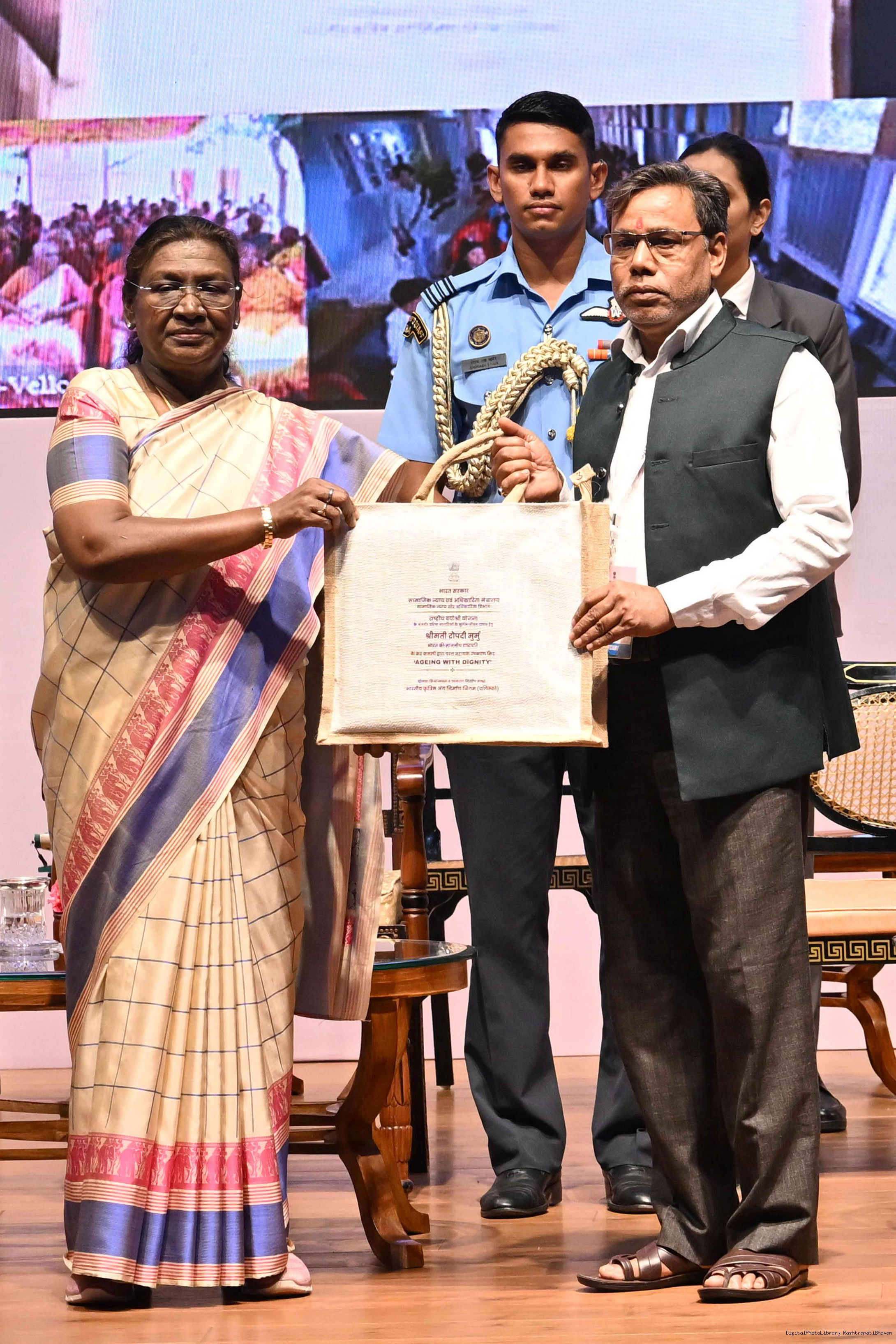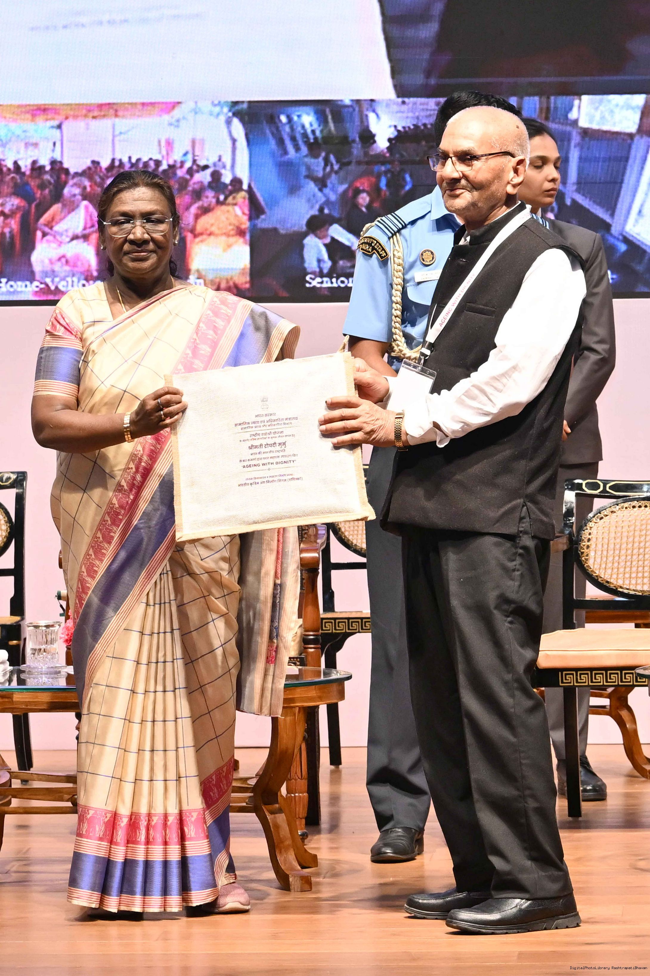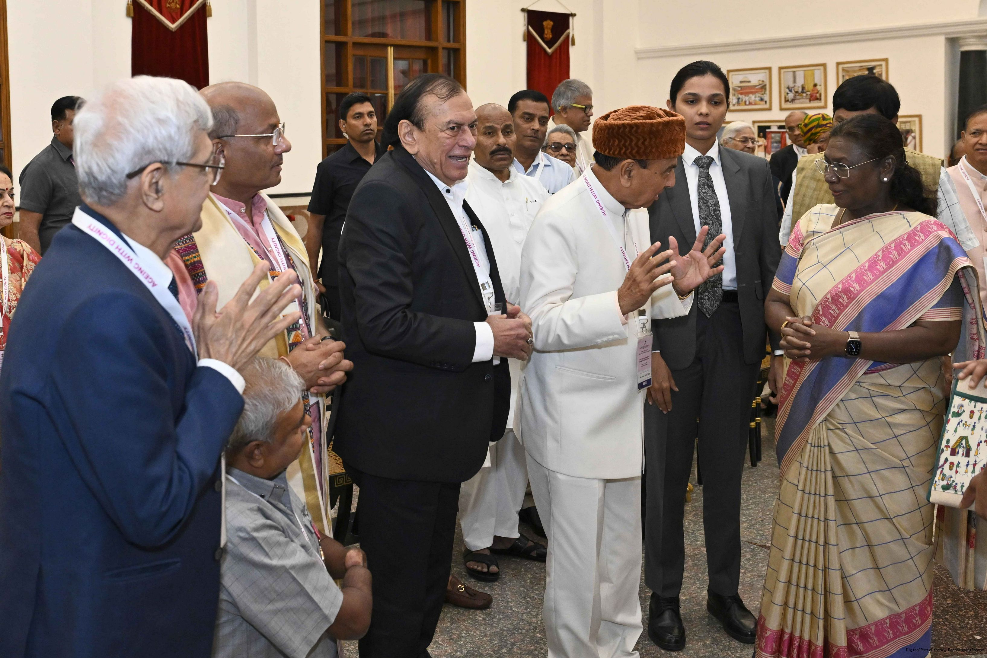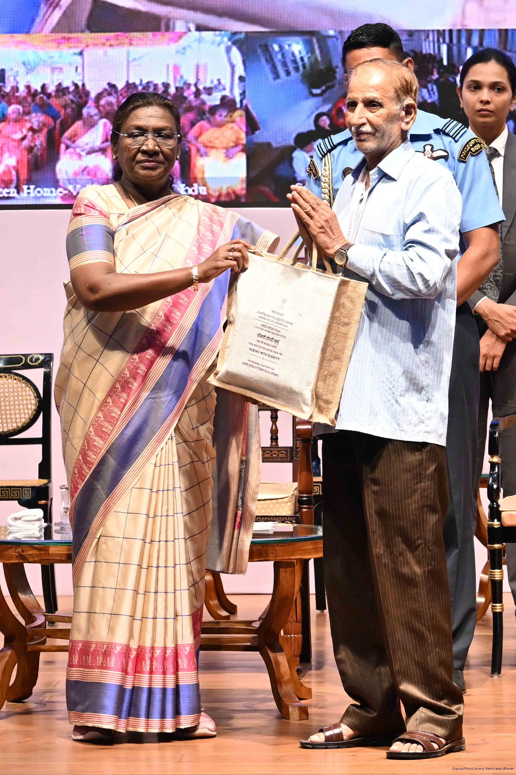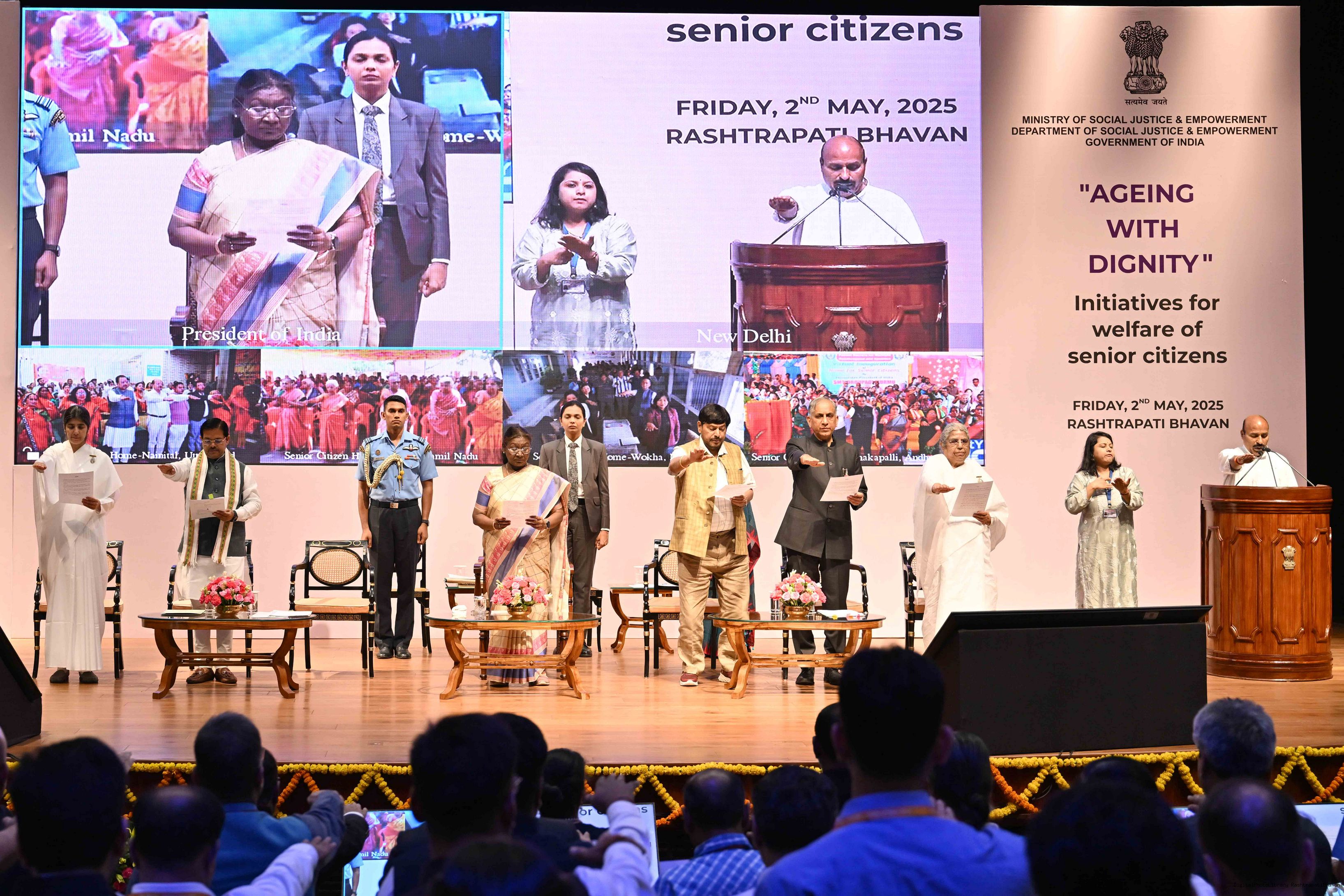 | Caption: | The President of India, Smt Droupadi Murmu graced an event ‘Ageing with Dignity’ - initiatives for the welfare of senior citizens at Rashtrapati Bhavan Cultural Centre on May 2, 2025. |