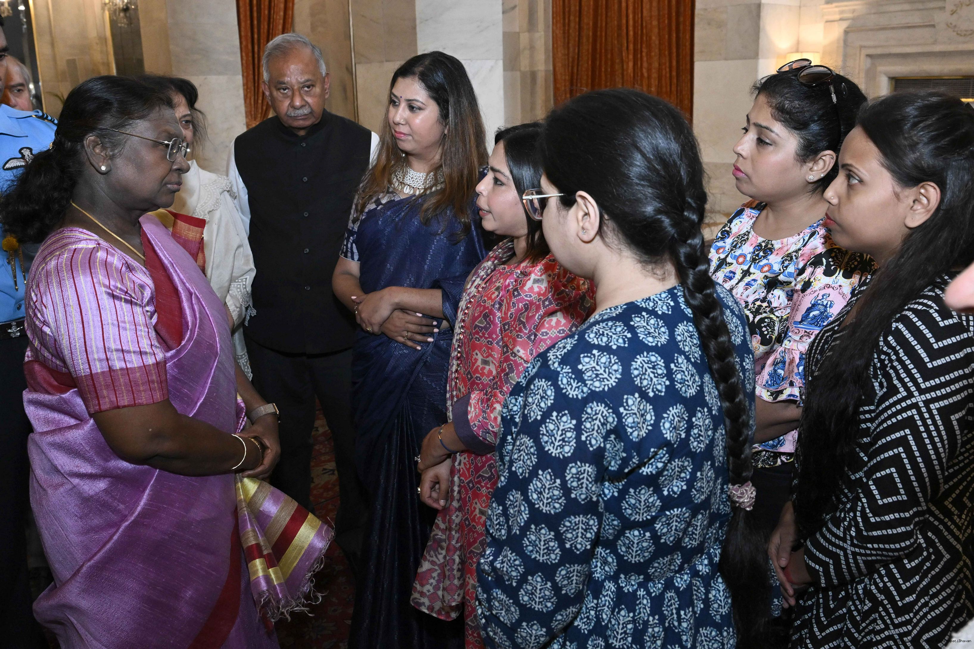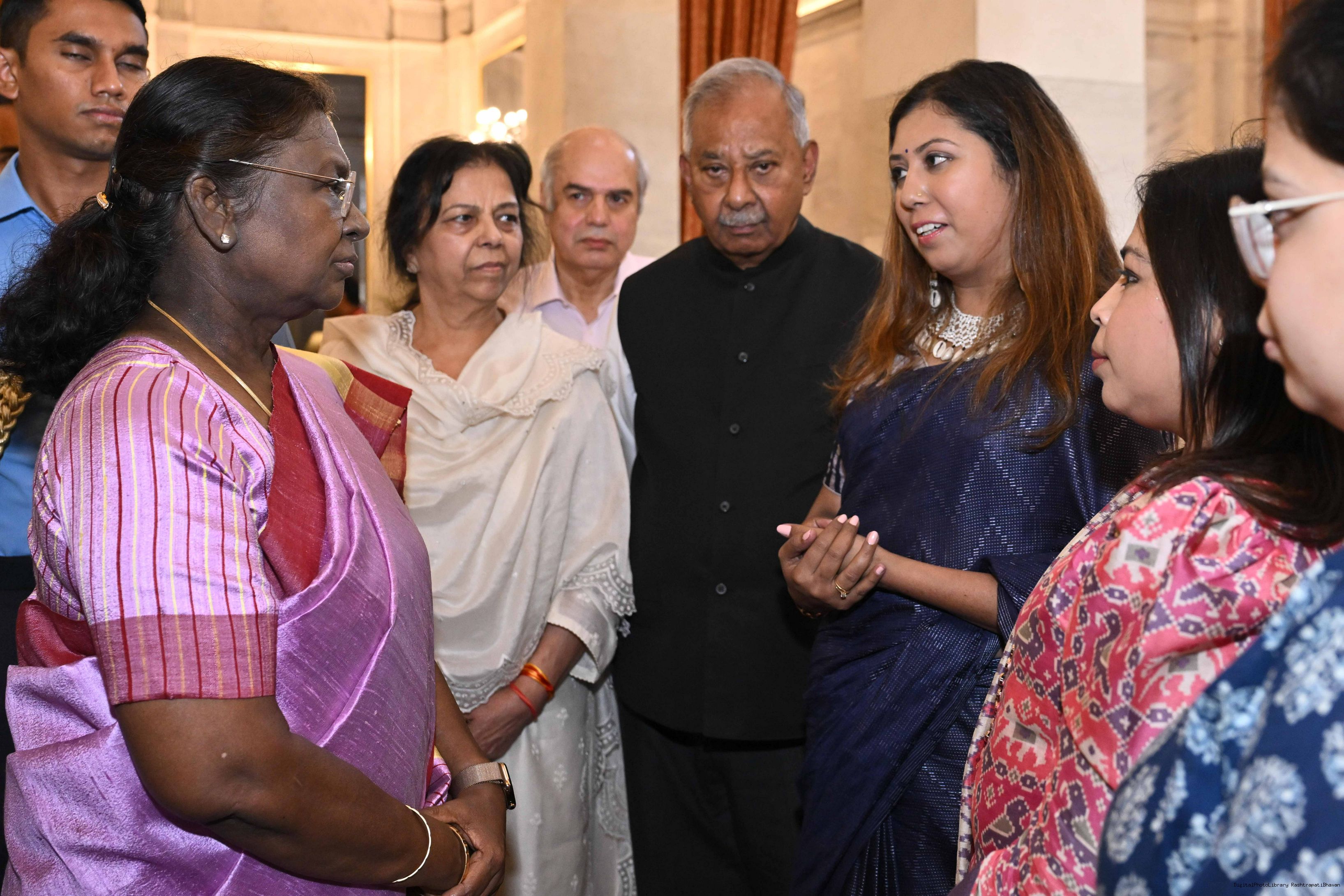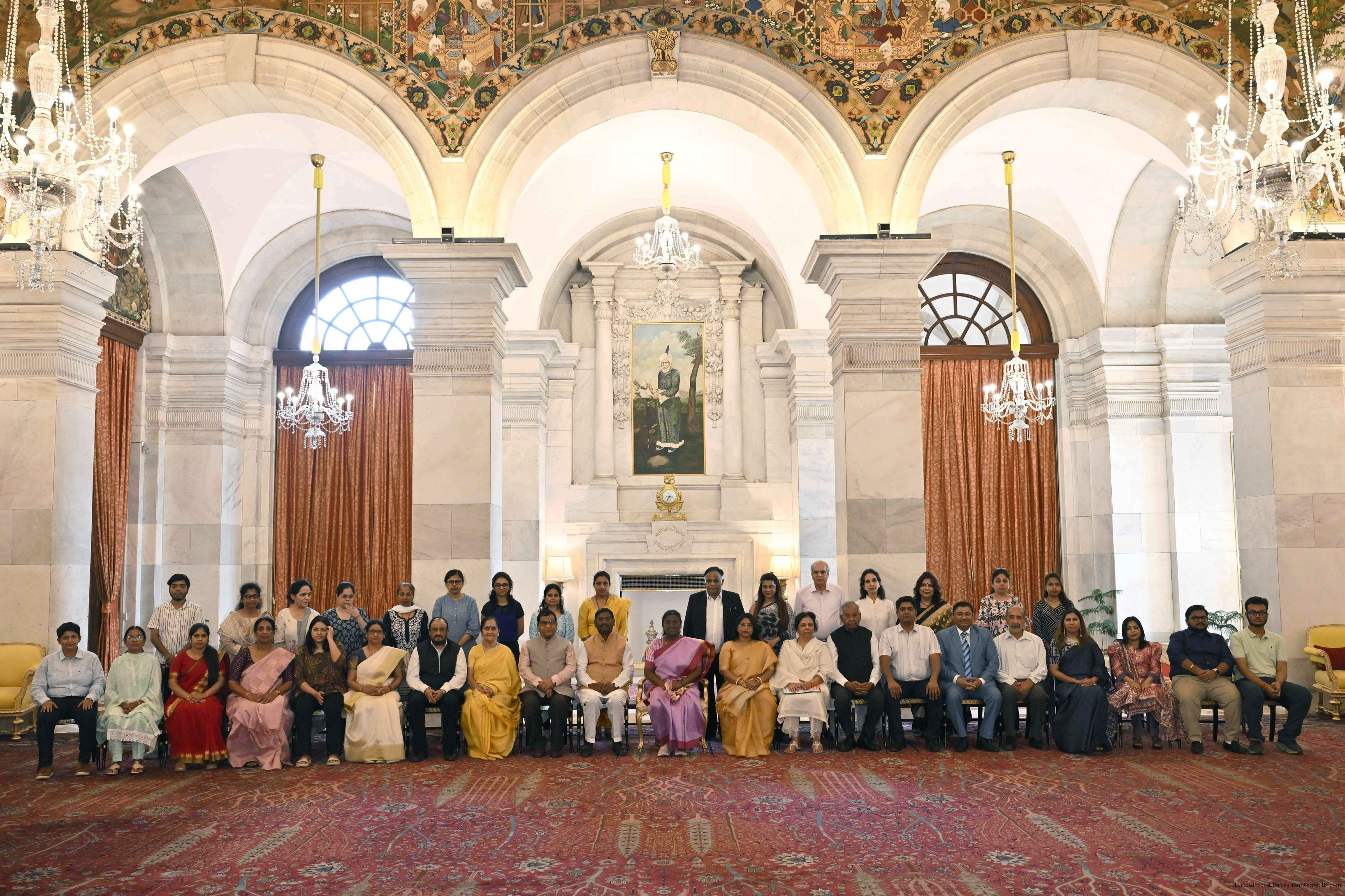 | Caption: | The President of India, Smt. Droupadi Murmu posing a Group Photograph with brief interaction with Thalassemia patients accompanied by parents along with officials and doctors at Rashtrapati Bhavan on May 8, 2025. |