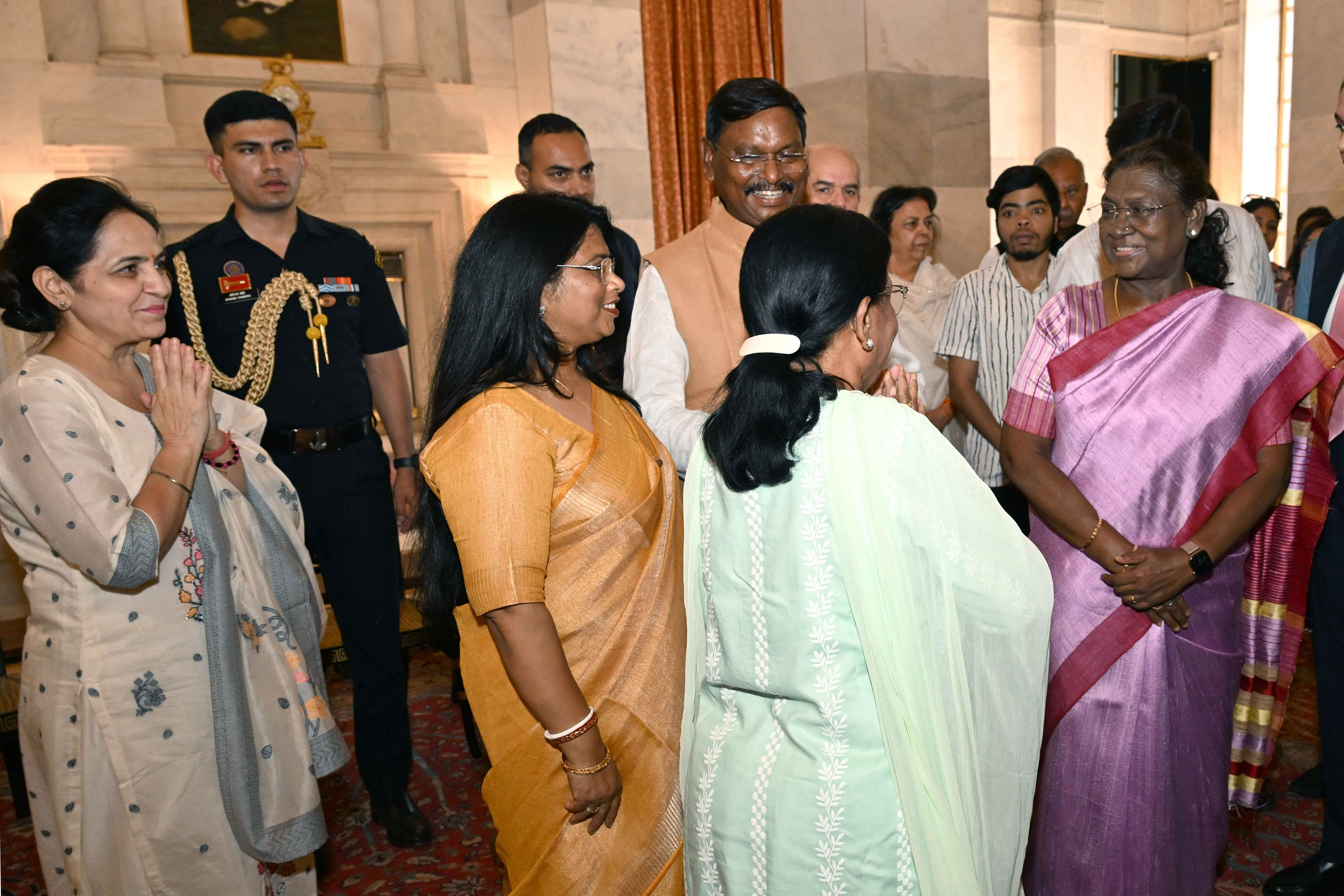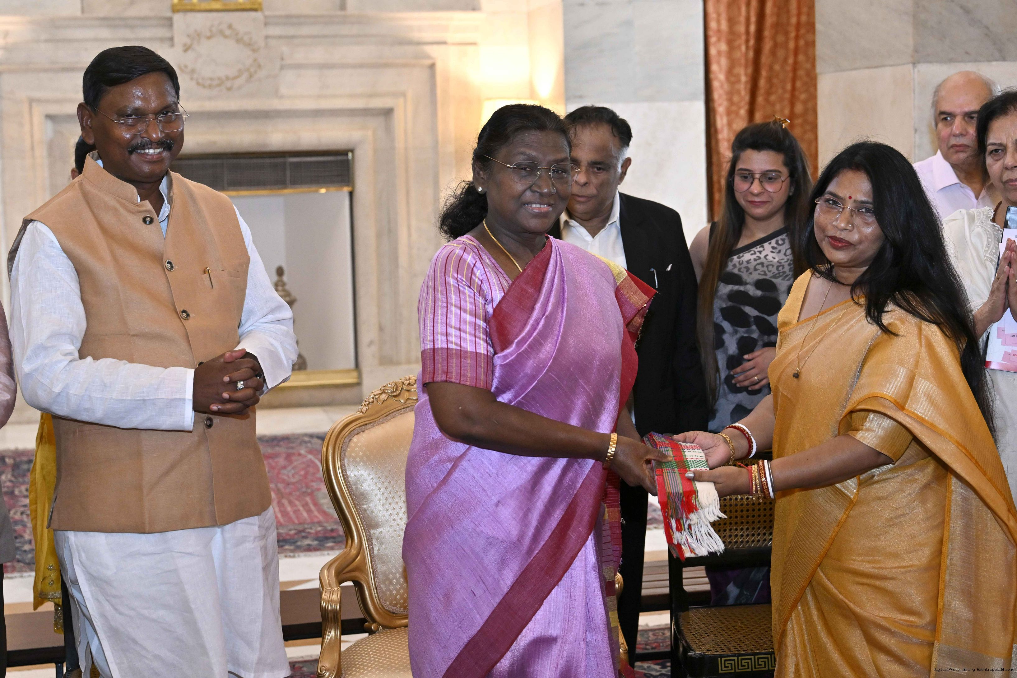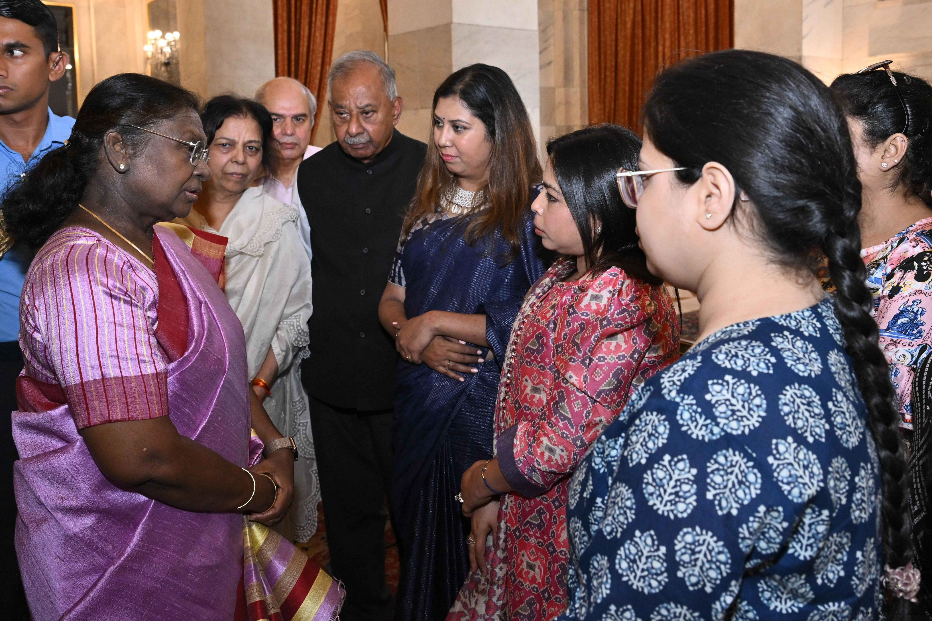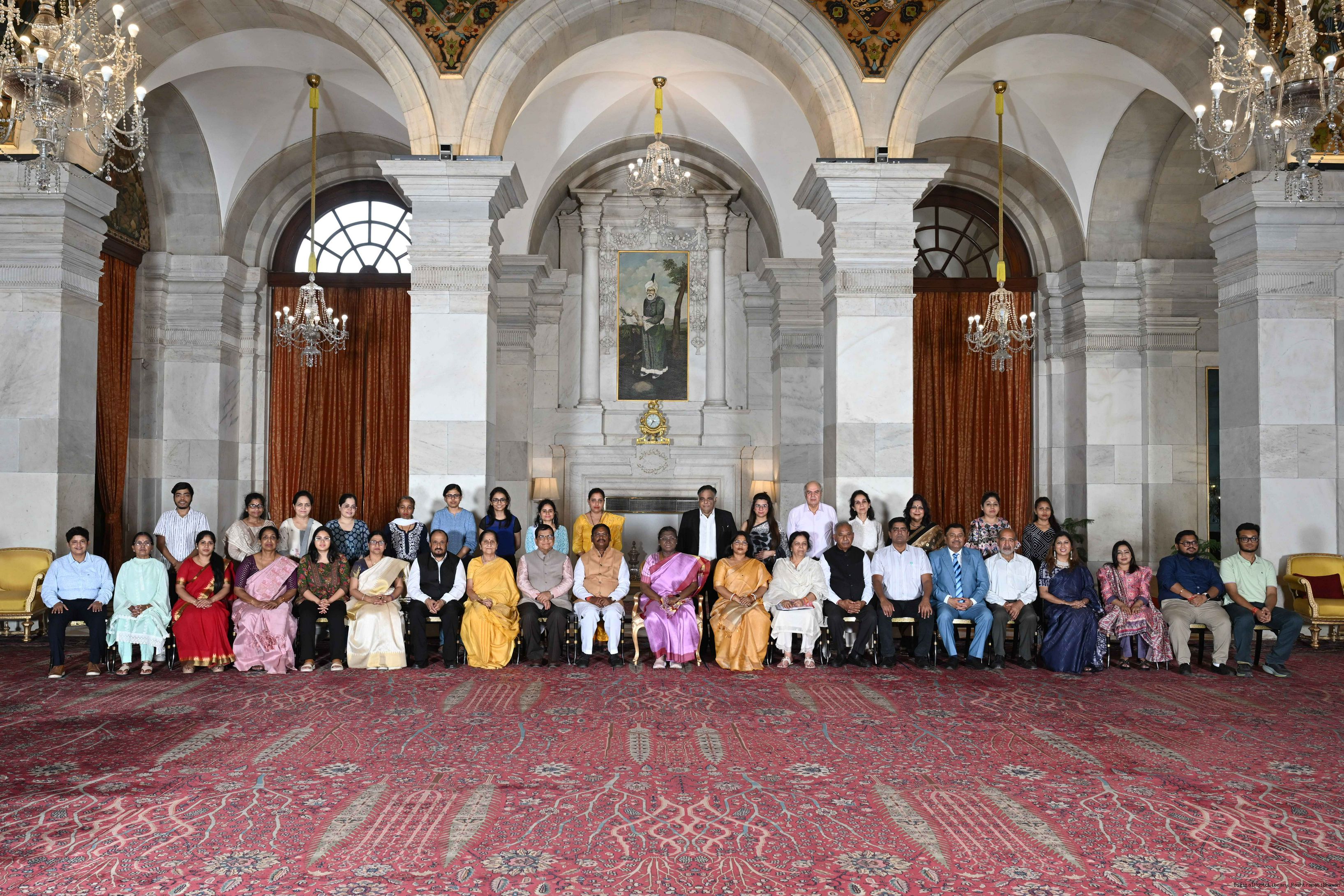 | Caption: | The President of India, Smt. Droupadi Murmu posing a Group Photograph with brief interaction with Thalassemia patients accompanied by parents along with officials and doctors at Rashtrapati Bhavan on May 8, 2025. |