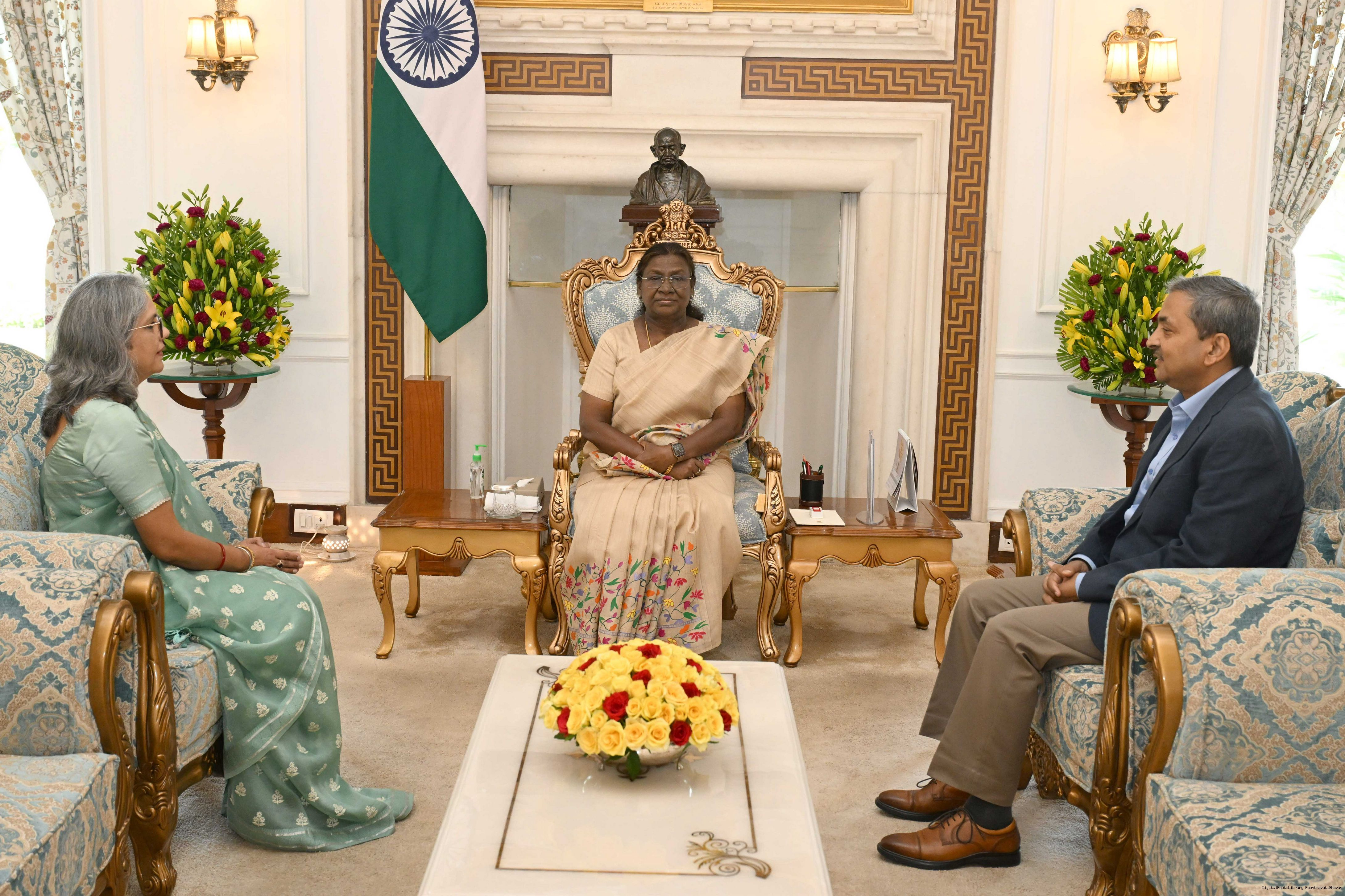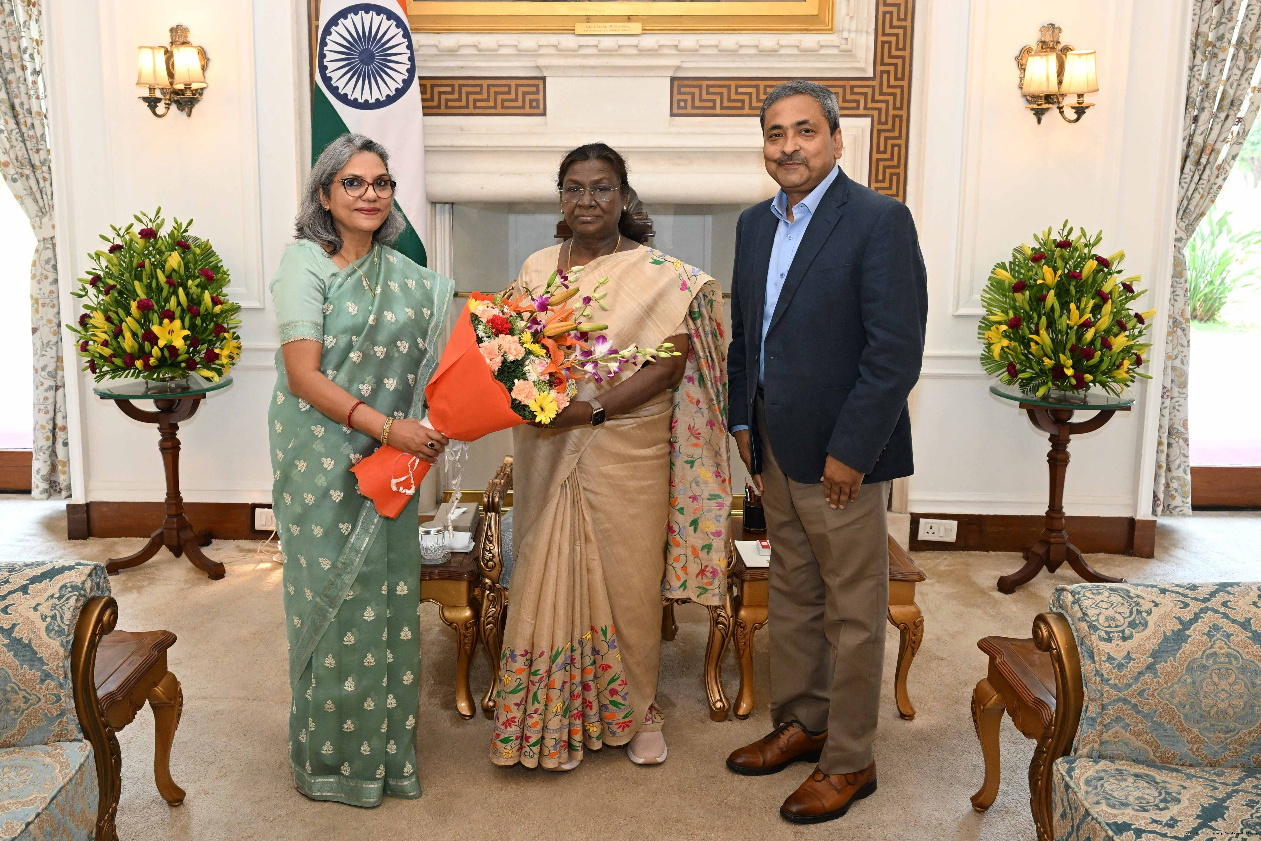 | Caption: | Ms. Anuradha Prasad, Member, Union Public Service Commission along with spouse Shri Sanjay Kumar meeting with the President of India, Smt. Droupadi Murmu at Rashtrapati Bhavan on May 9, 2025. |