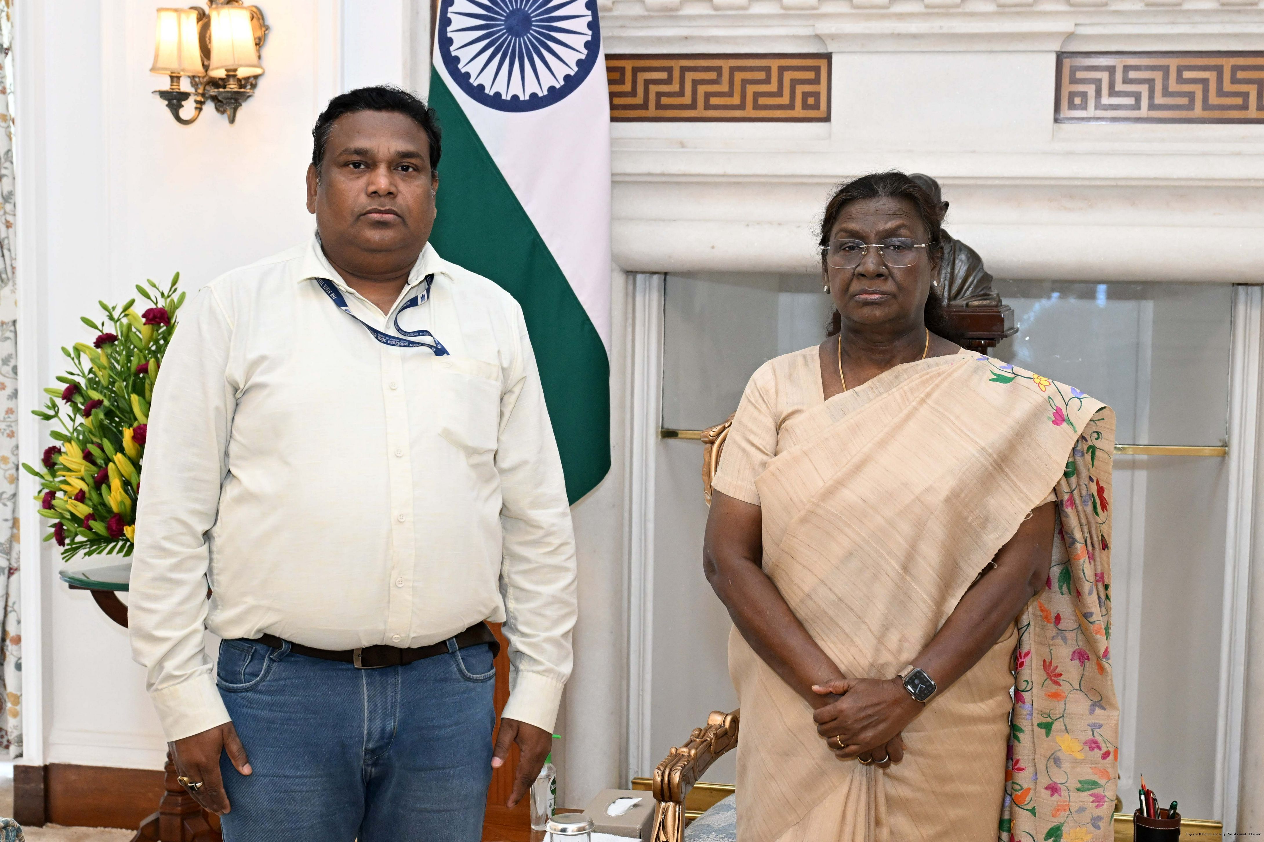 | Caption: | Shri Mahendra Nath Tudu from Kulaibera, Mayurbhanj, Odisha meeting with the President of India, Smt. Droupadi Murmu at Rashtrapati Bhavan on May 9, 2025. |