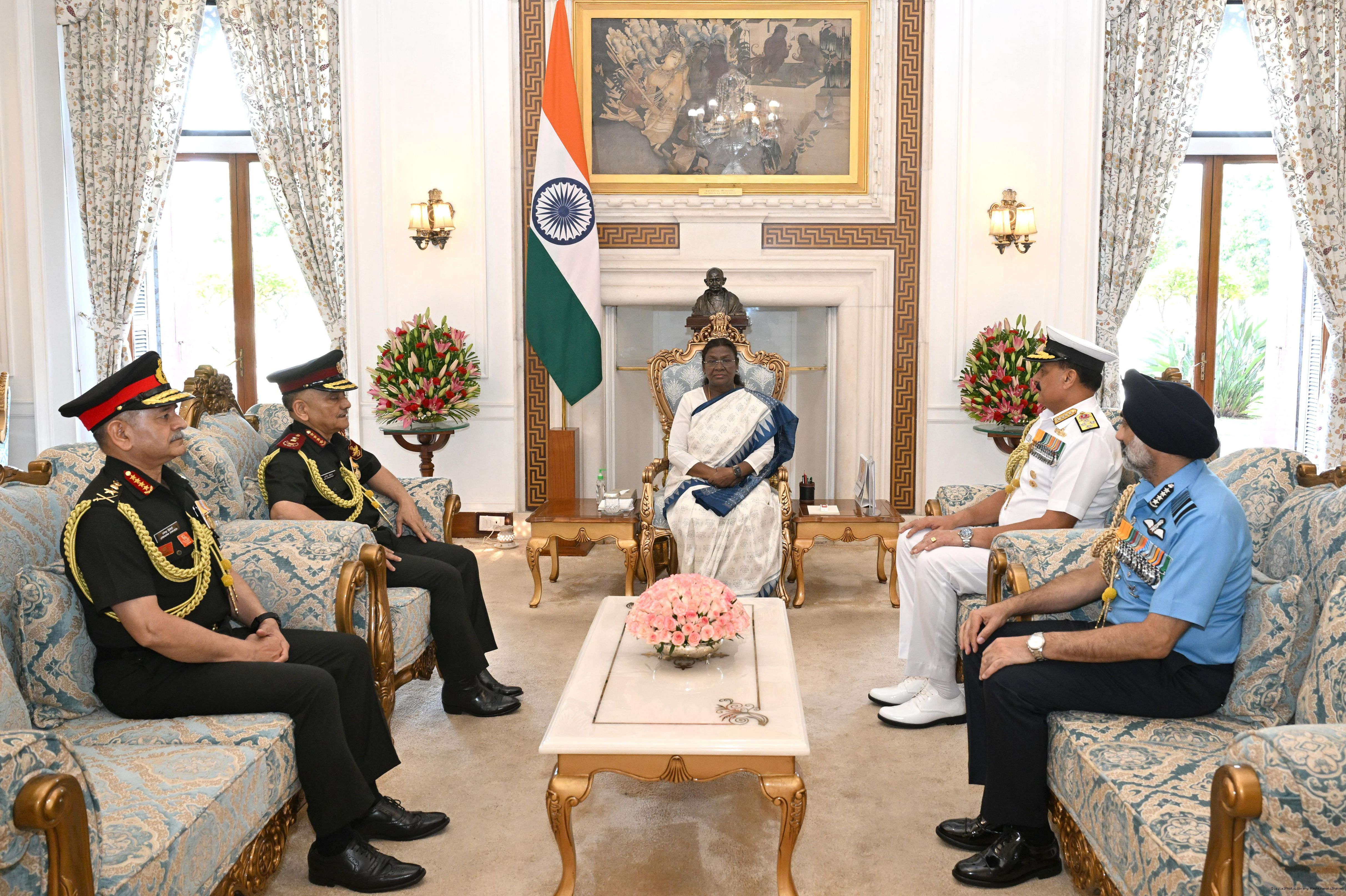 | Caption: | General Anil Chauhan, Chief of Defence Staff along with General Upendra Dwivedi, Chief of the Army Staff, Air Chief Marshal A. P. Singh, Chief of the Air Staff, and Admiral Dinesh K. Tripathi, Chief of the Naval Staff, called on the President of India, Smt. Droupadi Murmu at Rashtrapati Bhavan on May 14, 2025. |