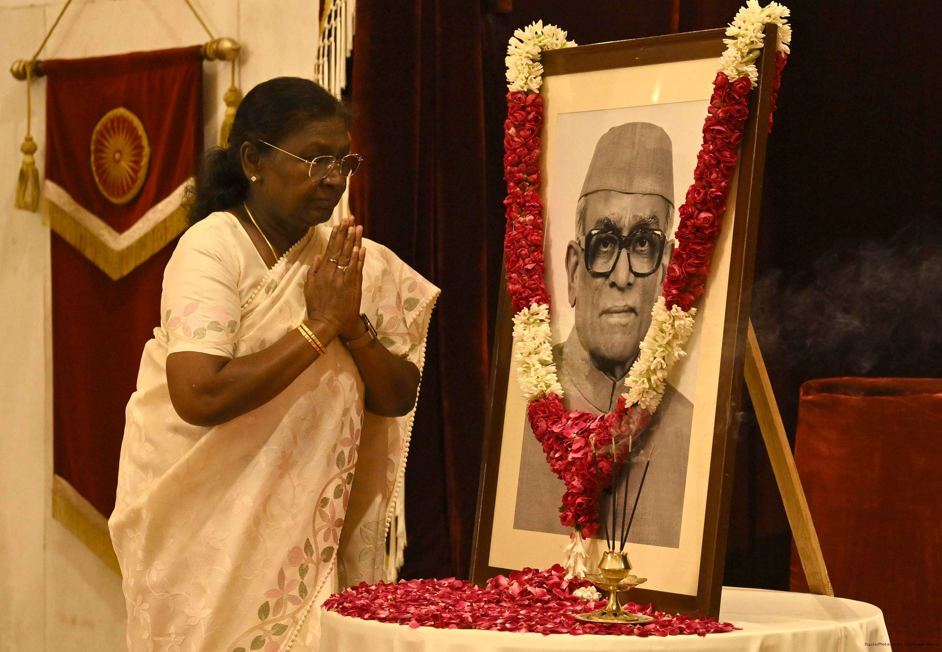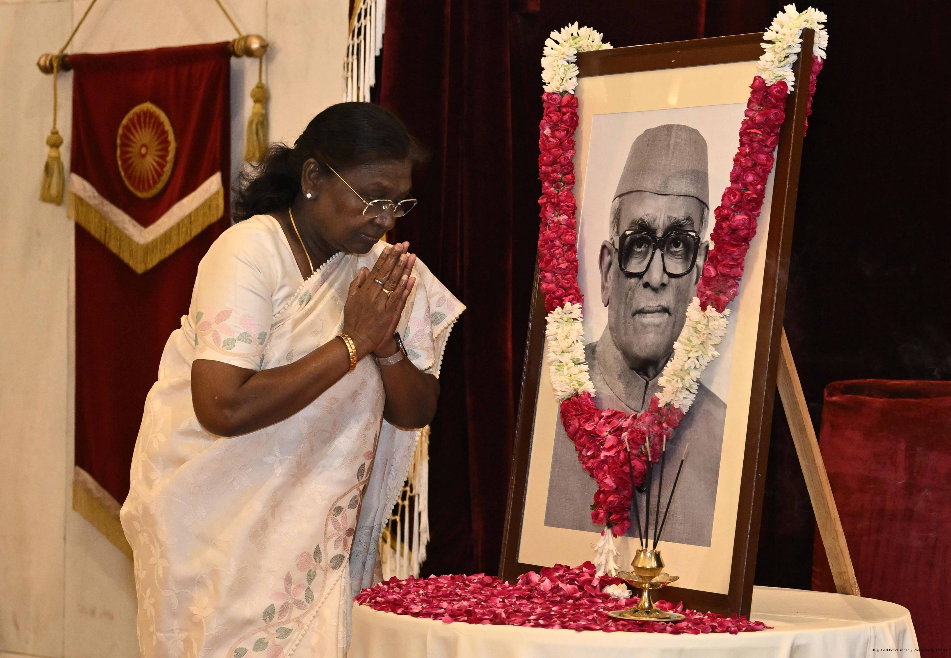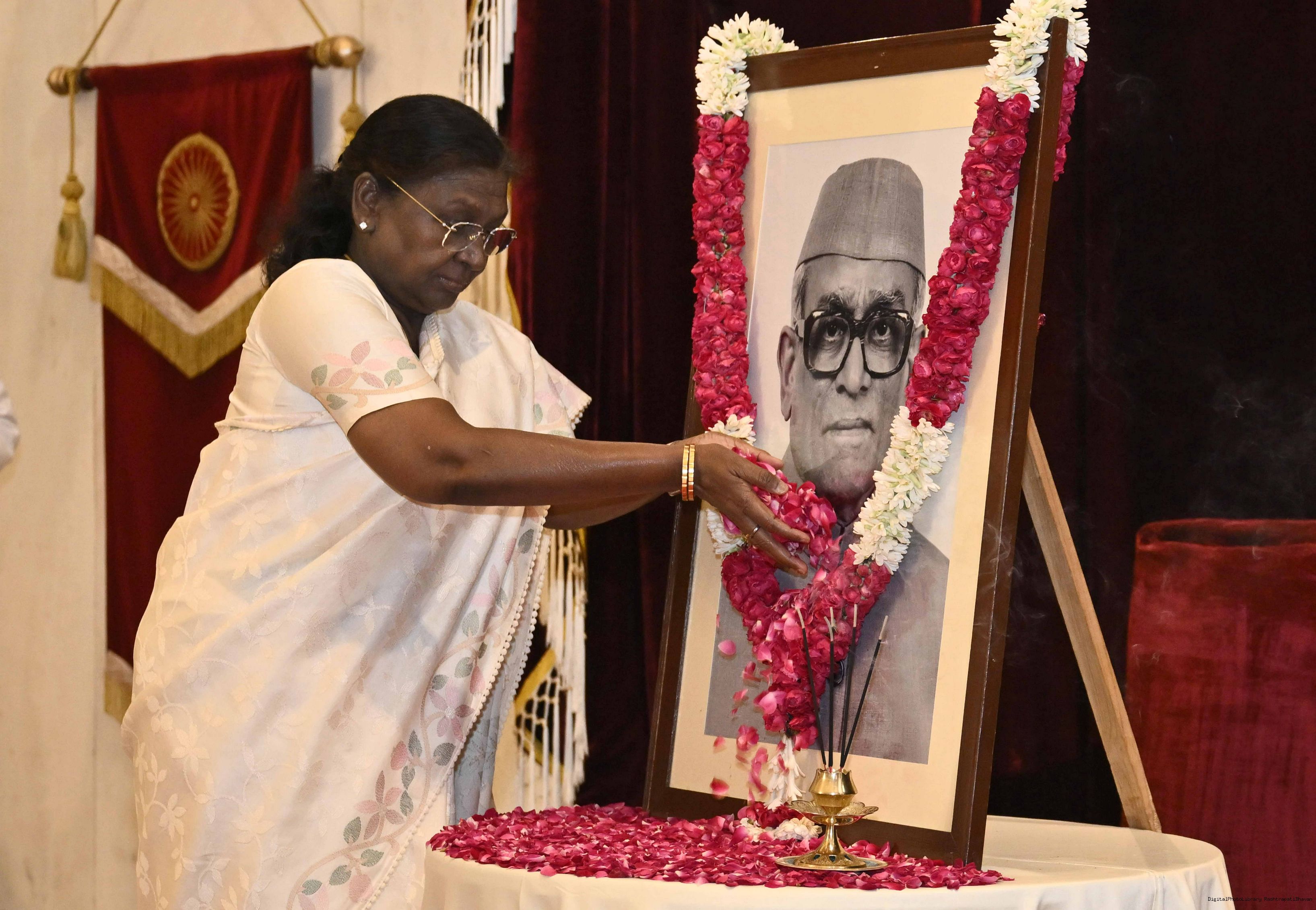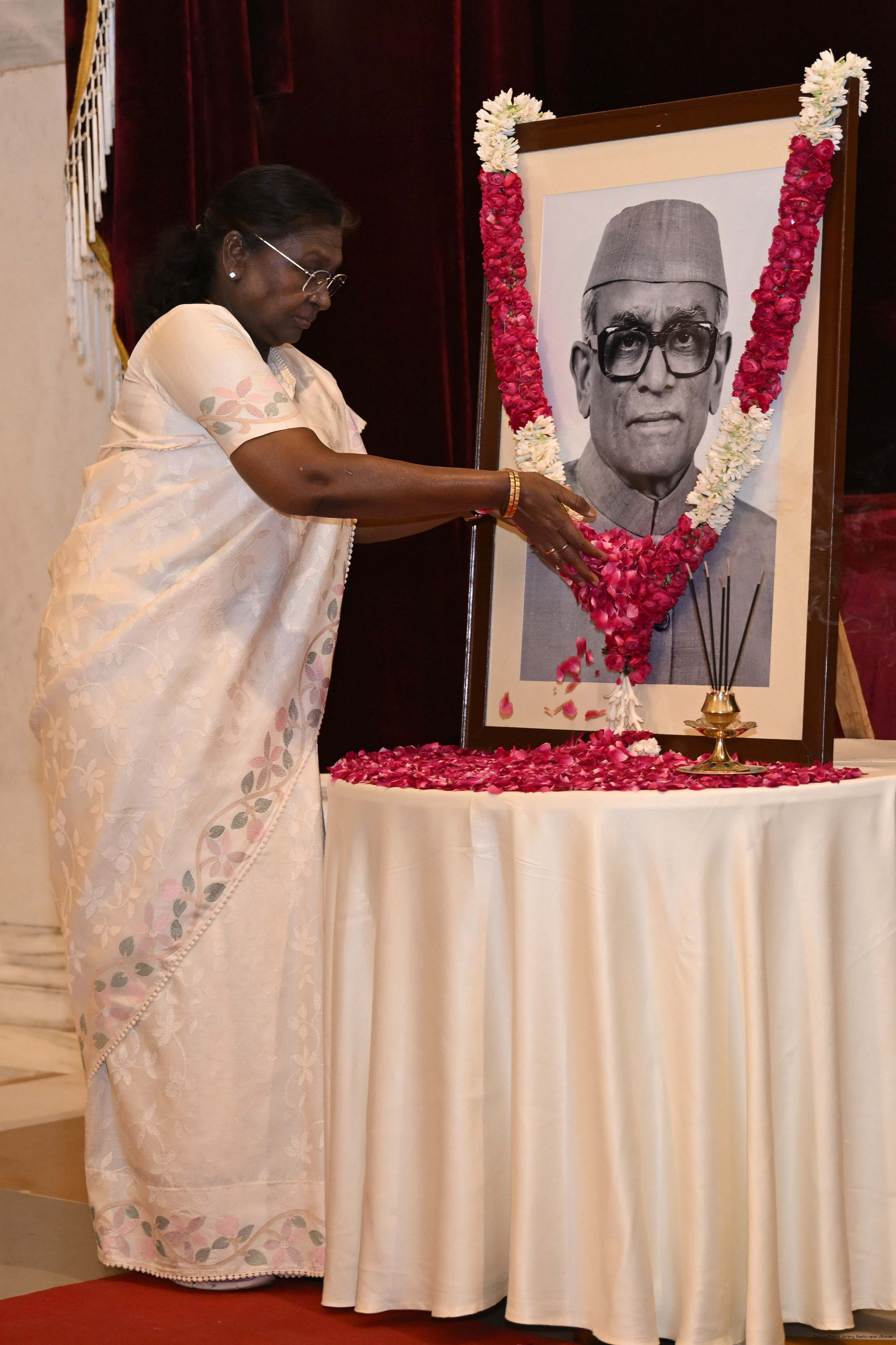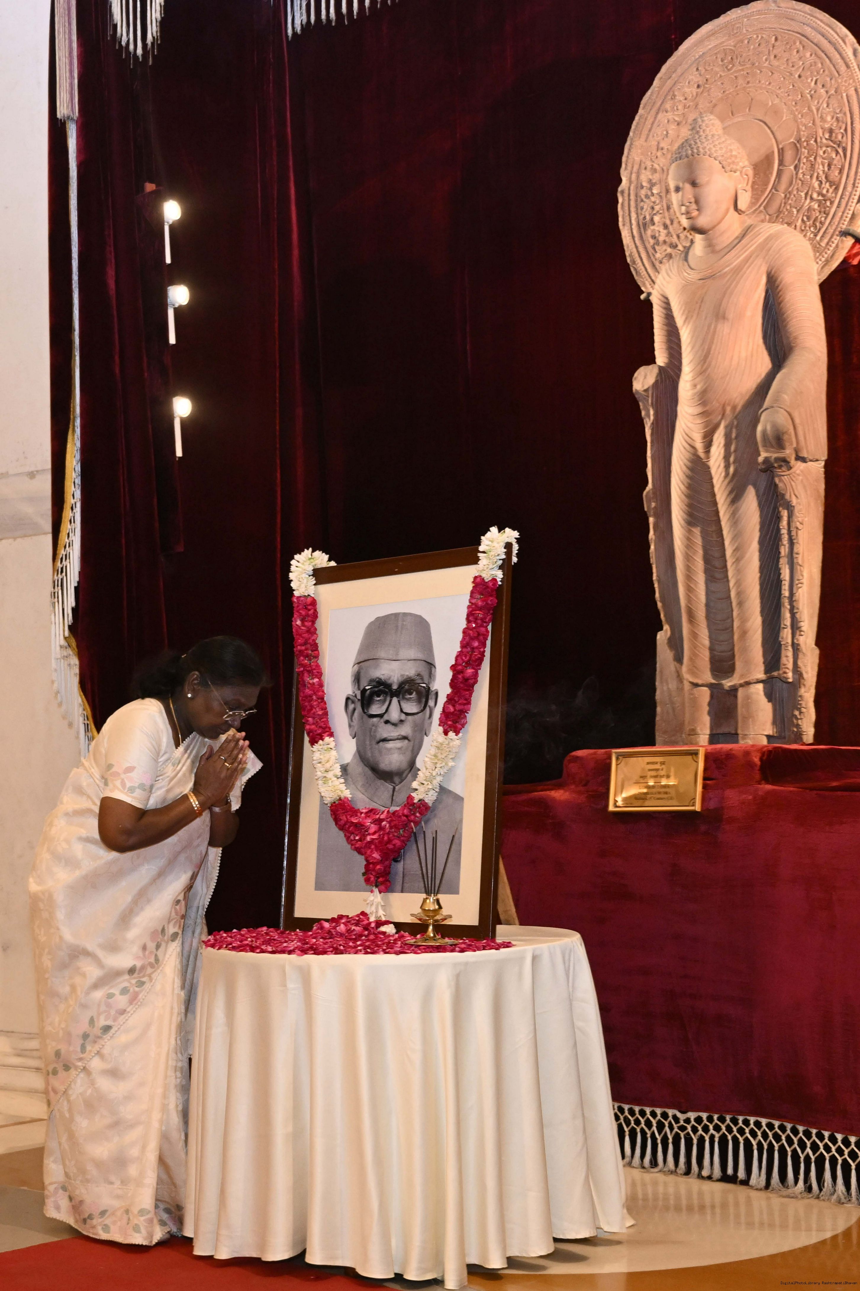 | Caption: | The President of India, Smt. Droupadi Murmu paid floral tributes to Shri Neelam Sanjiva Reddy, former President of India on his birth anniversary at Rashtrapati Bhavan on May 19, 2025. |