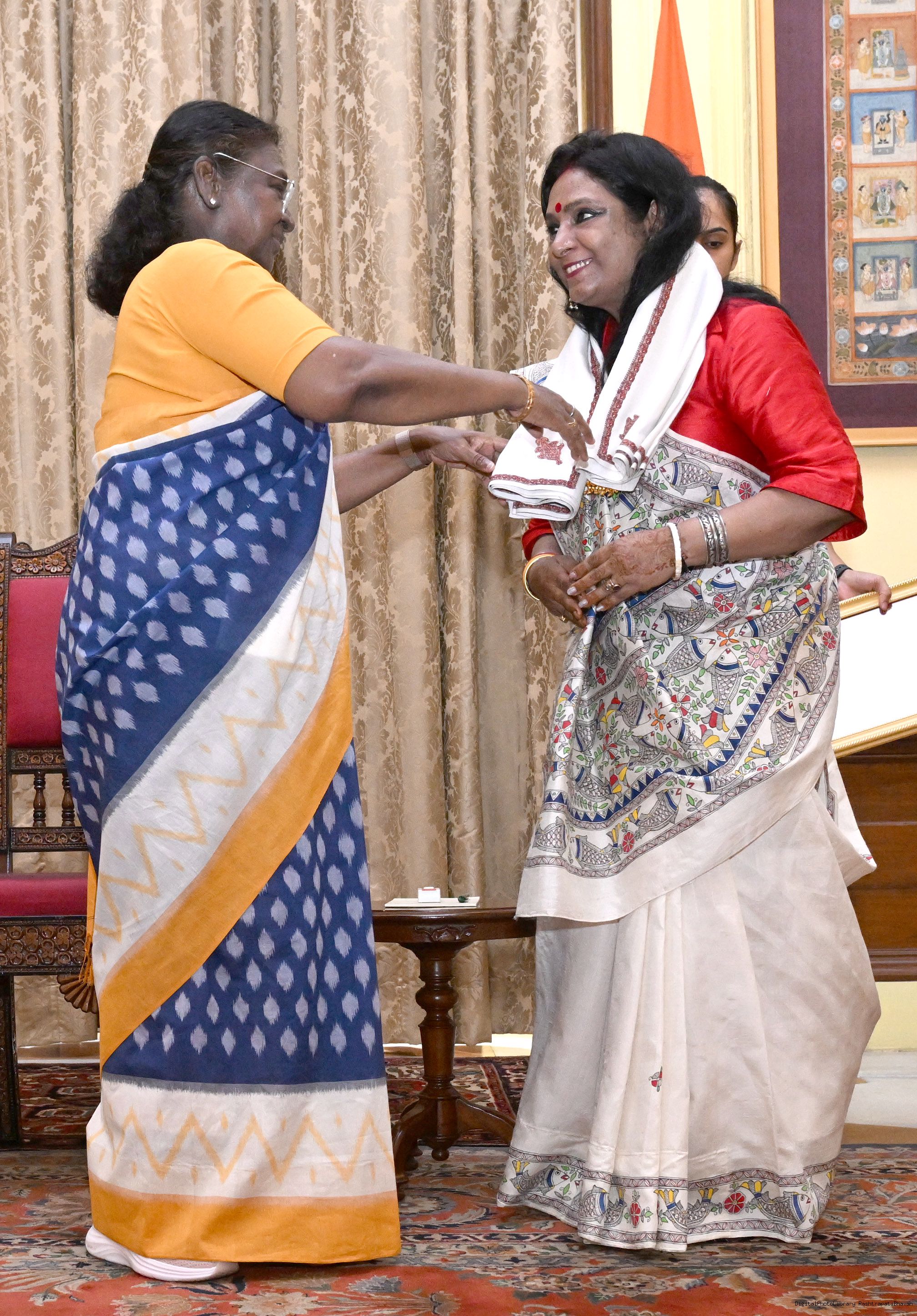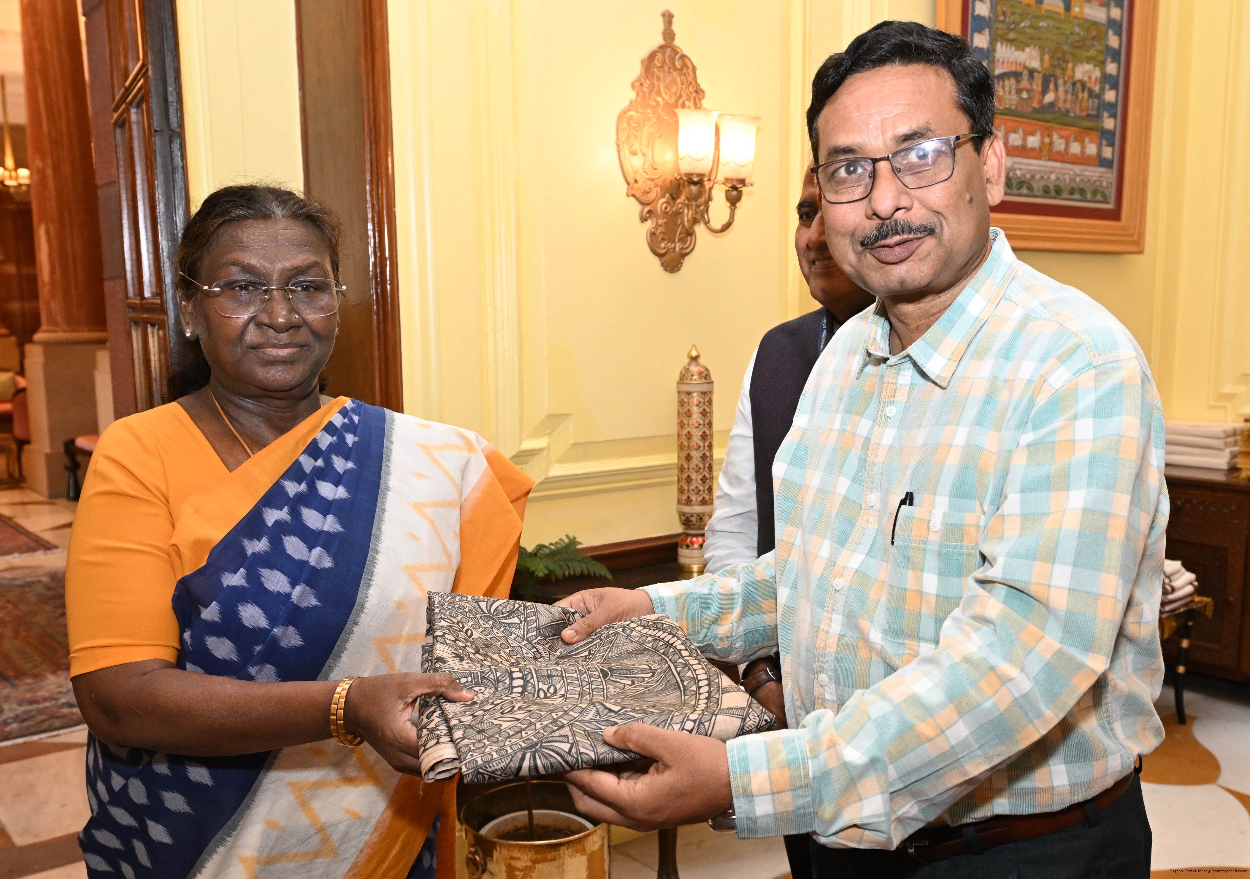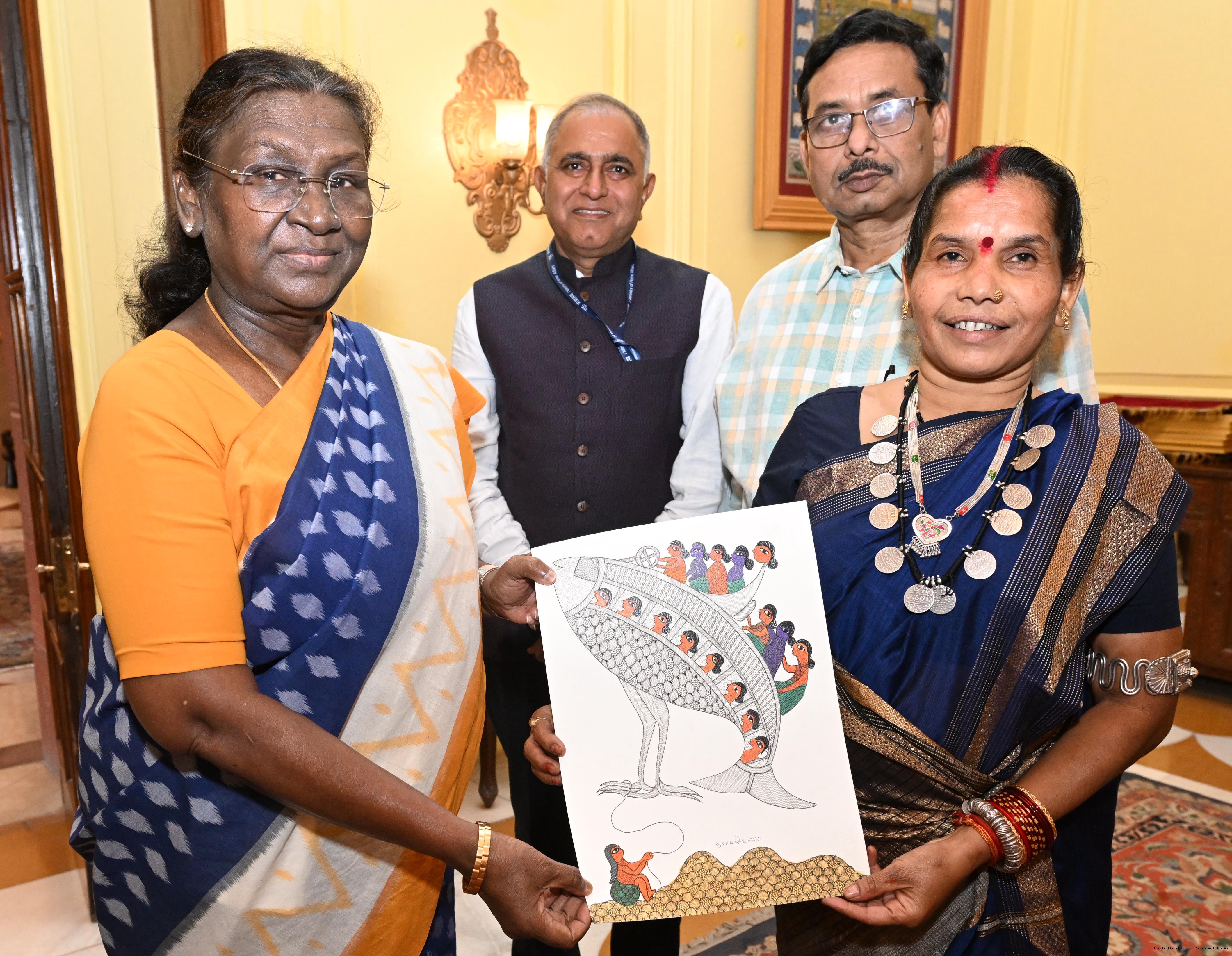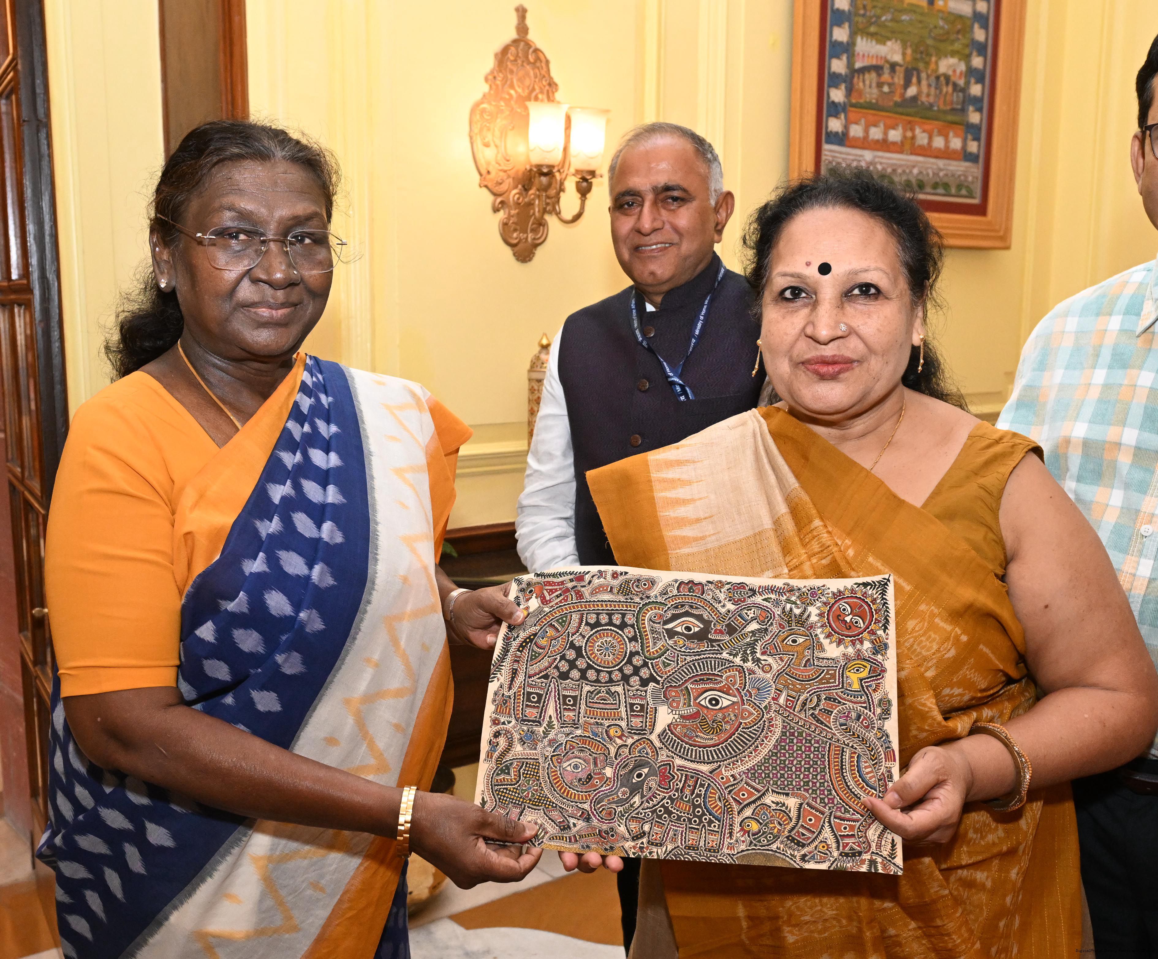 | Caption: | A group of artists of Gond Art and Madhubani Art called on the President of India, Smt. Droupadi Murmu at Rashtrapati Bhavan on May 26, 2025. |