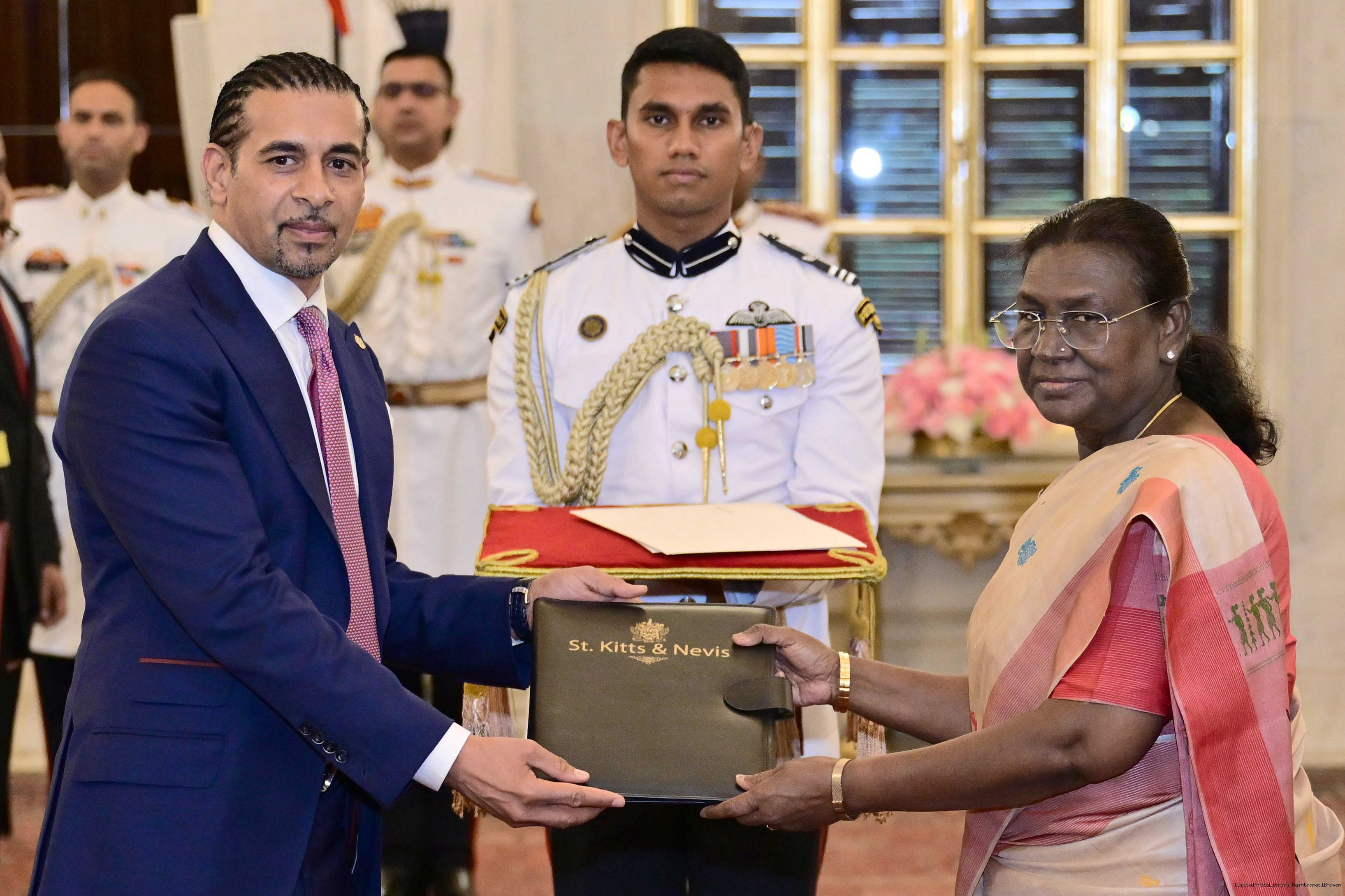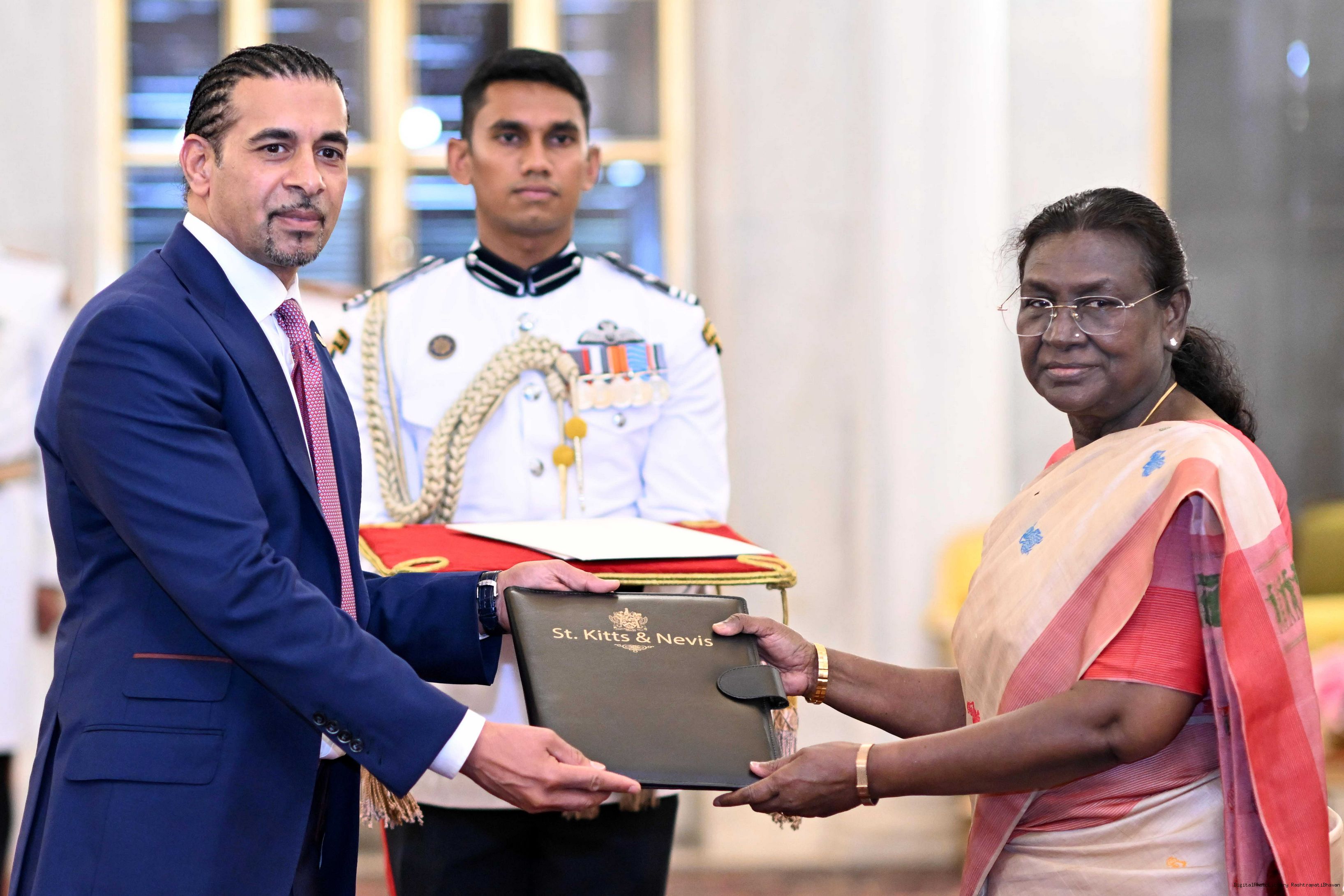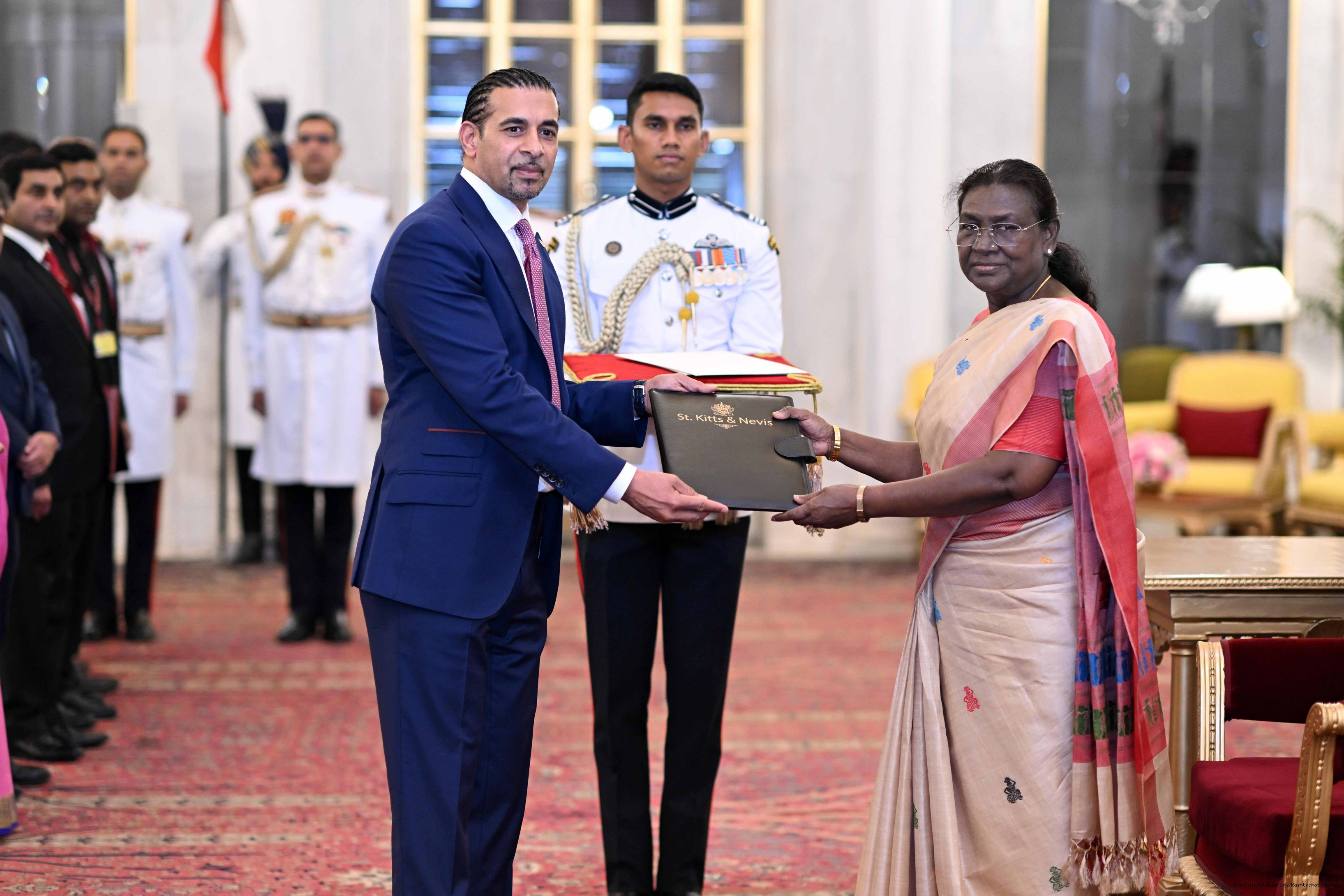 | Caption: | The High Commissioner-designate of Saint Kitts and Nevis, H.E. Mr. Gurdip Bath presenting his credentials to the President of India, Smt Droupadi Murmu at Ashok Hall of Rashtrapati Bhavan in New Delhi on May 29, 2025. |