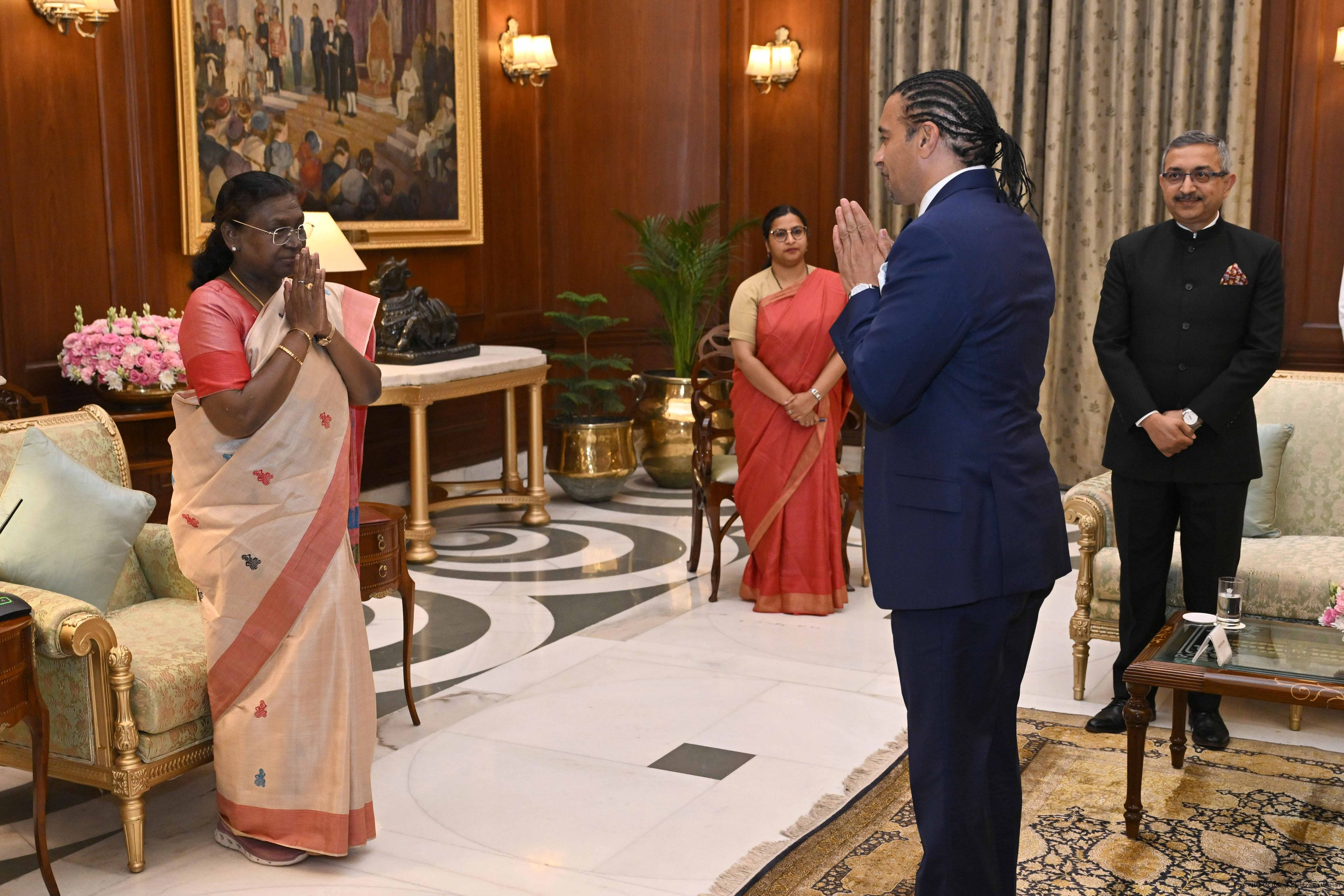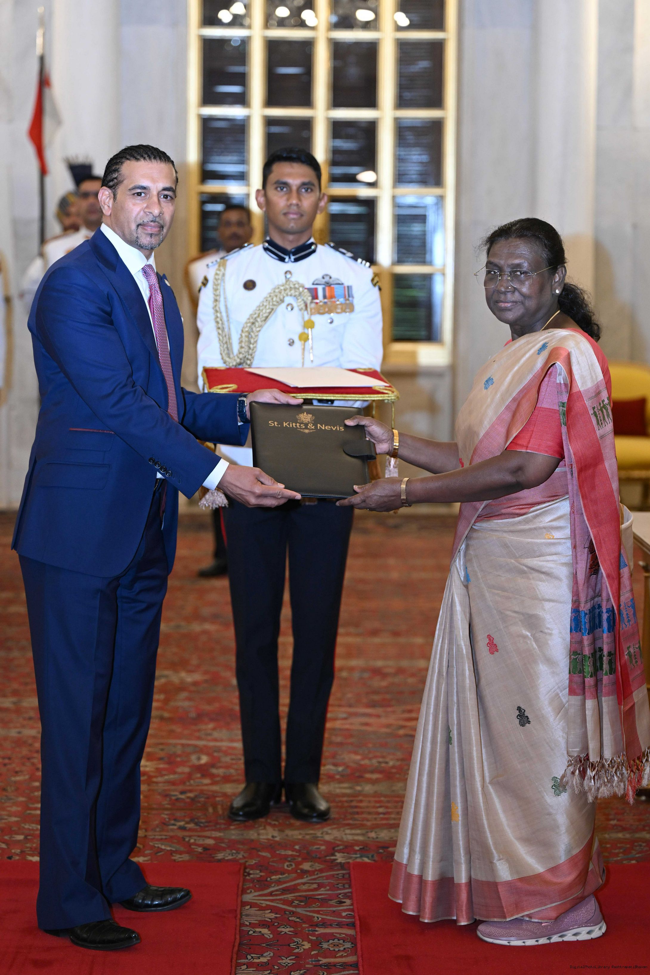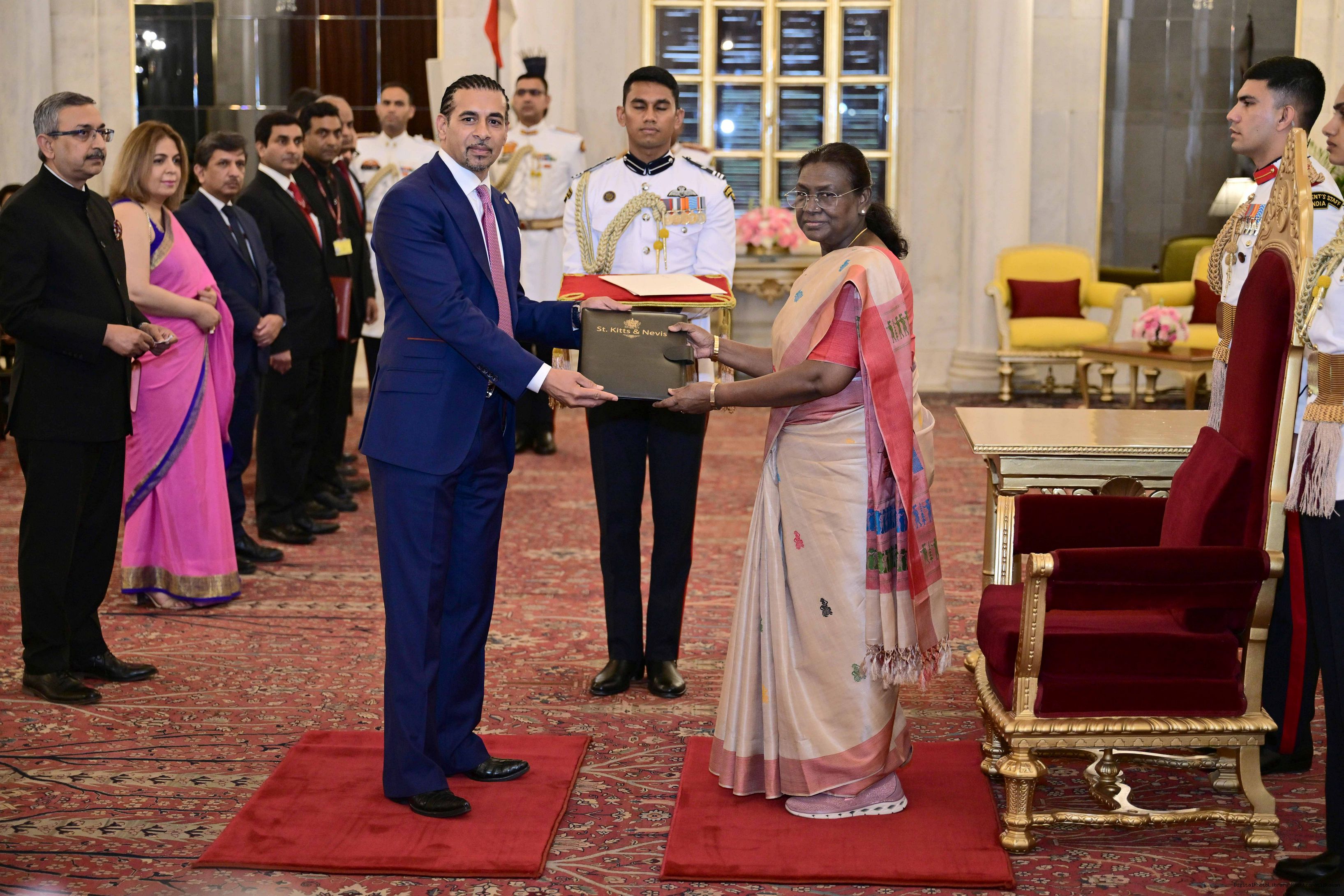| Caption: | The High Commissioner-designate of Saint Kitts and Nevis, H.E. Mr. Gurdip Bath presenting his credentials to the President of India, Smt Droupadi Murmu at Ashok Hall of Rashtrapati Bhavan in New Delhi on May 29, 2025. |
