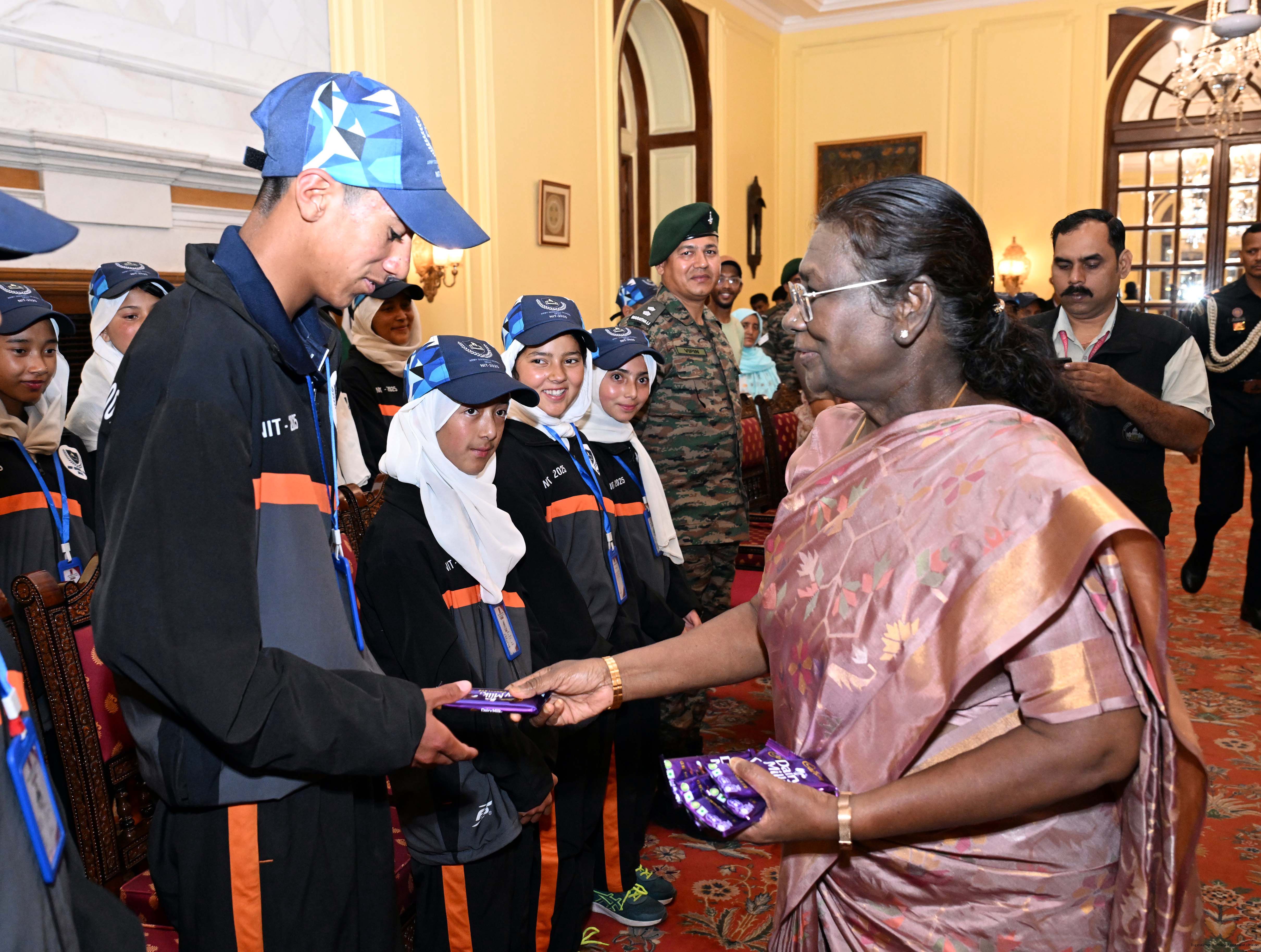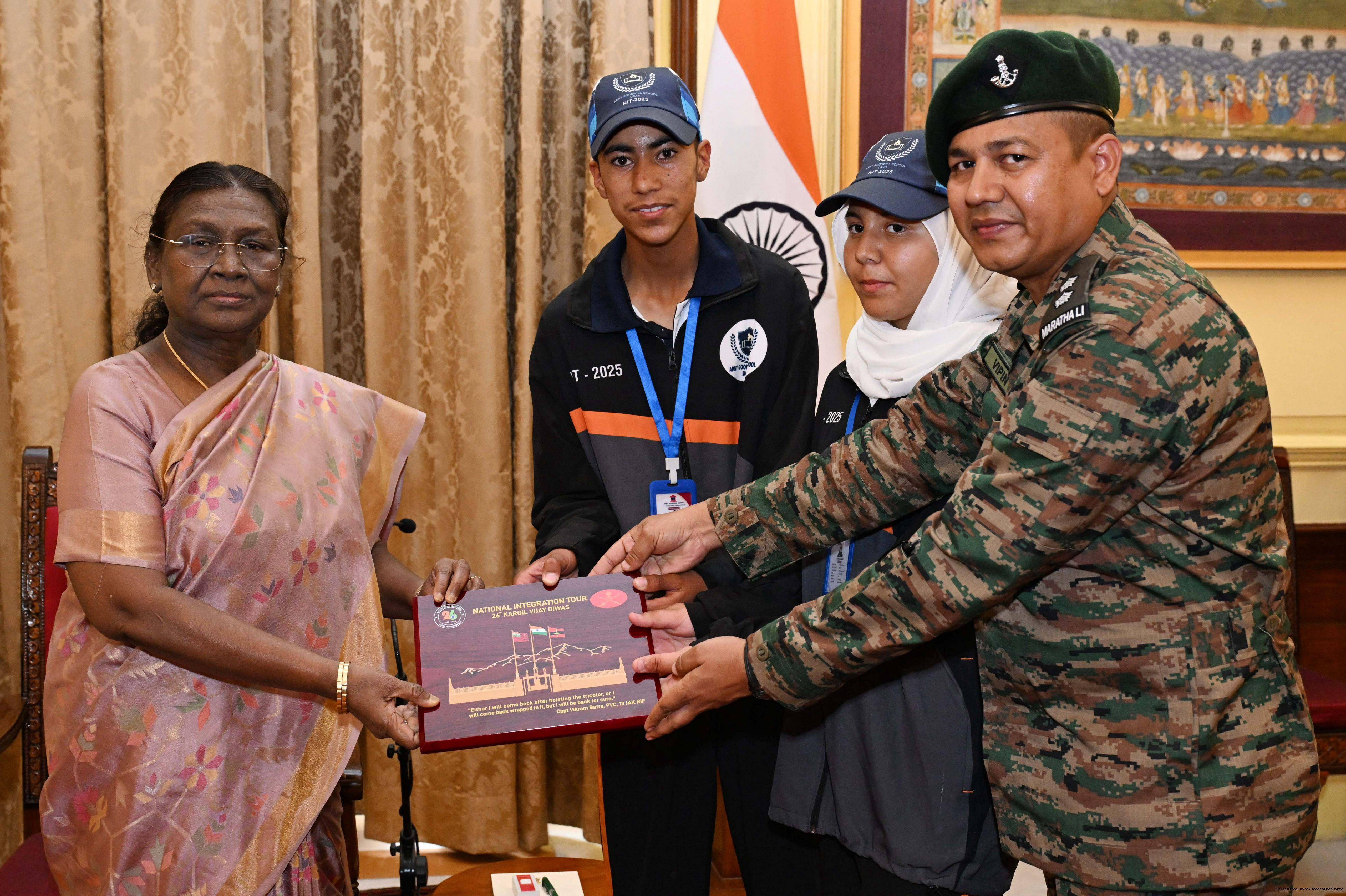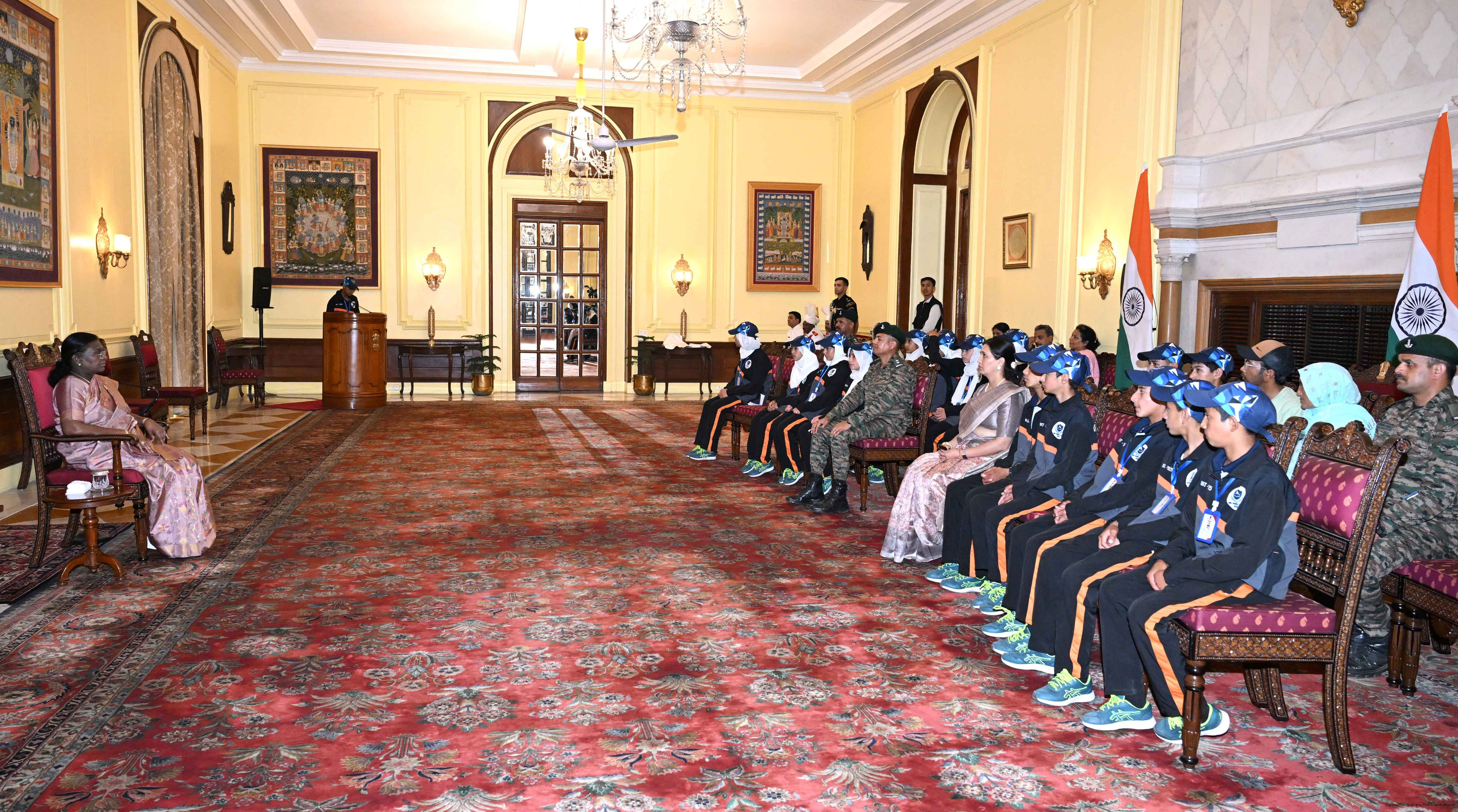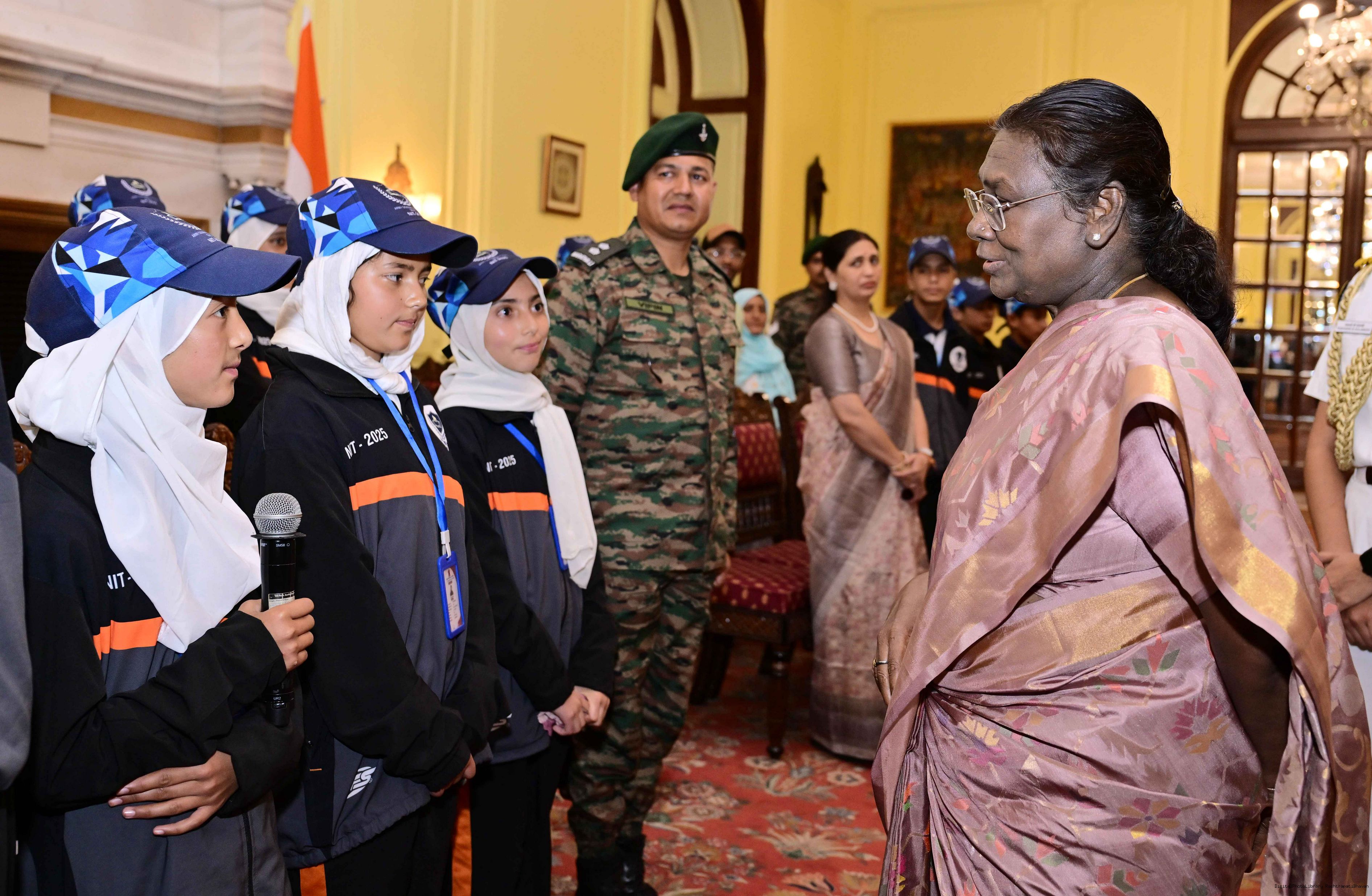 | Caption: | A group of students from Army Goodwill School, Dras, Ladakh called on the President of India, Smt. Droupadi Murmu at Rashtrapati Bhavan June 3, 2025. The group visited Rashtrapati Bhavan as part of the National Integration Tour. |