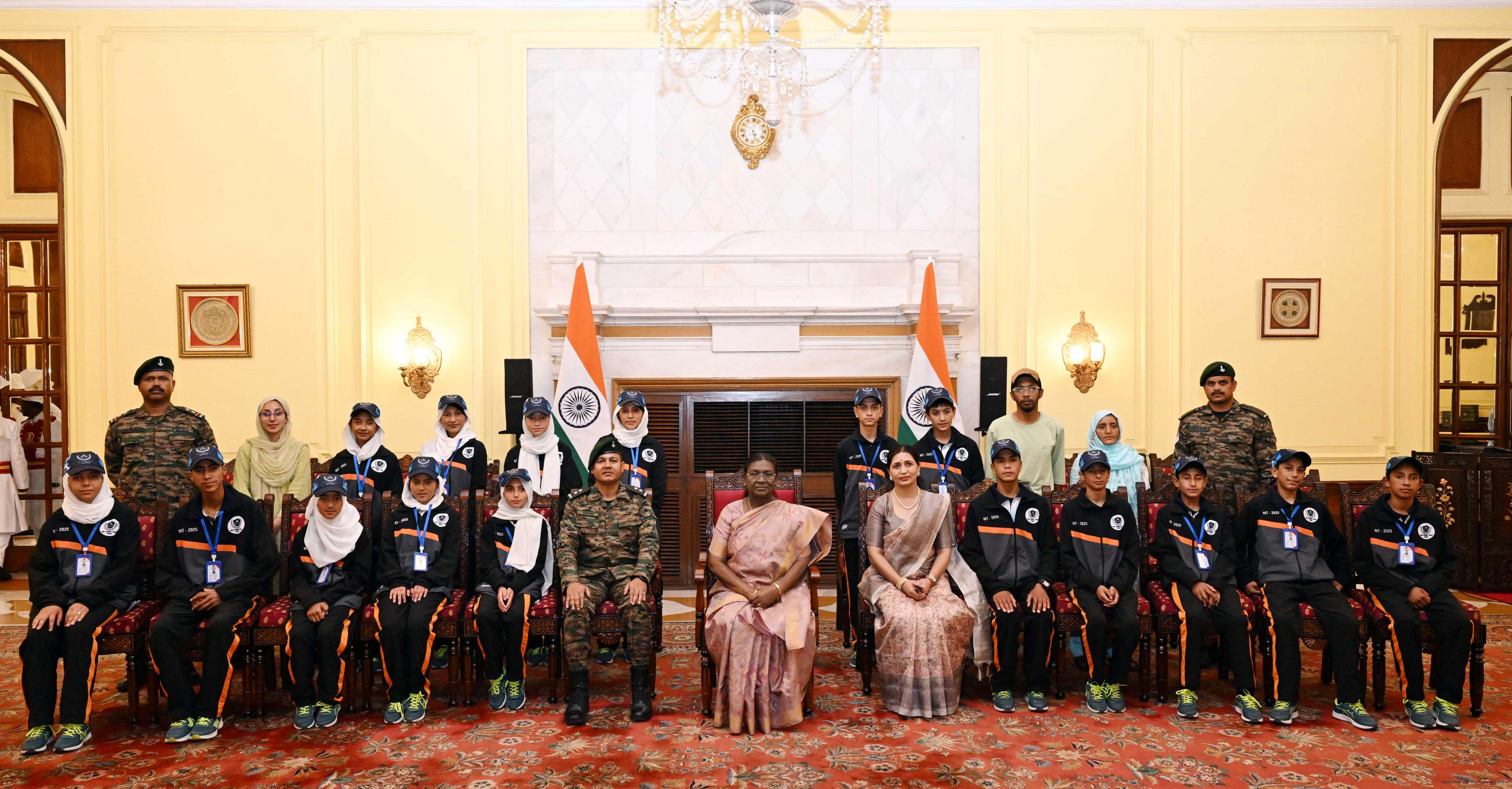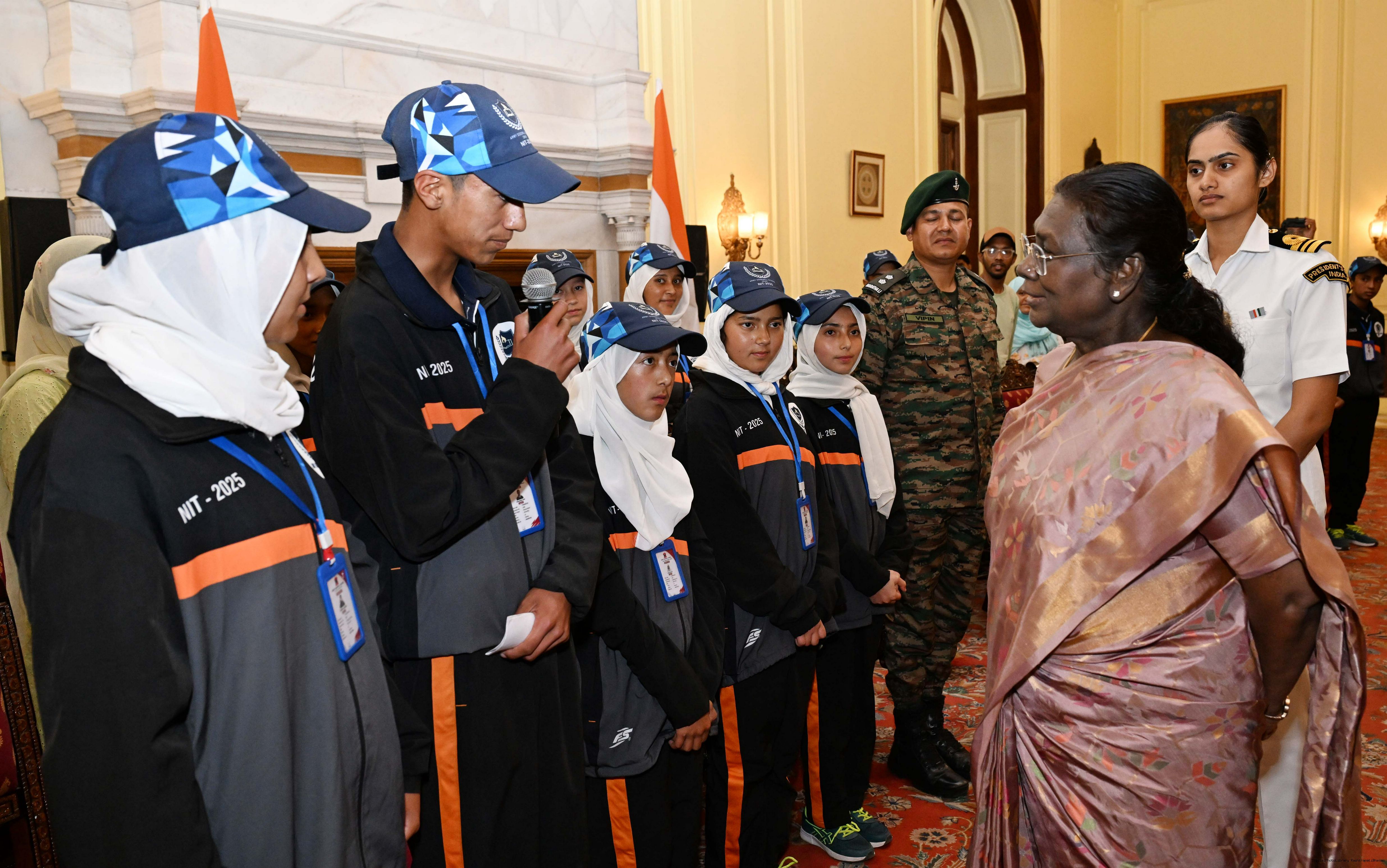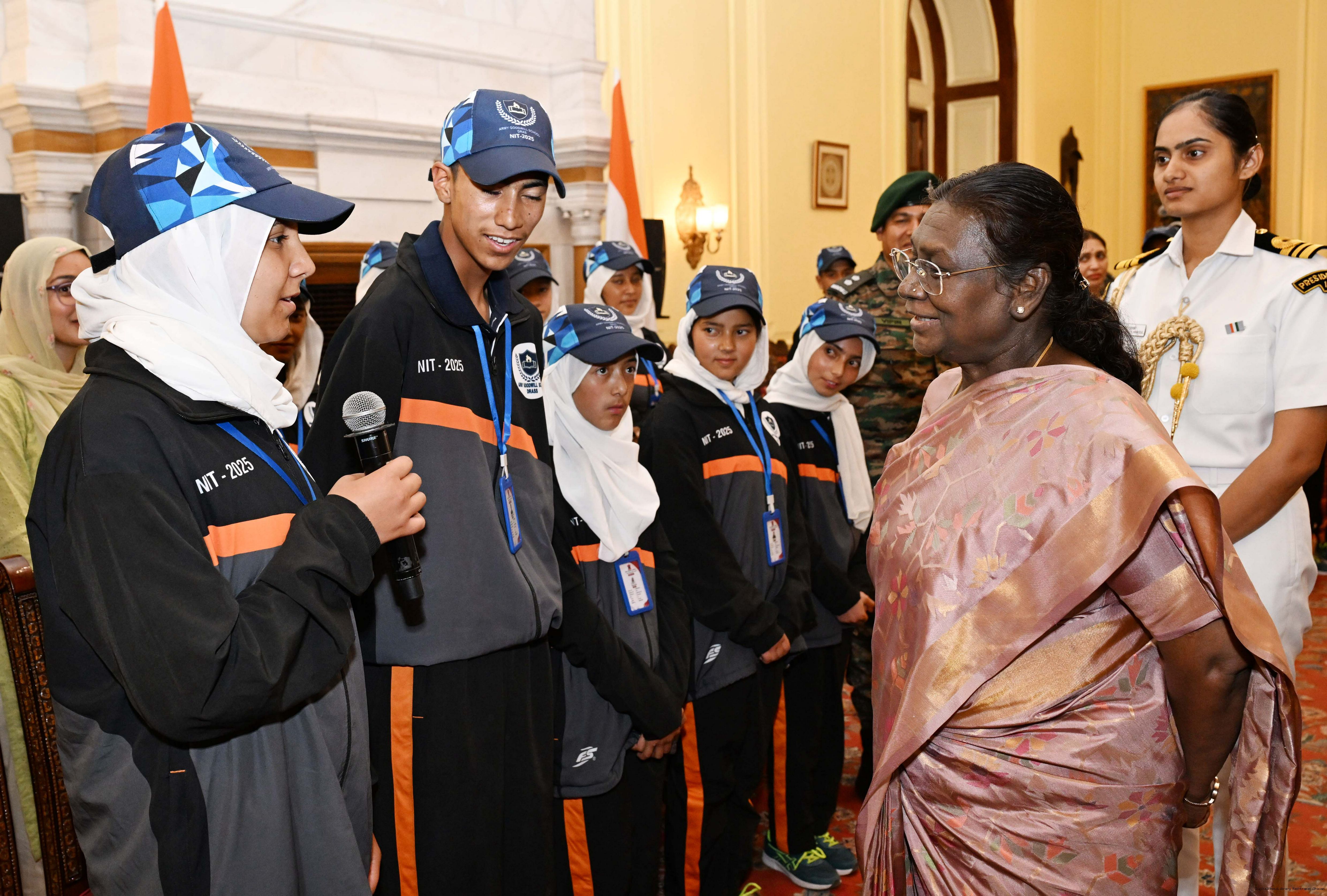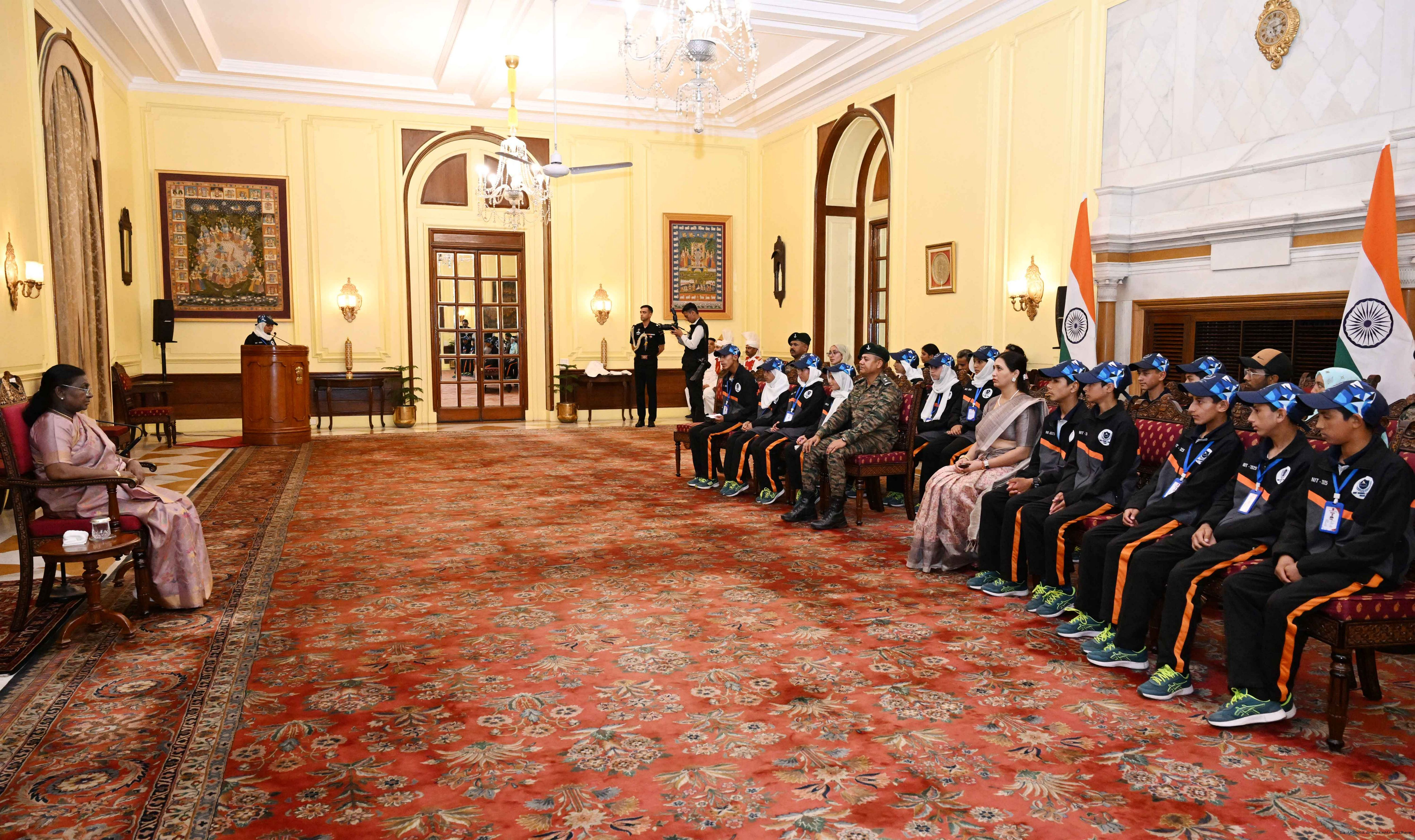 | Caption: | A group of students from Army Goodwill School, Dras, Ladakh called on the President of India, Smt. Droupadi Murmu at Rashtrapati Bhavan June 3, 2025. The group visited Rashtrapati Bhavan as part of the National Integration Tour. |